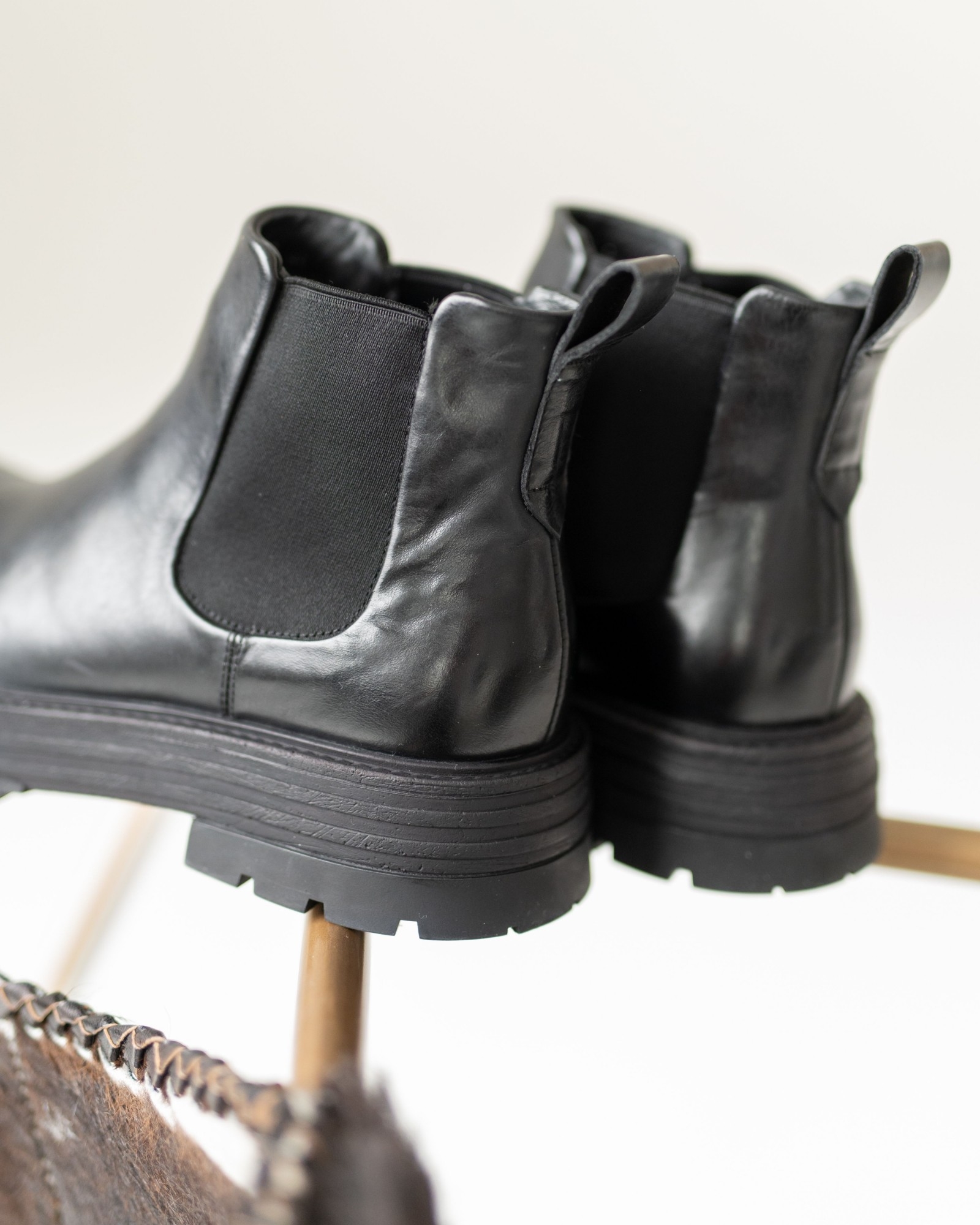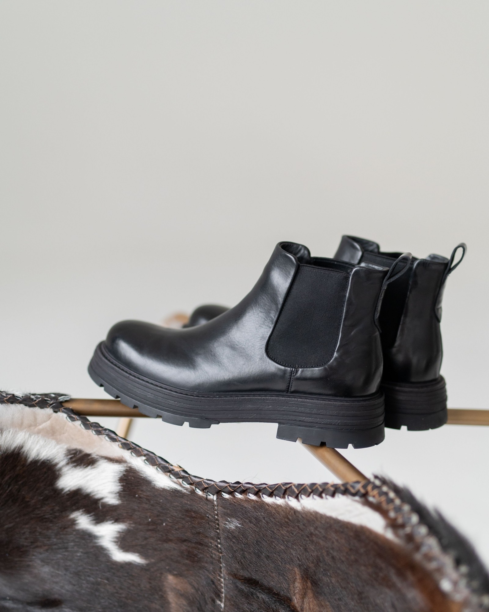 Чёрная версия этих челси выглядит ещё более выразительно и современно. Грубая подошва в сочетании с приподнятым носком формирует уверенный, динамичный силуэт — идеальный для городского ритма и верхней одежды в минималистичном стиле. Чистые линии верха сохраняют связь с классикой, но общий образ становится смелее и моложе. Мягкая кожа и эластичные вставки обеспечивают мгновенное надевание и снятие — комфорт, который ощущается каждый день. Загляните на примерку: вживую эта пара раскрывает свою пластику, посадку и характер максимально убедительно.