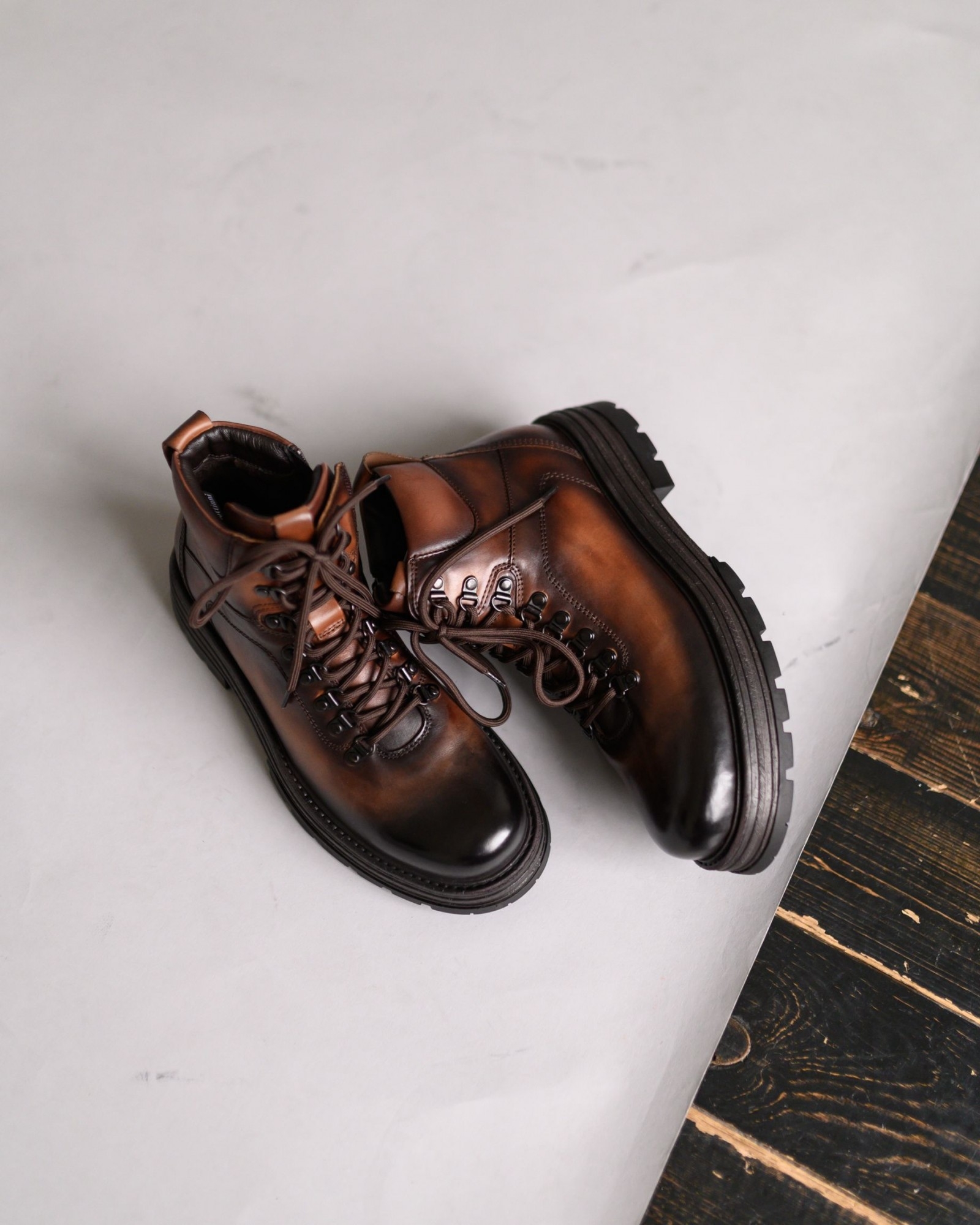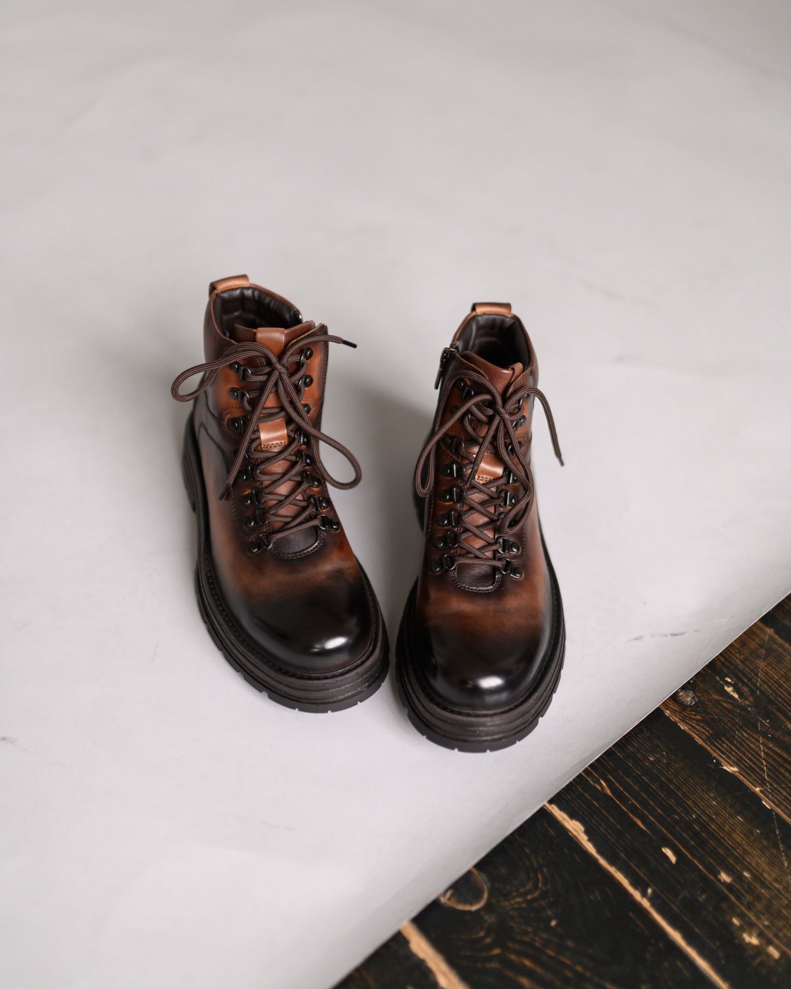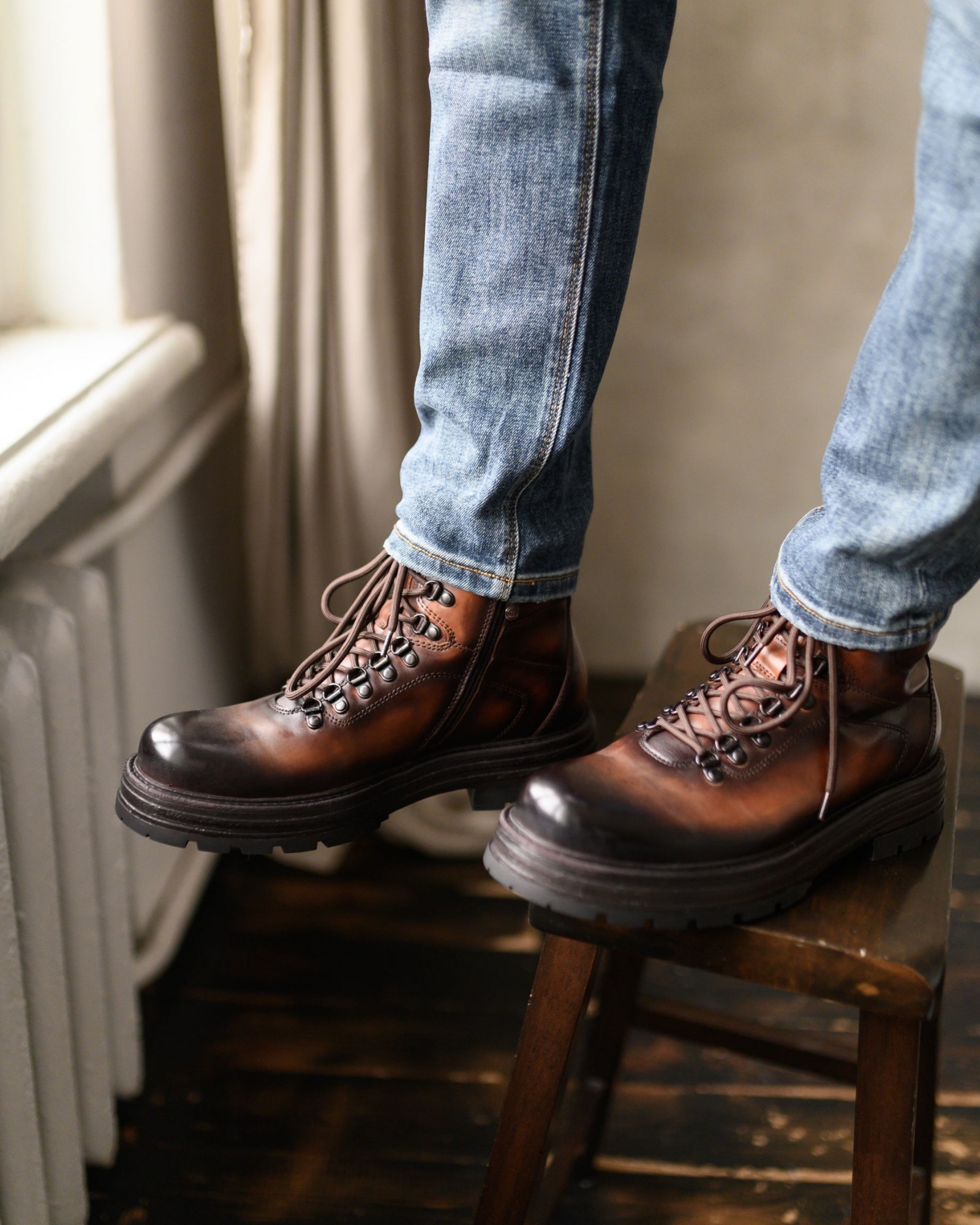 Очень стильные высокие демисезонные ботинки в красивом рыжем цвете. Модель оснащена наружными петлями на шнуровке и замком на внутренней стороне для удобства носки. Амортизирующая подошва обеспечивает отличную поддержку и комфорт в течение всего дня, что делает эти ботинки идеальным выбором для активного использования в межсезонье.