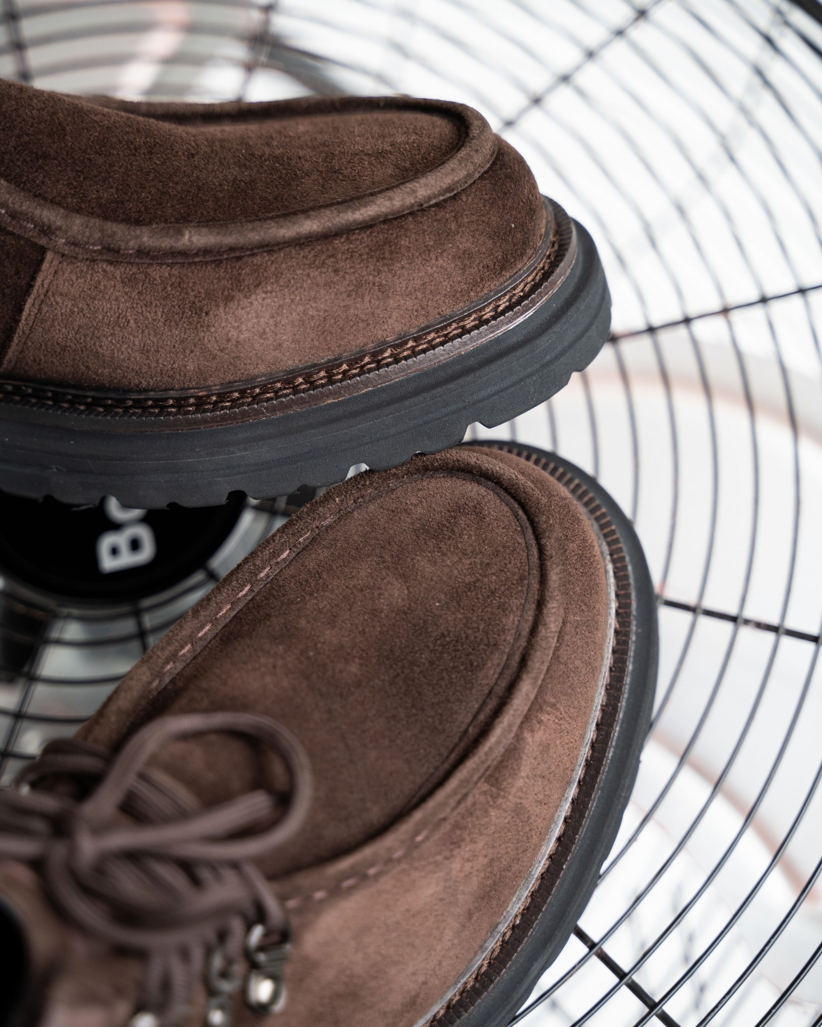 Эта пара создана для тех, кто ценит одновременно стиль, комфорт и внимание к деталям. Верх из мягкой коричневой замши с лёгкой структурой формирует слегка квадратный носок, который придаёт образу современный характер. Наружные петли для шнурков добавляют динамики и подчёркивают изысканность силуэта, а внутренний замок обеспечивает удобство надевания без лишних усилий — идеальное сочетание практичности и элегантности.