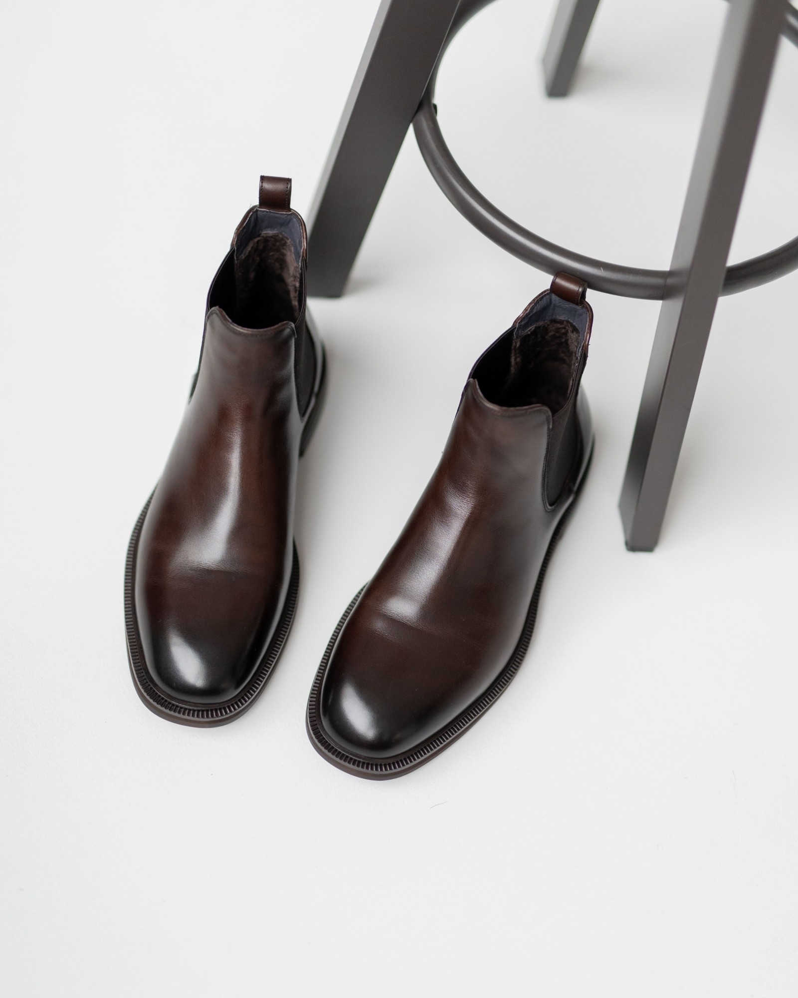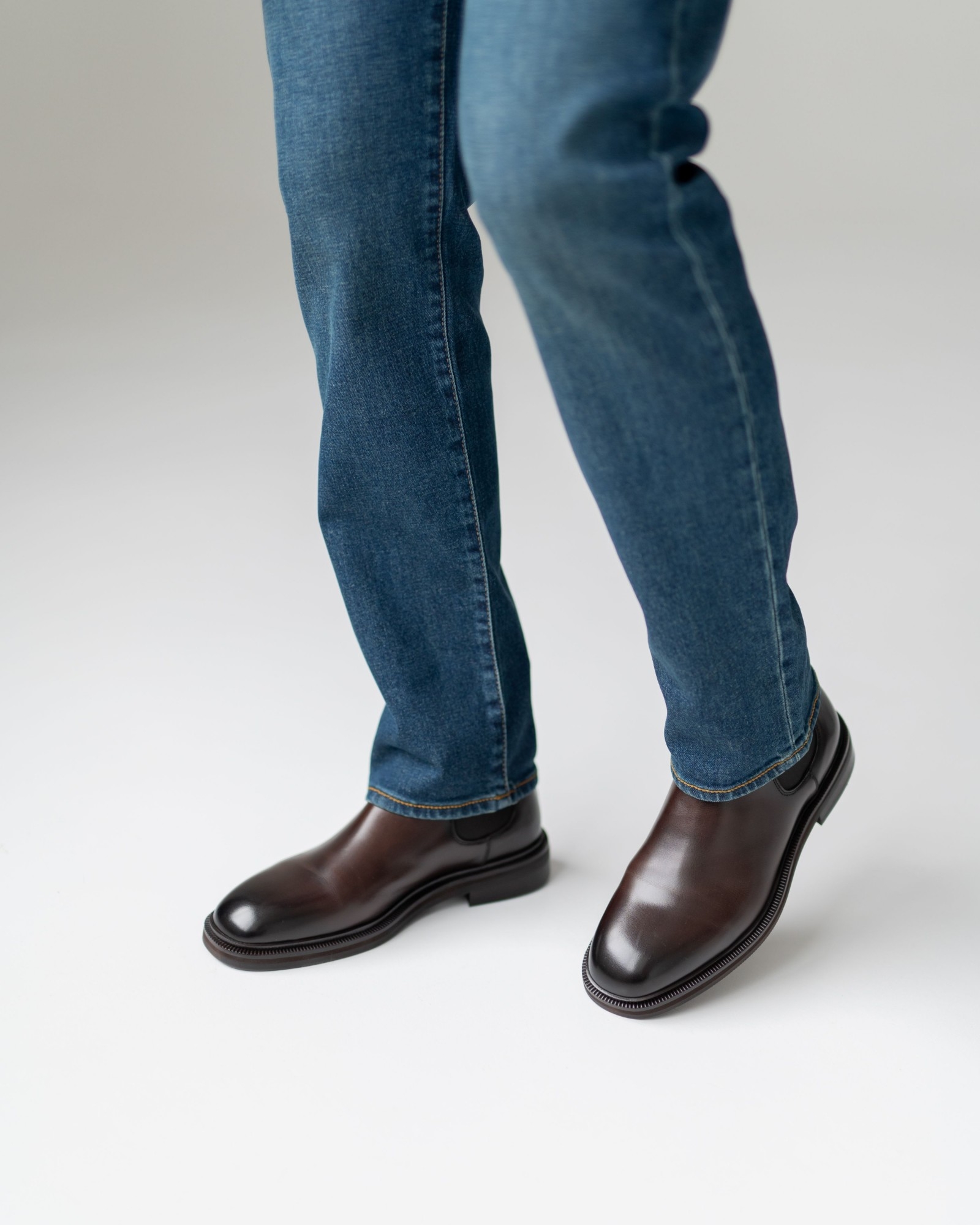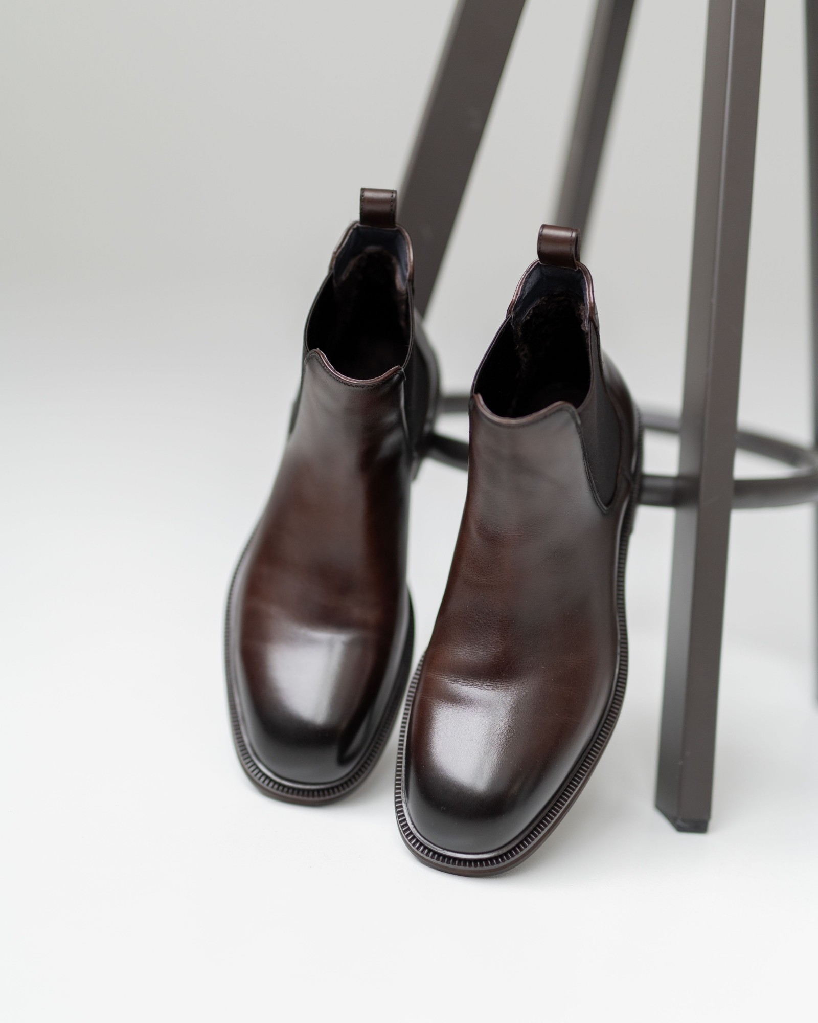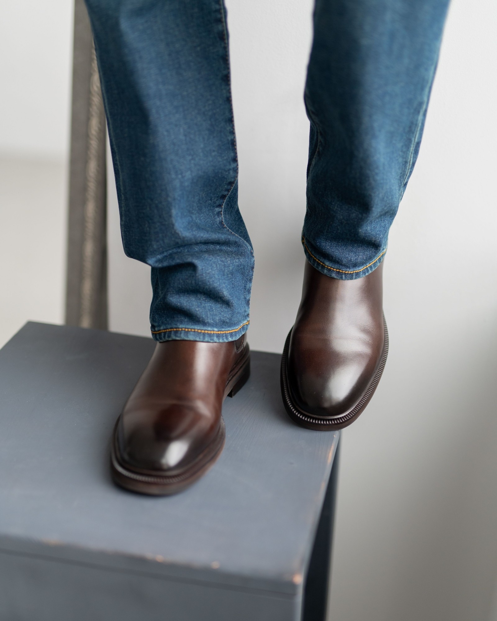 Эти коричневые челси — пример того, как сдержанная классика может выглядеть современно и статусно. Гладкая союзка подчёркивает чистоту линий, а уникальная форма мыска — одновременно округлая и слегка прямолинейная — придаёт паре узнаваемый характер. Такой силуэт делает обувь элегантной и уверенной, не перегружая образ. Универсальный коричневый оттенок легко сочетается и с костюмом, и с тёмными джинсами, создавая безупречный вид в любое время дня. Приходите на примерку: вживую эти челси раскрываются ещё ярче — по посадке, мягкости кожи и ощущению безупречного стиля.