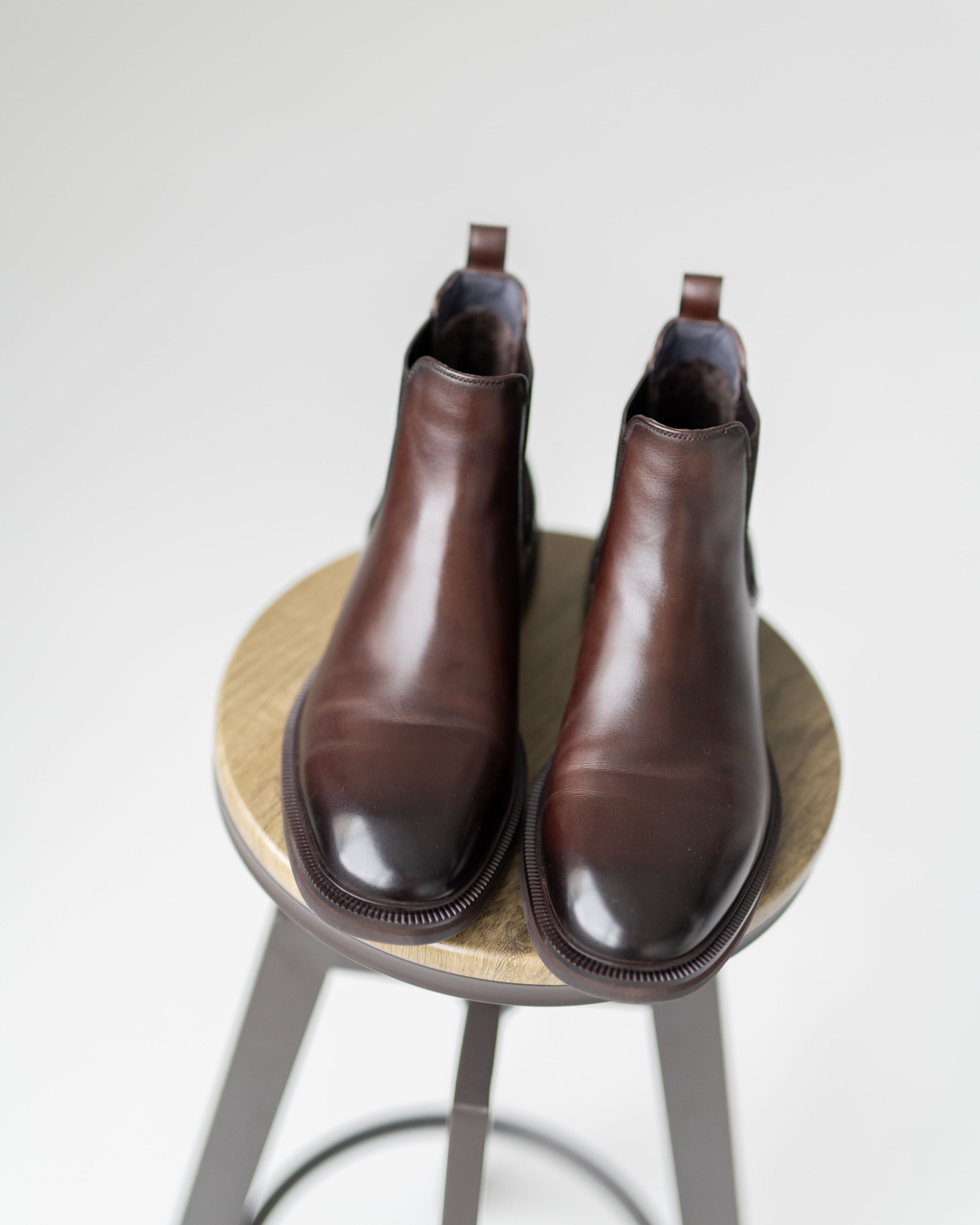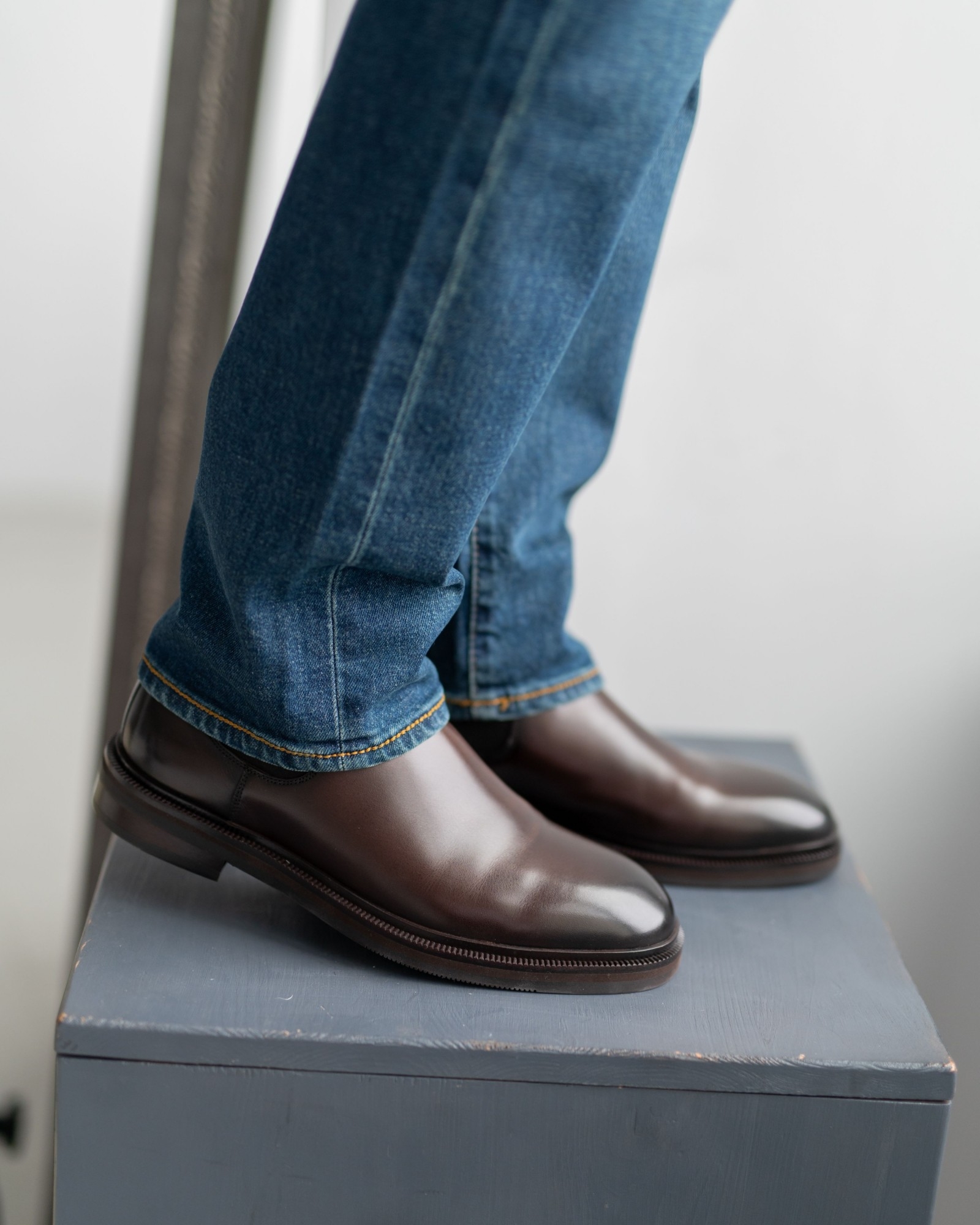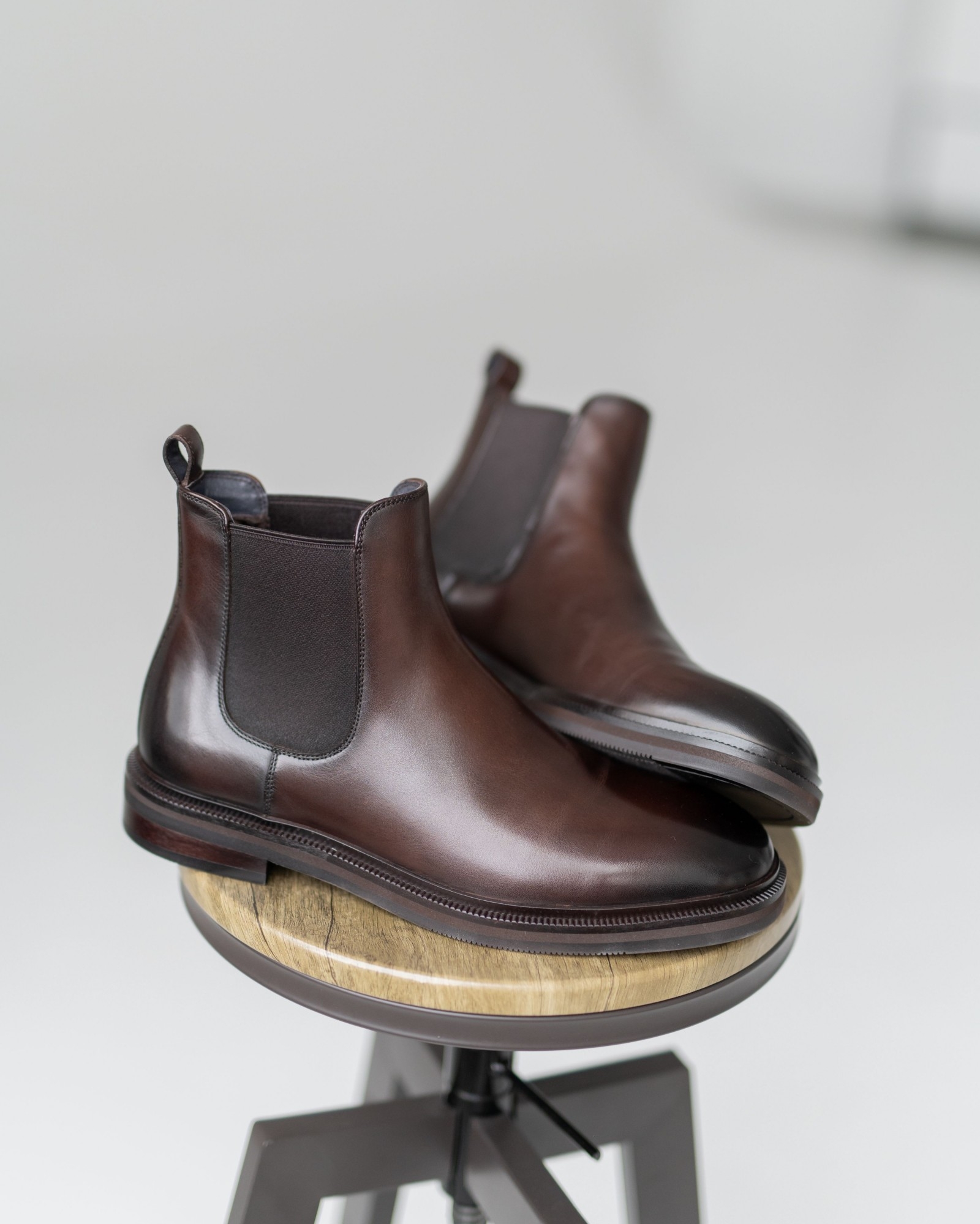 Эти коричневые челси — пример того, как сдержанная классика может выглядеть современно и статусно. Гладкая союзка подчёркивает чистоту линий, а уникальная форма мыска — одновременно округлая и слегка прямолинейная — придаёт паре узнаваемый характер. Такой силуэт делает обувь элегантной и уверенной, не перегружая образ. Универсальный коричневый оттенок легко сочетается и с костюмом, и с тёмными джинсами, создавая безупречный вид в любое время дня. Приходите на примерку: вживую эти челси раскрываются ещё ярче — по посадке, мягкости кожи и ощущению безупречного стиля.
