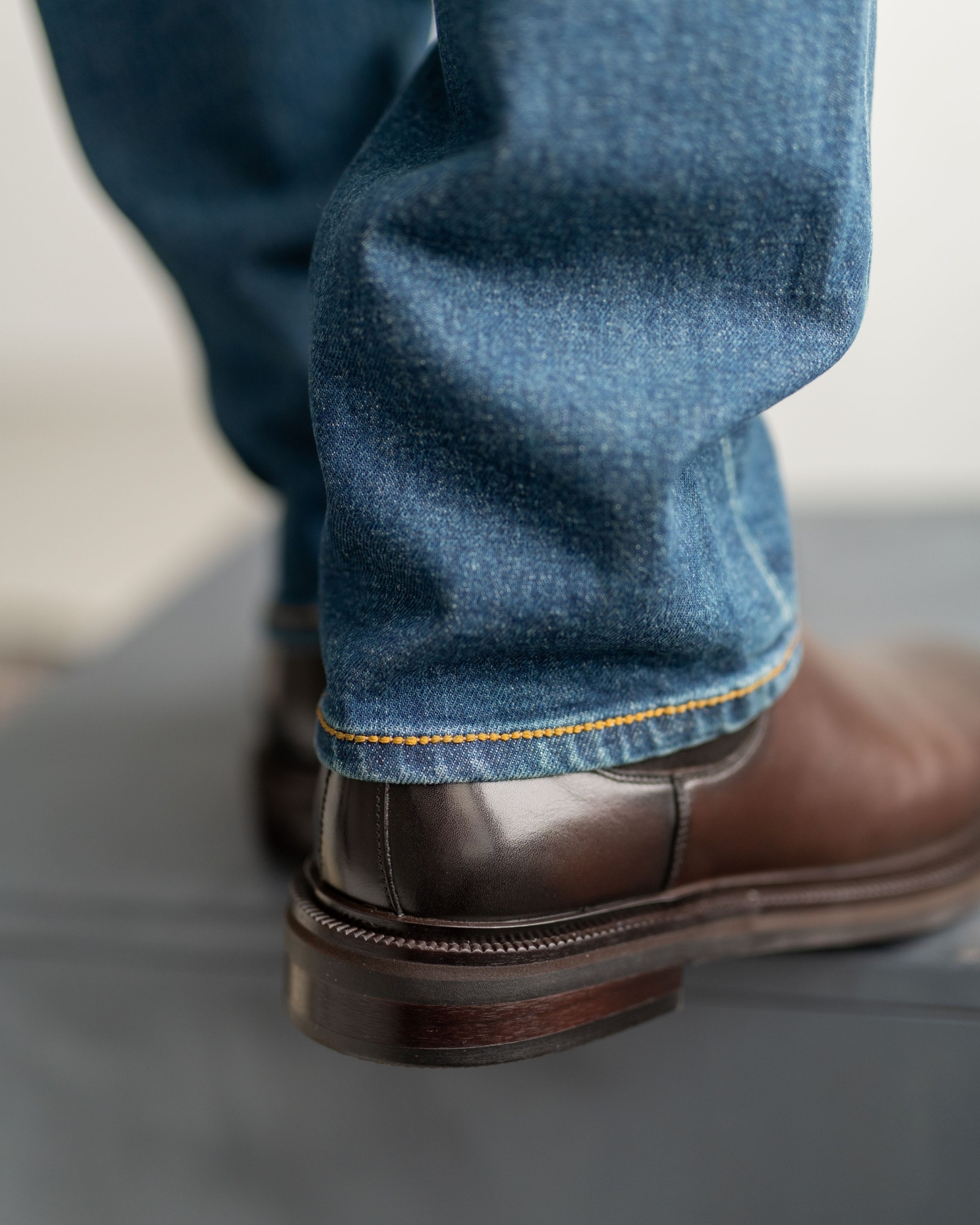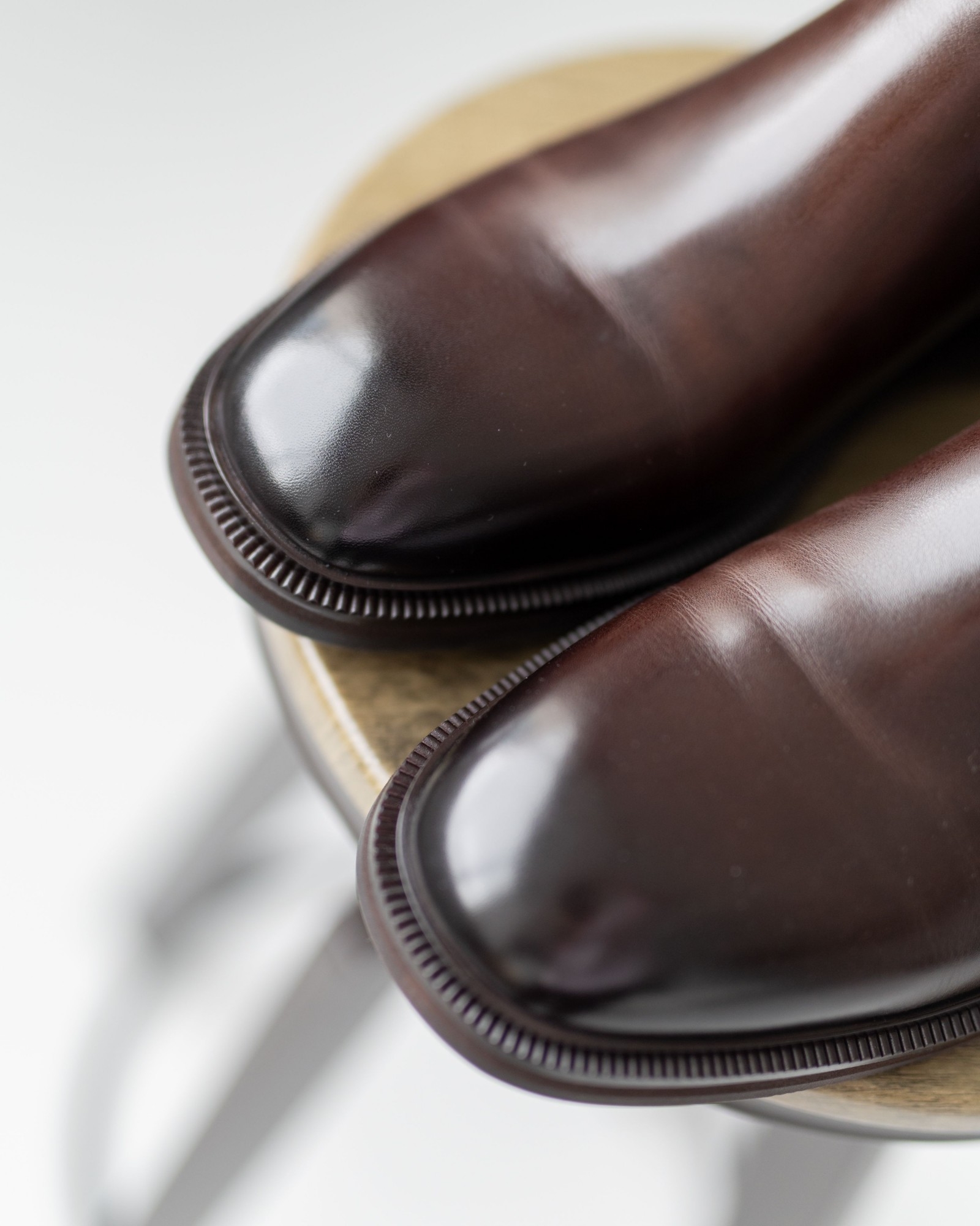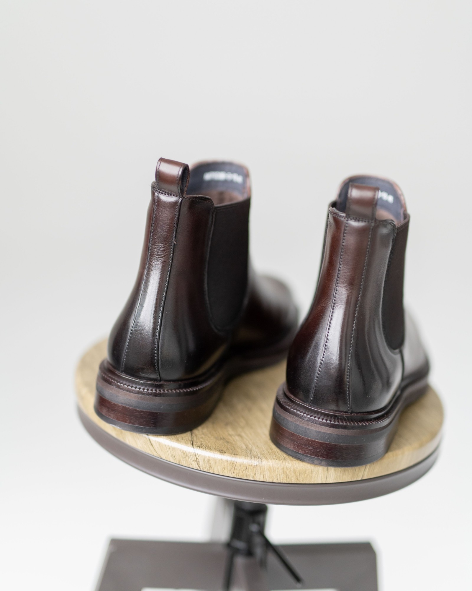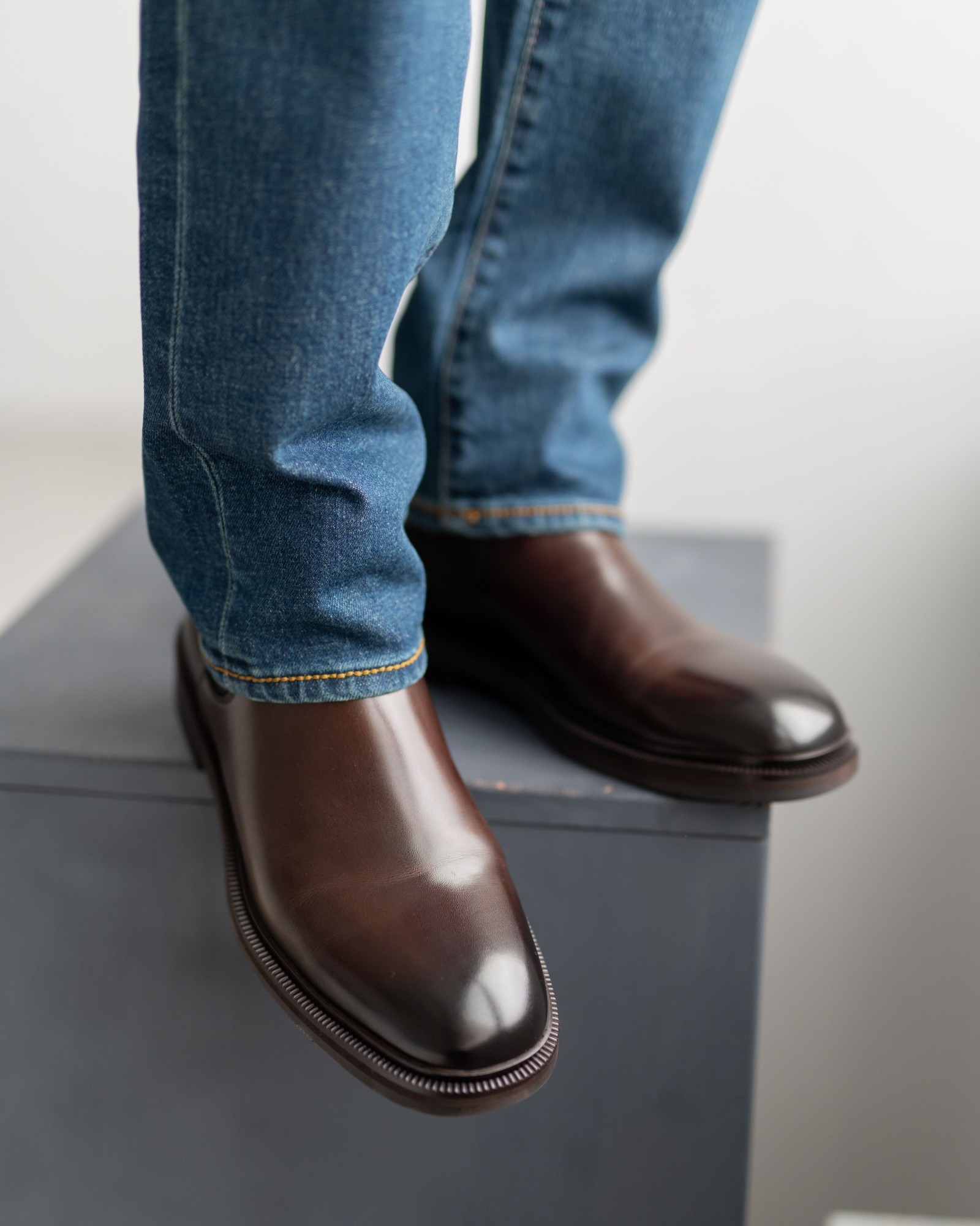 Эти коричневые челси — пример того, как сдержанная классика может выглядеть современно и статусно. Гладкая союзка подчёркивает чистоту линий, а уникальная форма мыска — одновременно округлая и слегка прямолинейная — придаёт паре узнаваемый характер. Такой силуэт делает обувь элегантной и уверенной, не перегружая образ. Универсальный коричневый оттенок легко сочетается и с костюмом, и с тёмными джинсами, создавая безупречный вид в любое время дня. Приходите на примерку: вживую эти челси раскрываются ещё ярче — по посадке, мягкости кожи и ощущению безупречного стиля.