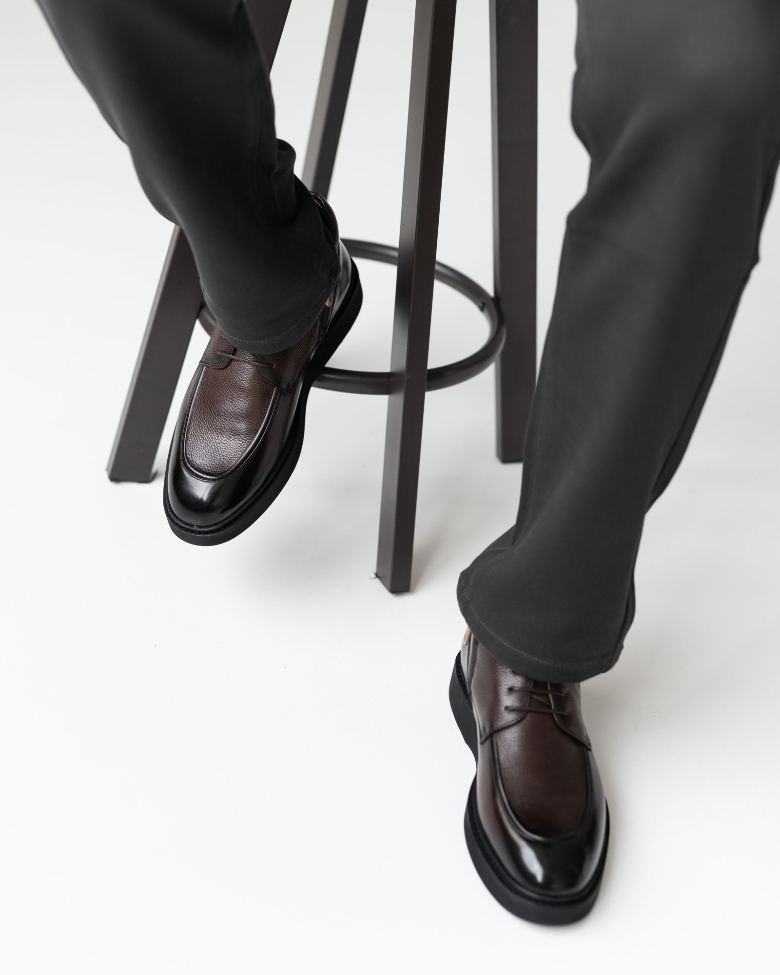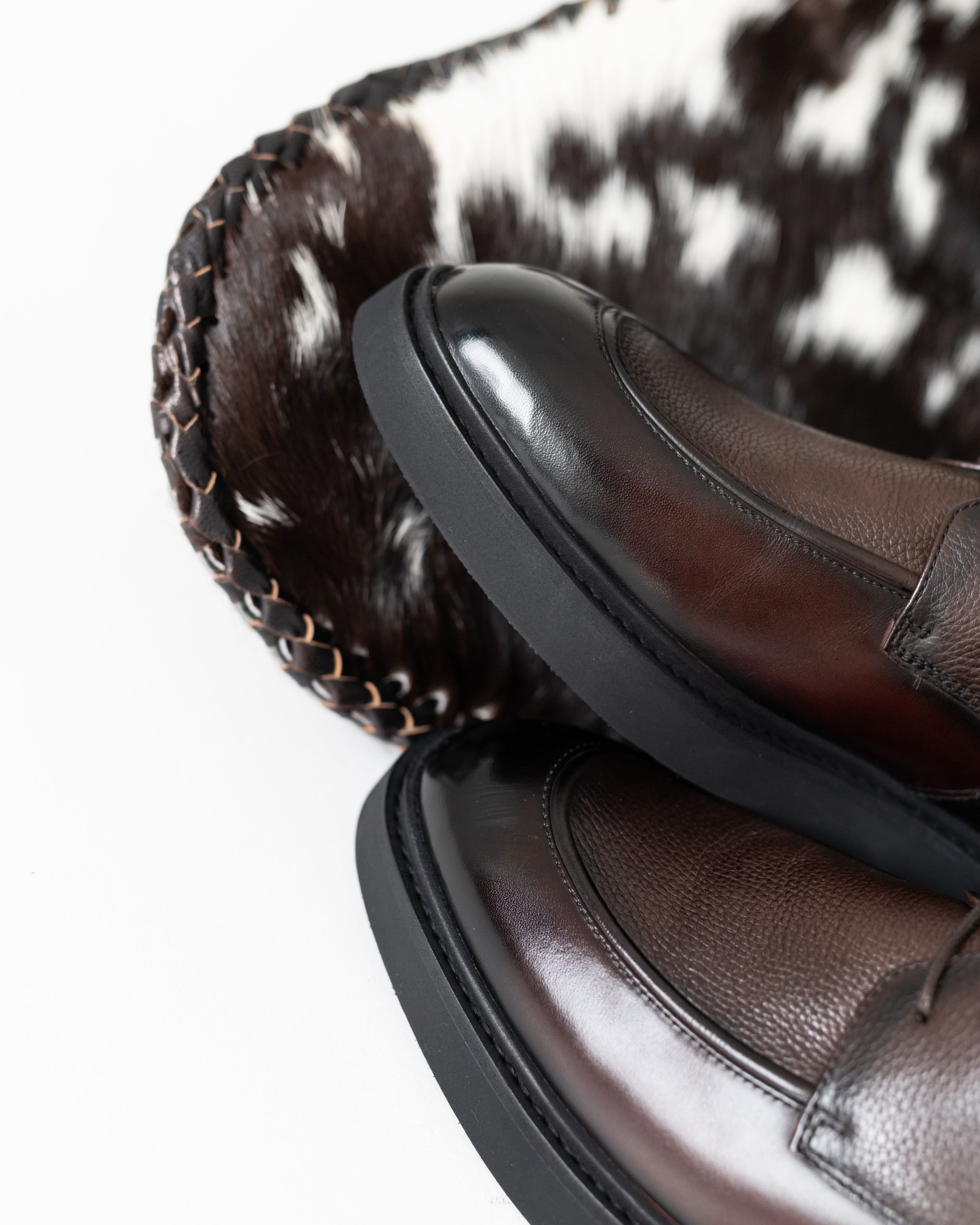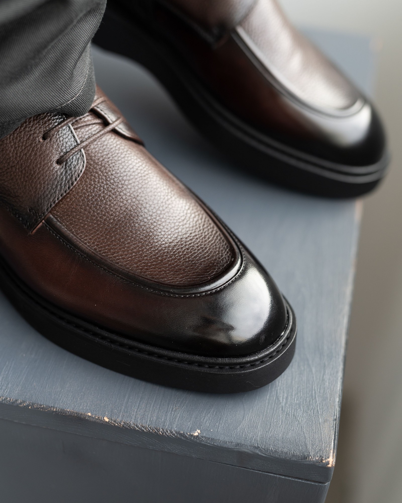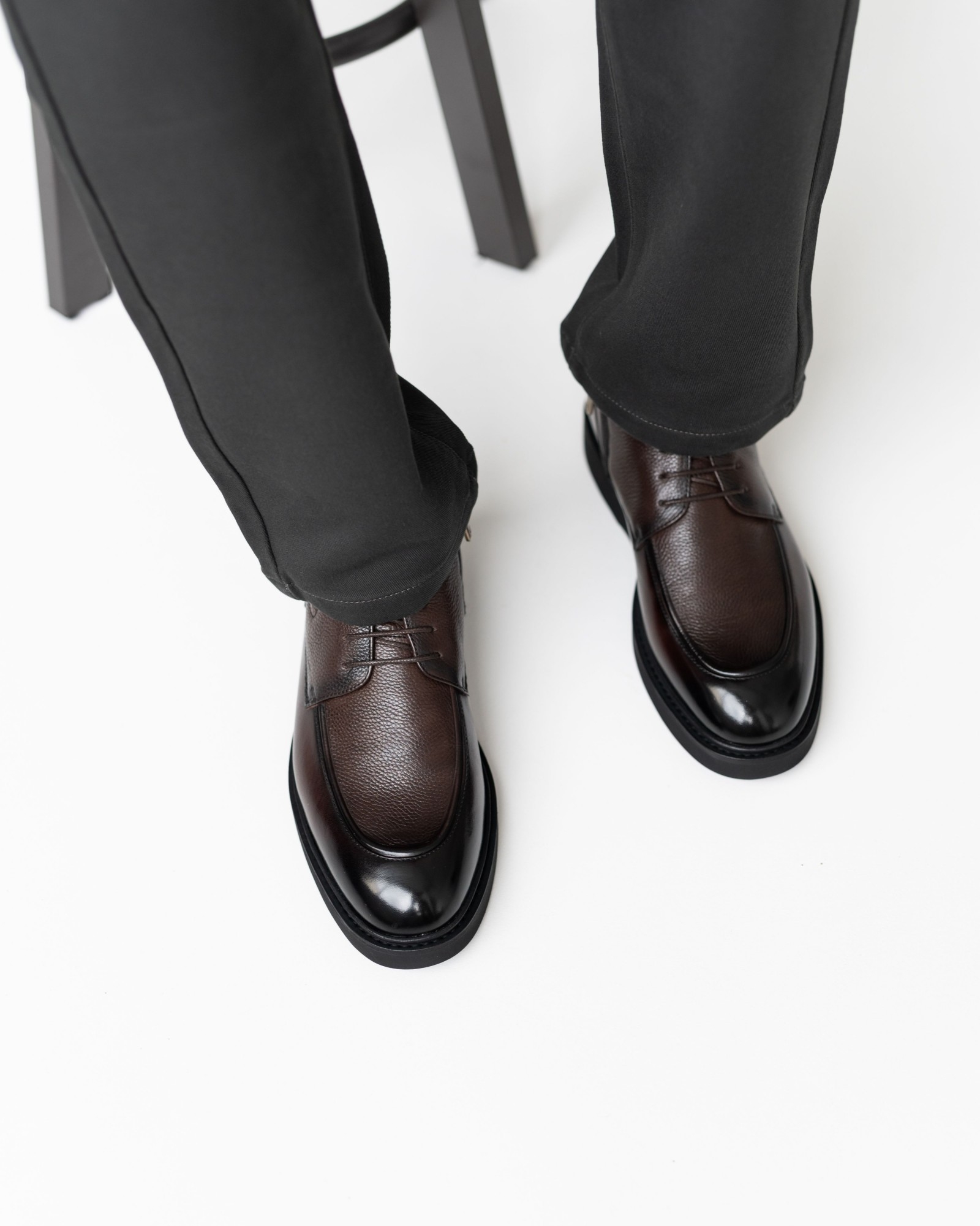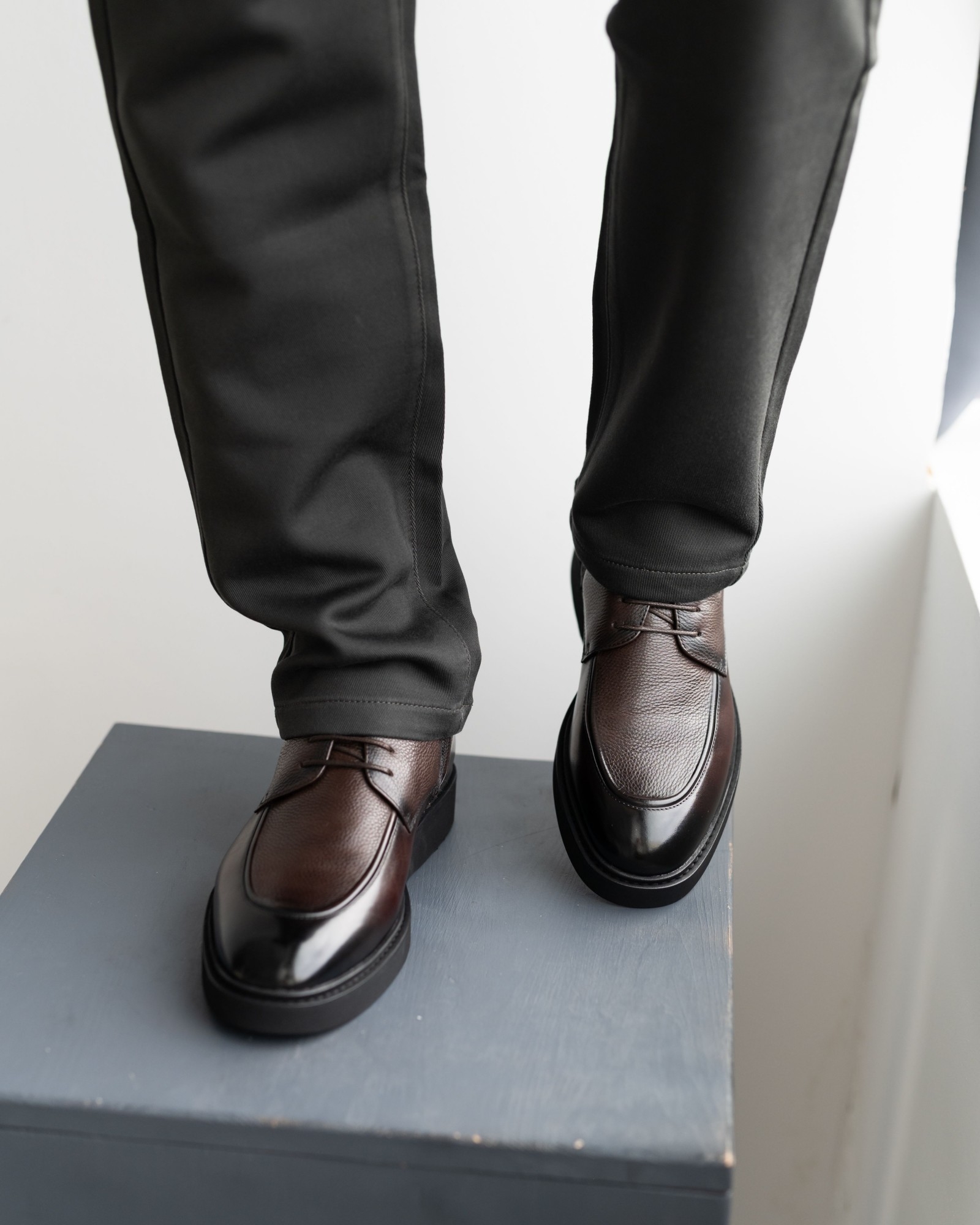 Эта пара выполнена из комбинации двух типов коричневой кожи: гладкой шлифованной и мягкой фактурной. Такой приём создаёт выразительный контраст поверхностей и придаёт модели благородный характер. Отделка носка напоминает шов, используемый в лоферах, при этом выполнена максимально аккуратно и элегантно. Подошва платформенного типа с чуть выделенным каблуком обеспечивает устойчивость и современный силуэт, оставаясь при этом практически незаметной. Умеренный блеск кожи добавляет глубины цвету и подчеркивает индивидуальность владельца.