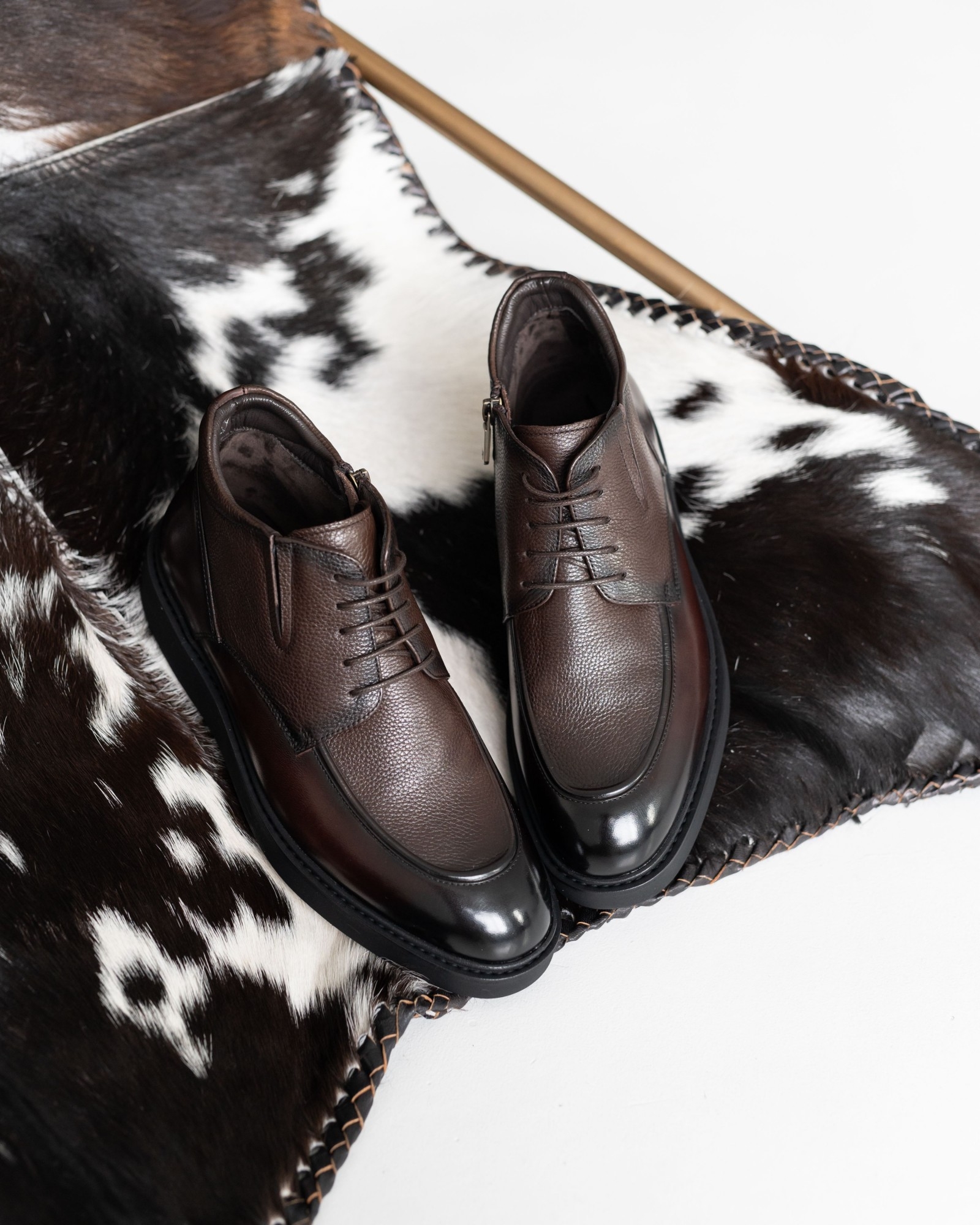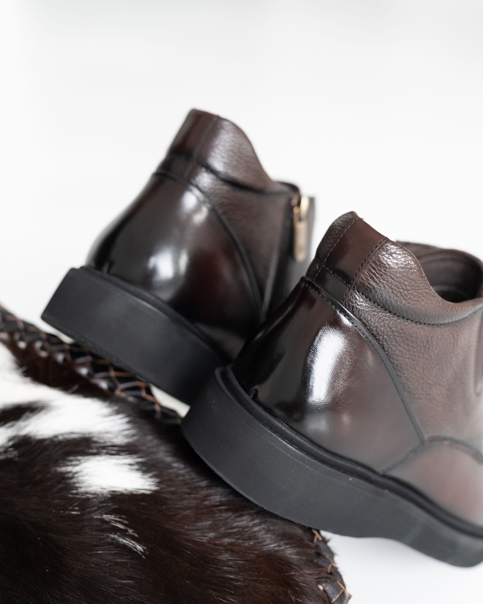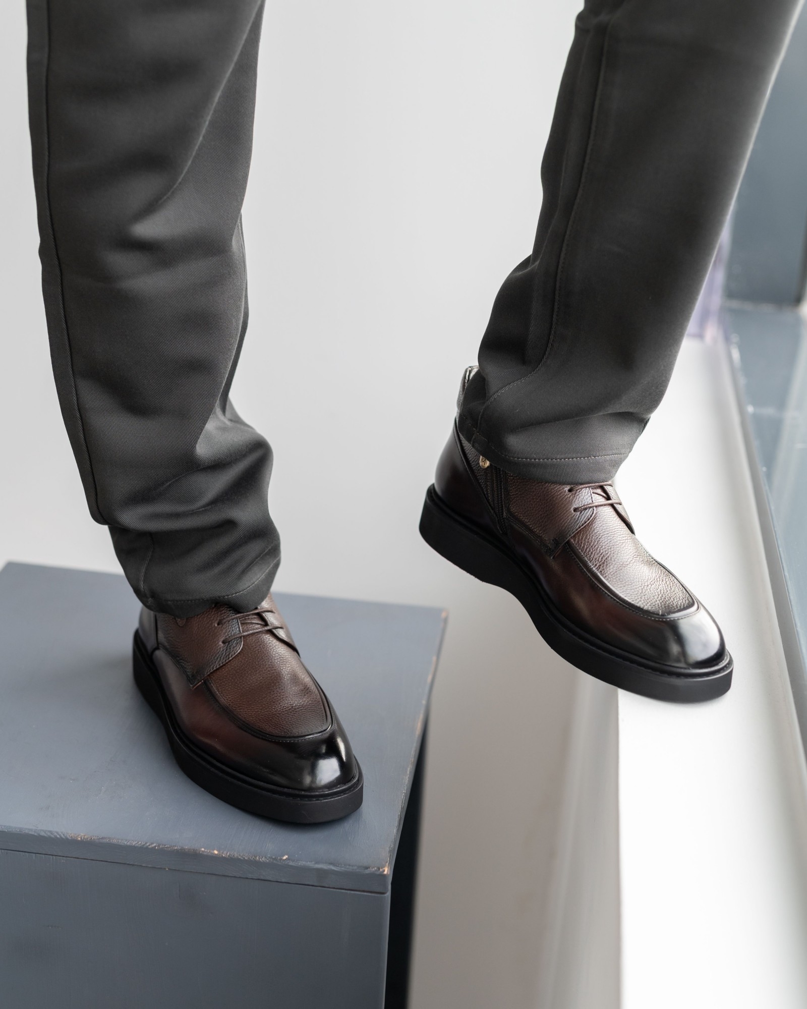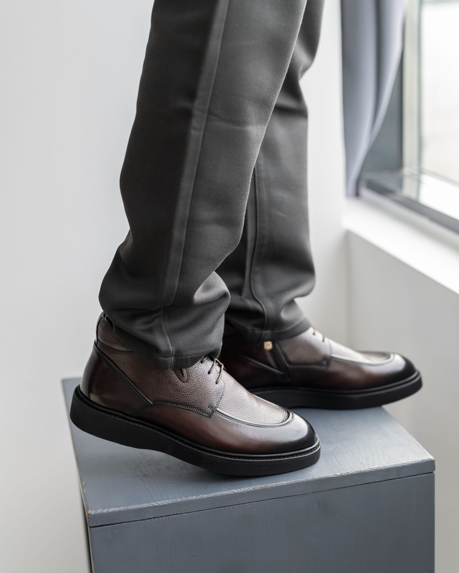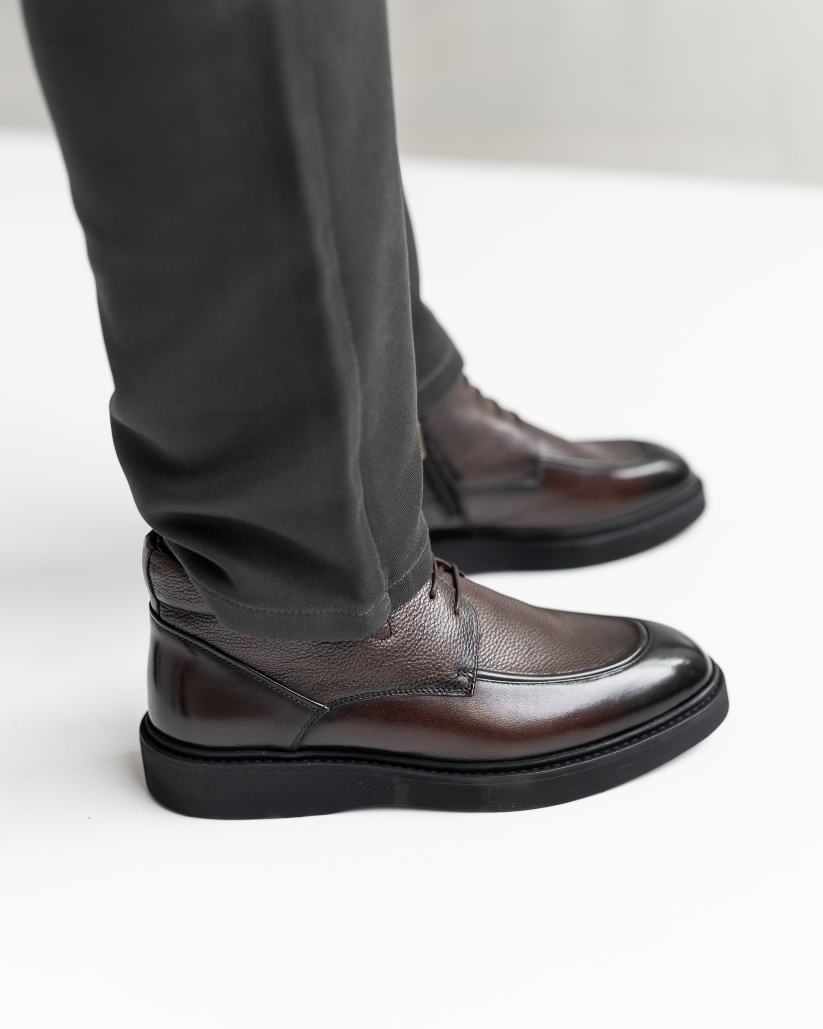 Эта пара выполнена из комбинации двух типов коричневой кожи: гладкой шлифованной и мягкой фактурной. Такой приём создаёт выразительный контраст поверхностей и придаёт модели благородный характер. Отделка носка напоминает шов, используемый в лоферах, при этом выполнена максимально аккуратно и элегантно. Подошва платформенного типа с чуть выделенным каблуком обеспечивает устойчивость и современный силуэт, оставаясь при этом практически незаметной. Умеренный блеск кожи добавляет глубины цвету и подчеркивает индивидуальность владельца.