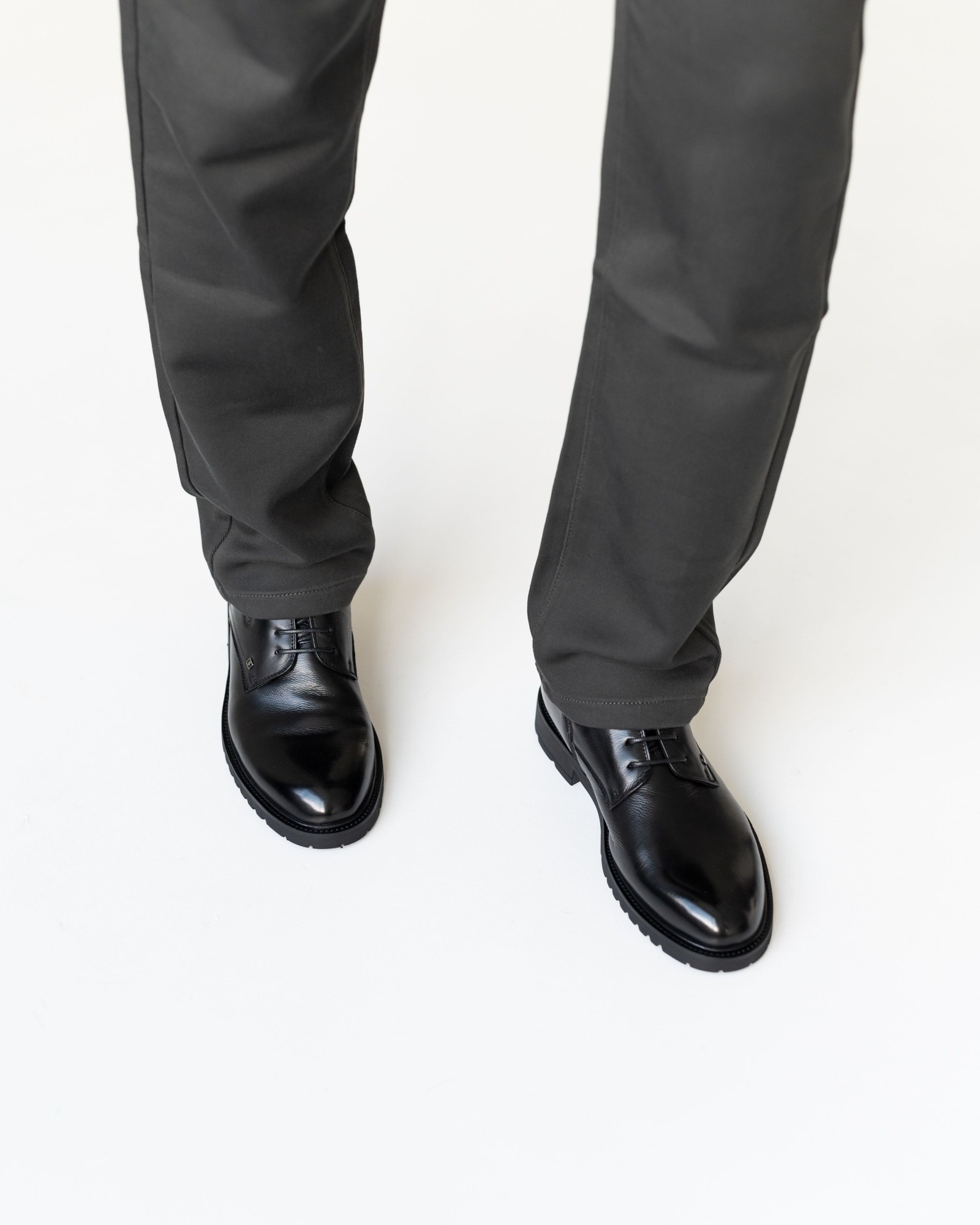 Эта пара выполнена из гладкой кожи с подкладкой из байки. Средняя высота и слегка утолщённая подошва обеспечивают комфорт, а шнуровка и внутренний замок — удобство надевания. Модель отличается строгим и лаконичным силуэтом, универсальным для разных образов.