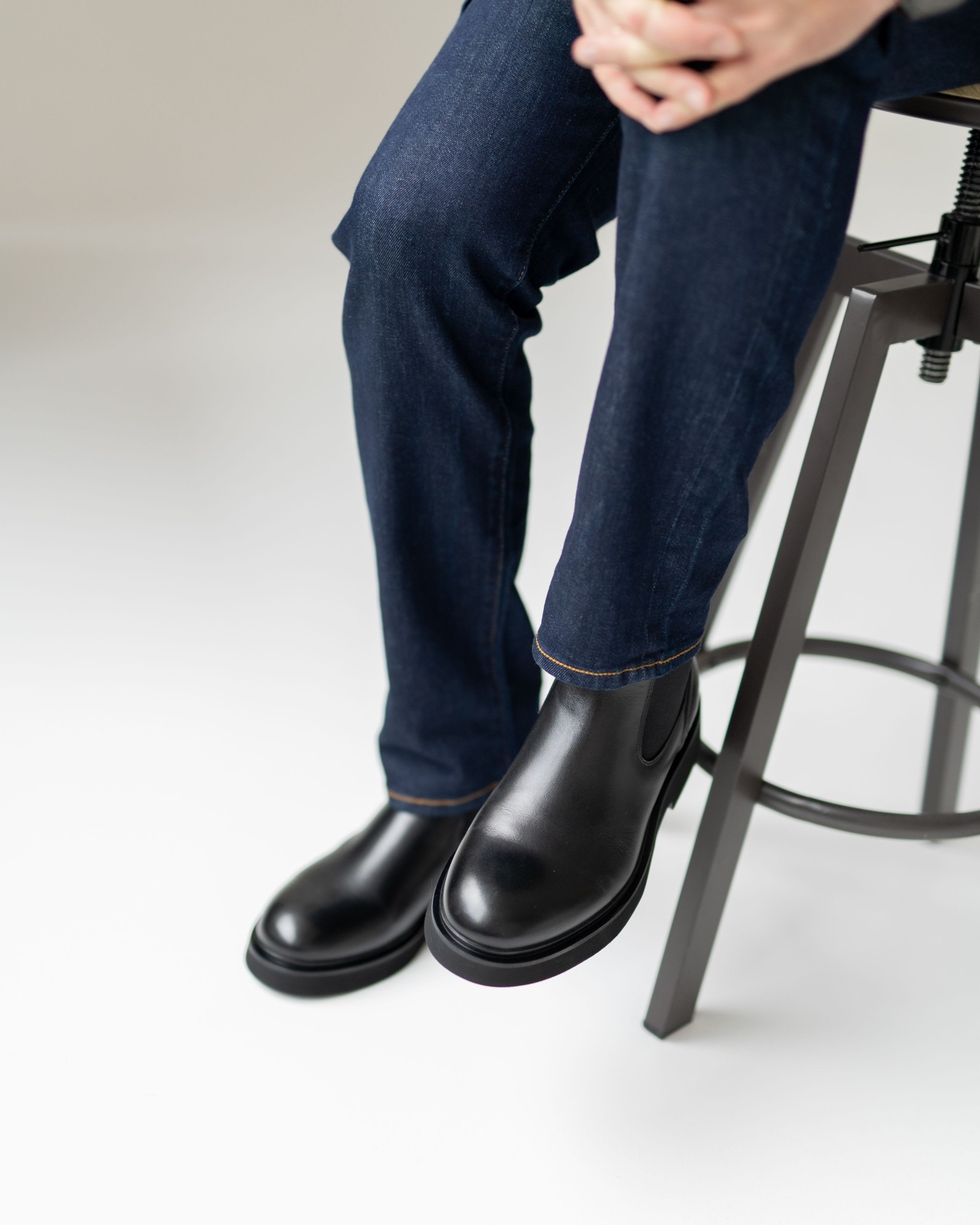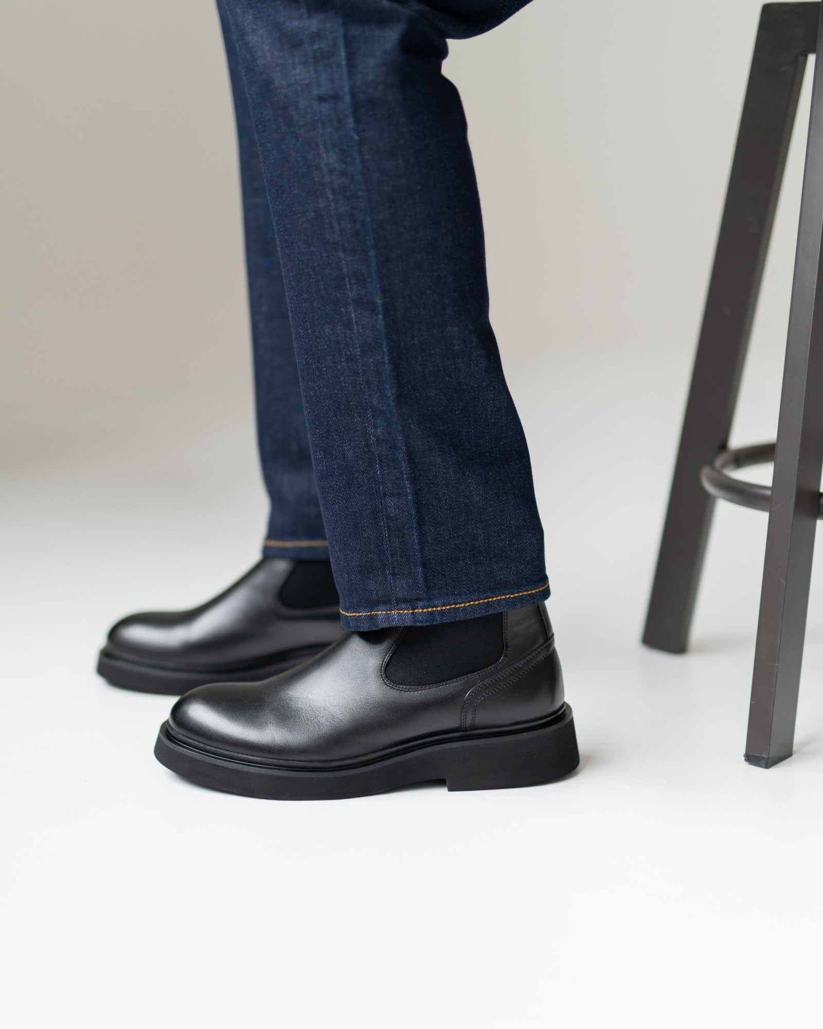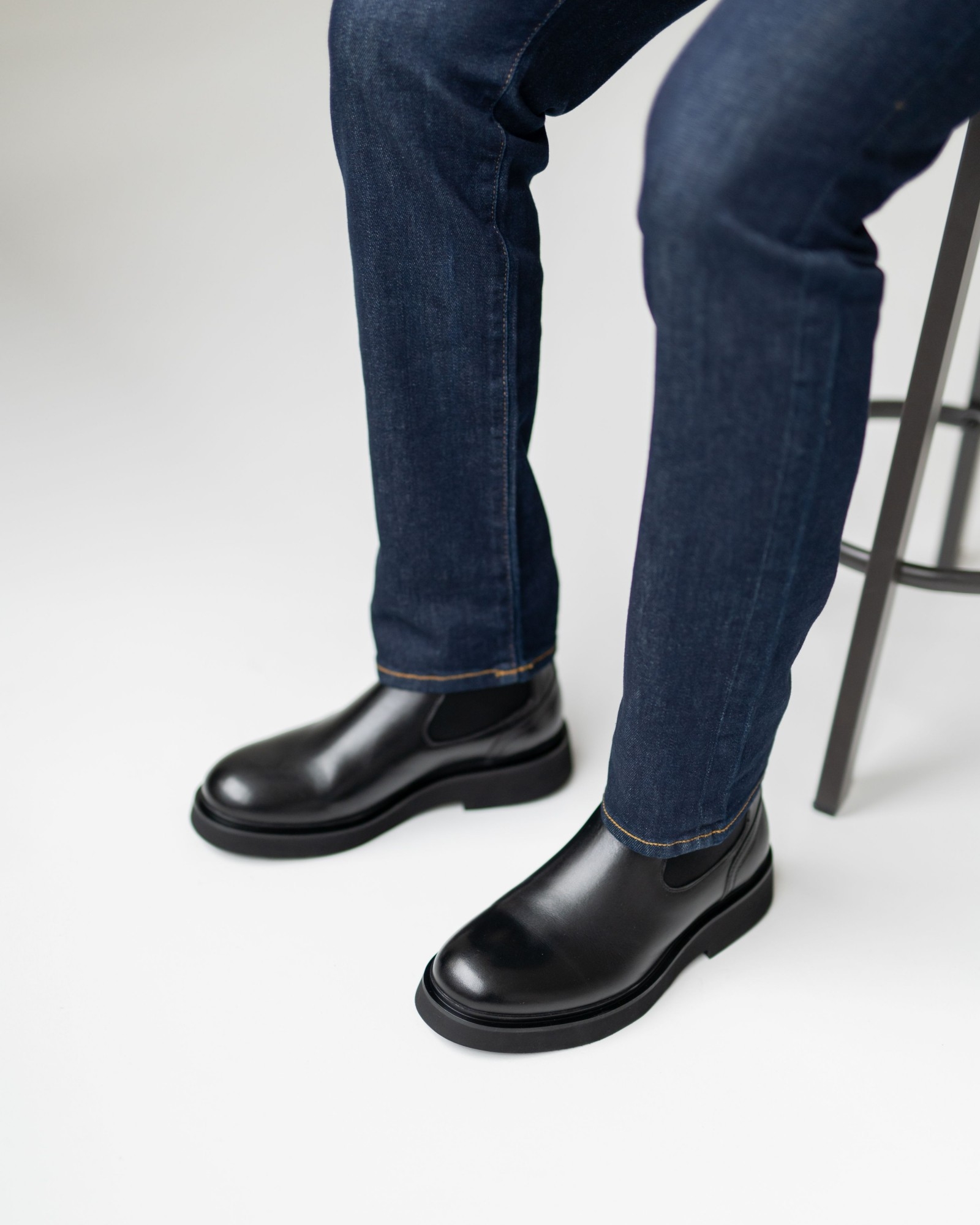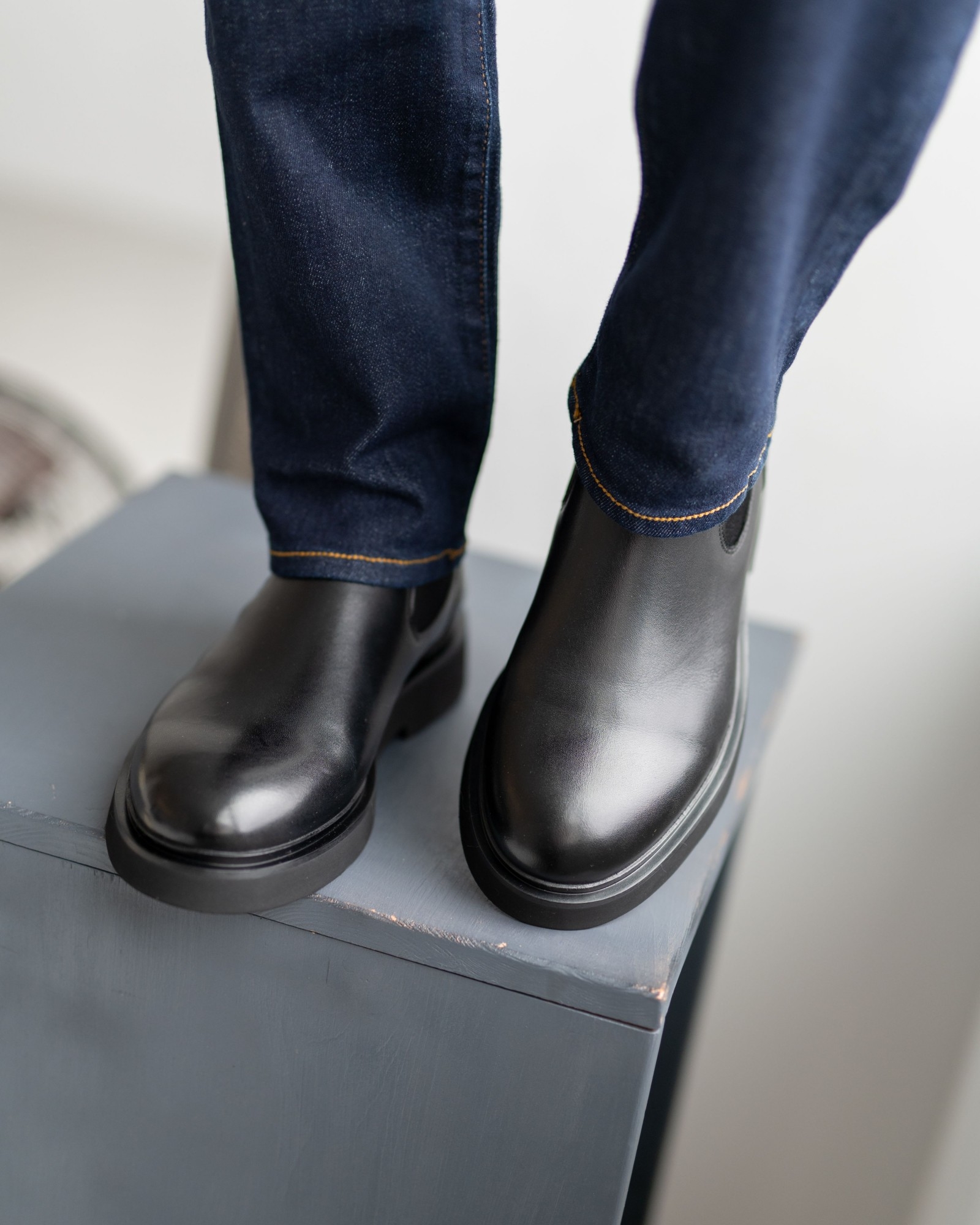 Чёрные челси на утолщённой подошве сначала читаются как строгая классика, но стоит надеть их — и ощущается совершенно иной, современный темперамент пары. Лёгкая цельная подошва формирует чистый, актуальный силуэт без лишних деталей. Шлифованная кожа в глубоких чёрных тонах добавляет модели аккуратности и премиального минимализма. В итоге это не просто челси, а обновлённая версия классики, созданная для тех, кто ценит современный ритм и безупречный внешний вид. Приходите на примерку — разница в ощущениях становится очевидной с первых шагов.