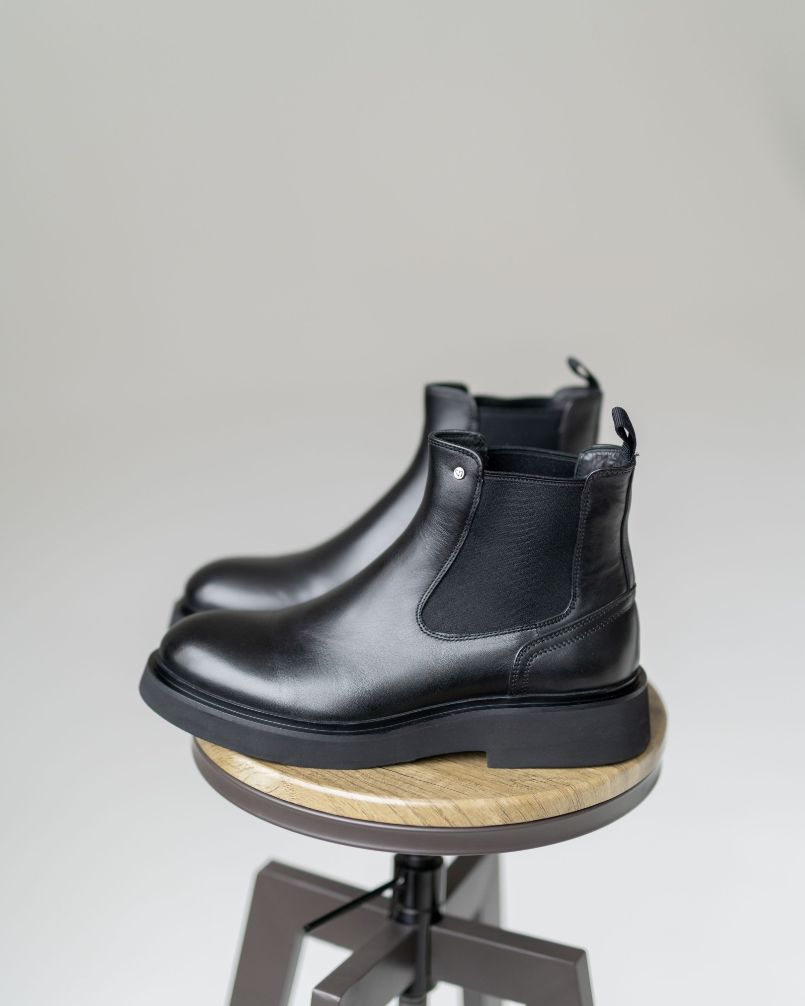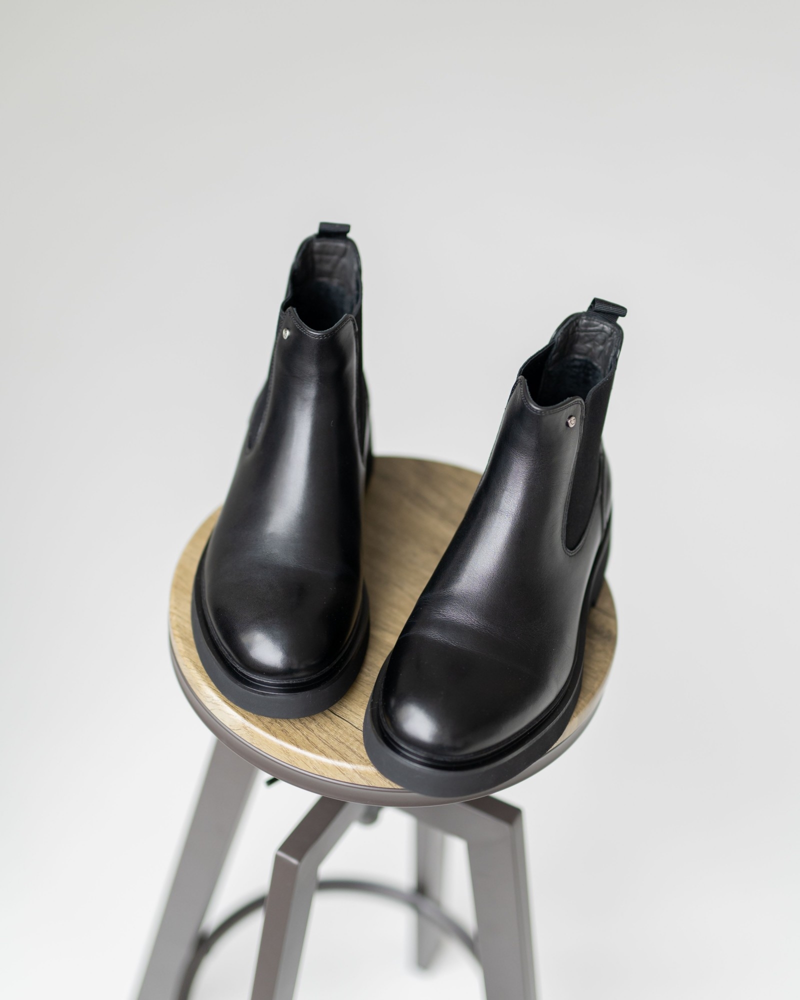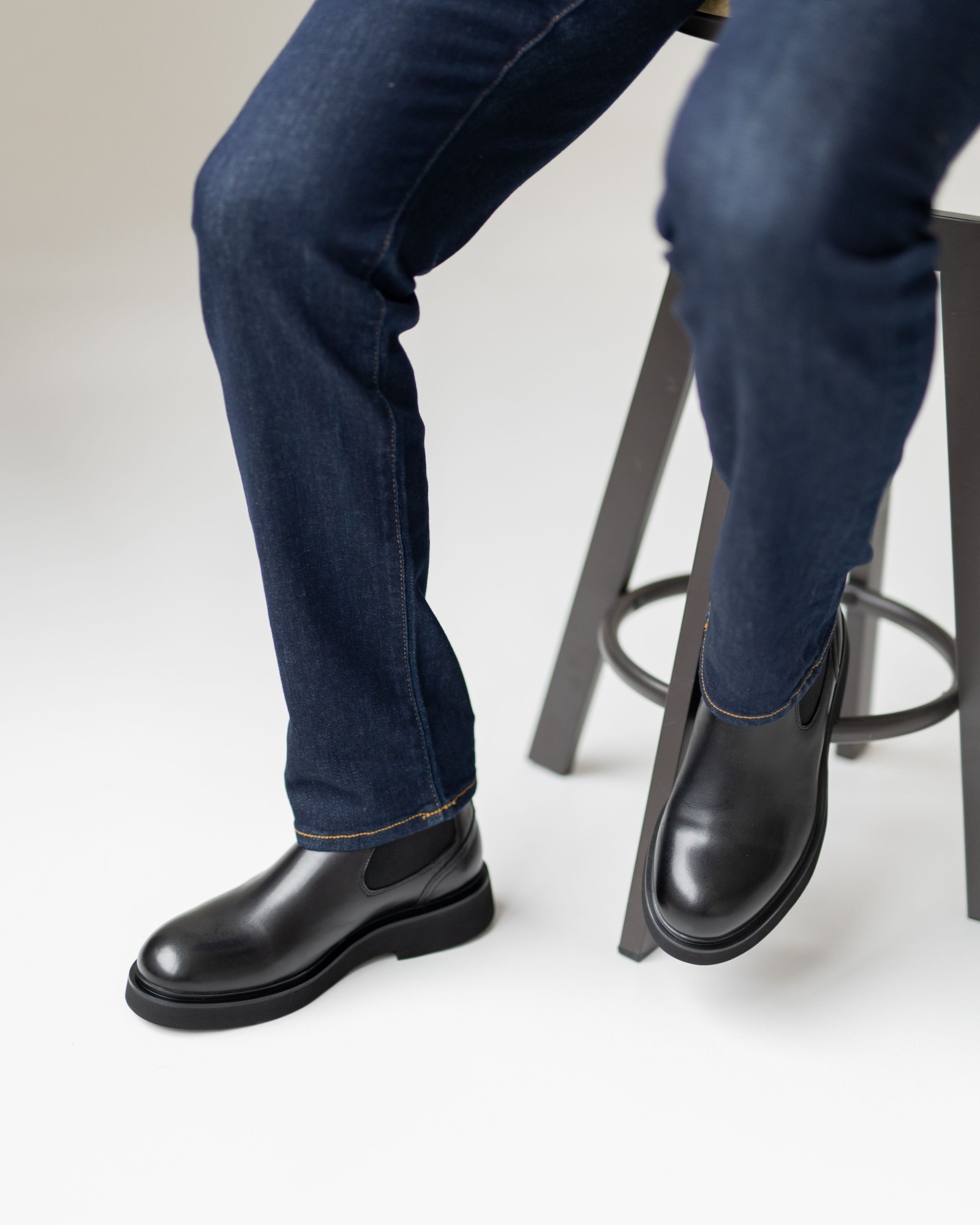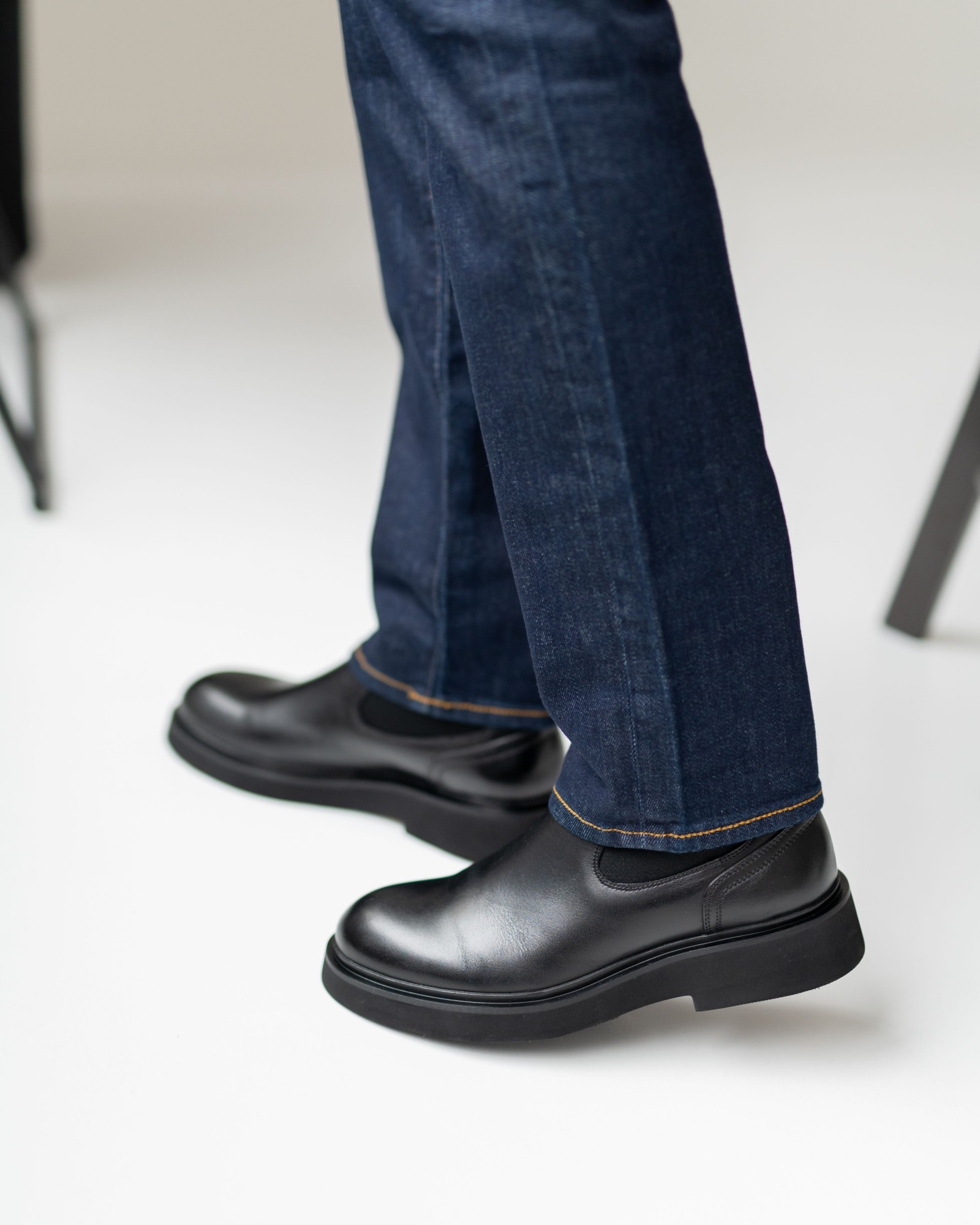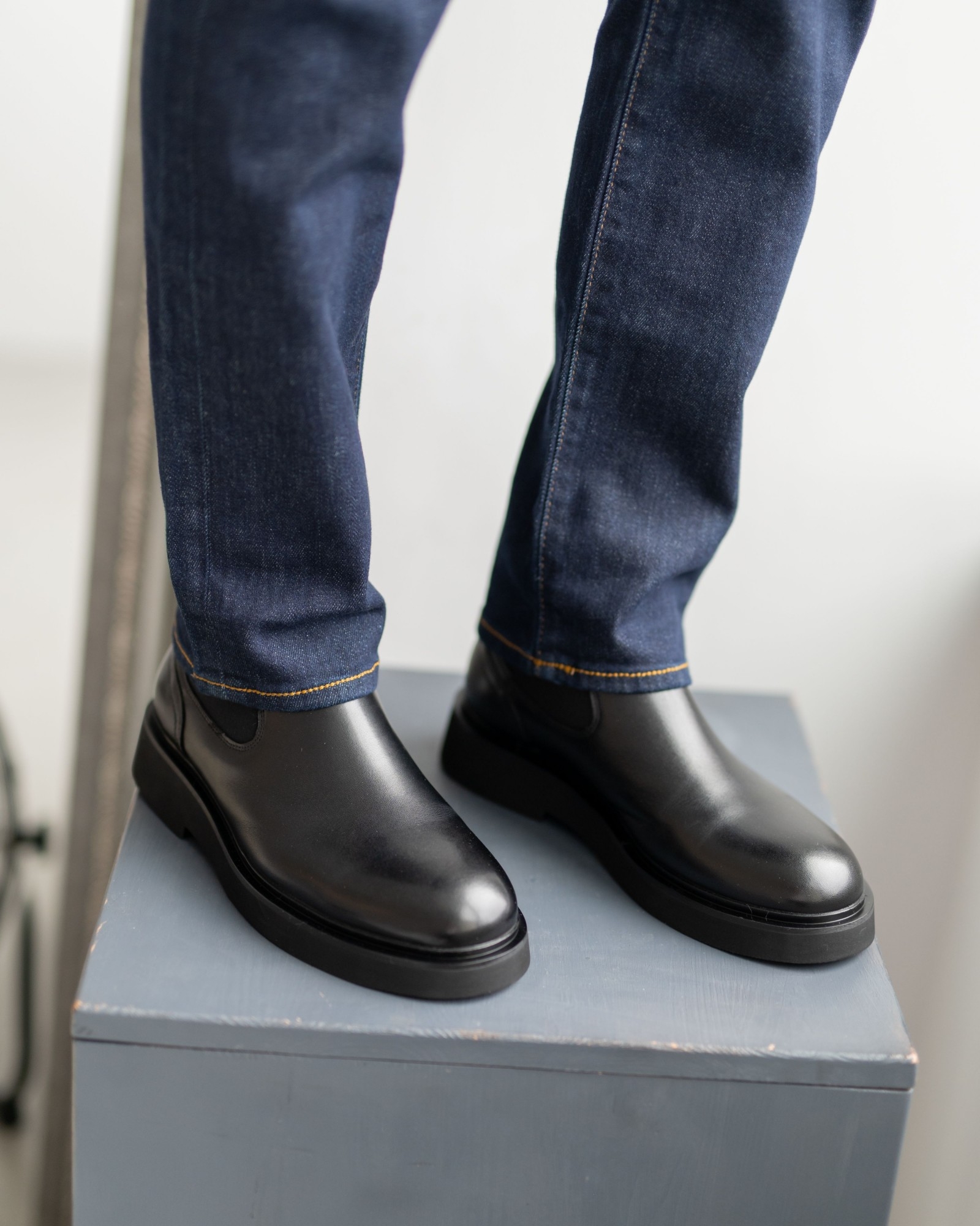 Чёрные челси на утолщённой подошве сначала читаются как строгая классика, но стоит надеть их — и ощущается совершенно иной, современный темперамент пары. Лёгкая цельная подошва формирует чистый, актуальный силуэт без лишних деталей. Шлифованная кожа в глубоких чёрных тонах добавляет модели аккуратности и премиального минимализма. В итоге это не просто челси, а обновлённая версия классики, созданная для тех, кто ценит современный ритм и безупречный внешний вид. Приходите на примерку — разница в ощущениях становится очевидной с первых шагов.