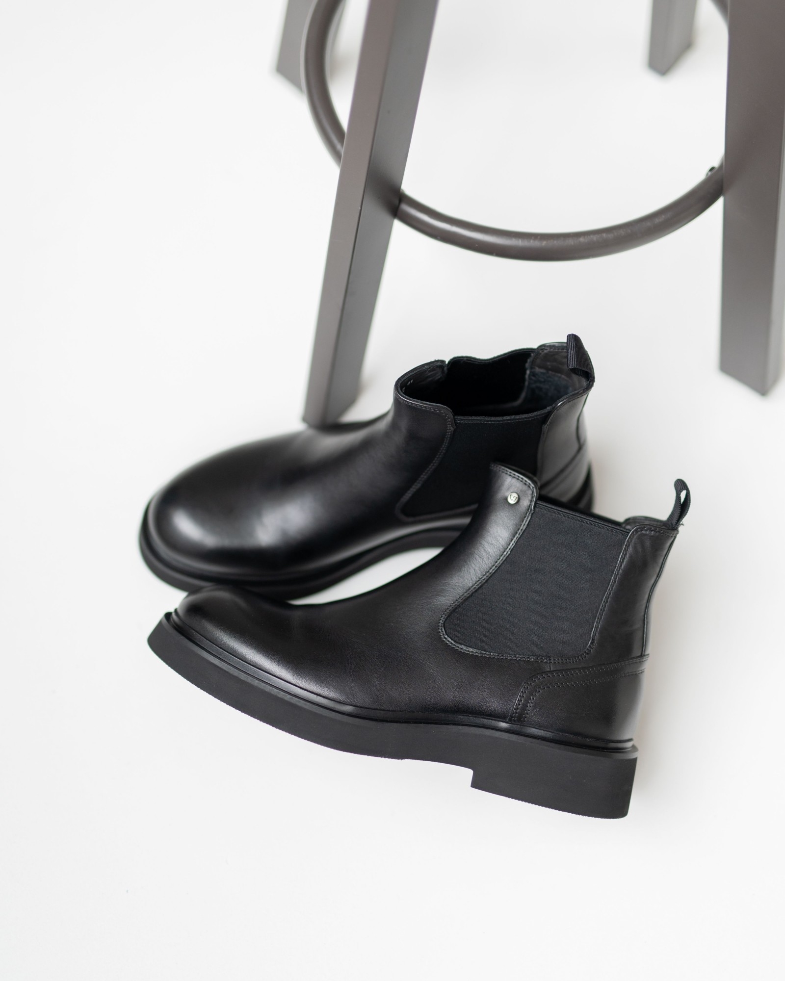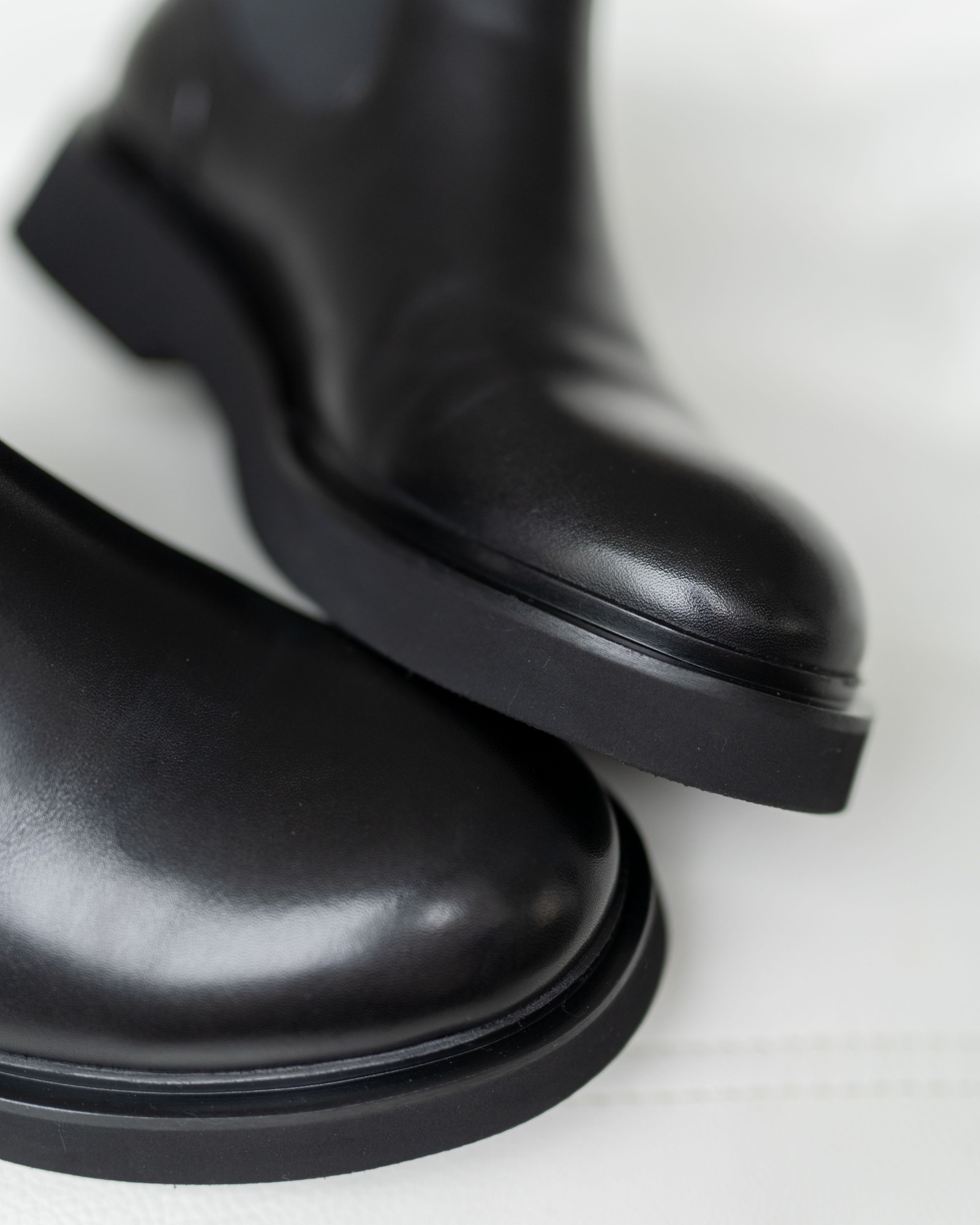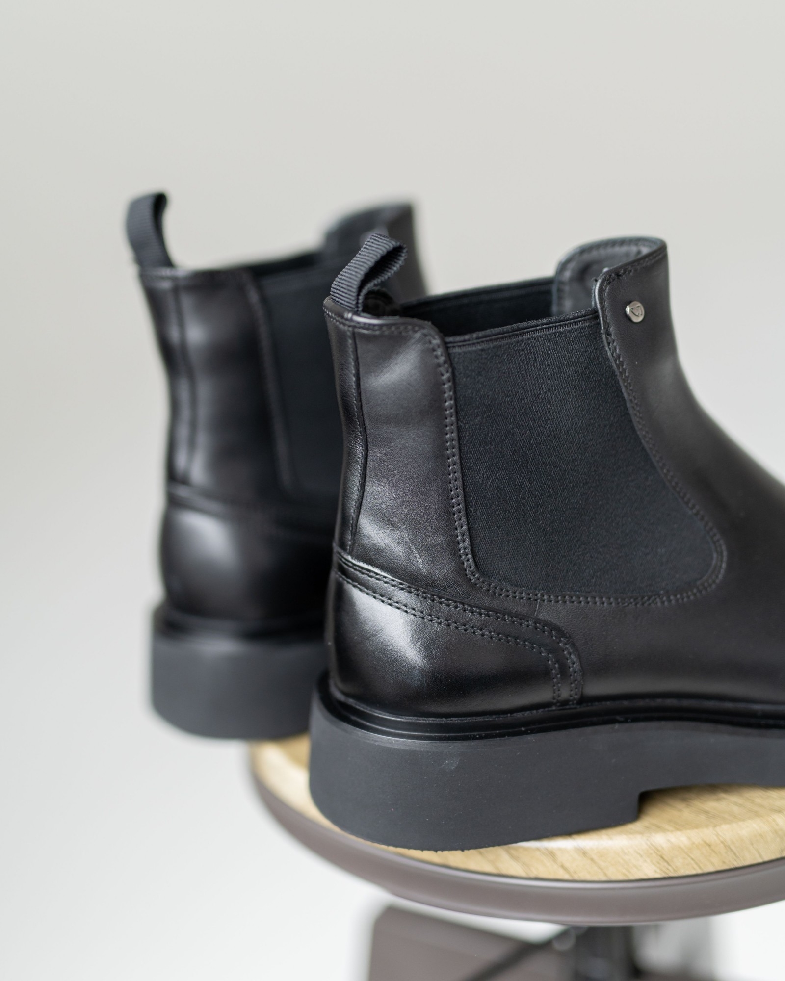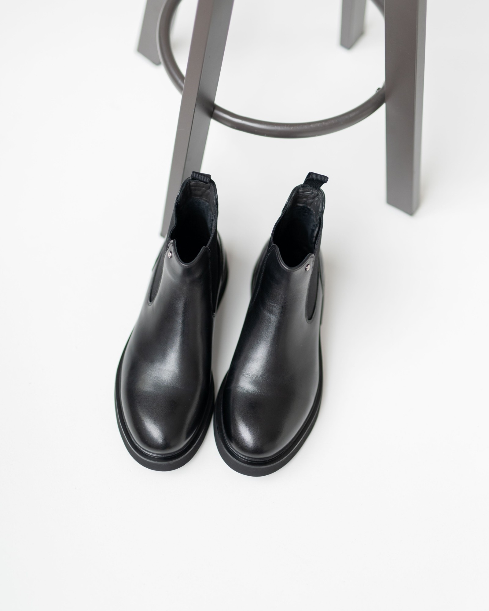 Чёрные челси на утолщённой подошве сначала читаются как строгая классика, но стоит надеть их — и ощущается совершенно иной, современный темперамент пары. Лёгкая цельная подошва формирует чистый, актуальный силуэт без лишних деталей. Шлифованная кожа в глубоких чёрных тонах добавляет модели аккуратности и премиального минимализма. В итоге это не просто челси, а обновлённая версия классики, созданная для тех, кто ценит современный ритм и безупречный внешний вид. Приходите на примерку — разница в ощущениях становится очевидной с первых шагов.