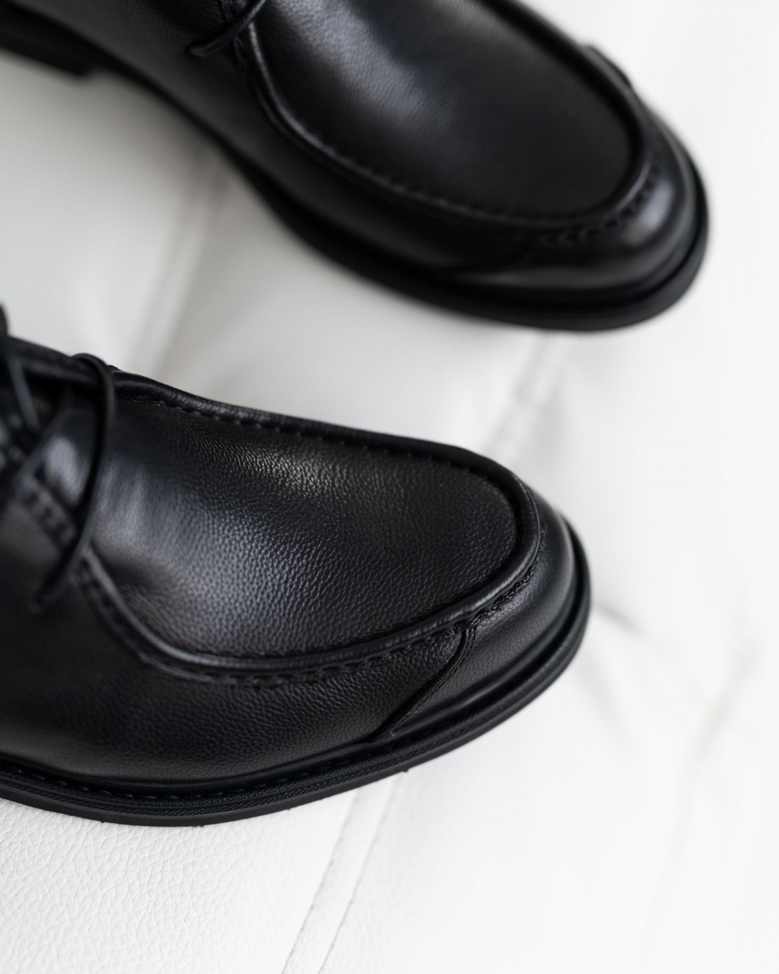 Элегантные классические туфли с элементами лоферов, сочетающие в себе сдержанность и стиль. Модель выполнена из мягкой чёрной кожи с гладкой, слегка матовой текстурой, которая подчёркивает её премиальность. Аккуратная тонкая шнуровка обеспечивает идеальную посадку по ноге, а нестандартная форма носка придаёт обуви изысканный, современный вид.