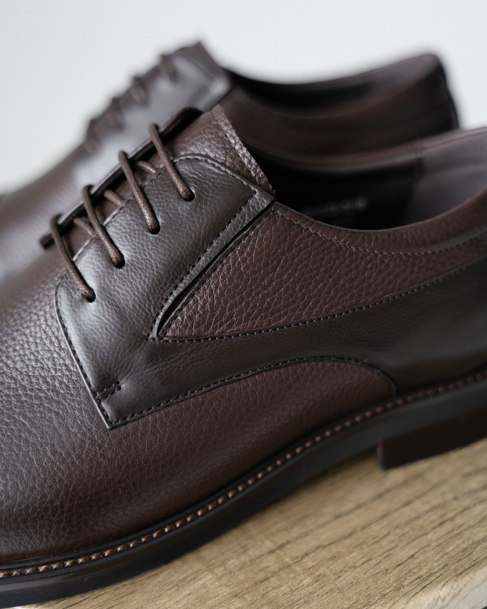 Модель выполнена из двух видов кожи: шлифованная — на носке для выразительного блеска, и мягкая структурная — в зоне изгиба для максимального комфорта. Элегантная шнуровка дополнена незаметной резинкой на подъёме, чтобы обувь легко адаптировалась к движению стопы. Универсальная пара, сочетающая строгость и удобство.