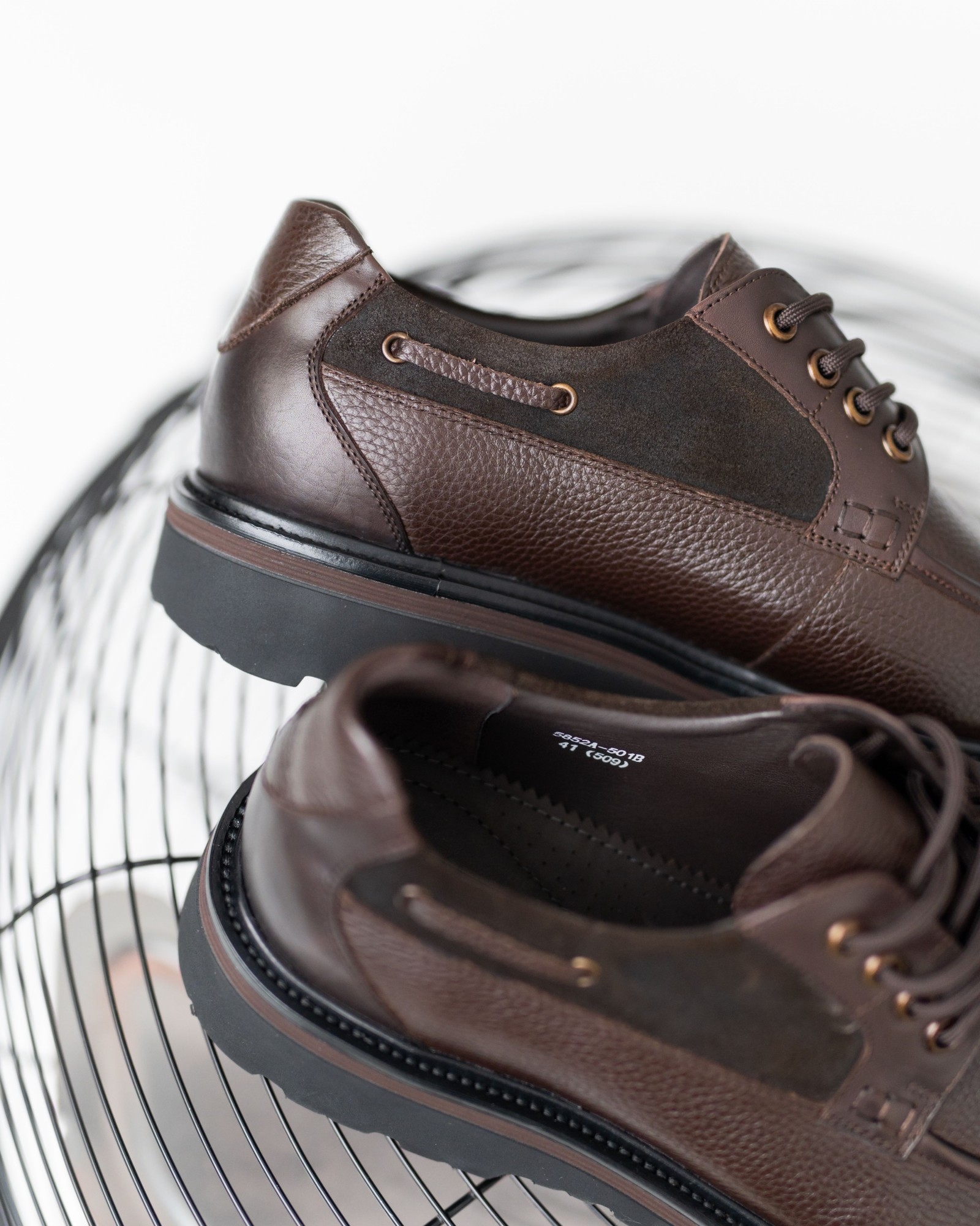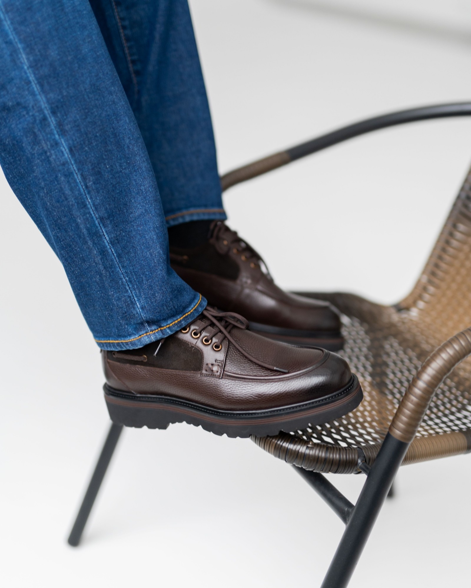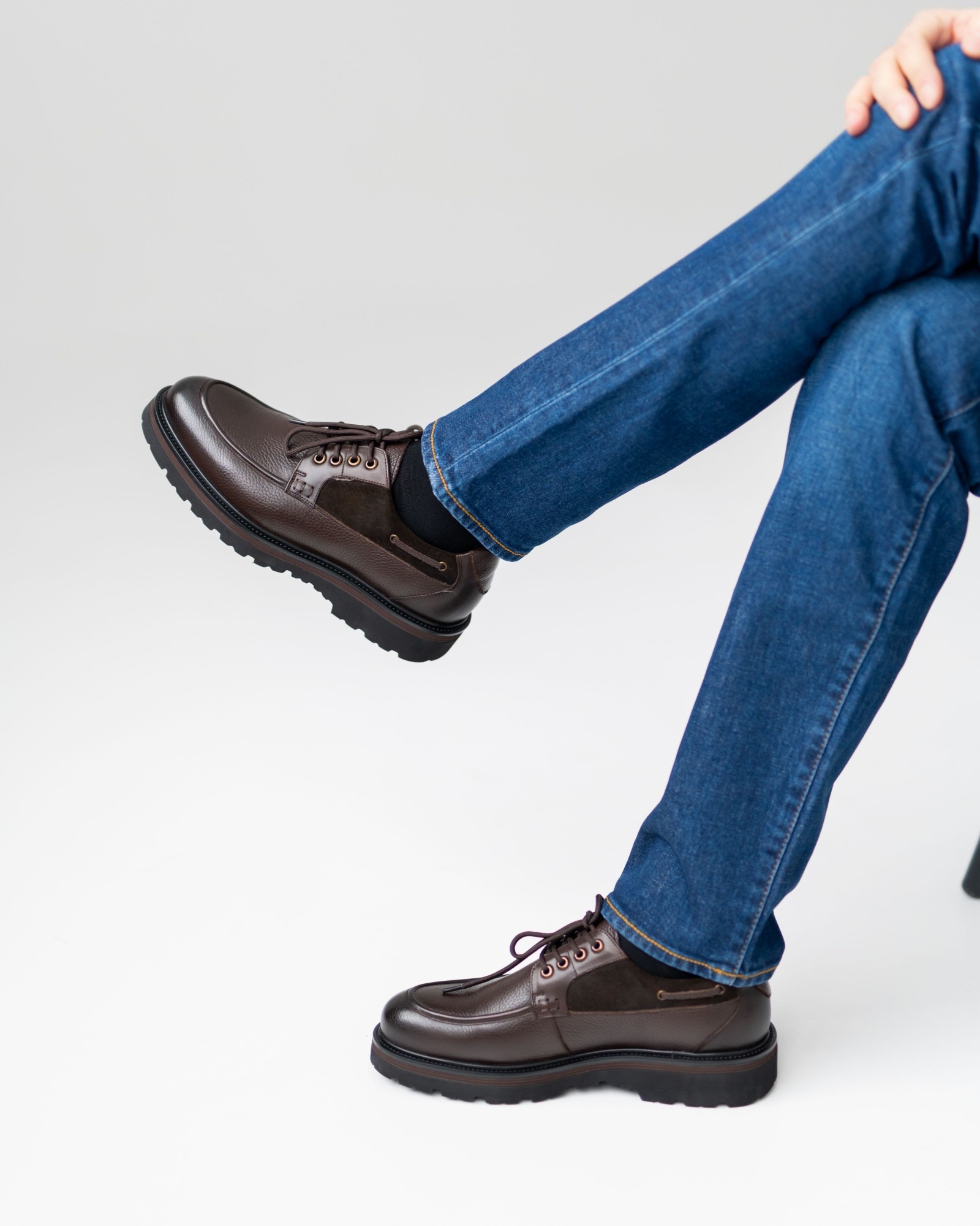 Современная классика, в которой коричневая кожа сочетается с аккуратными вставками замши, создавая выразительный, но сдержанный силуэт. Форма модели напоминает топсайдеры, однако общий характер уверенно тяготеет к классике — строгой, универсальной и актуальной в любой сезон. Мягкая посадка, устойчивое основание и сбалансированное сочетание фактур делают пару идеальным выбором для повседневного гардероба с акцентом на стиль и комфорт. Это обувь, которая легко вписывается в жизнь и работает на образ владельца, а не наоборот.