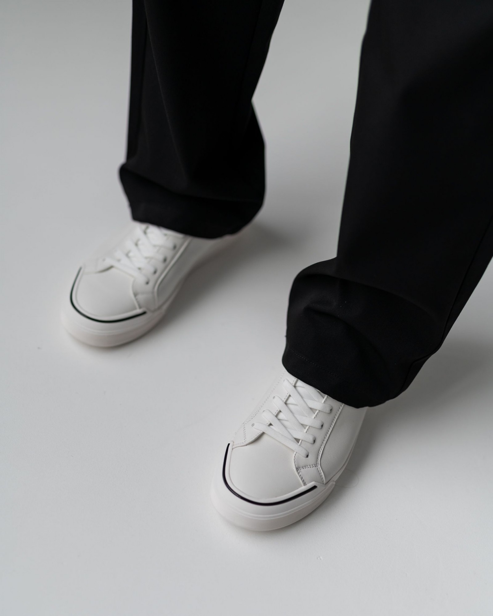 Лёгкие белые кеды с декоративными чёрными полосками — стильное и универсальное решение. Современный минималистичный дизайн позволяет сочетать их с любой одеждой, от классики до спортивного стиля. Отлично смотрятся как с модными широкими брюками, так и с джинсами, создавая гармоничный образ с тёмным или светлым верхом.