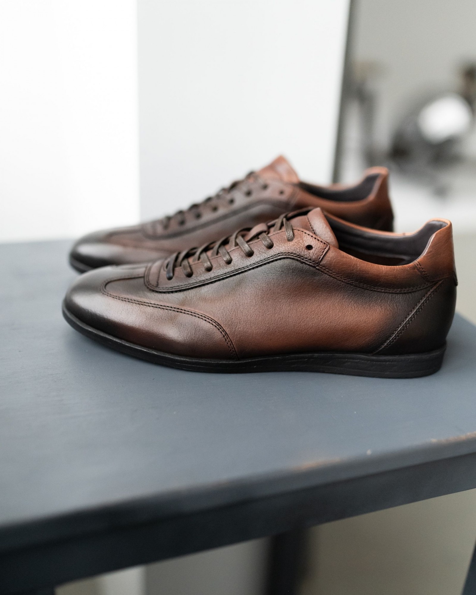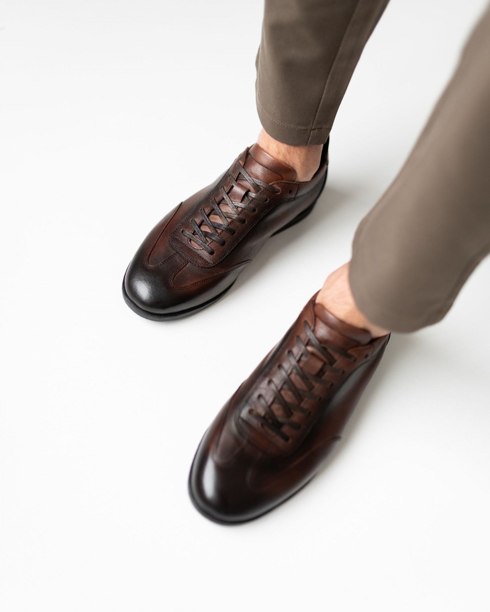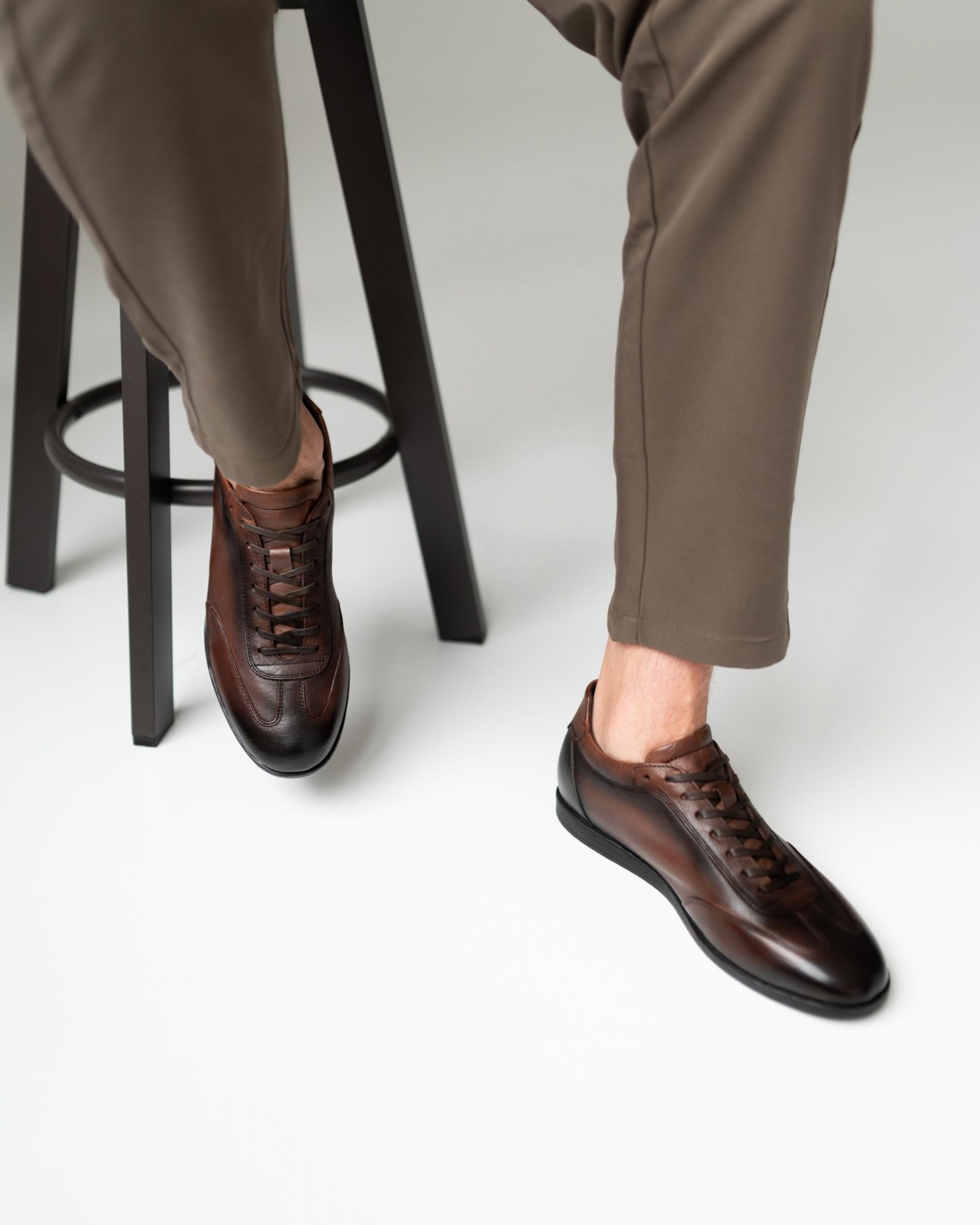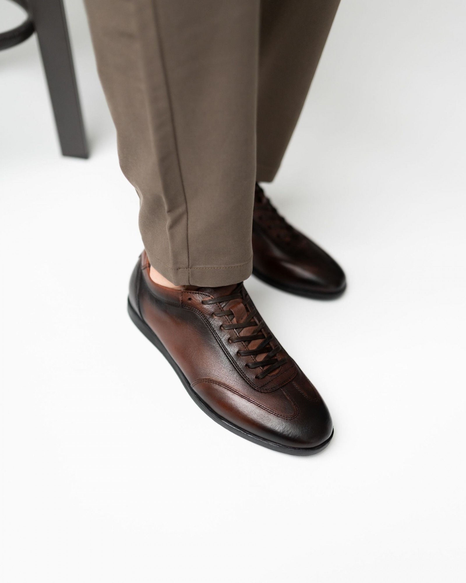 Эти коричневые туфли — идеальный выбор для тех, кто ищет универсальную модель, сочетающую стиль классических туфель с лёгкостью кед. Насыщенный коричневый цвет с более тёмными участками тонировки создаёт интересный визуальный эффект, а воскованные шнурки добавляют изысканности и оригинальности. Эти туфли идеально подойдут для ситуаций, когда нужно выглядеть стильно, но не обязательно соблюдать строгий дресс-код.