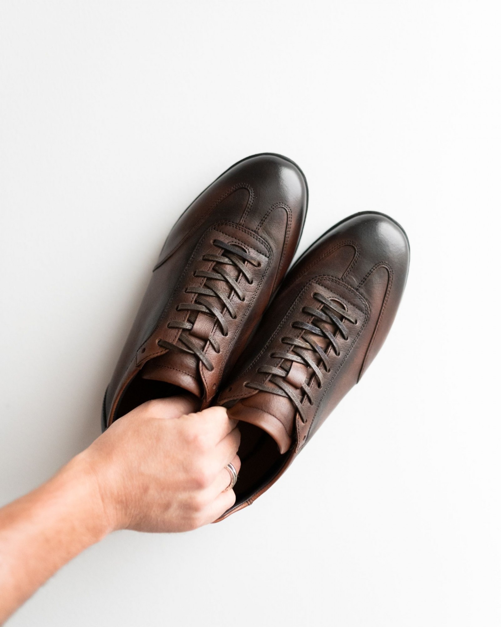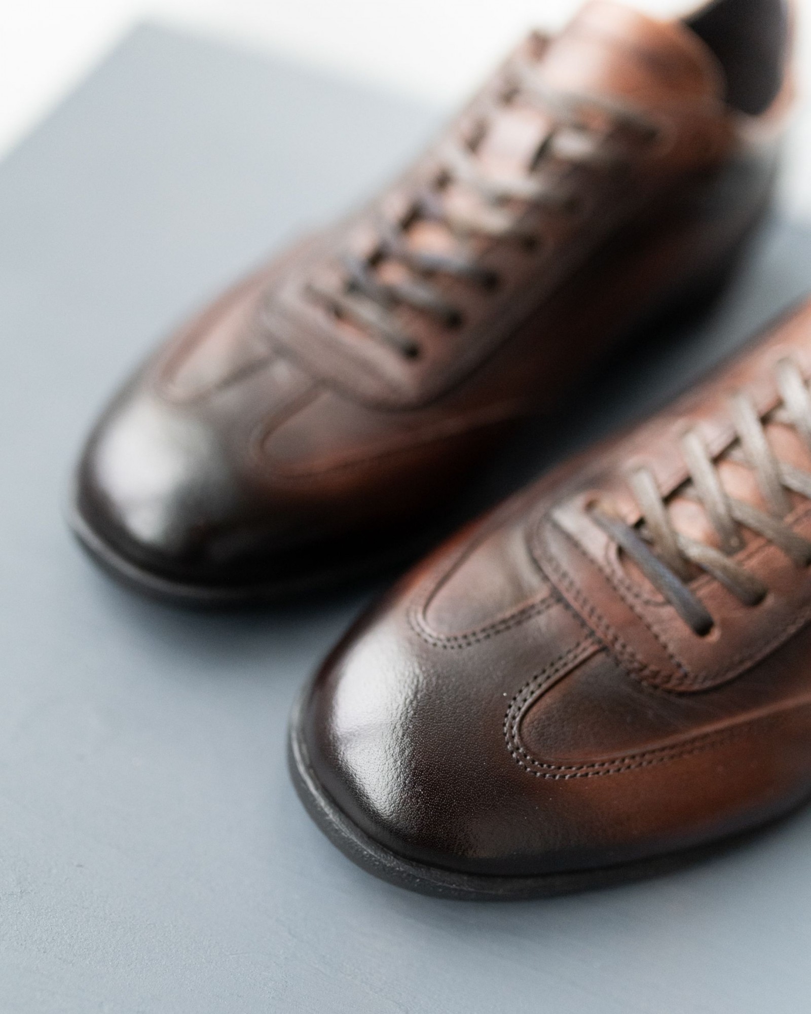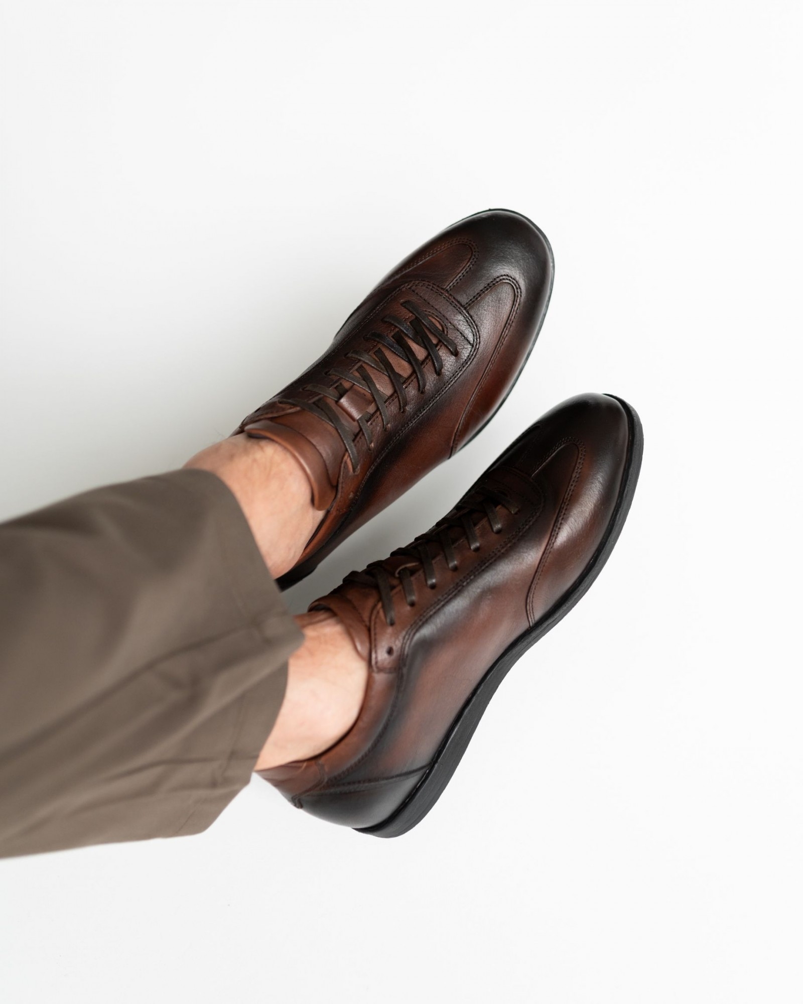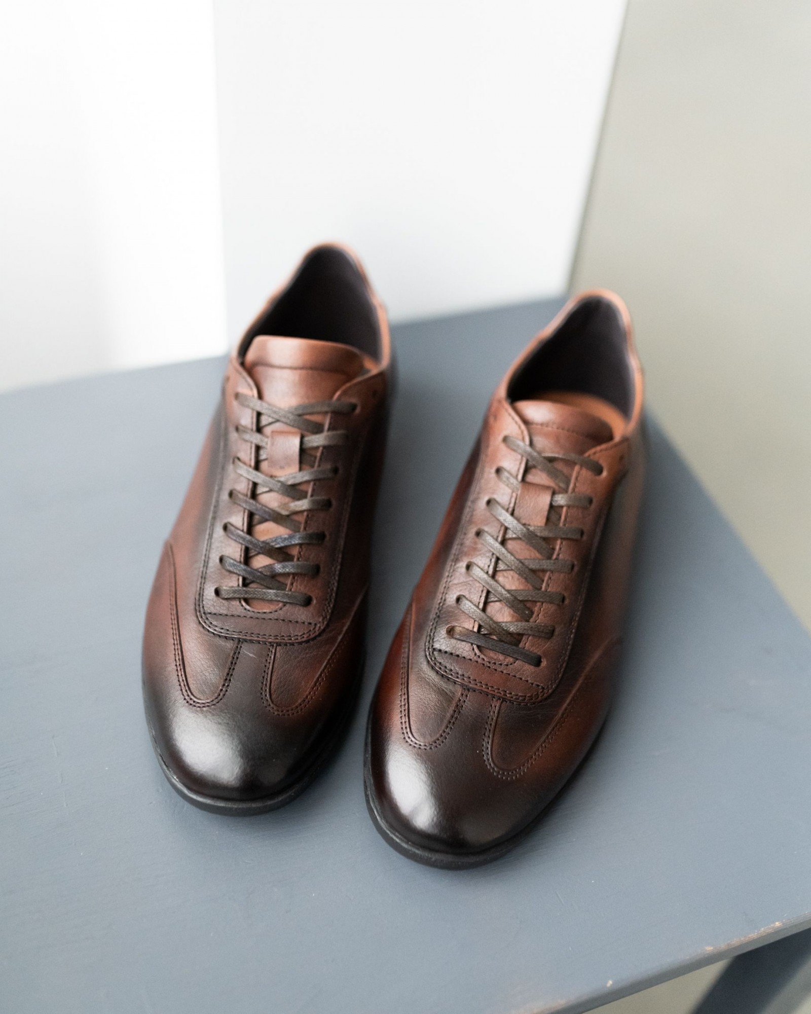Эти коричневые туфли — идеальный выбор для тех, кто ищет универсальную модель, сочетающую стиль классических туфель с лёгкостью кед. Насыщенный коричневый цвет с более тёмными участками тонировки создаёт интересный визуальный эффект, а воскованные шнурки добавляют изысканности и оригинальности. Эти туфли идеально подойдут для ситуаций, когда нужно выглядеть стильно, но не обязательно соблюдать строгий дресс-код.