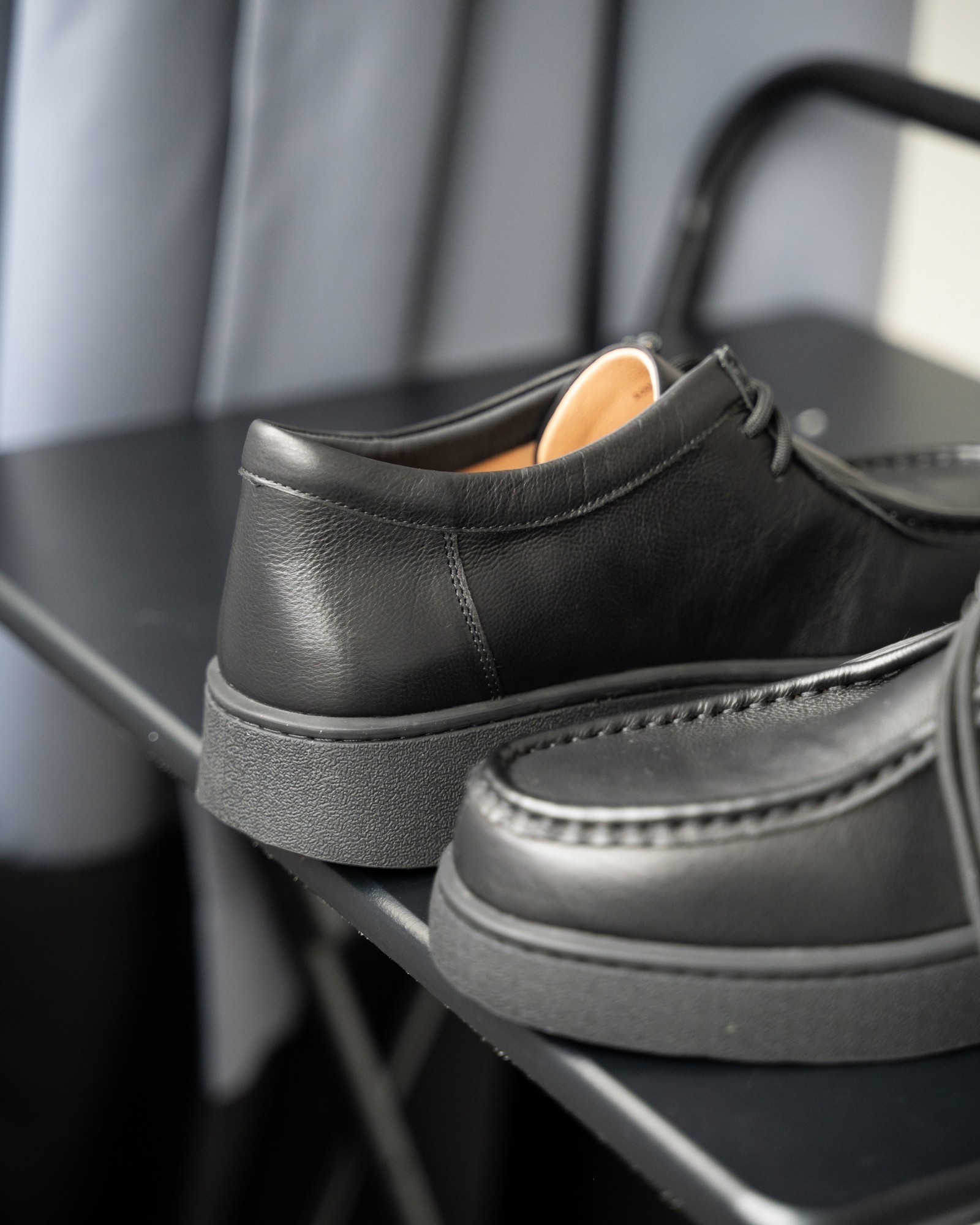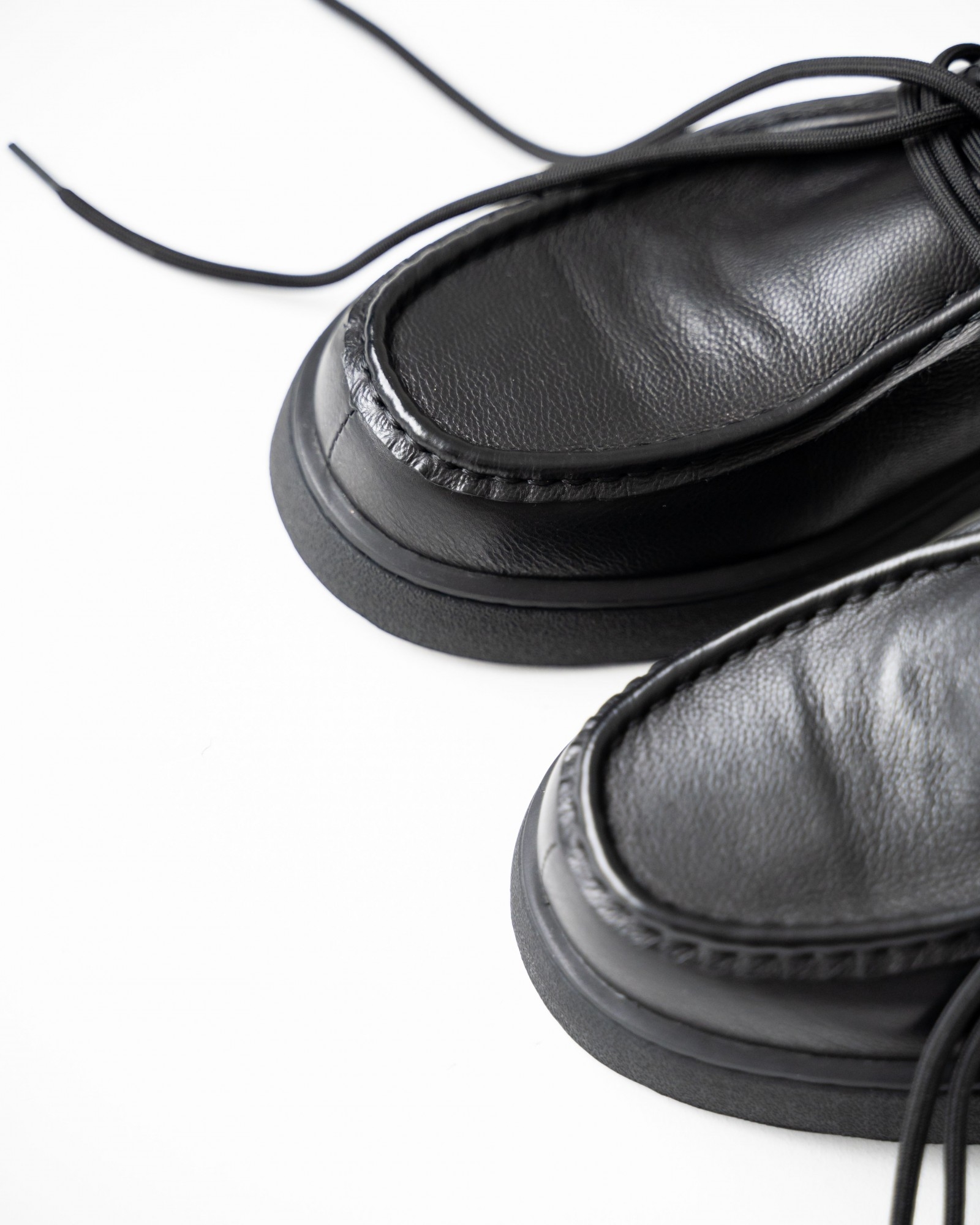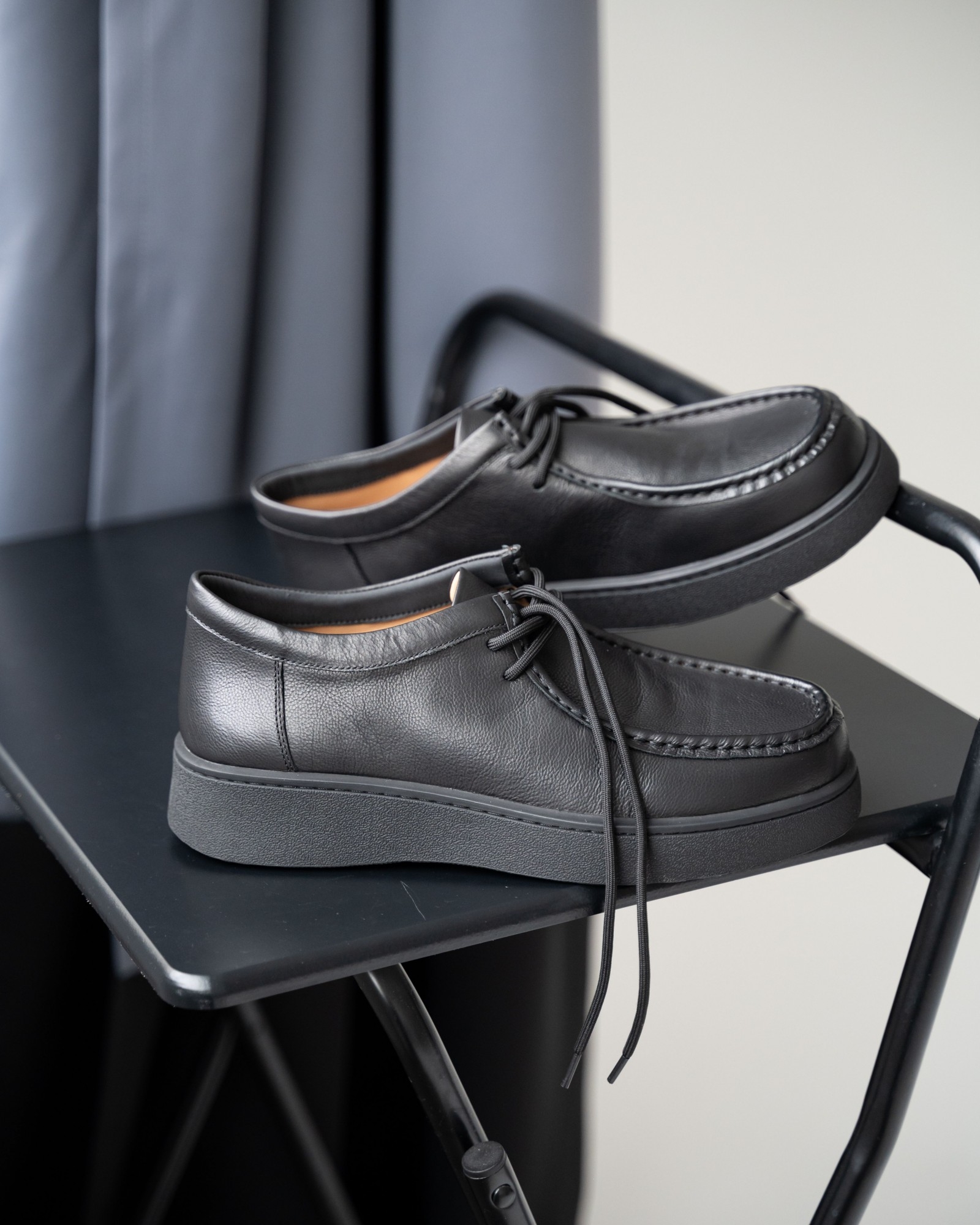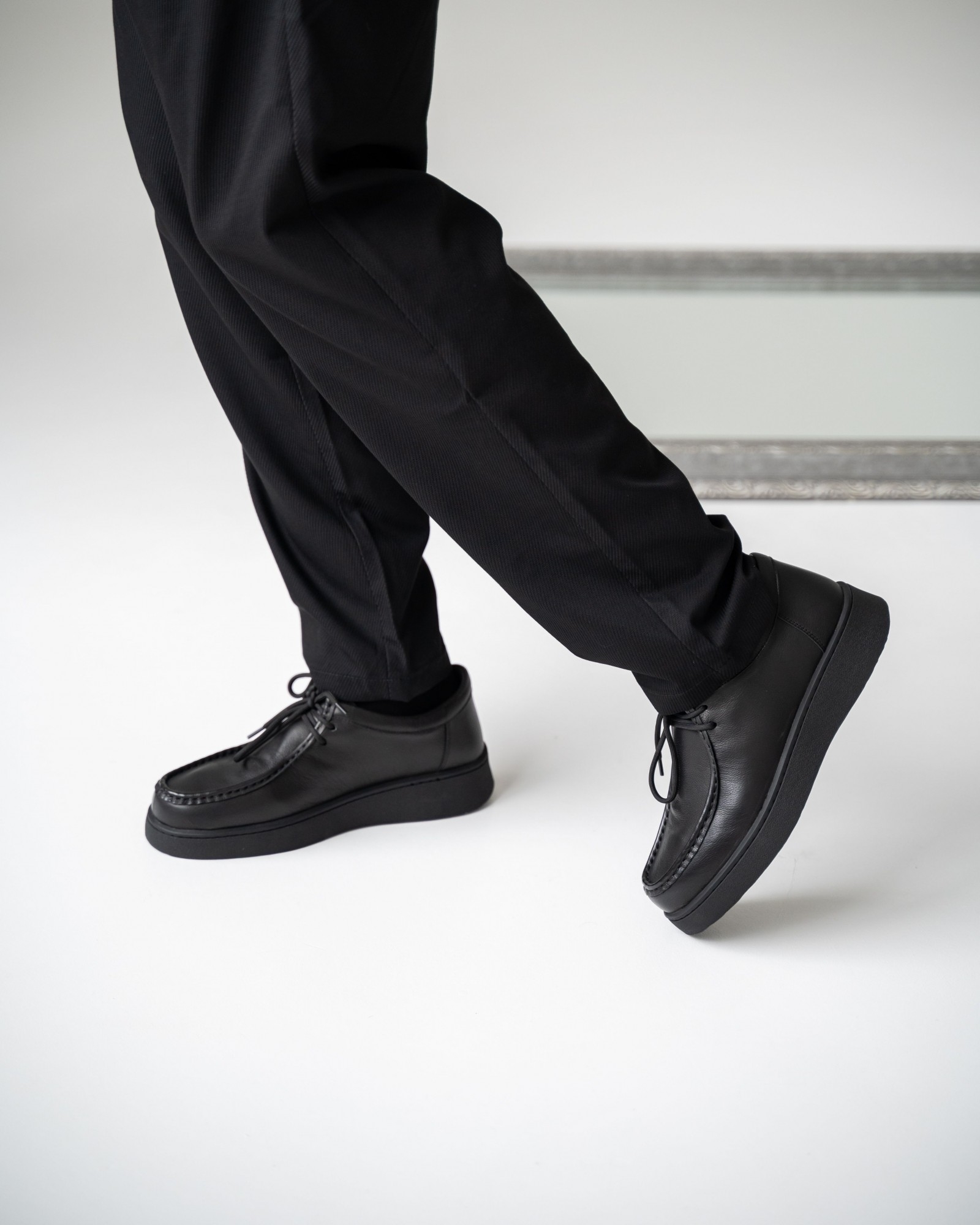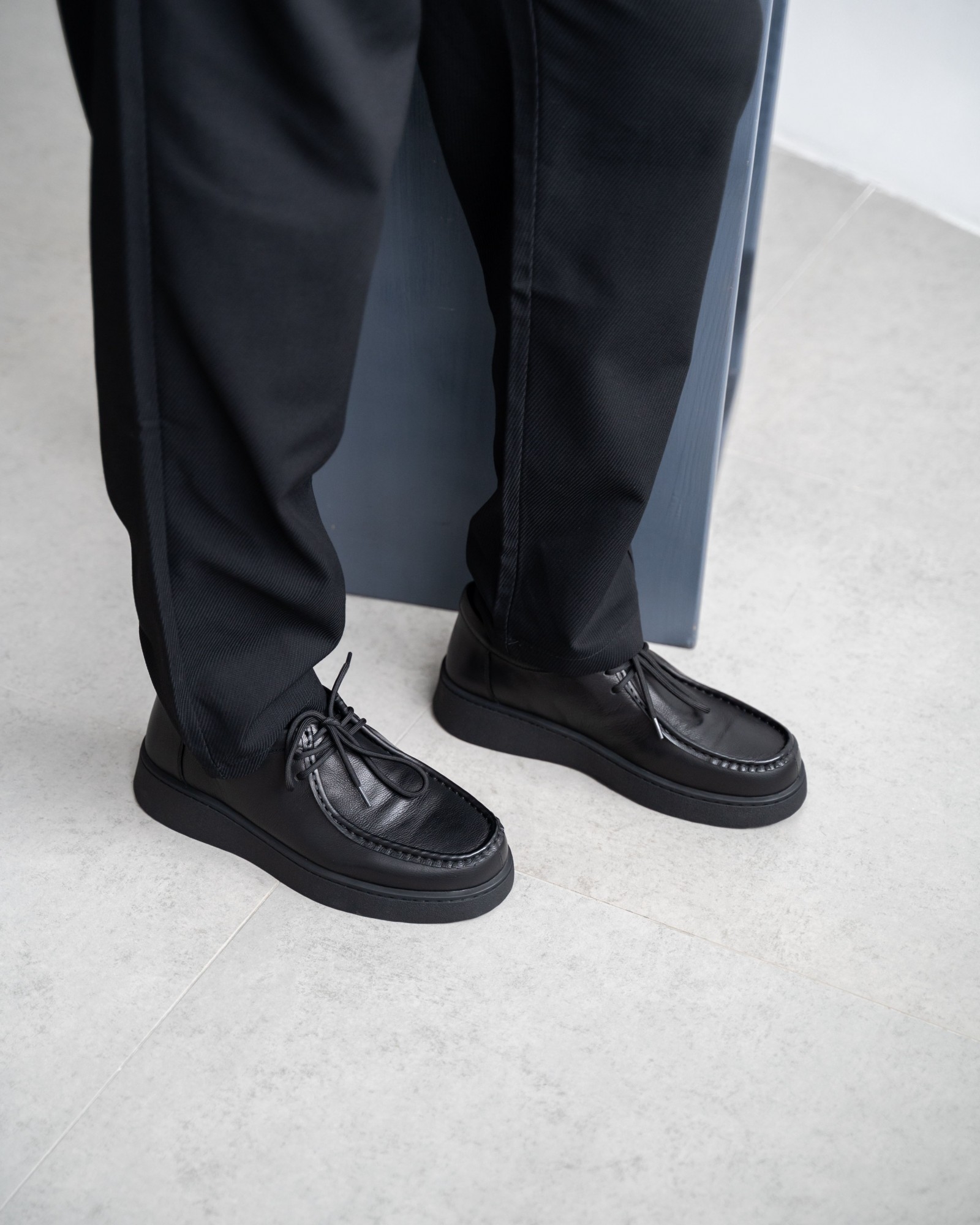 Пара из мягкой чёрной кожи на утолщённой подошве — современный ответ на запрос комфорта и стиля. Форма с лёгко прямолинейным силуэтом выглядит свежо и подчёркивает архитектурность дизайна. Аккуратный шов, отсылающий к традициям мокасинов и лоферов, придаёт модели характер. Шнуровка добавляет функциональности и точности посадки. Эти кеды созданы для тех, кто выбирает современное решение для повседневных задач без компромиссов в удобстве.