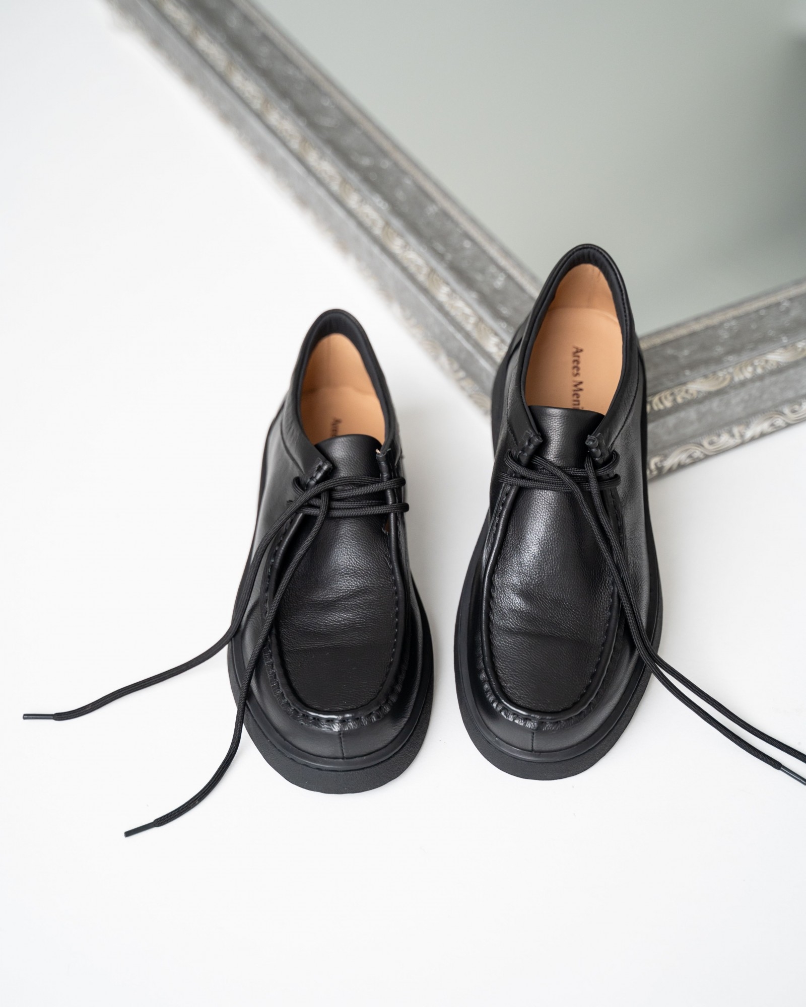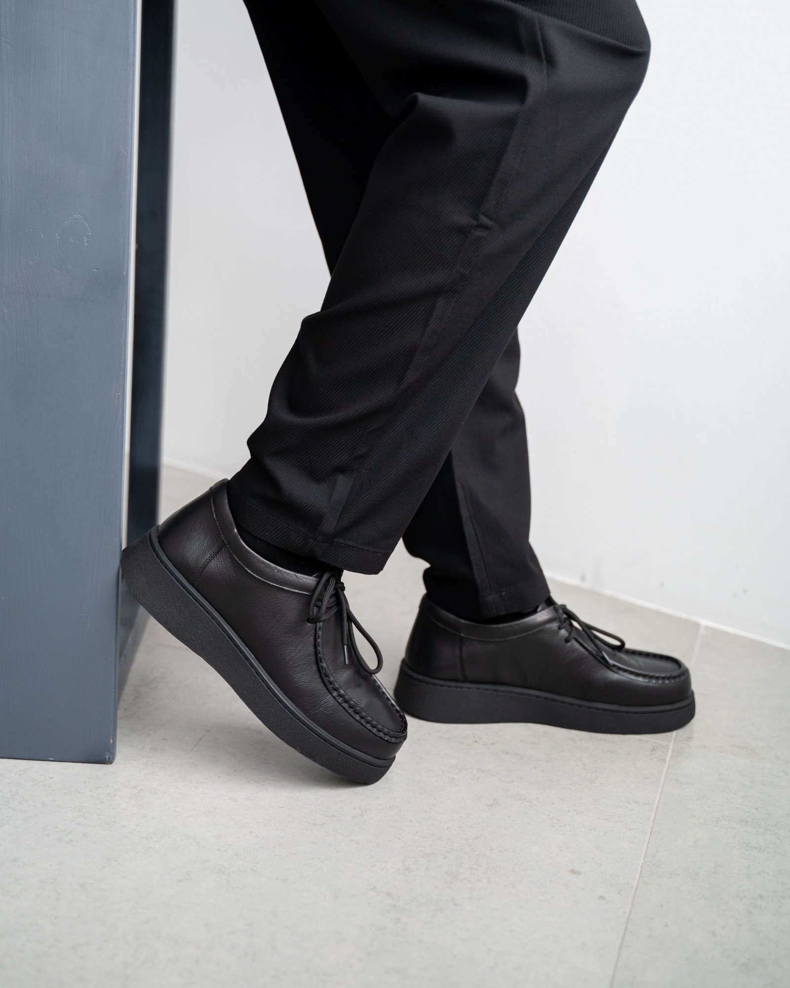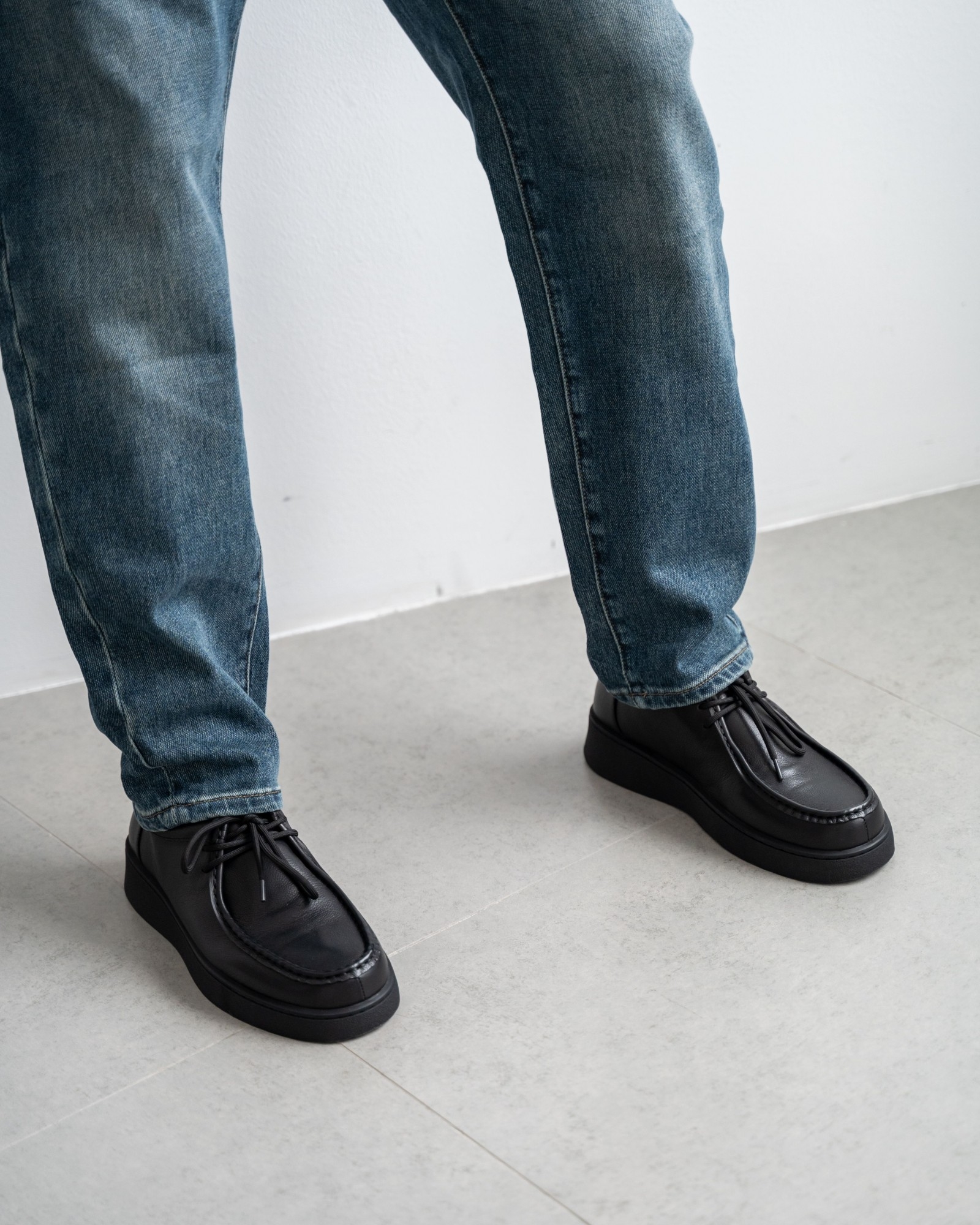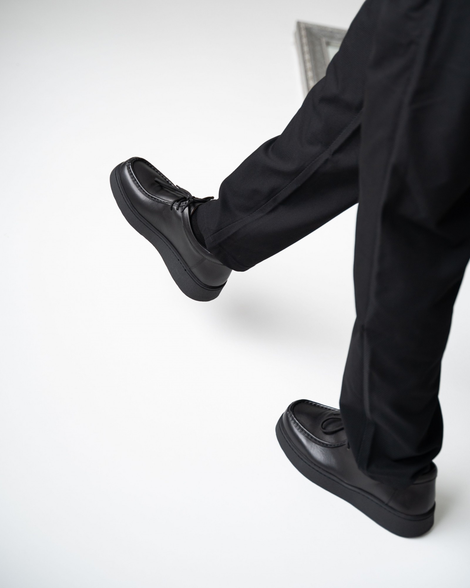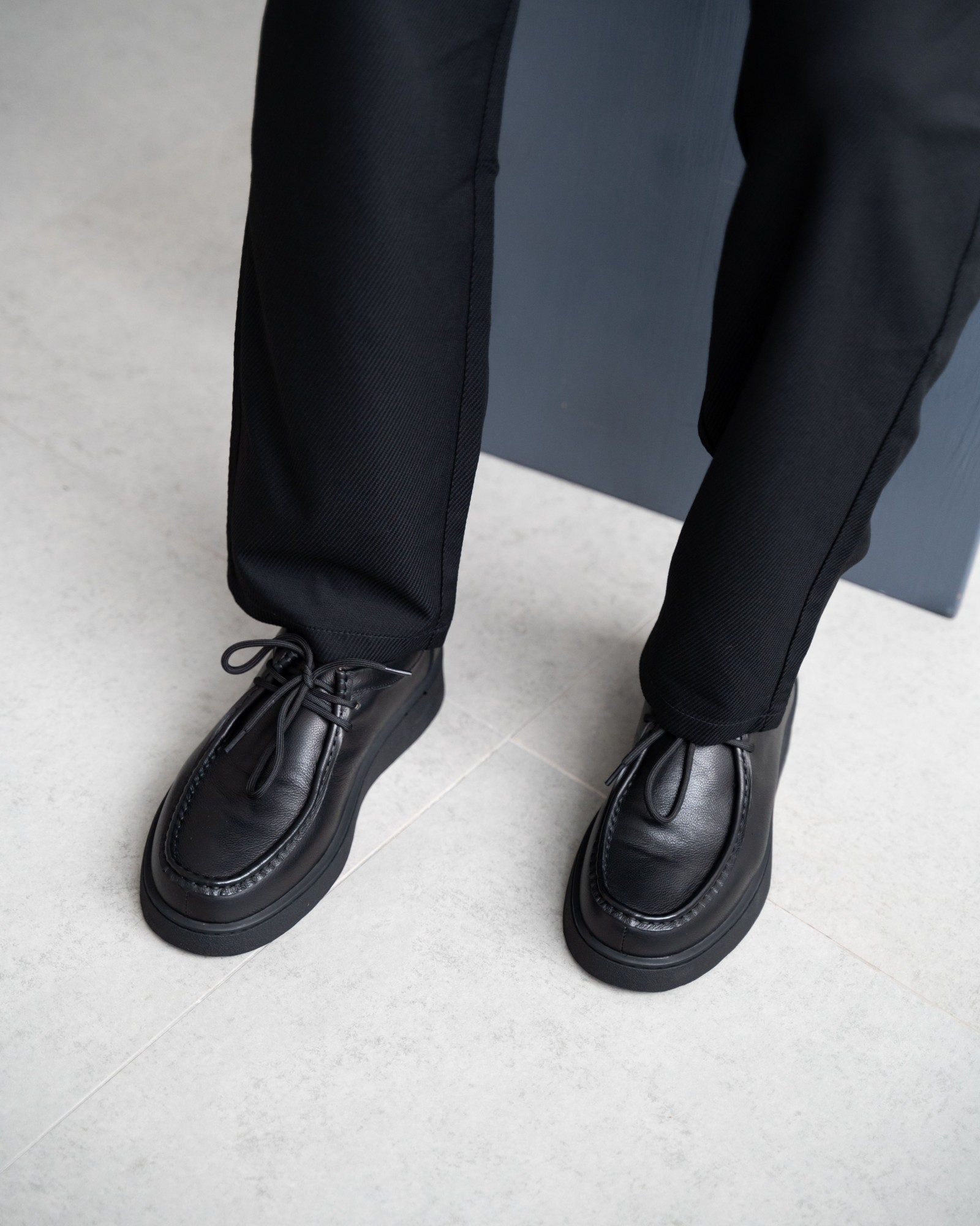 Пара из мягкой чёрной кожи на утолщённой подошве — современный ответ на запрос комфорта и стиля. Форма с лёгко прямолинейным силуэтом выглядит свежо и подчёркивает архитектурность дизайна. Аккуратный шов, отсылающий к традициям мокасинов и лоферов, придаёт модели характер. Шнуровка добавляет функциональности и точности посадки. Эти кеды созданы для тех, кто выбирает современное решение для повседневных задач без компромиссов в удобстве.