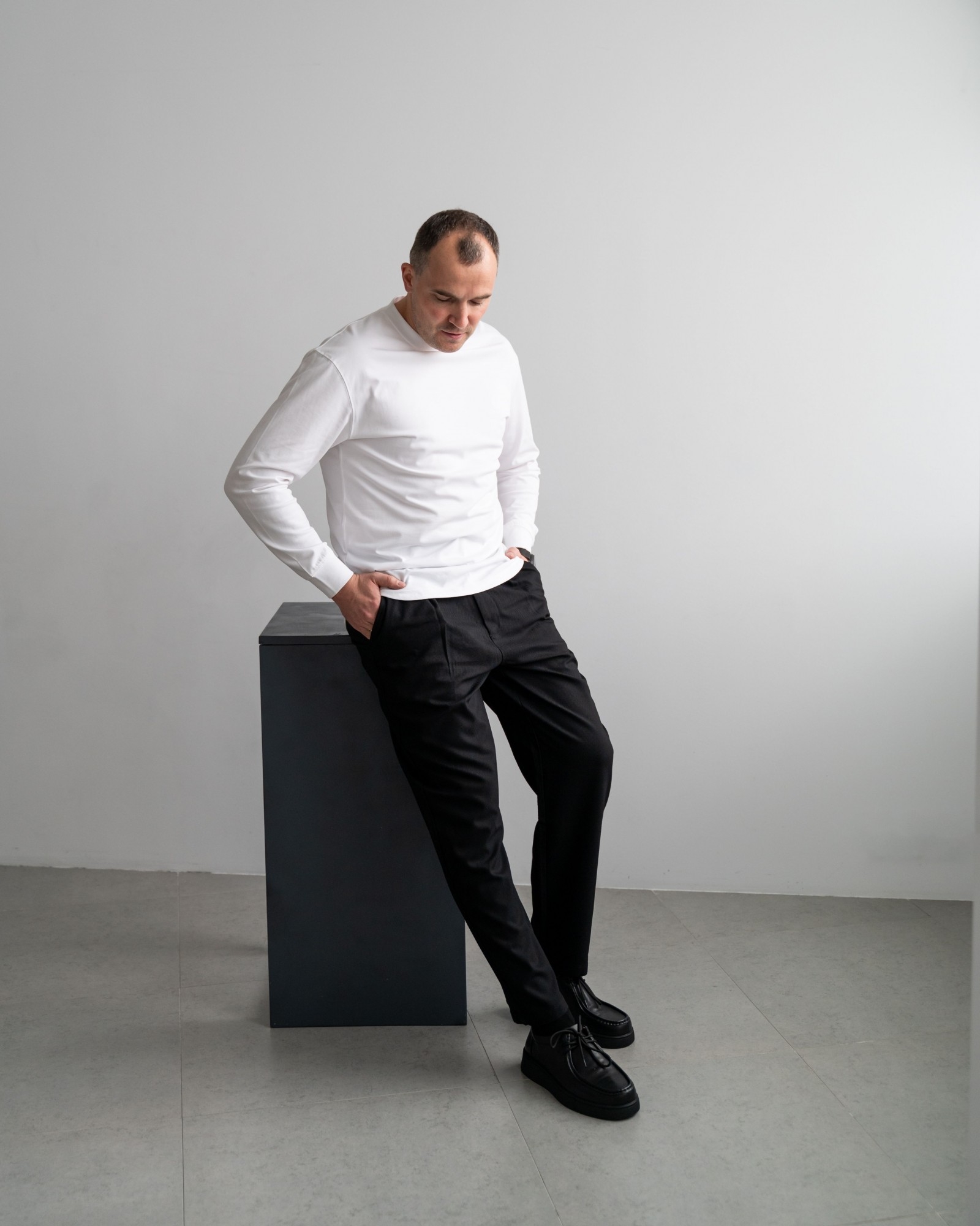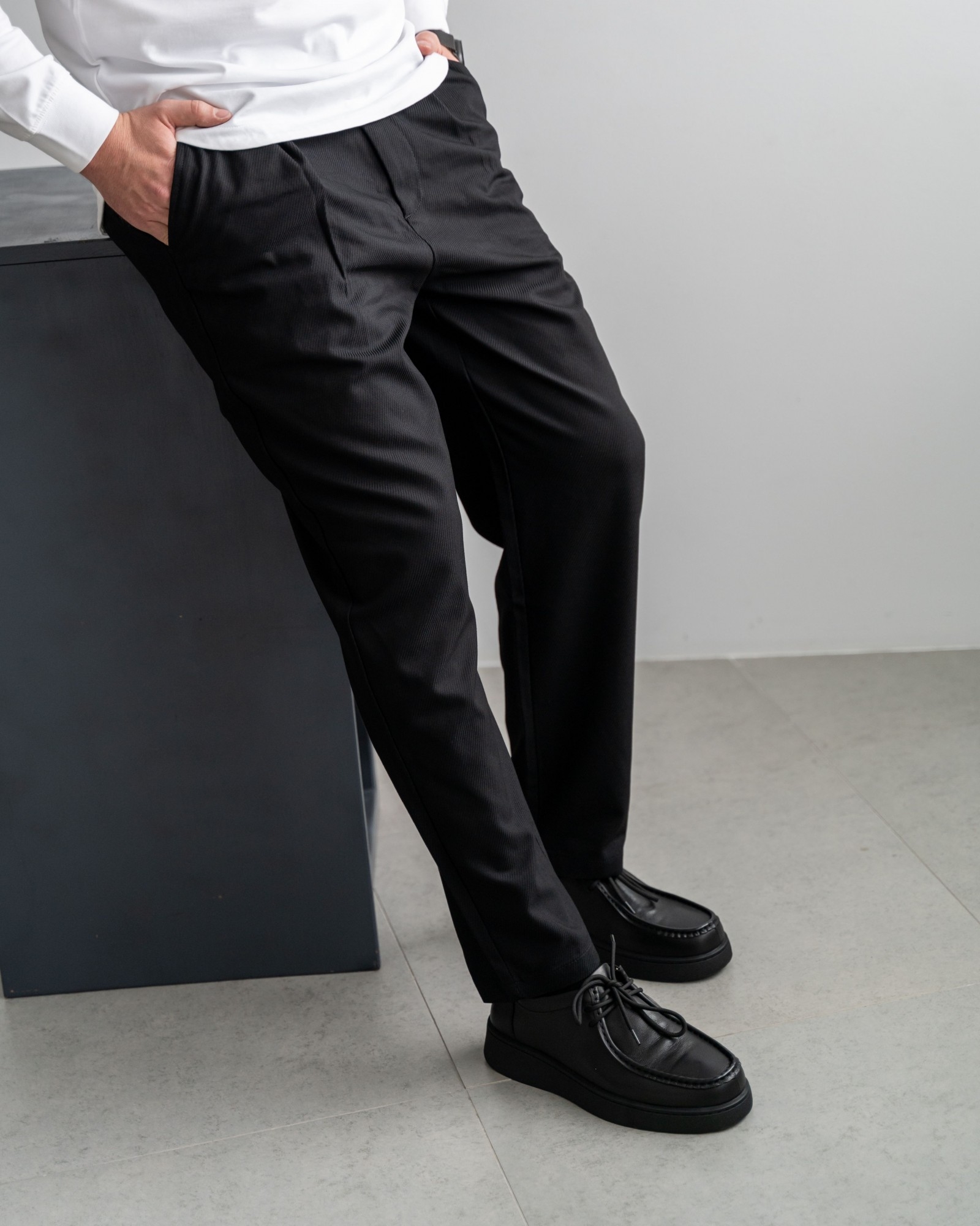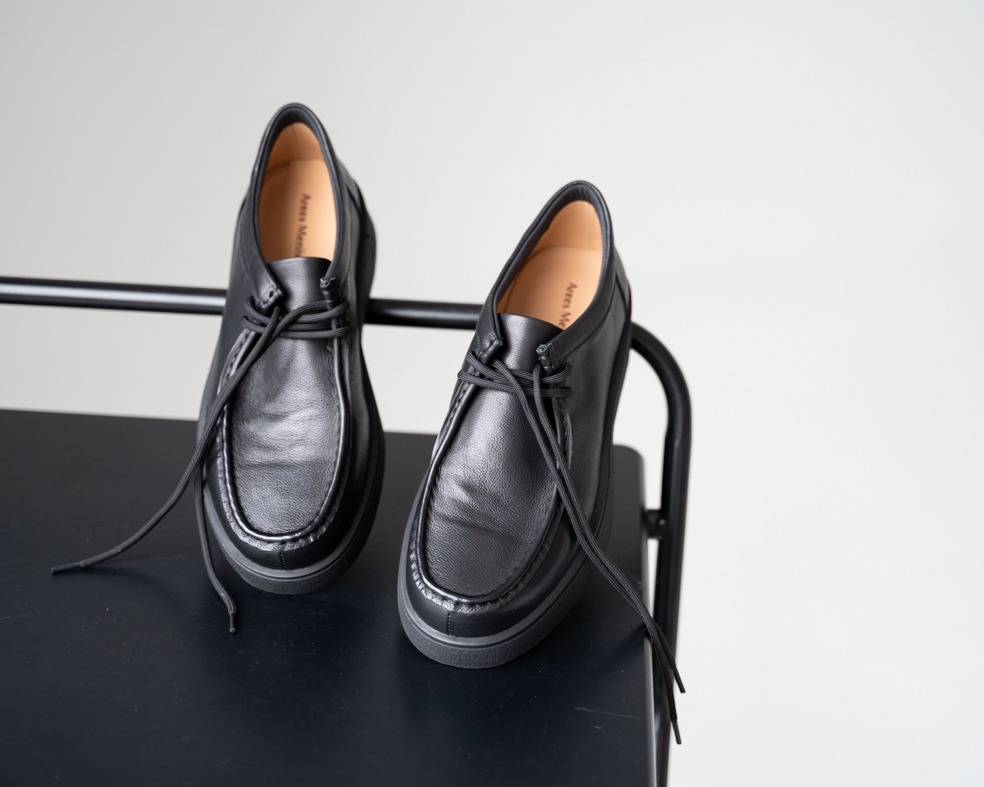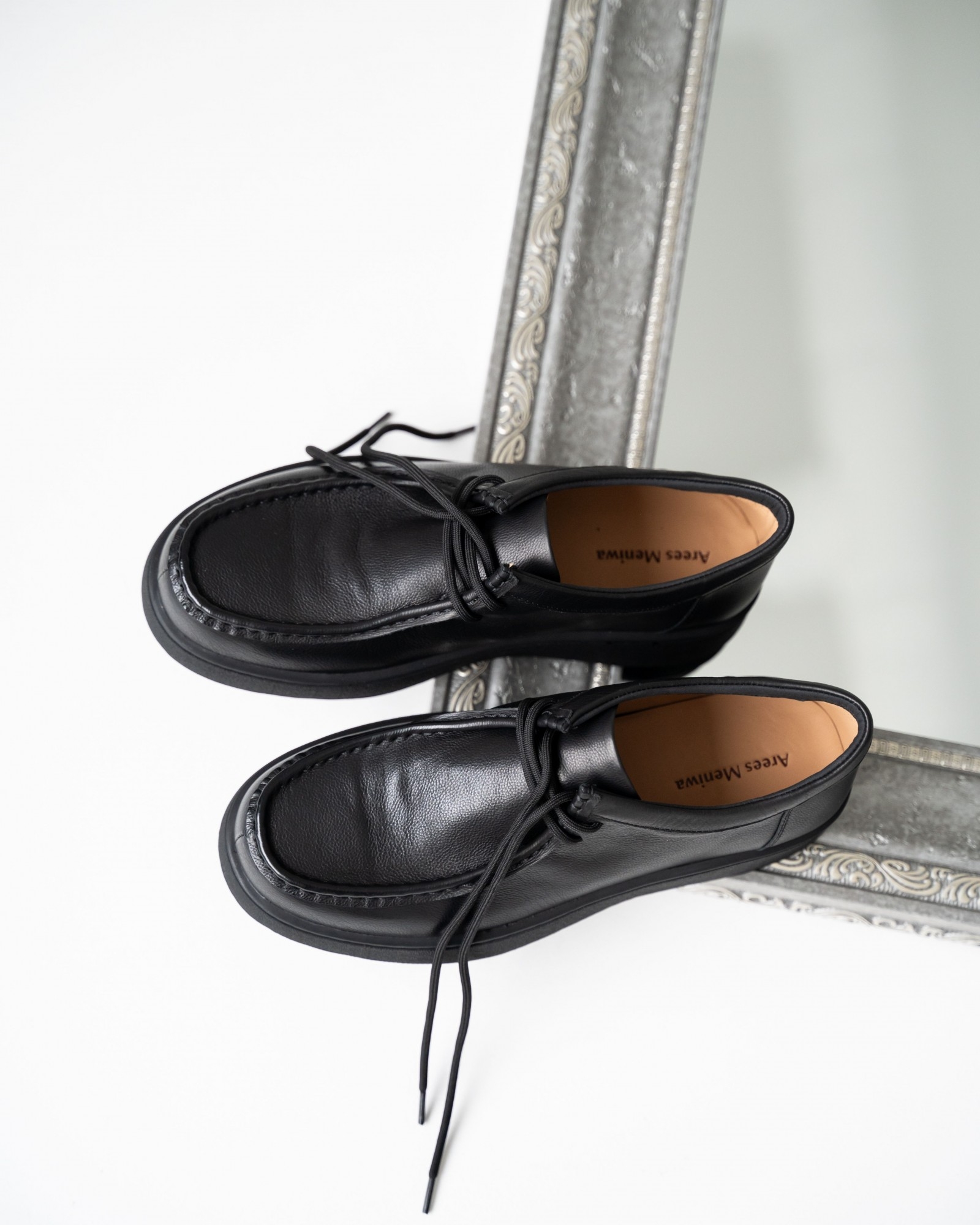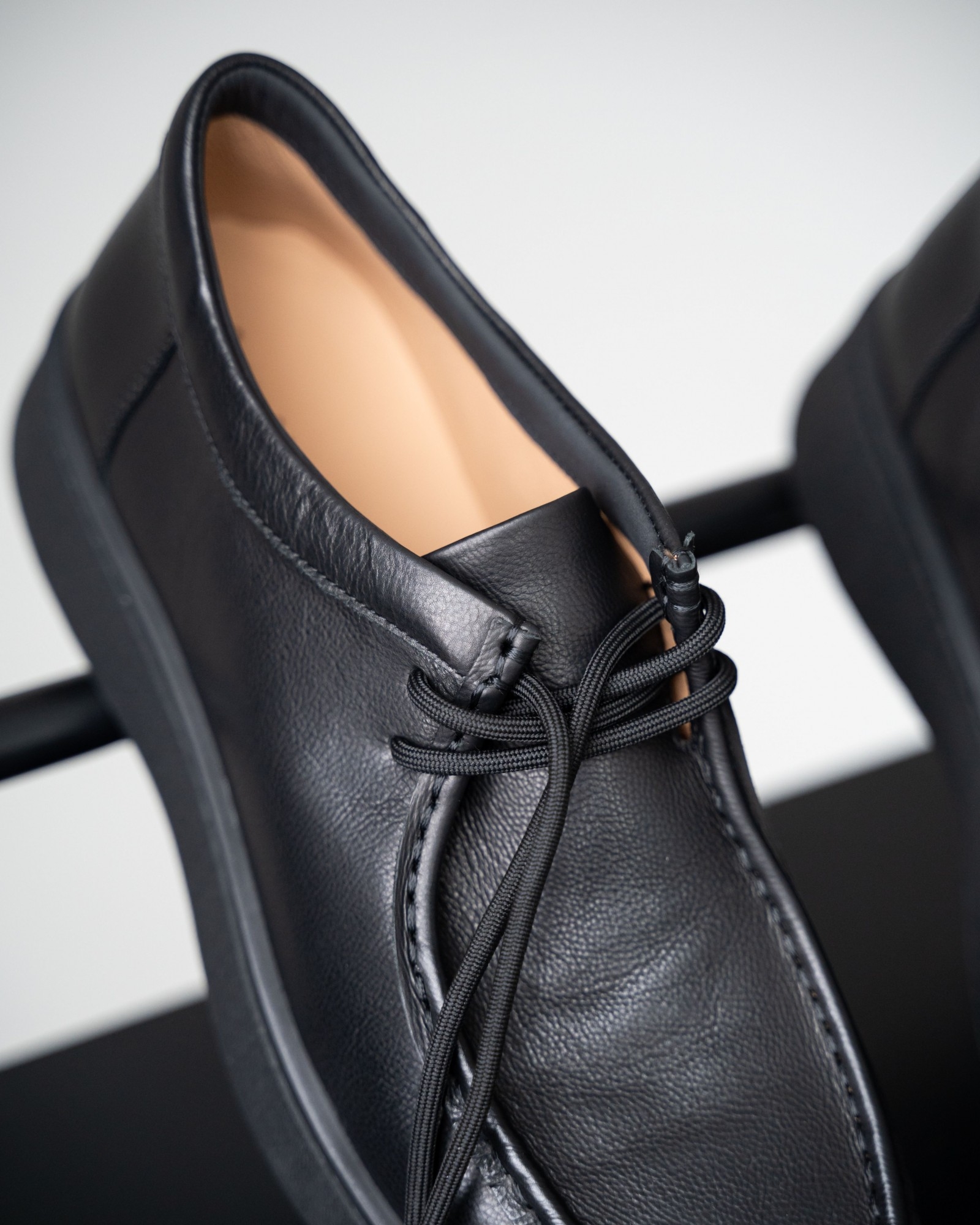 Пара из мягкой чёрной кожи на утолщённой подошве — современный ответ на запрос комфорта и стиля. Форма с лёгко прямолинейным силуэтом выглядит свежо и подчёркивает архитектурность дизайна. Аккуратный шов, отсылающий к традициям мокасинов и лоферов, придаёт модели характер. Шнуровка добавляет функциональности и точности посадки. Эти кеды созданы для тех, кто выбирает современное решение для повседневных задач без компромиссов в удобстве.