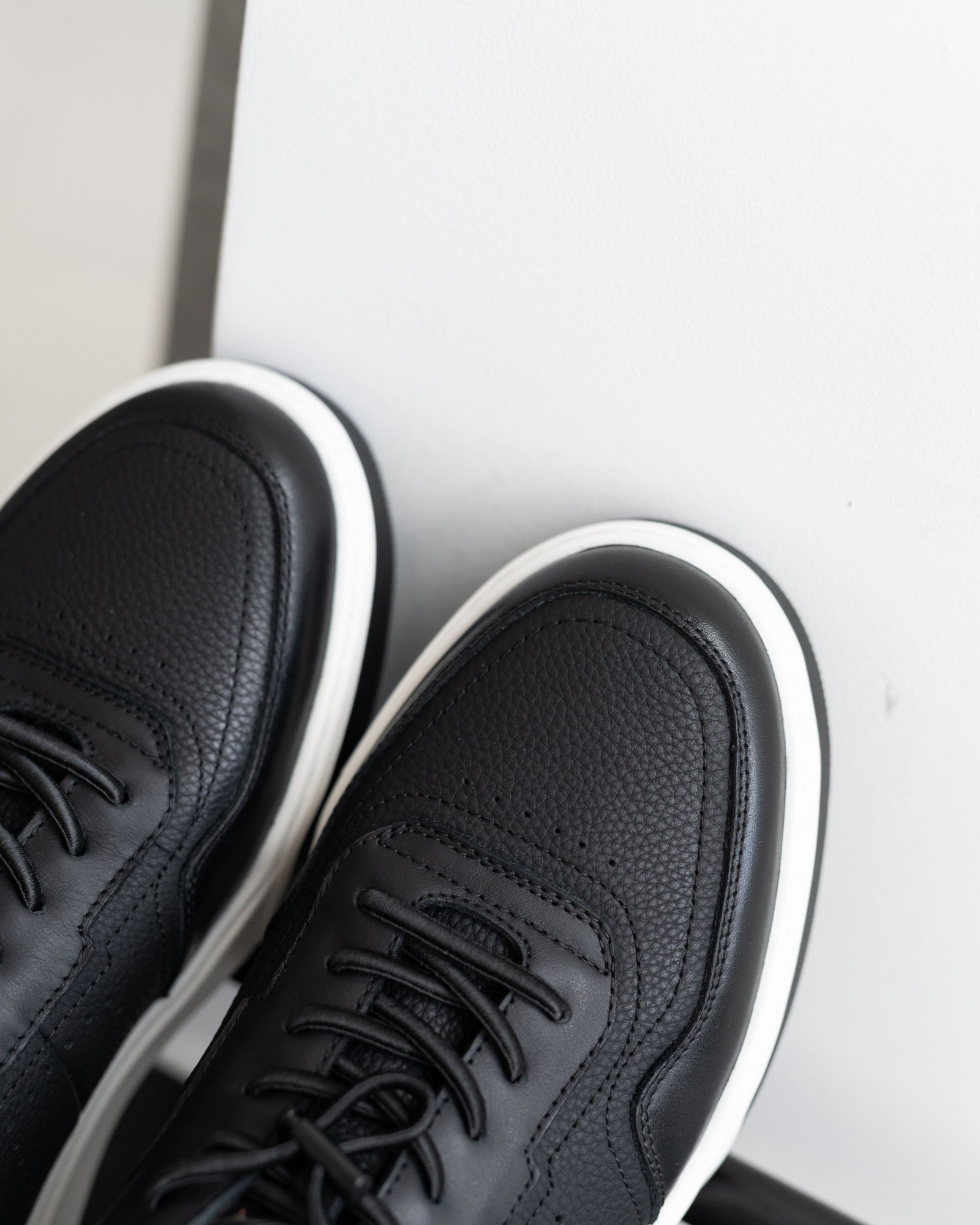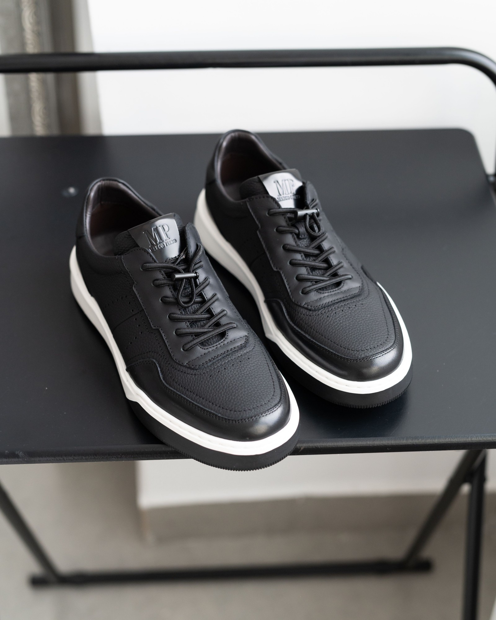Эта модель создана для тех, кто ценит стиль и удобство одновременно. Контрастная светлая подошва подчеркнута чёрным мыском — это не только дизайнерский акцент, но и практичное решение, упрощающее уход. Верх выполнен из двух типов натуральной кожи: матовой и глянцевой, что придаёт паре глубину и выразительность. Вместо классических шнурков — эластичные резинки, позволяющие обувать и снимать кеды максимально легко и быстро.