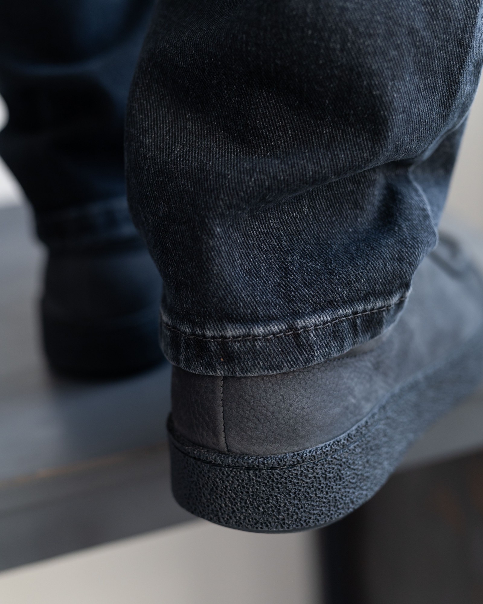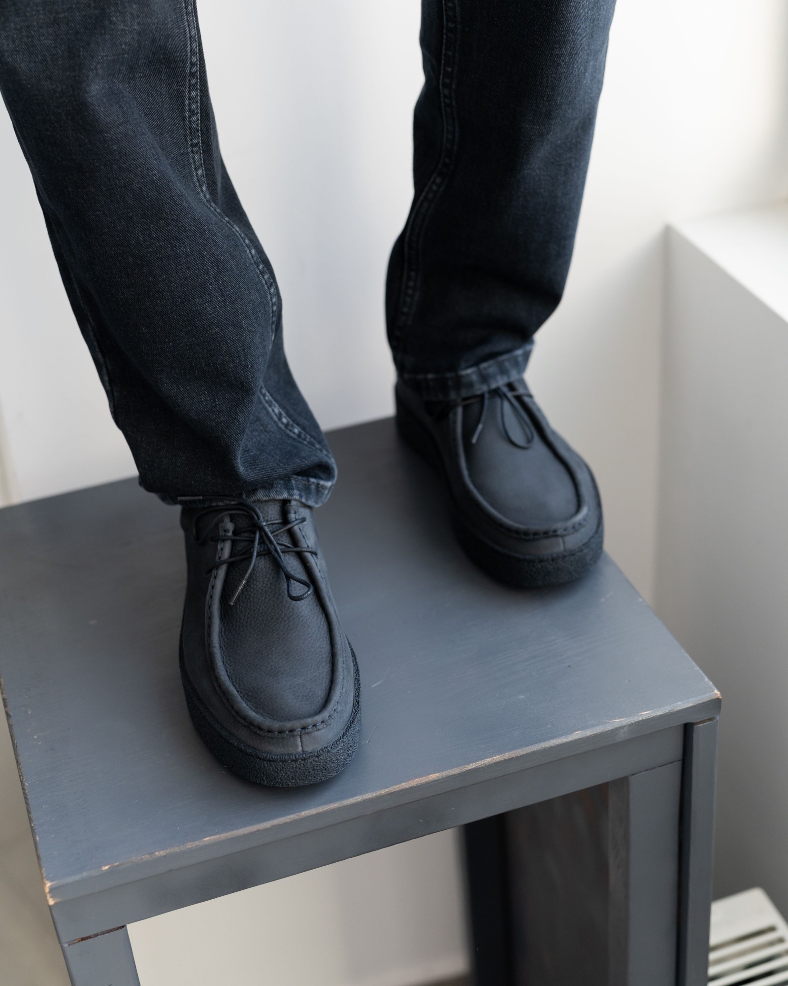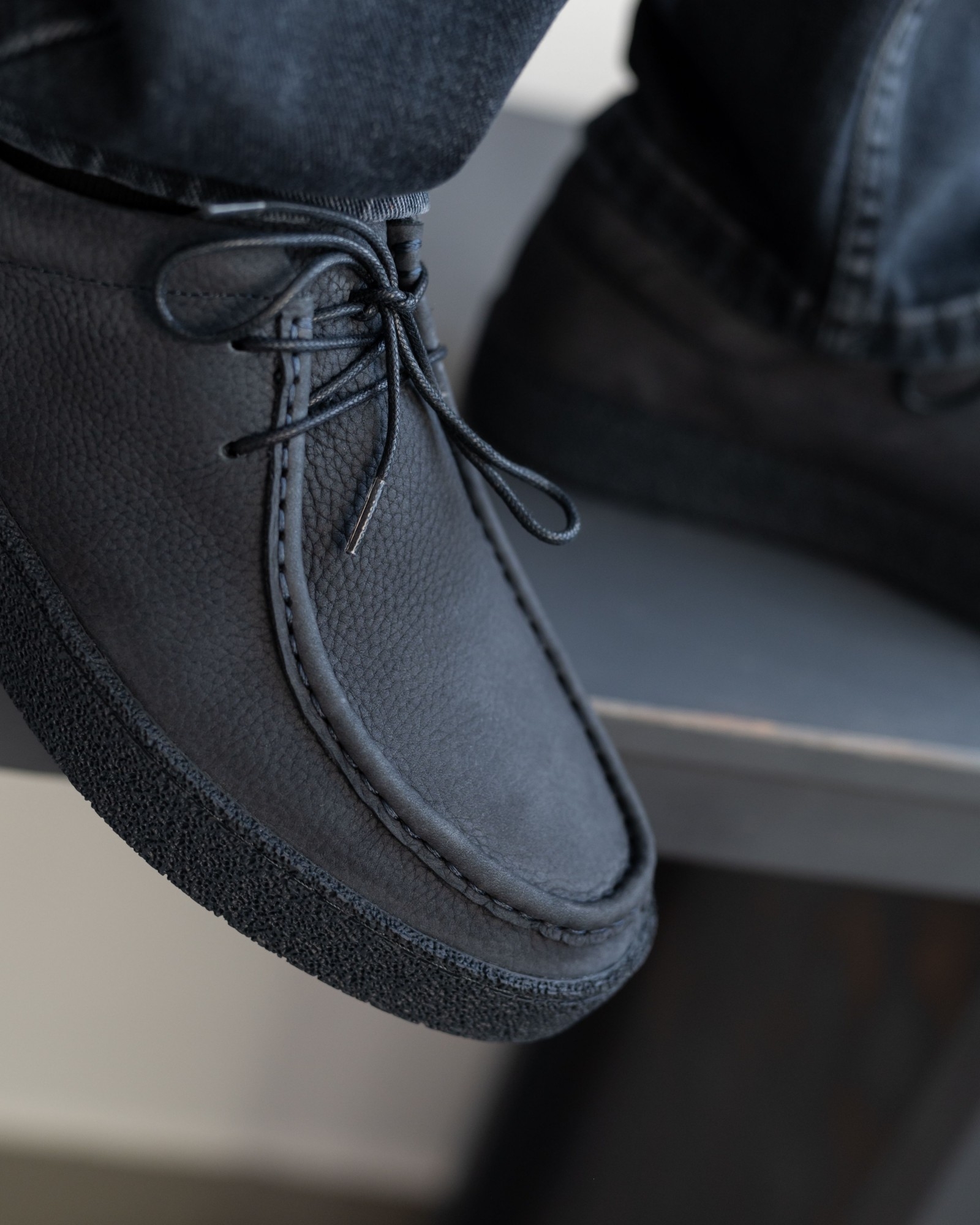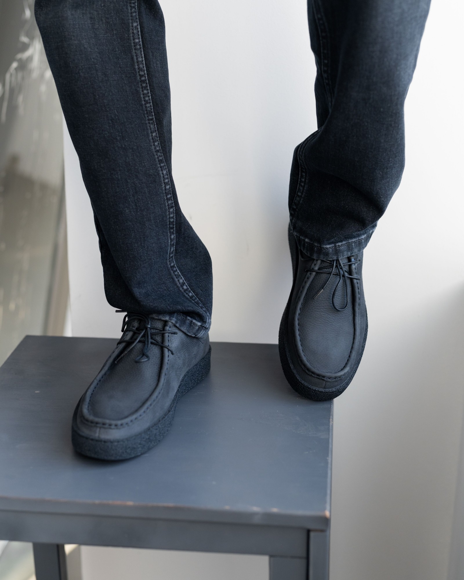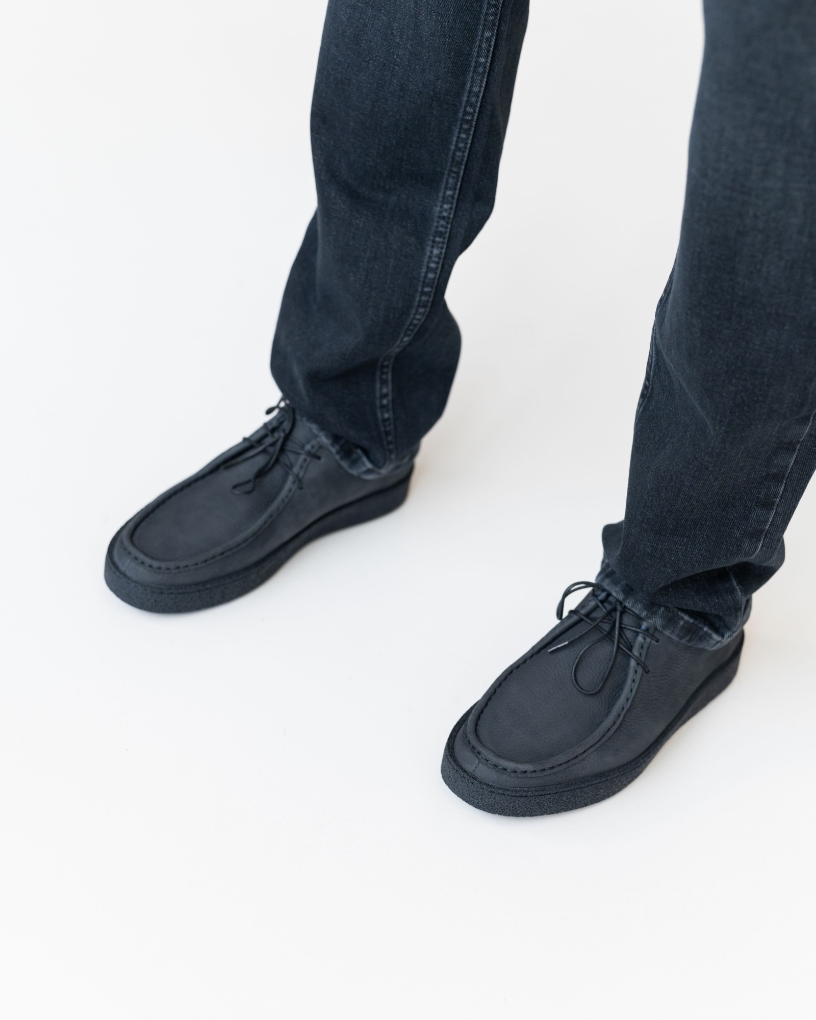 Эта осенняя версия классических мокасин выполнена из качественного тёмно-синего нубука с аккуратной шнуровкой и более выраженным швом на носовой части, который придаёт паре брутальный и выразительный характер. Подошва выполнена в тон с основной кожей, создавая гармоничный и цельный образ.
