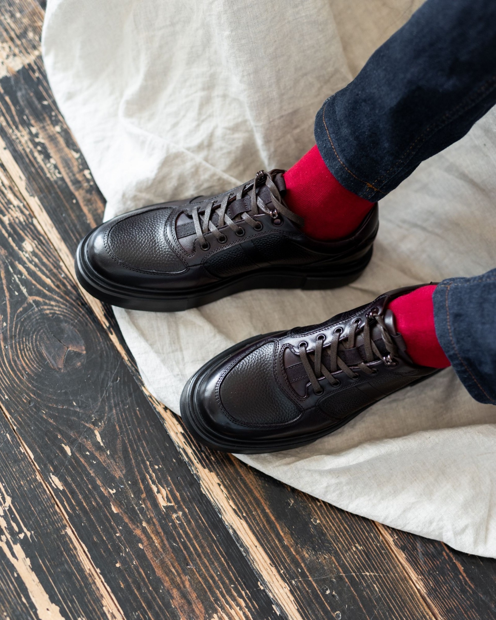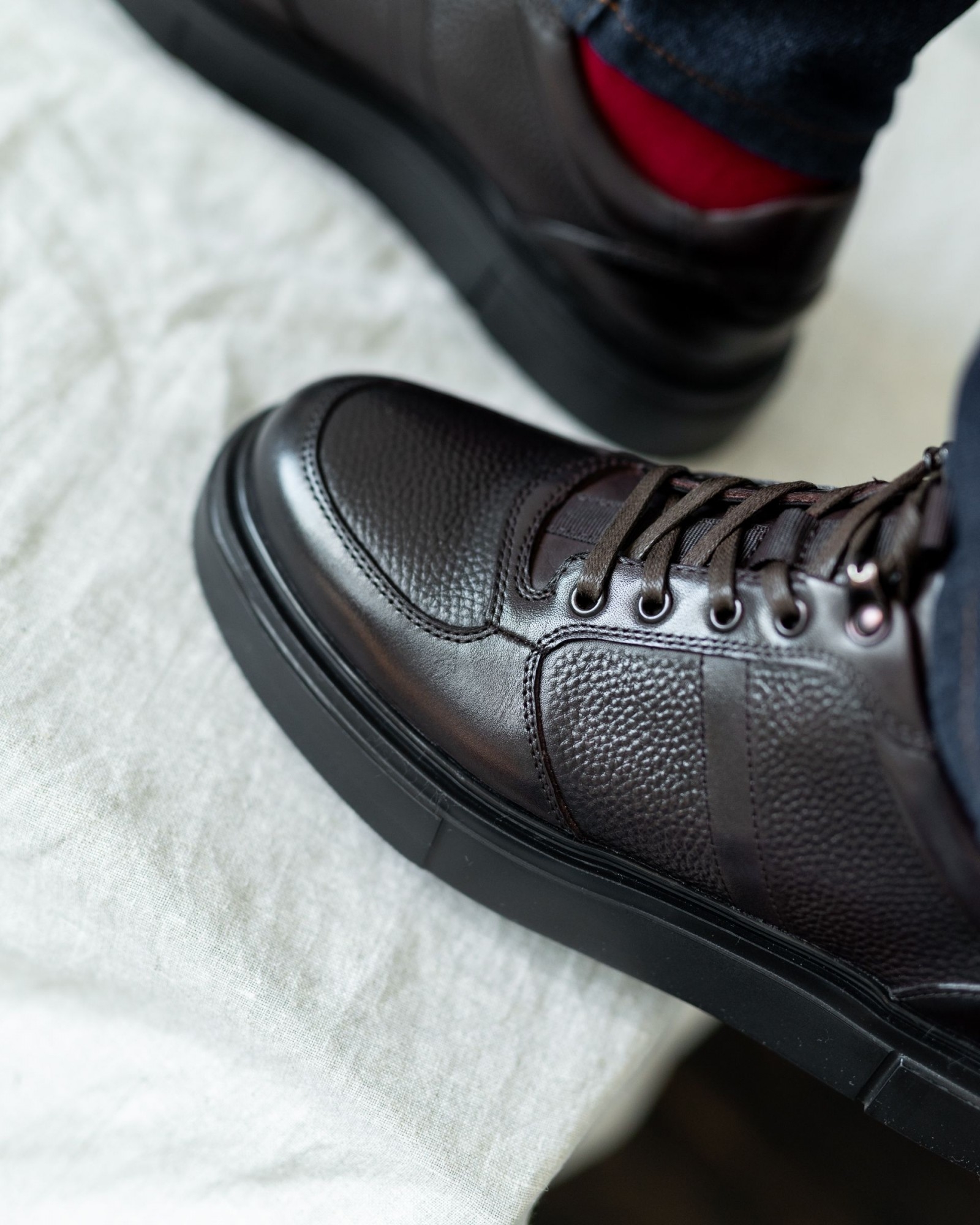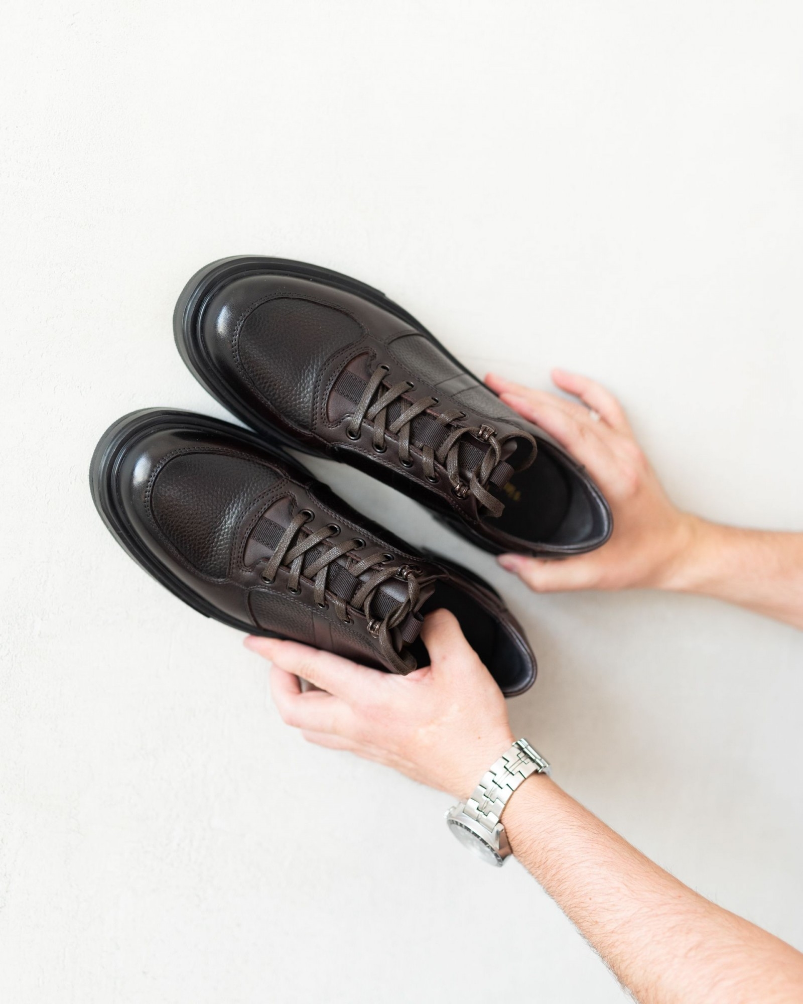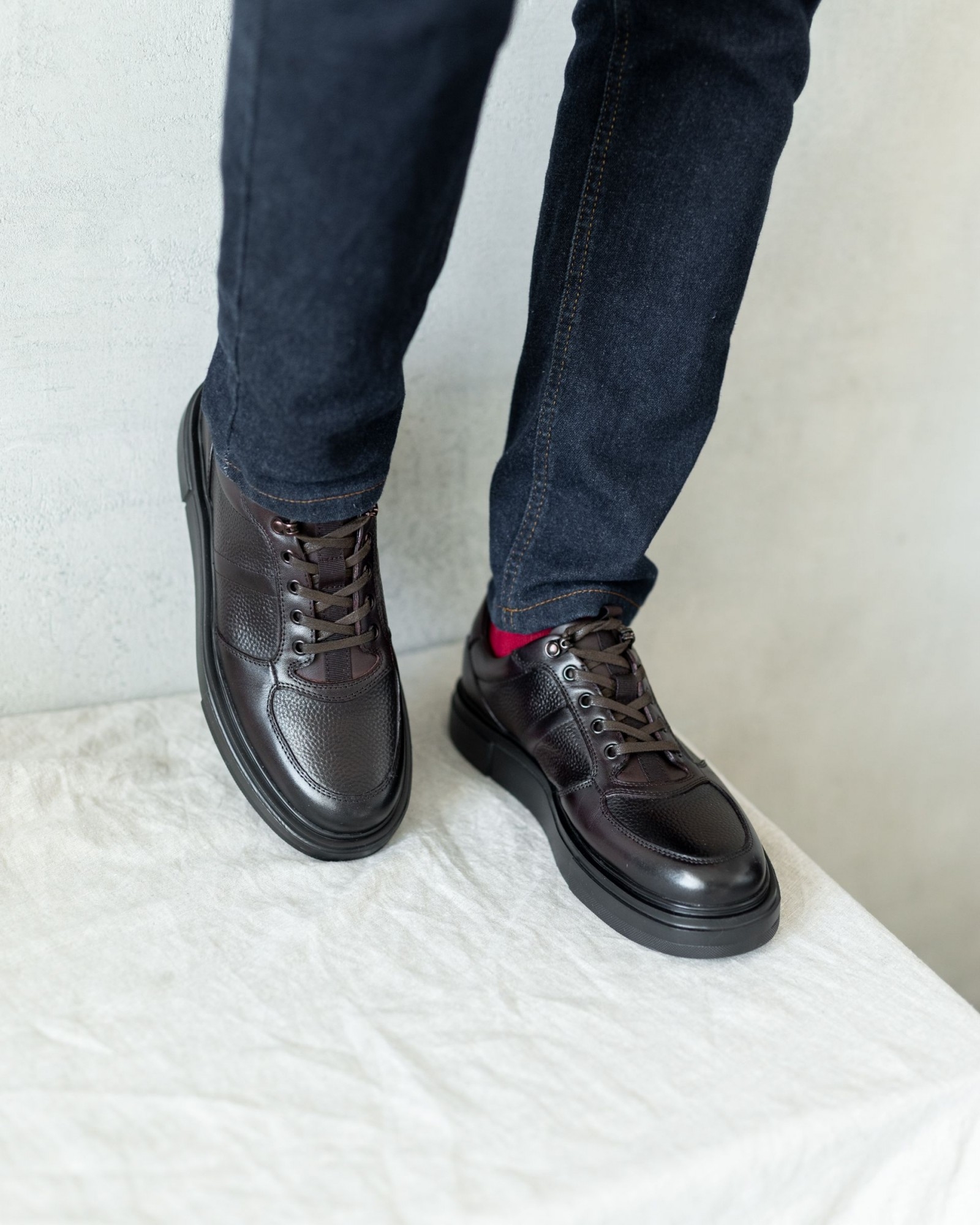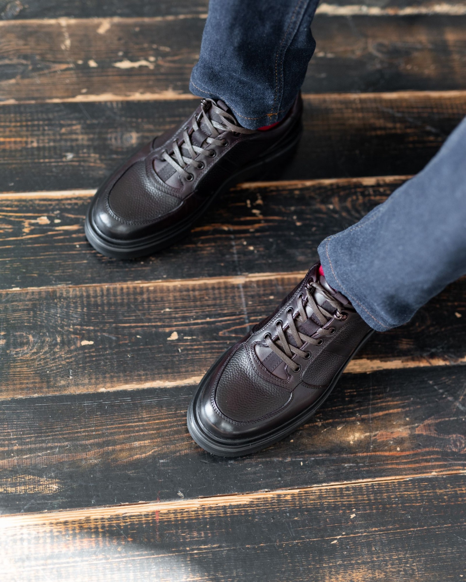 Эта полуспортивная модель без утеплителя выполнена из высококачественной коричневой кожи с двумя разными текстурами, что придаёт ей визуальную глубину и уникальный стиль. Лёгкая подошва из EVA чёрного цвета обеспечивает отличную амортизацию и комфорт при ходьбе, сохраняя обувь лёгкой и удобной для повседневного использования.