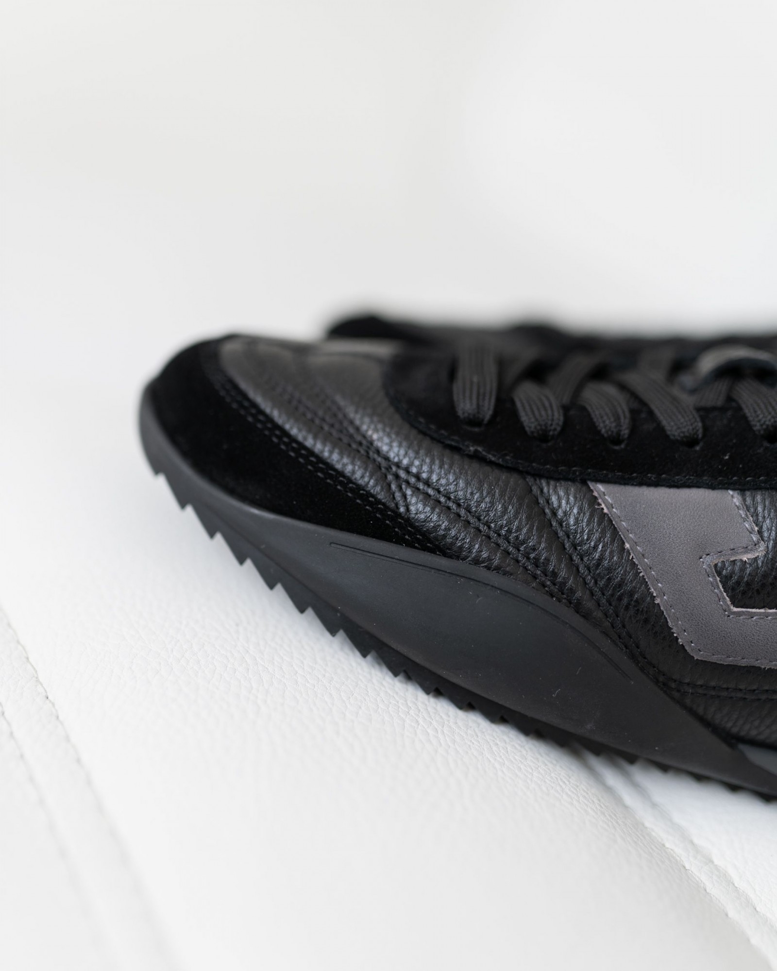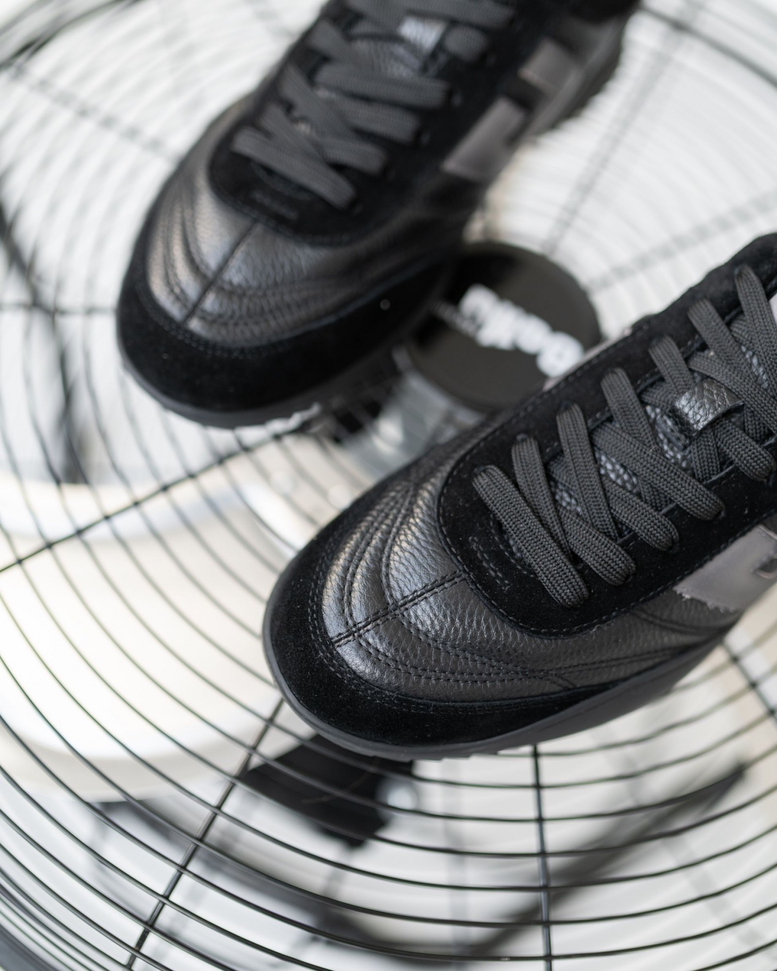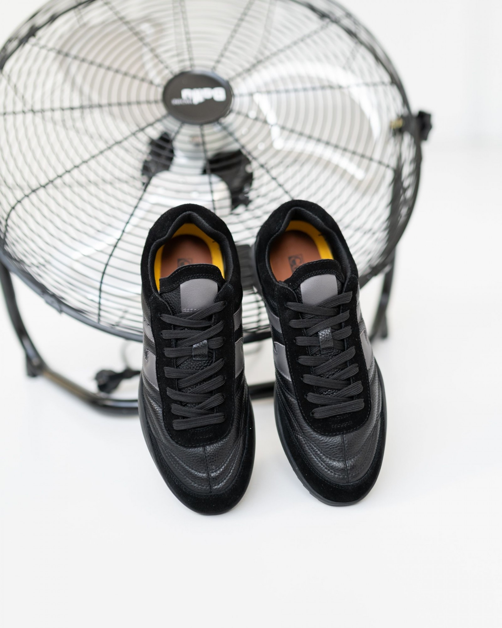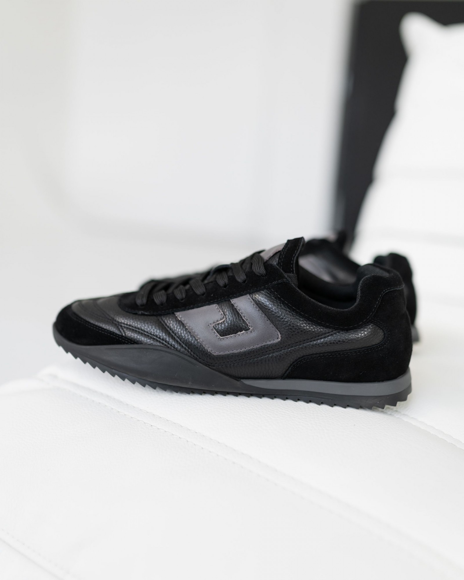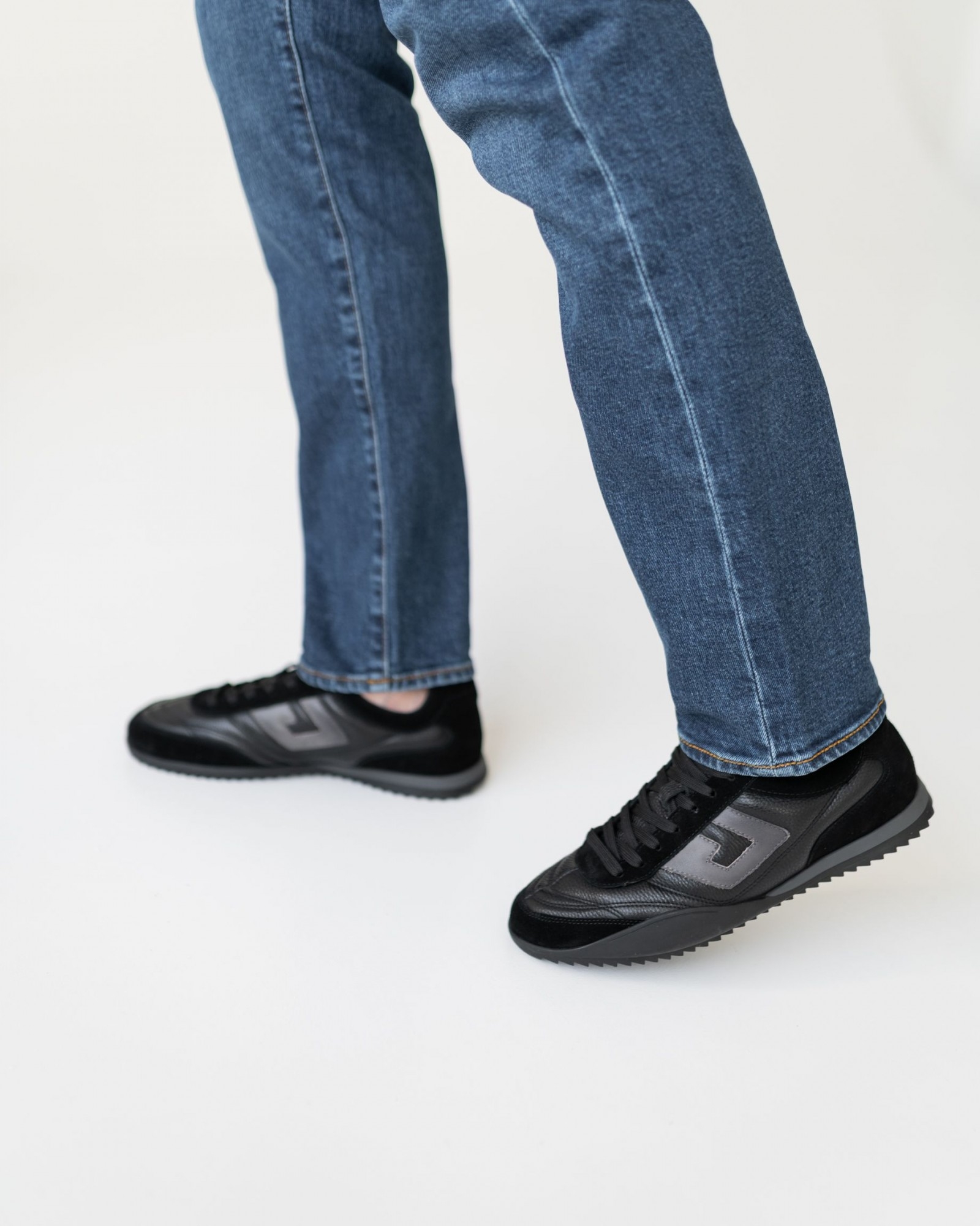 Сникеры из премиальной мягкой кожи и замши в насыщенном чёрном цвете — идеальный баланс между стилем и комфортом. Продуманная конструкция и удобная анатомическая стелька обеспечивают лёгкость при ходьбе, а шнуровка гарантирует надёжную фиксацию стопы. Гибкая, но устойчивая подошва адаптируется к движениям, создавая ощущение абсолютного комфорта в течение дня. Универсальный дизайн позволяет сочетать пару как с повседневной, так и со стильной городской одеждой.