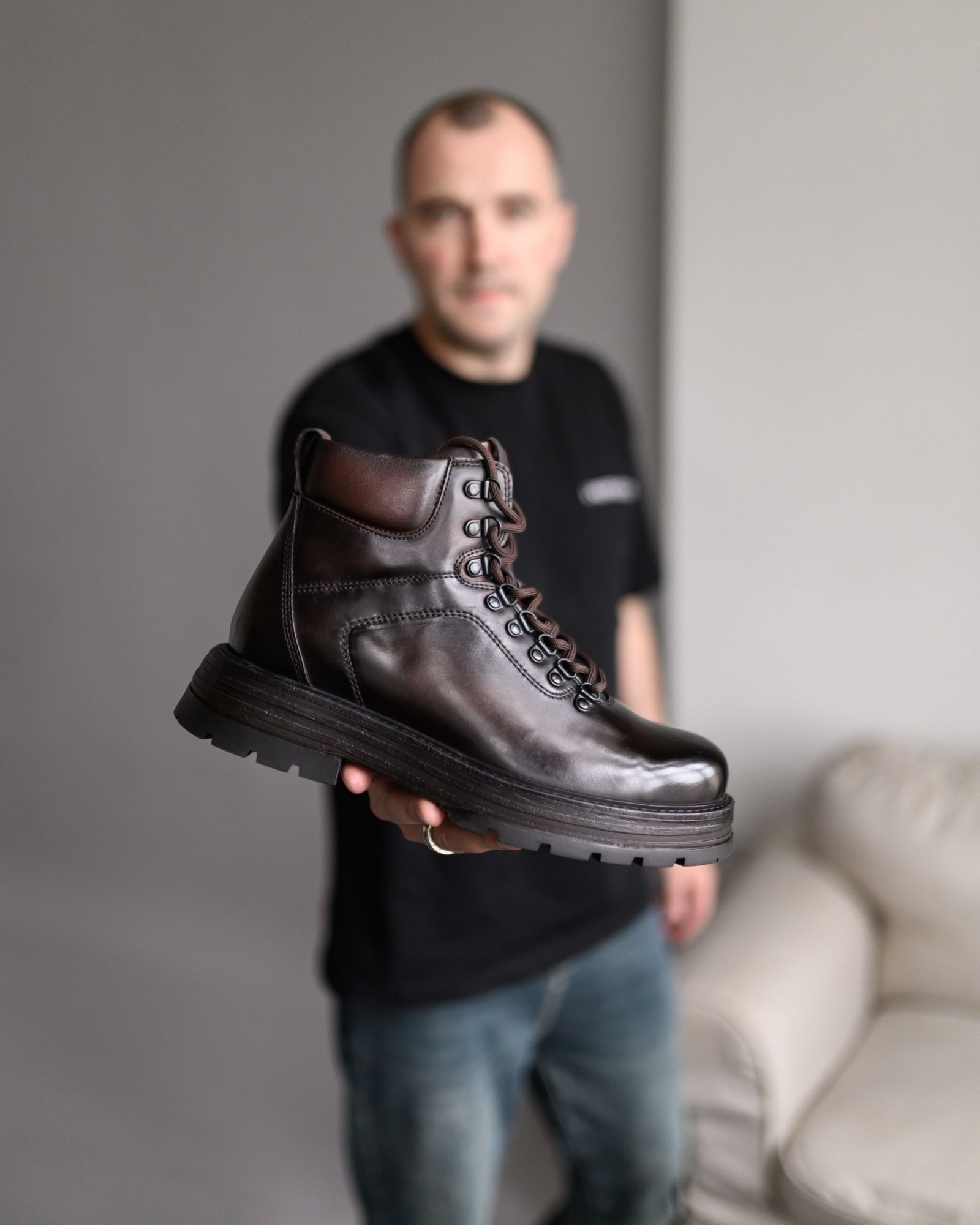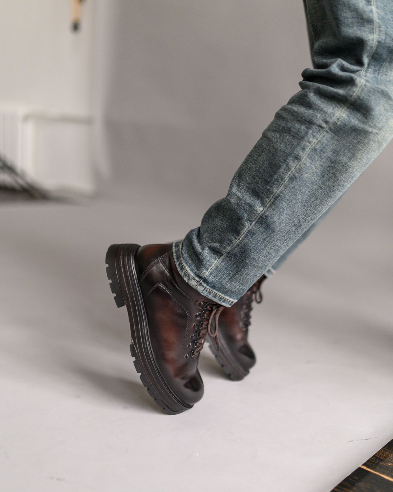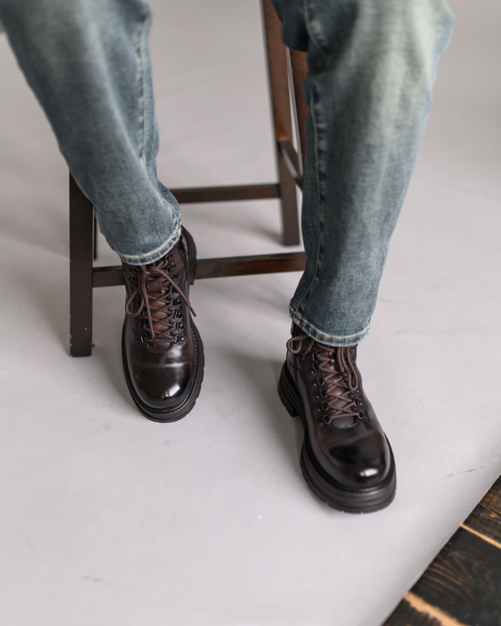Зимние кожаные ботинки тёмно-коричневого цвета с лёгким благородным блеском — идеальный выбор для стильной и комфортной зимы. Лёгкая подошва с глубоким протектором обеспечивает отличное сцепление на скользких поверхностях, а наружные петли для шнуровки и замок на внутренней стороне добавляют удобства и надёжности. Внутренний слой из натурального меха создаёт идеальную посадку и сохраняет тепло в самые холодные дни.