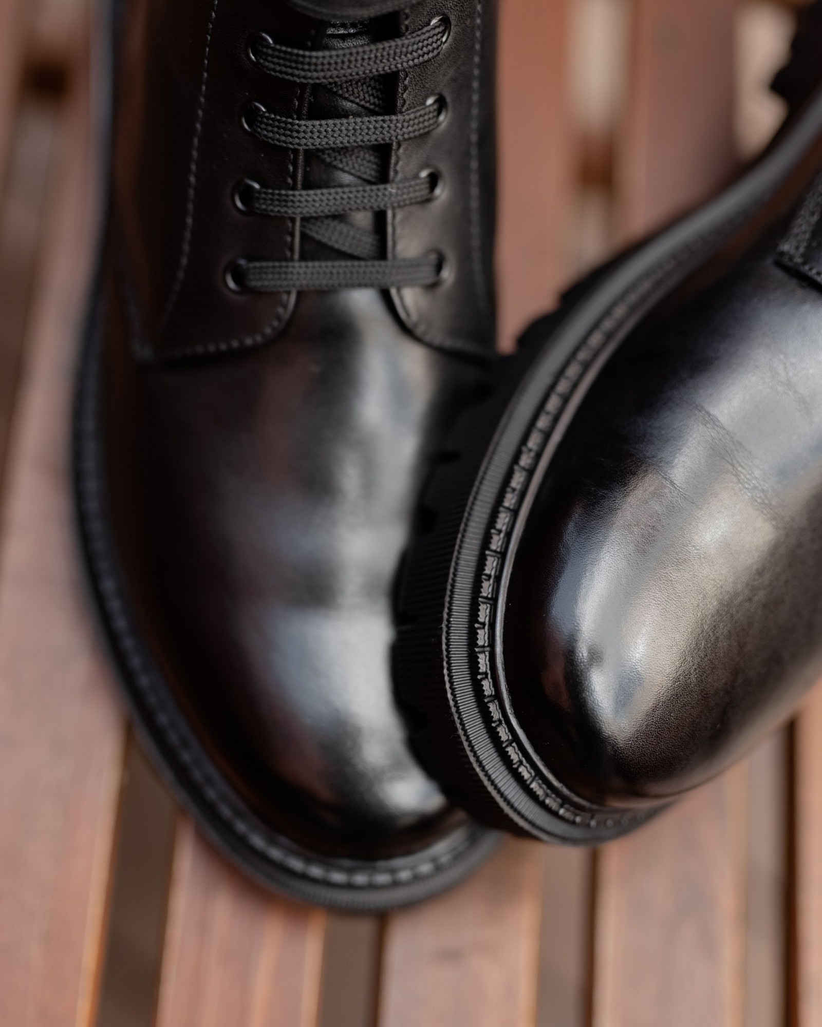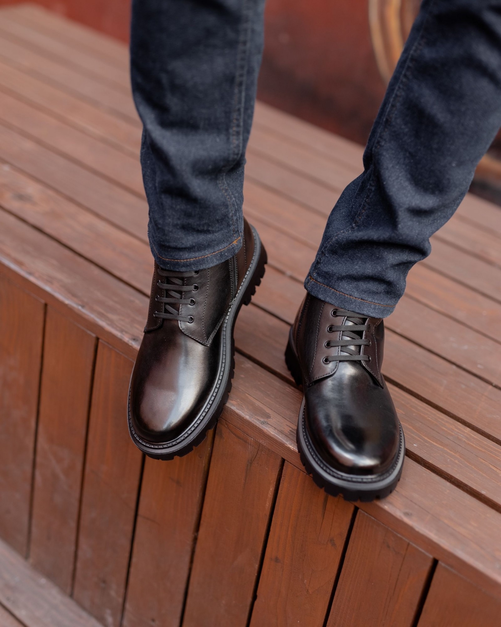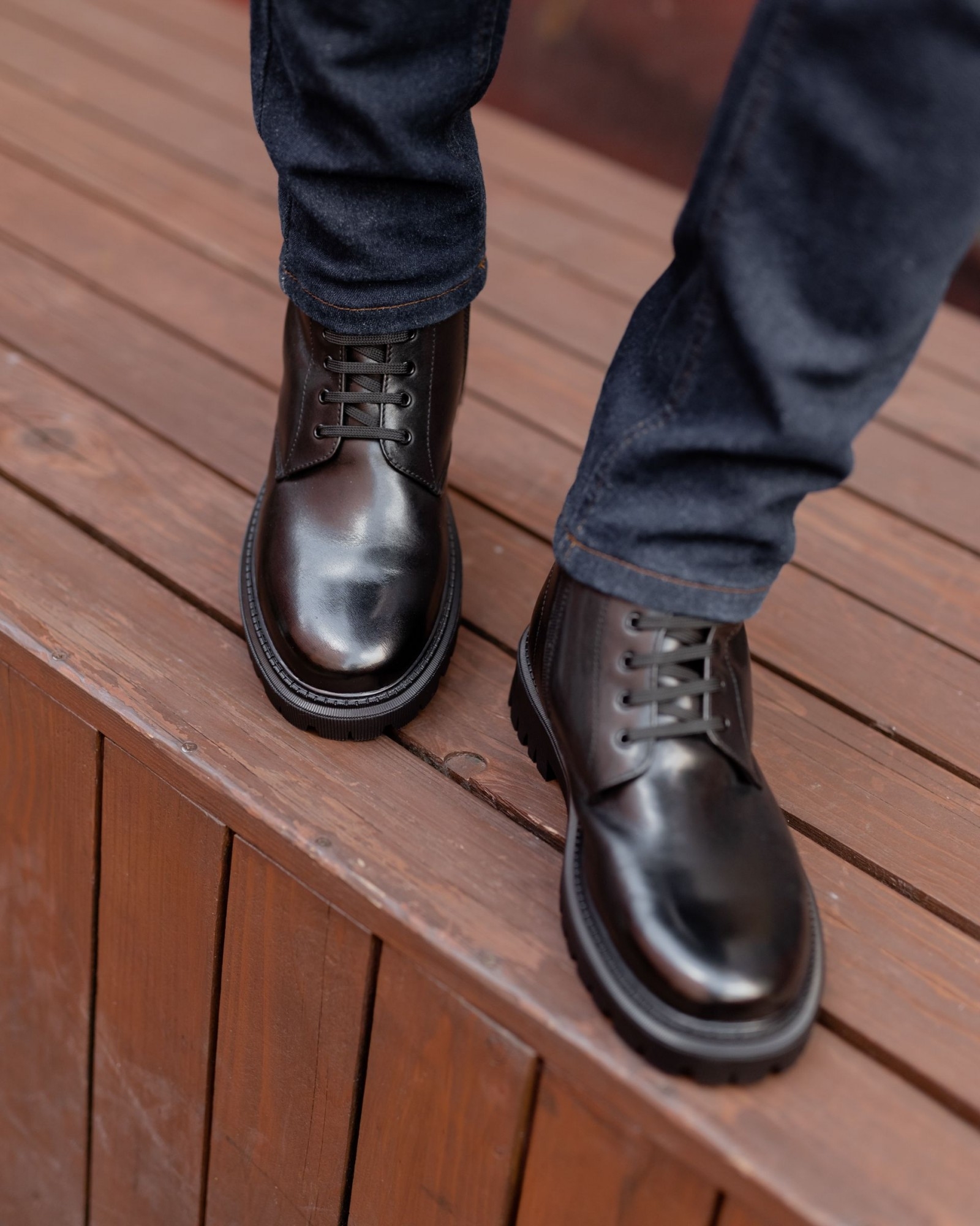 - **Материалы:** Верх выполнен из глянцевой чёрной кожи, которая не только выглядит стильно, но и обладает отличной износостойкостью, защищая от влаги и снега.