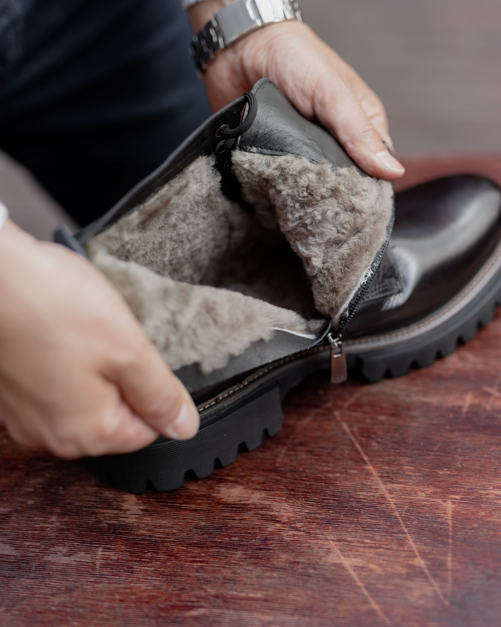 - **Внутренняя отделка:** Натуральный мех (овчина) создаёт уют и тепло, идеально поддерживая комфортную температуру внутри ботинок.