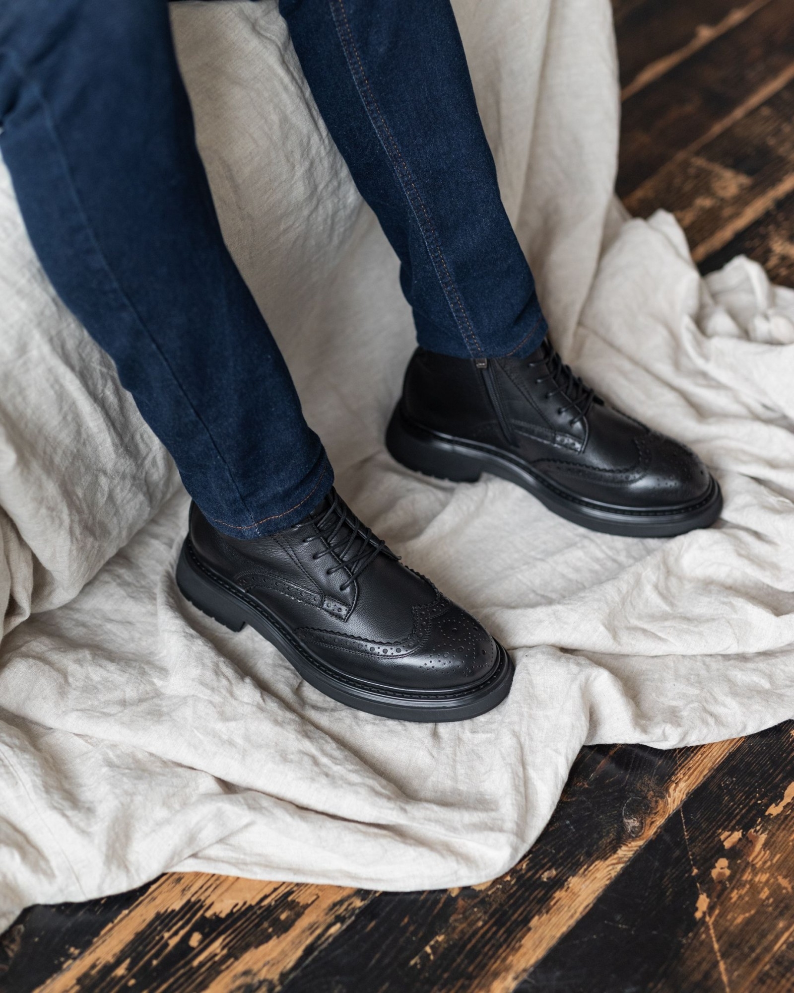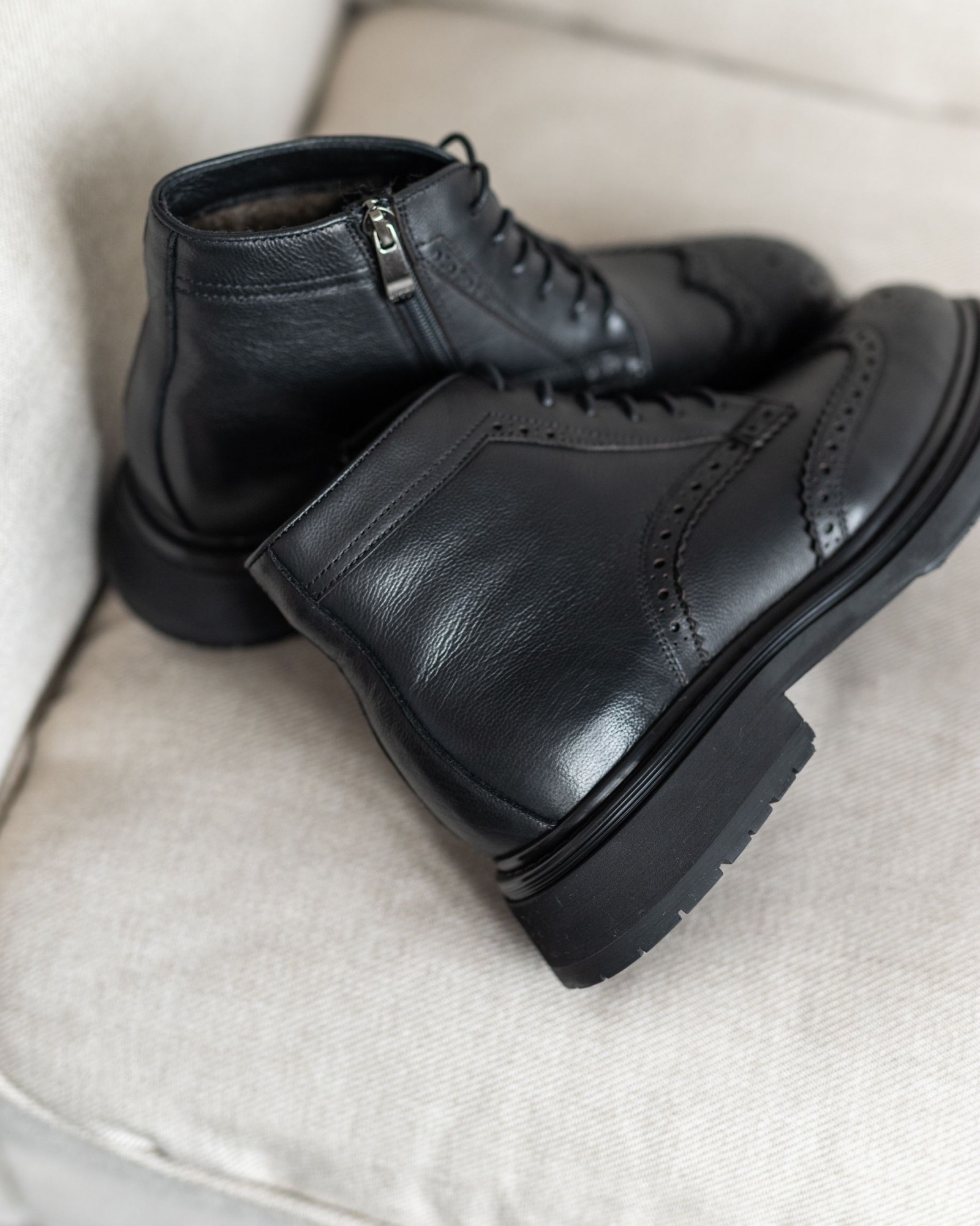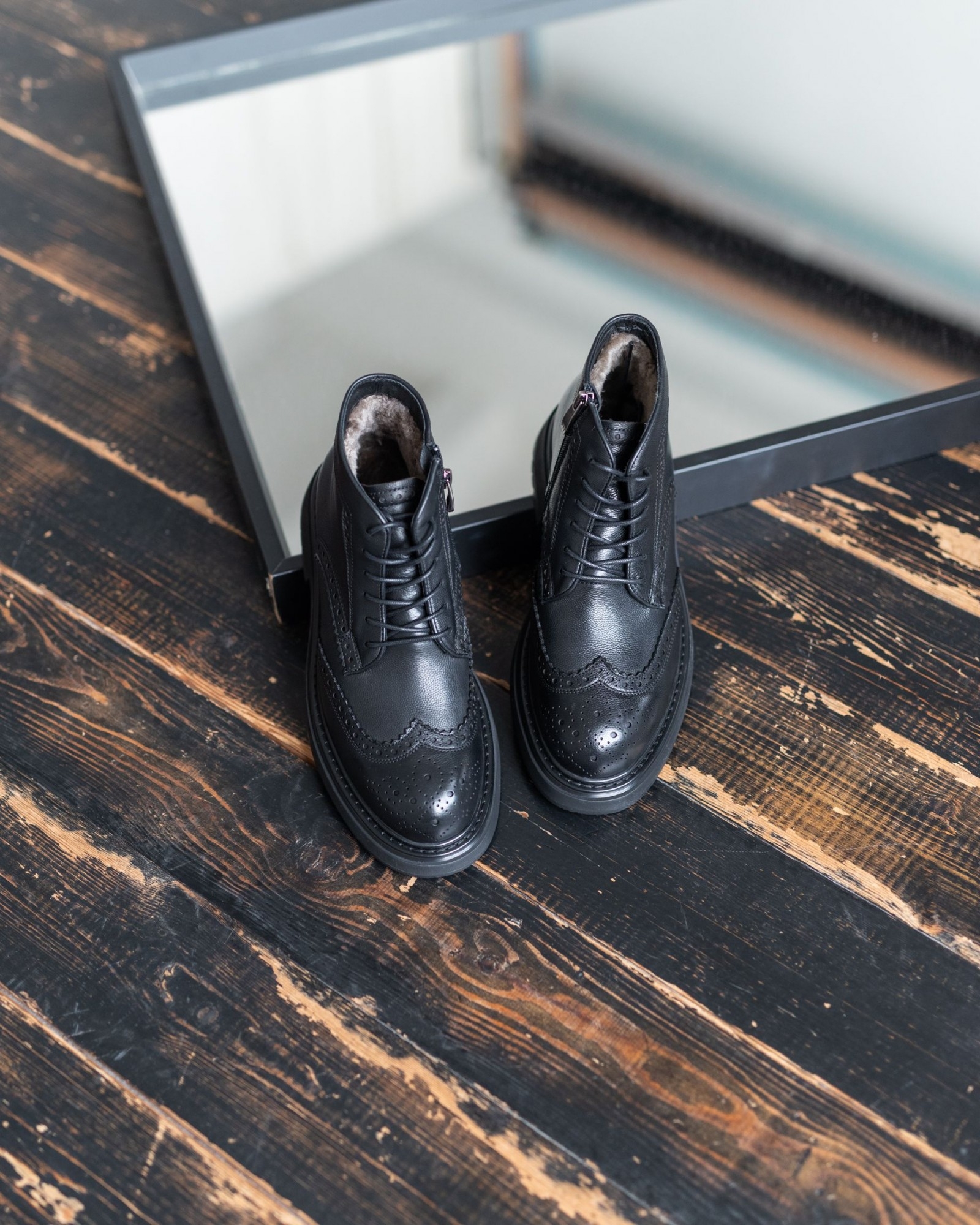 Стильная модель, выполненная из чёрной кожи с крупным классическим узором брогирования. Толстая подошва выглядит выразительно, но остаётся лёгкой, что делает обувь удобной для повседневного ношения. Внутри — подкладка из натурального меха, сохраняющая тепло и создающая дополнительный комфорт в холодное время года.