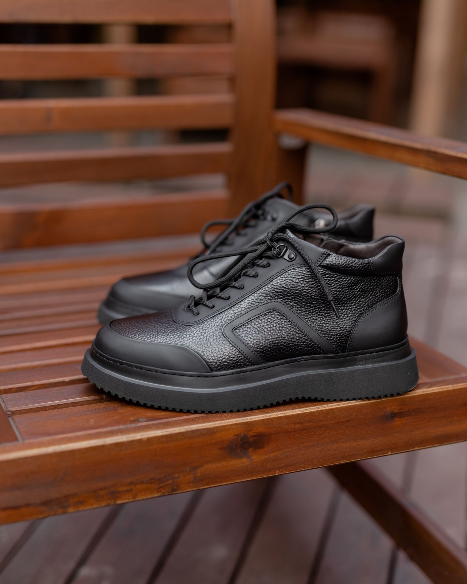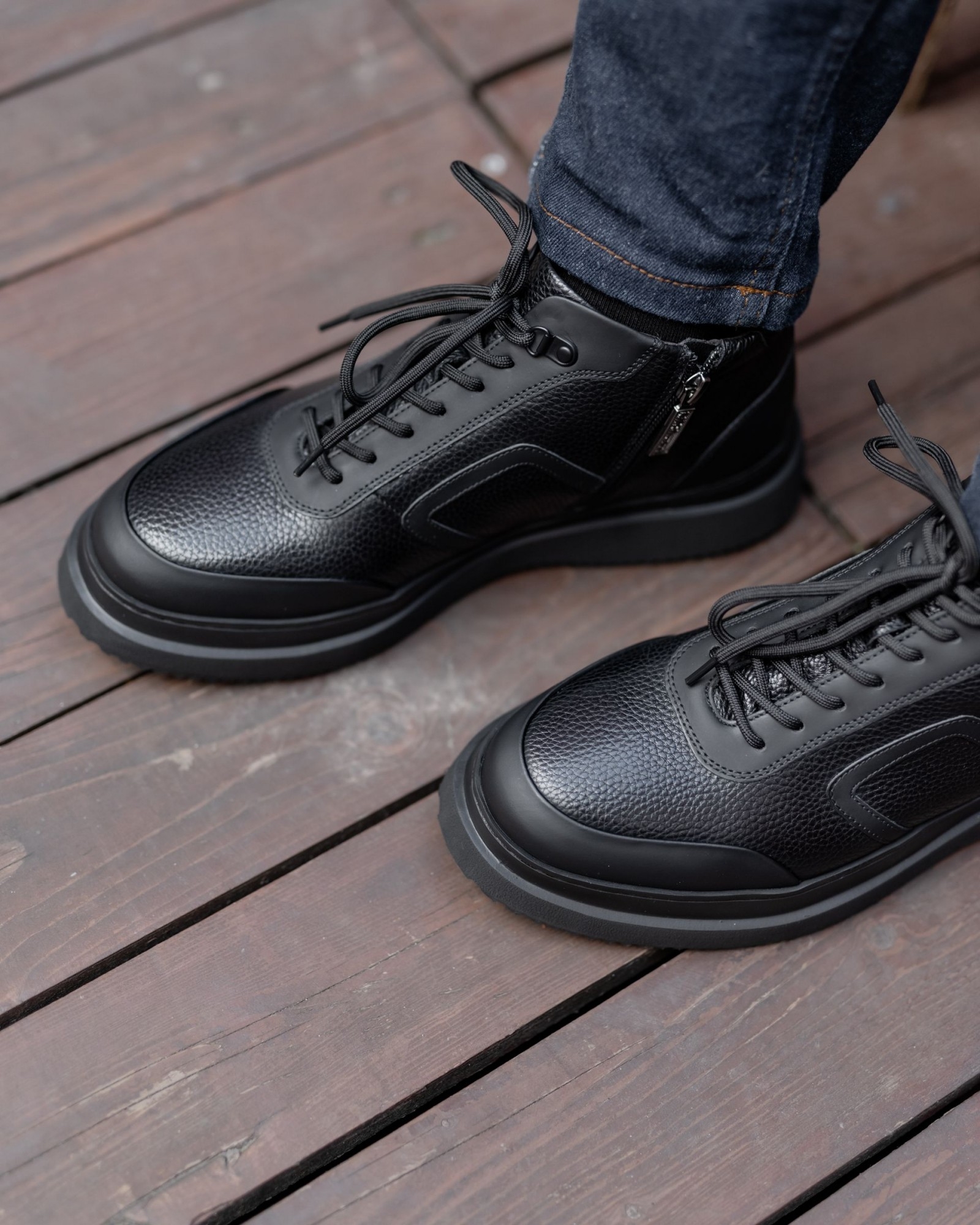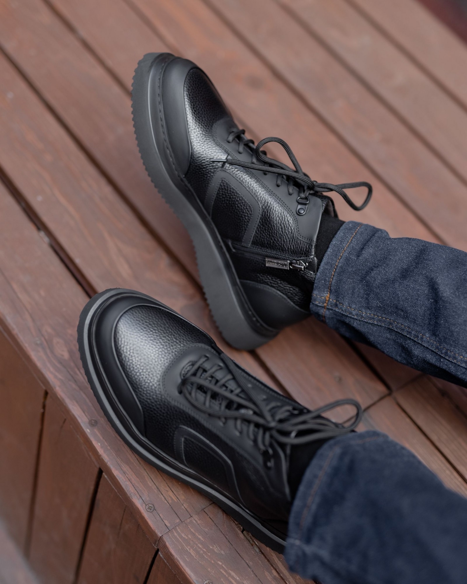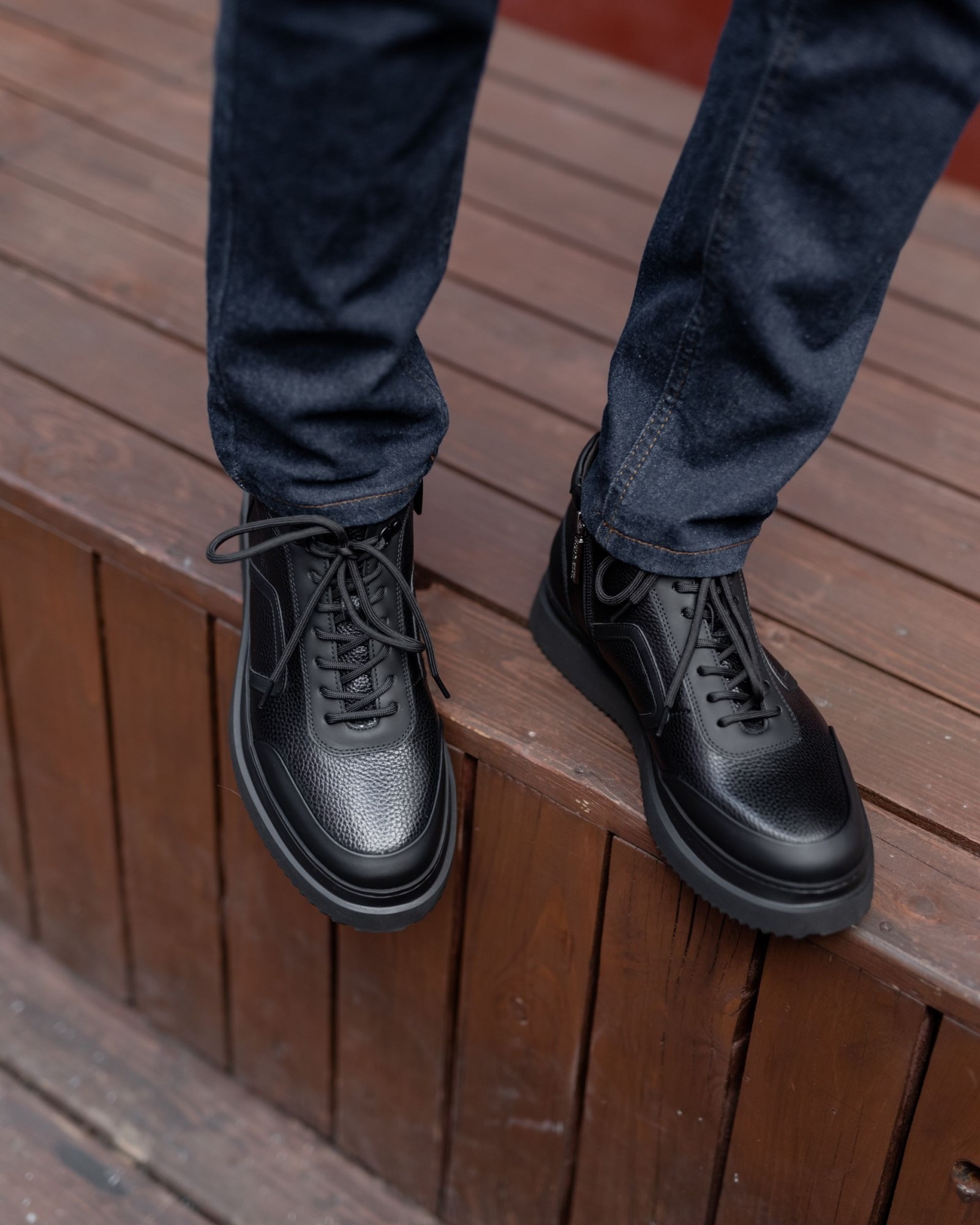 Эта модель сочетает стиль, комфорт и практичность для активной жизни в городе. Прочный верх из нескольких видов чёрной кожи обеспечивает долговечность, а толстая подошва, прошитая по периметру, защищает от неровностей дороги и глубоких луж, оставаясь лёгкой и удобной. Подкладка из натурального меха и овчины подарит тепло и уют даже в холодные дни. Застёжка в виде замка и шнурков позволяет точно зафиксировать обувь на ноге.