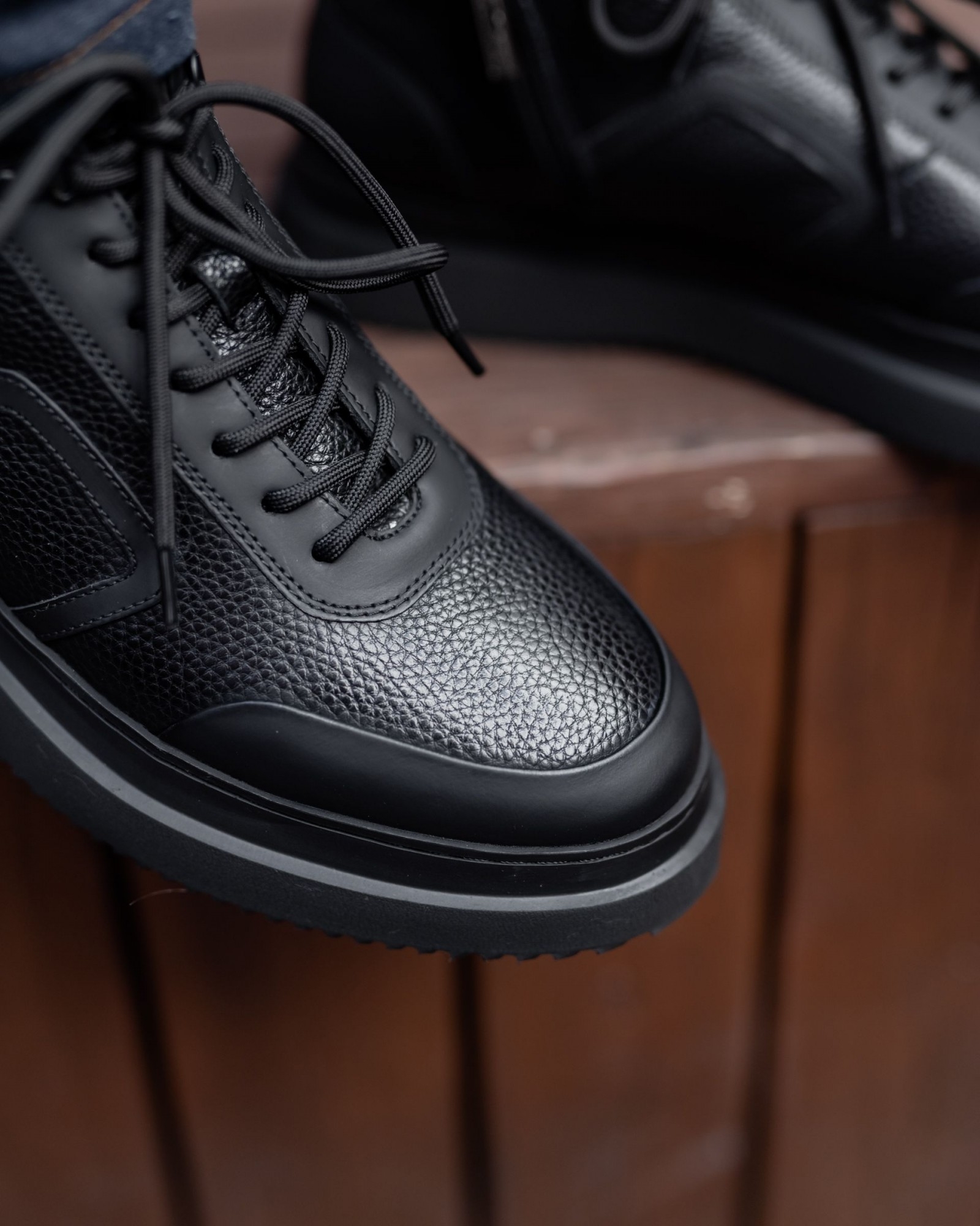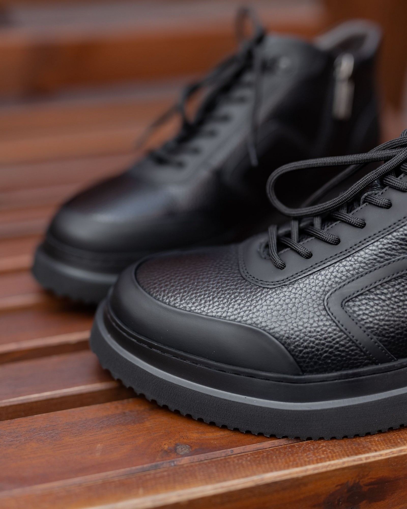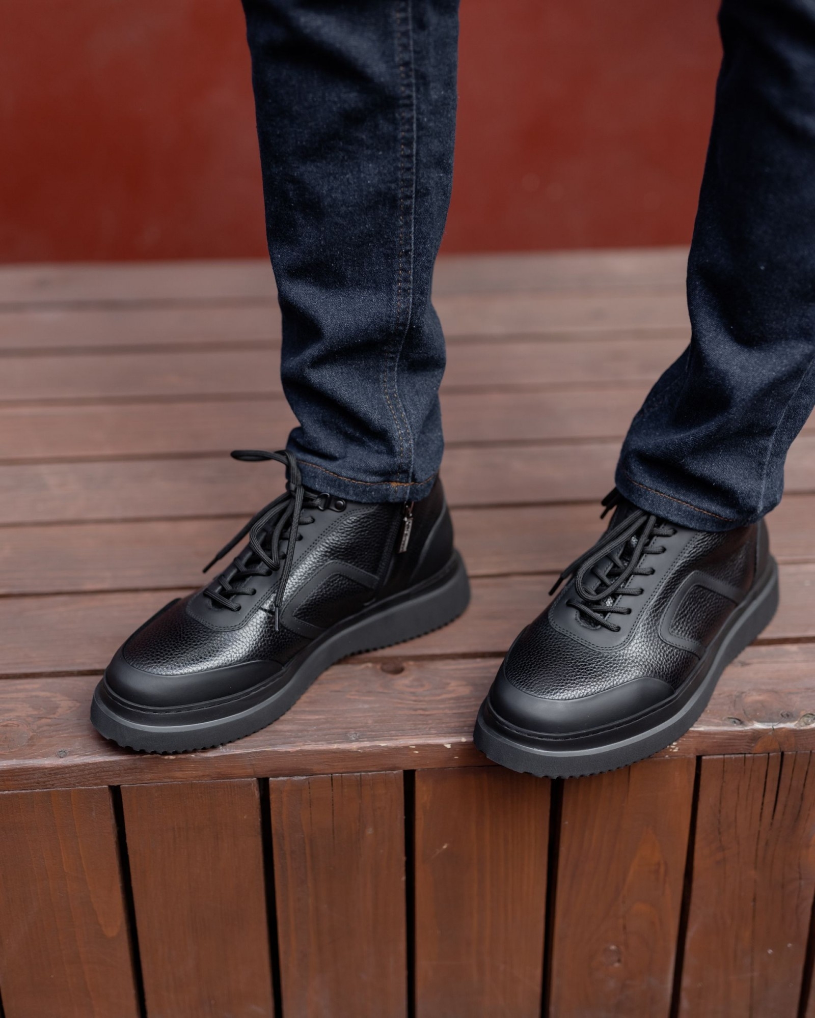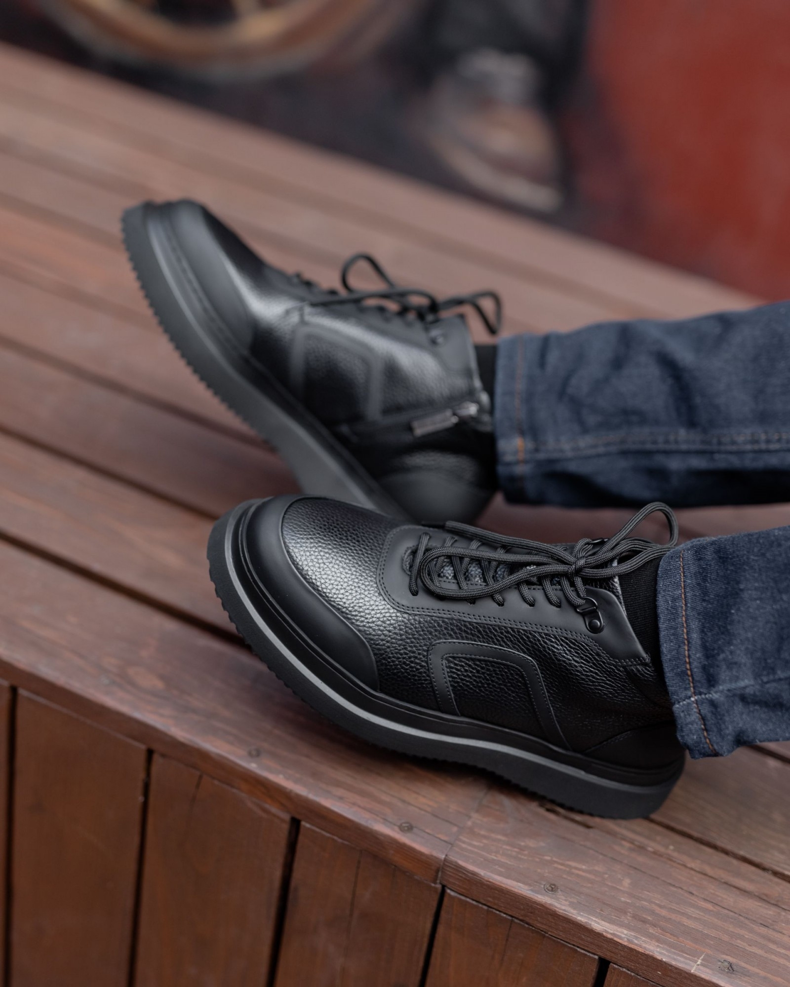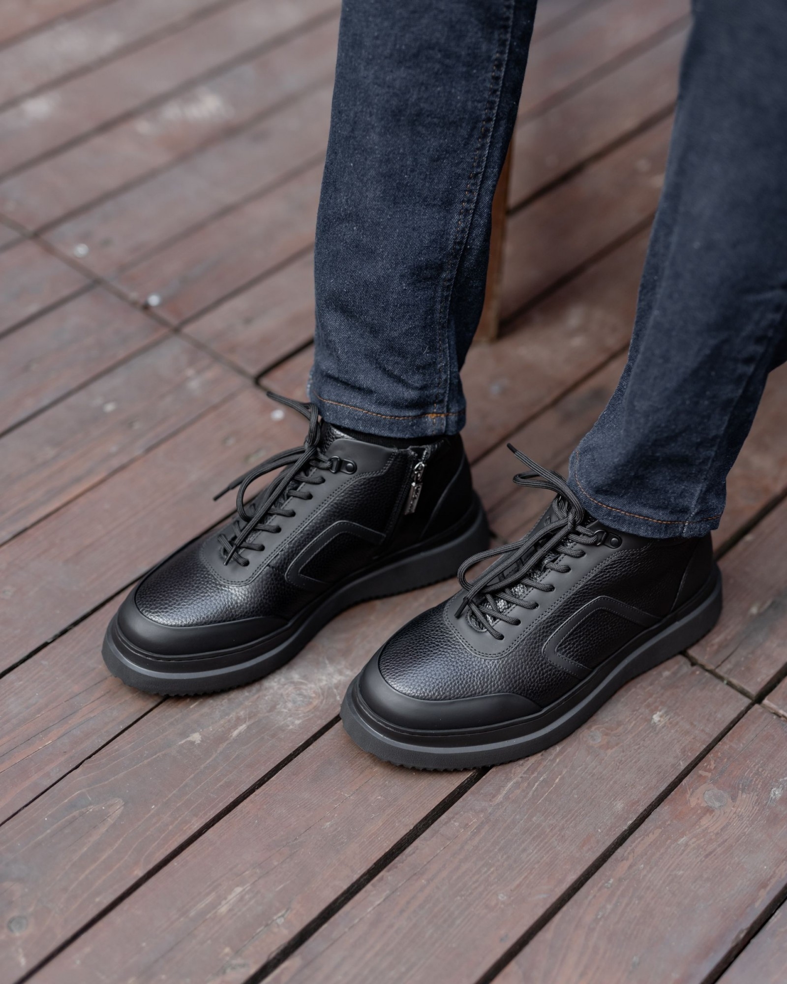 Эта модель сочетает стиль, комфорт и практичность для активной жизни в городе. Прочный верх из нескольких видов чёрной кожи обеспечивает долговечность, а толстая подошва, прошитая по периметру, защищает от неровностей дороги и глубоких луж, оставаясь лёгкой и удобной. Подкладка из натурального меха и овчины подарит тепло и уют даже в холодные дни. Застёжка в виде замка и шнурков позволяет точно зафиксировать обувь на ноге.