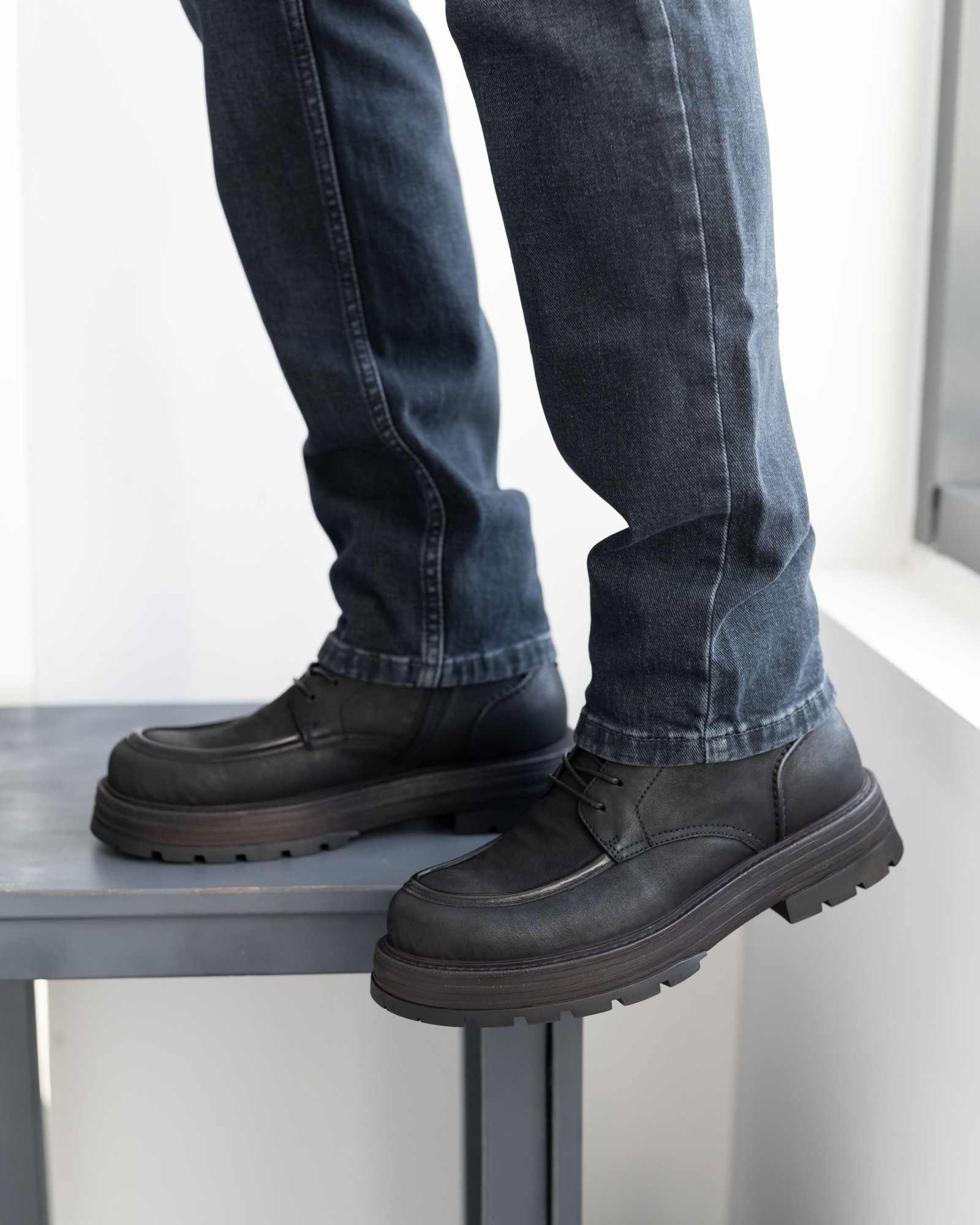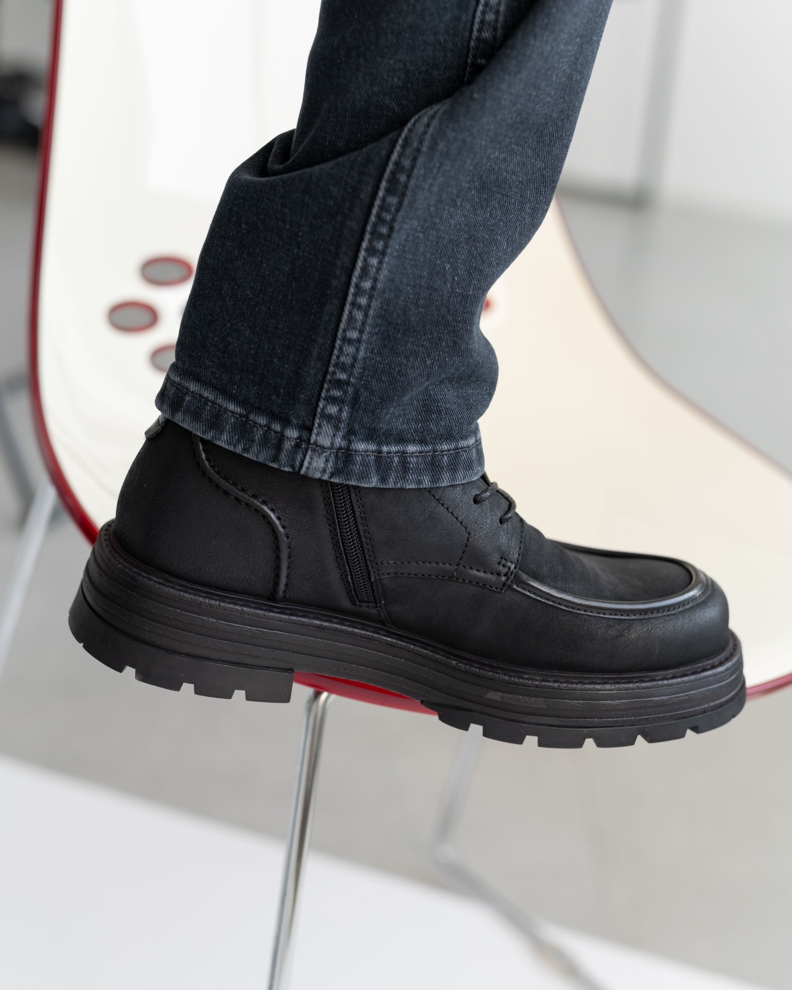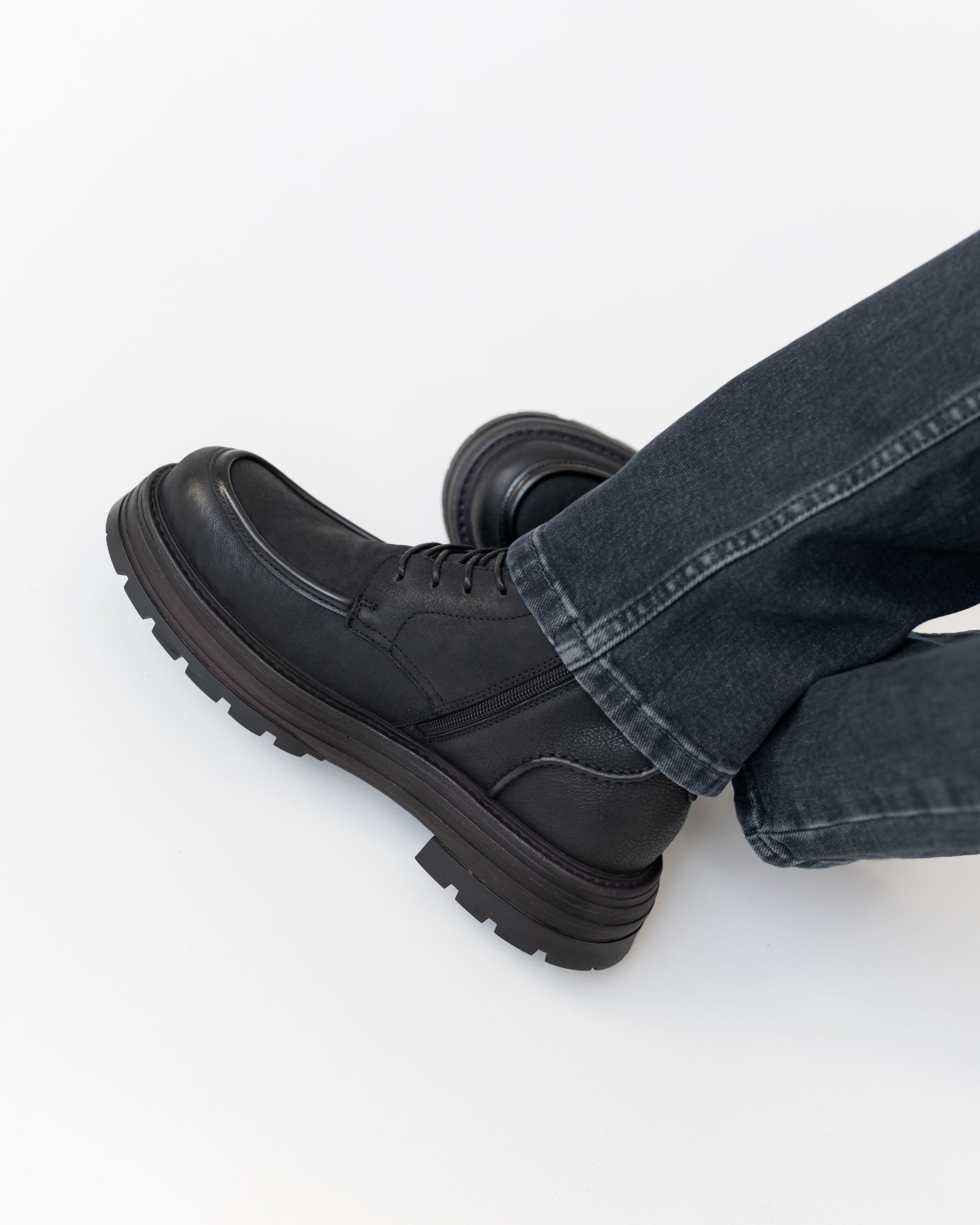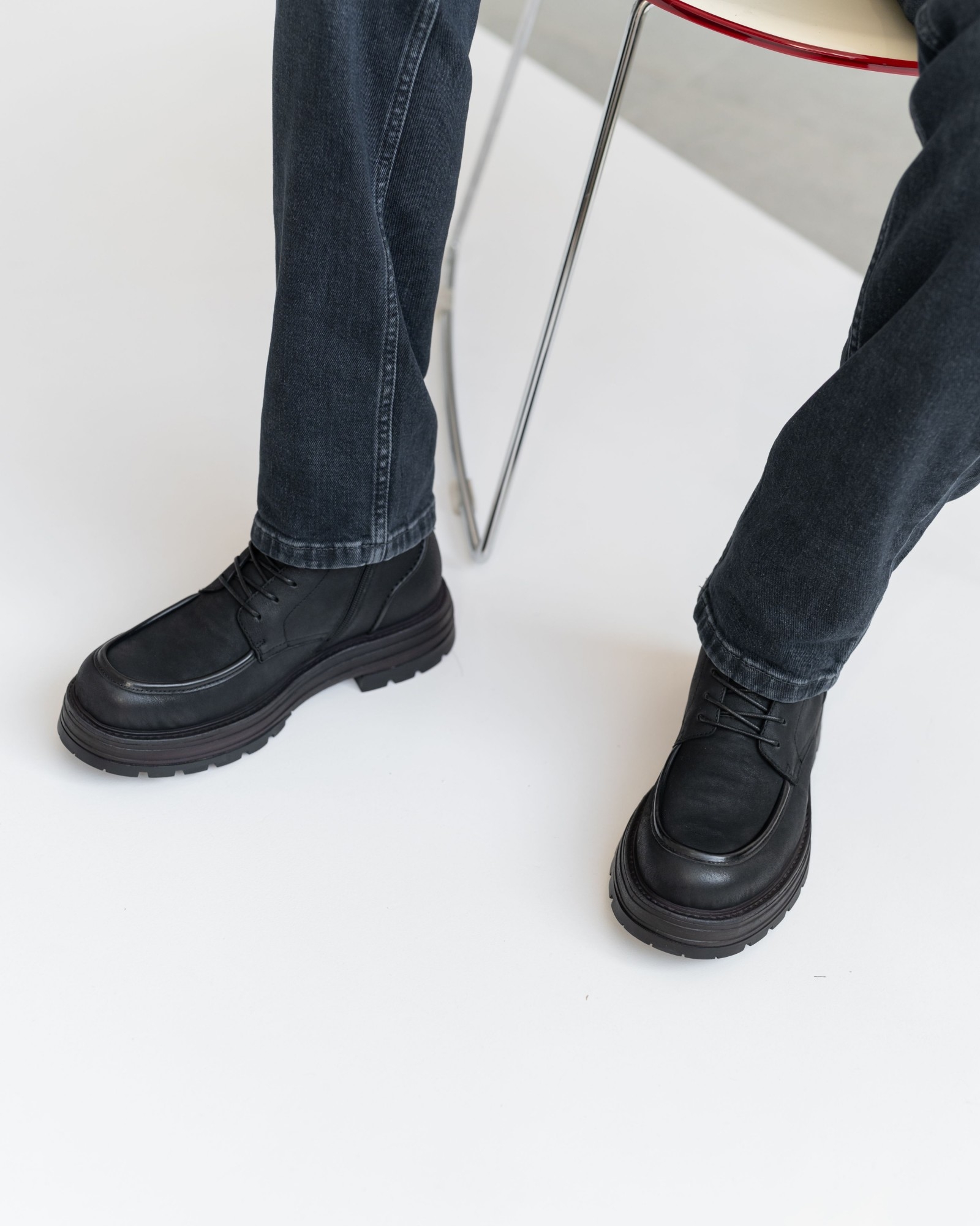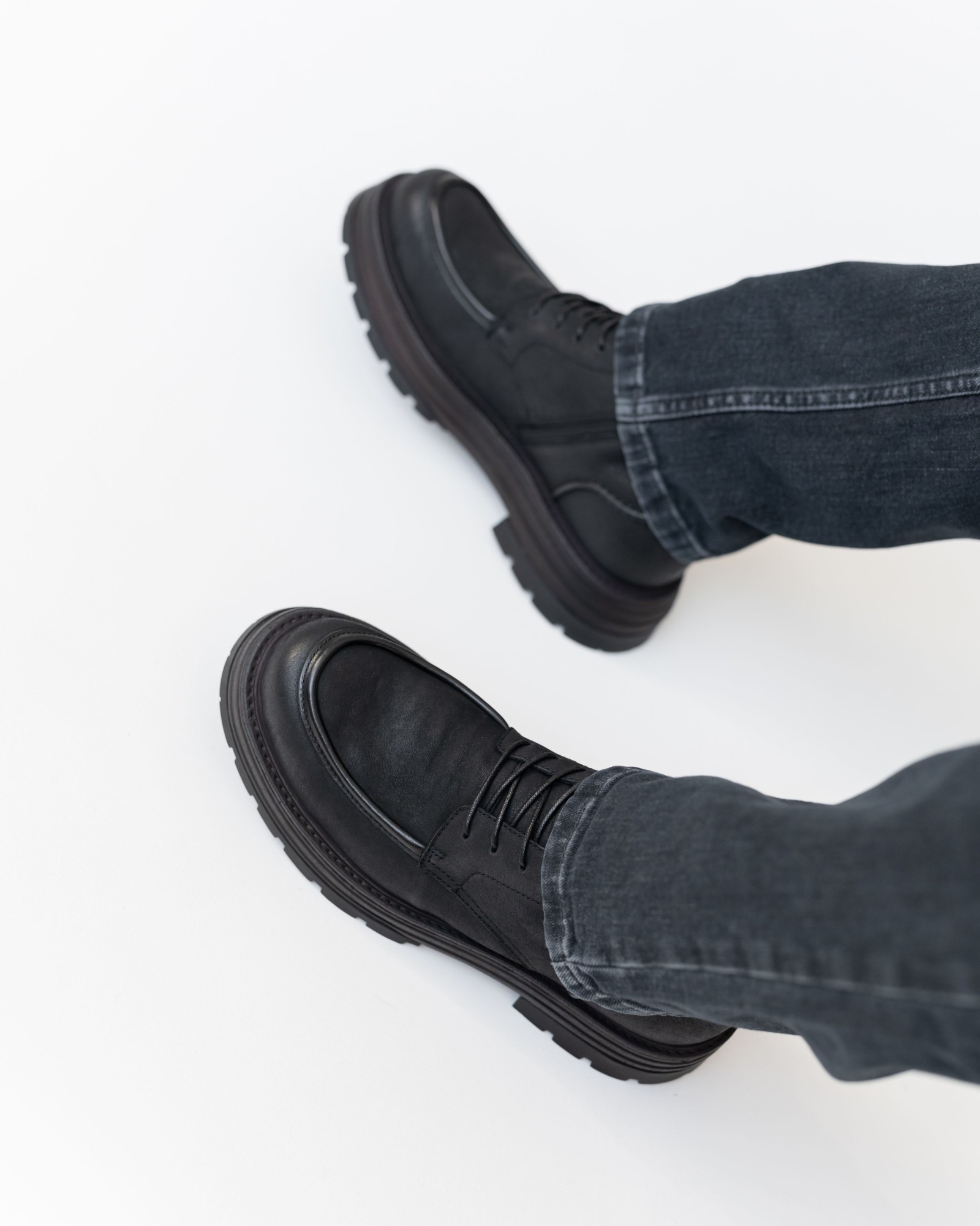 Модные и лёгкие демисезонные ботинки из чёрного нубука с подкладкой из мягкой байки подарят комфорт на каждый день. Слегка квадратный носок с декоративным швом, напоминающим отделку лоферов, придаёт модели современный характер. Классическая шнуровка дополнена замком на внутренней стороне для лёгкого надевания. Продуманная многослойная подошва и удобная стелька обеспечивают повышенный комфорт даже при длительном ношении. Эта пара отлично подчеркнёт стиль как взрослых джентльменов, так и молодых ребят, которые ценят современный и аккуратный образ.