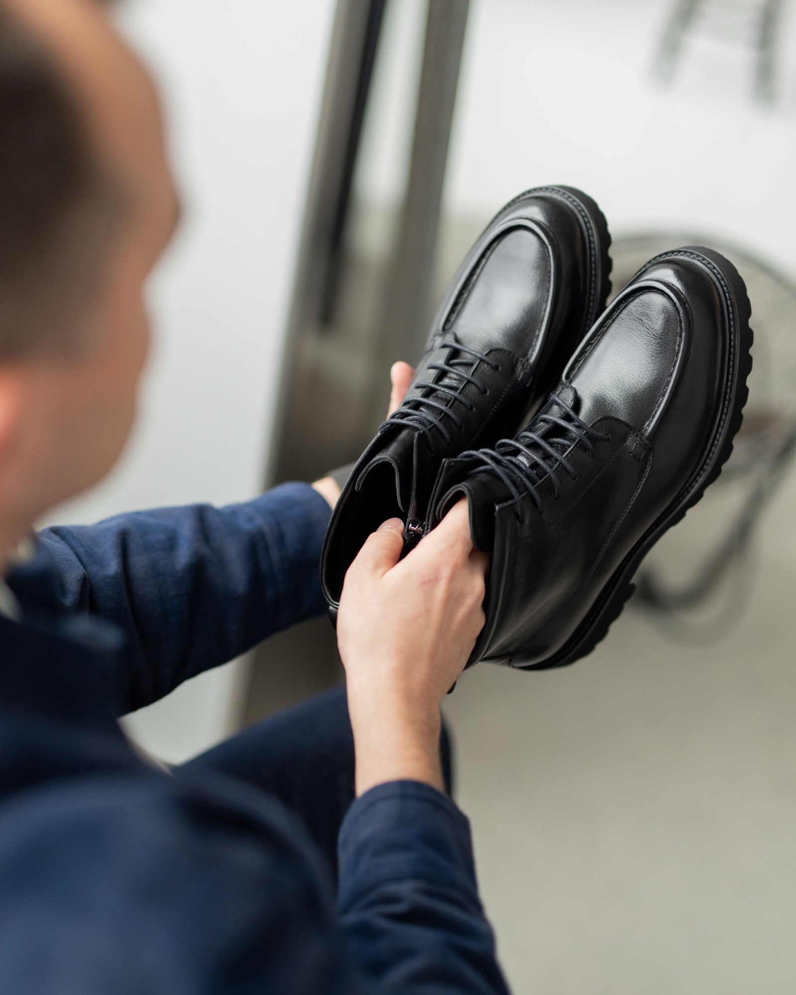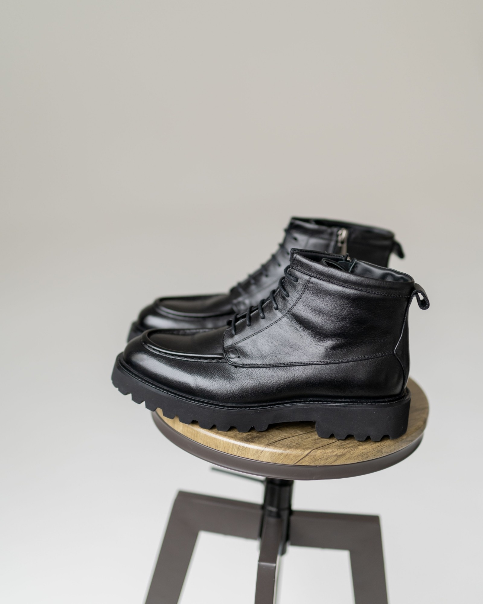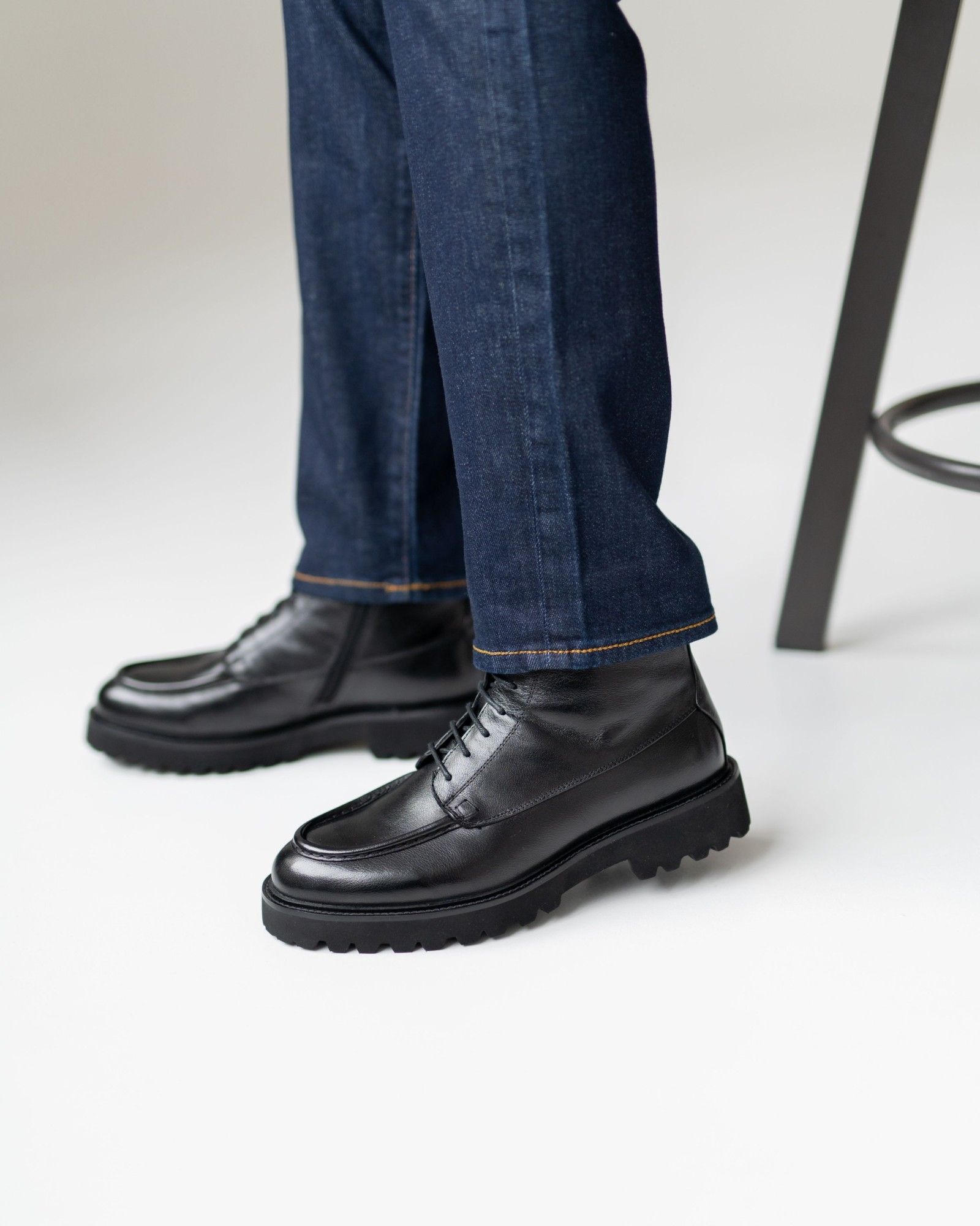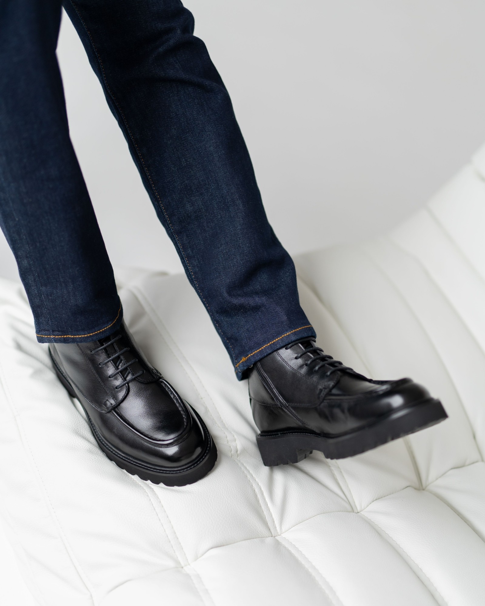 Ботинки из угольно-чёрной кожи на облегчённой подошве с протектором — тот случай, когда функциональность и элегантность работают в унисон. Декоративный шов на носке подчёркивает аккуратный силуэт и добавляет модели индивидуальности. Лёгкая, но уверенная подошва обеспечивает комфорт в движении, сохраняя при этом выразительный внешний вид. Замок на внутренней стороне делает посадку быстрой и удобной без потери строгости в форме. Приходите на примерку — на ноге эти ботинки выглядят ещё изящнее и ощущаются удивительно лёгкими.