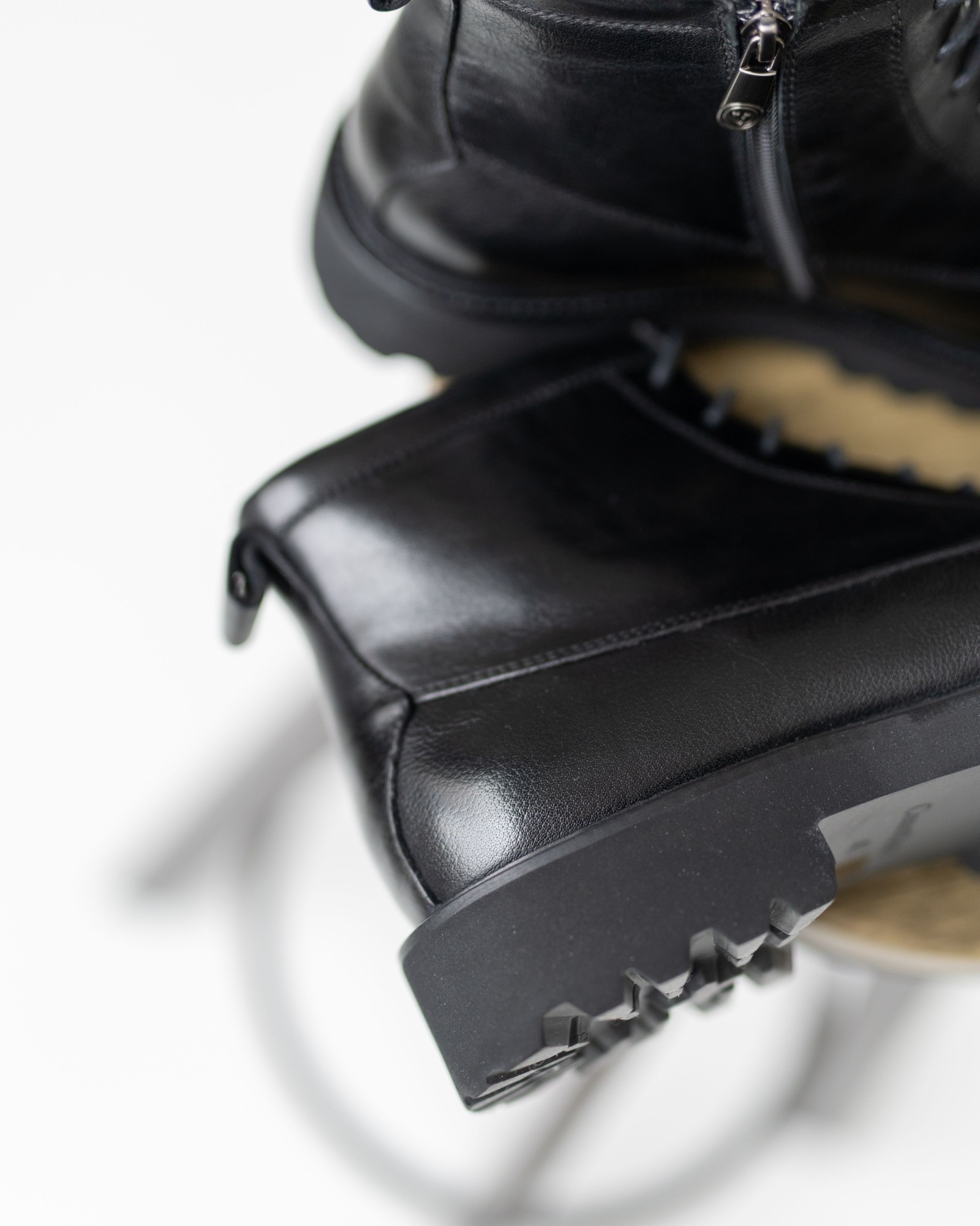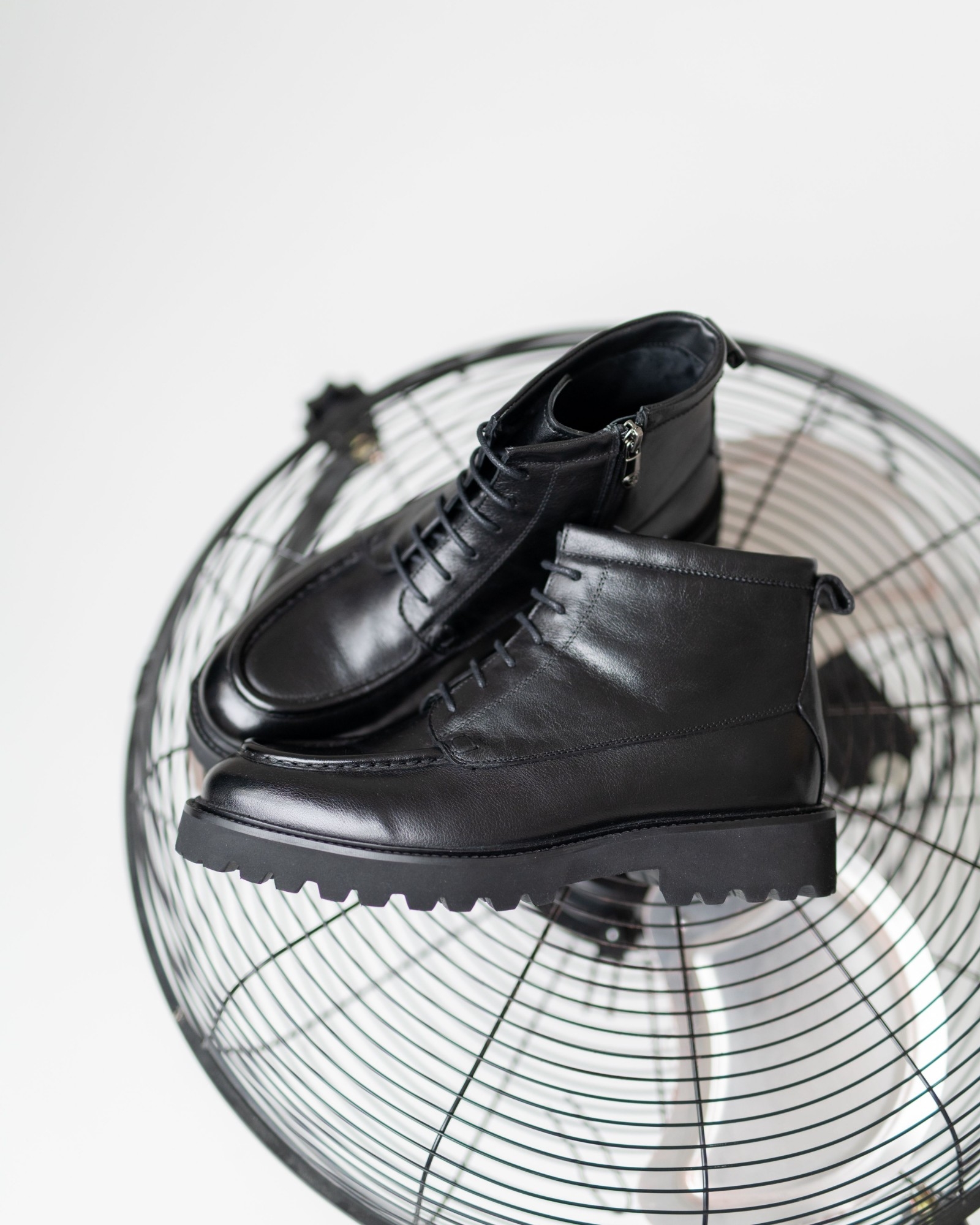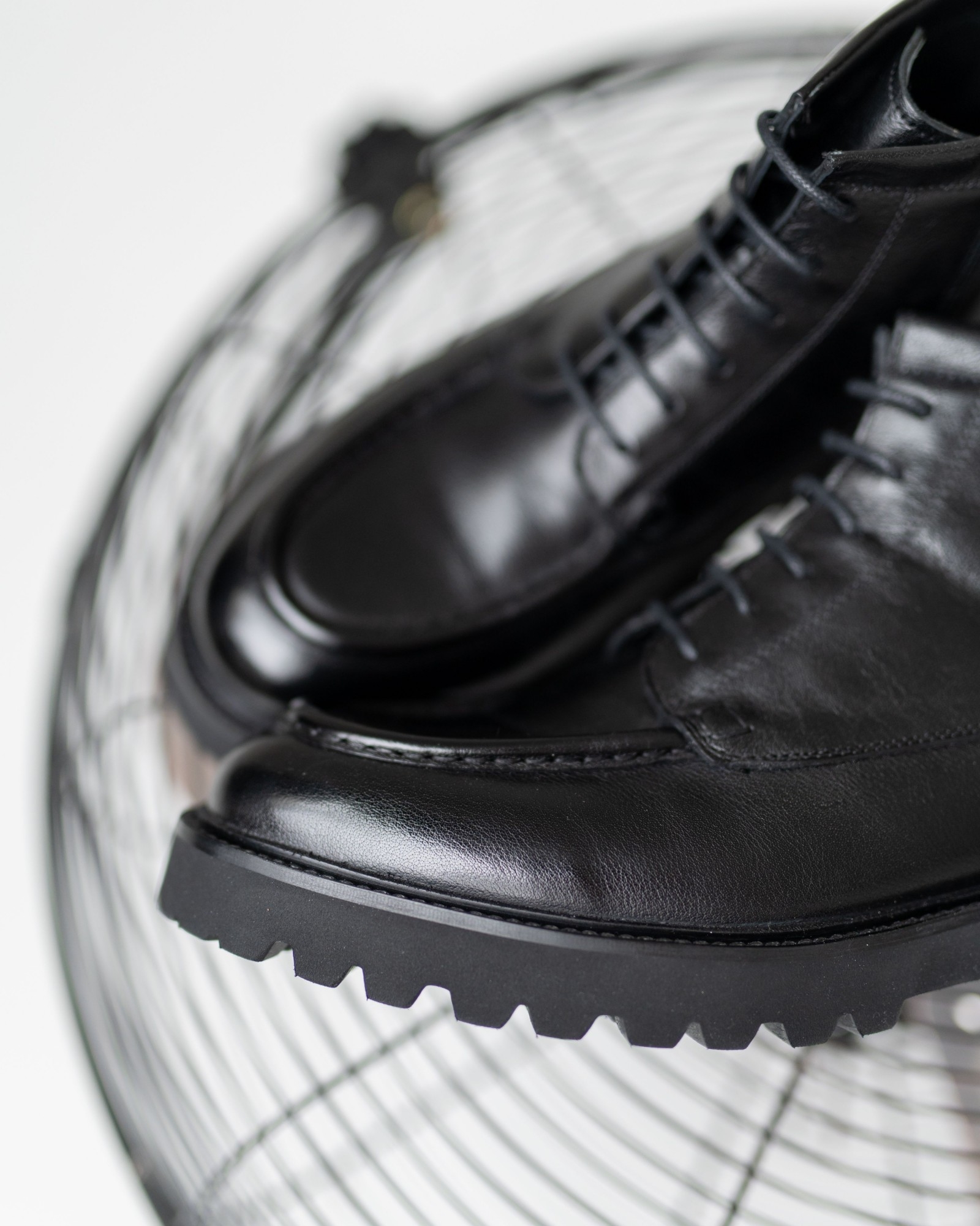 Ботинки из угольно-чёрной кожи на облегчённой подошве с протектором — тот случай, когда функциональность и элегантность работают в унисон. Декоративный шов на носке подчёркивает аккуратный силуэт и добавляет модели индивидуальности. Лёгкая, но уверенная подошва обеспечивает комфорт в движении, сохраняя при этом выразительный внешний вид. Замок на внутренней стороне делает посадку быстрой и удобной без потери строгости в форме. Приходите на примерку — на ноге эти ботинки выглядят ещё изящнее и ощущаются удивительно лёгкими.