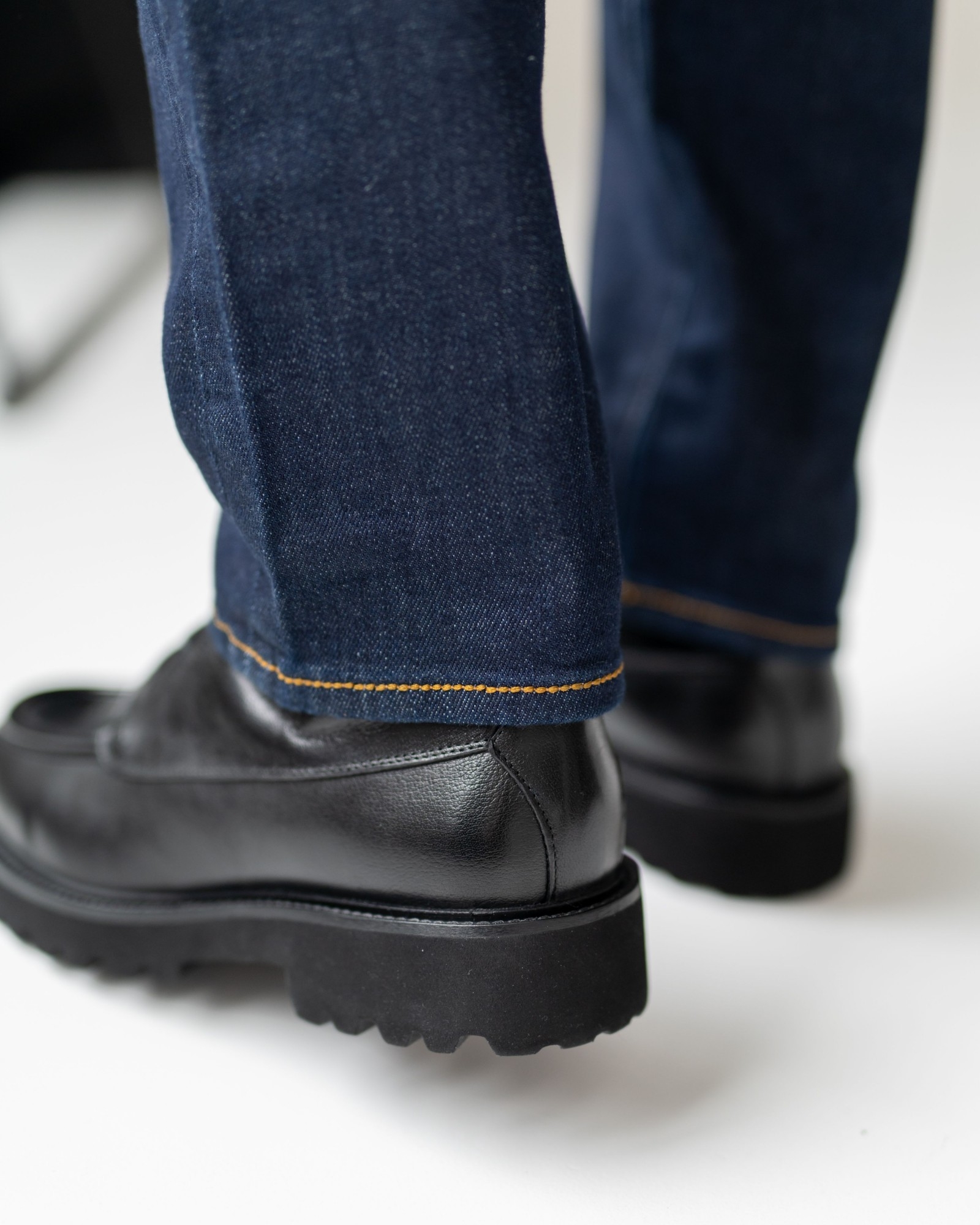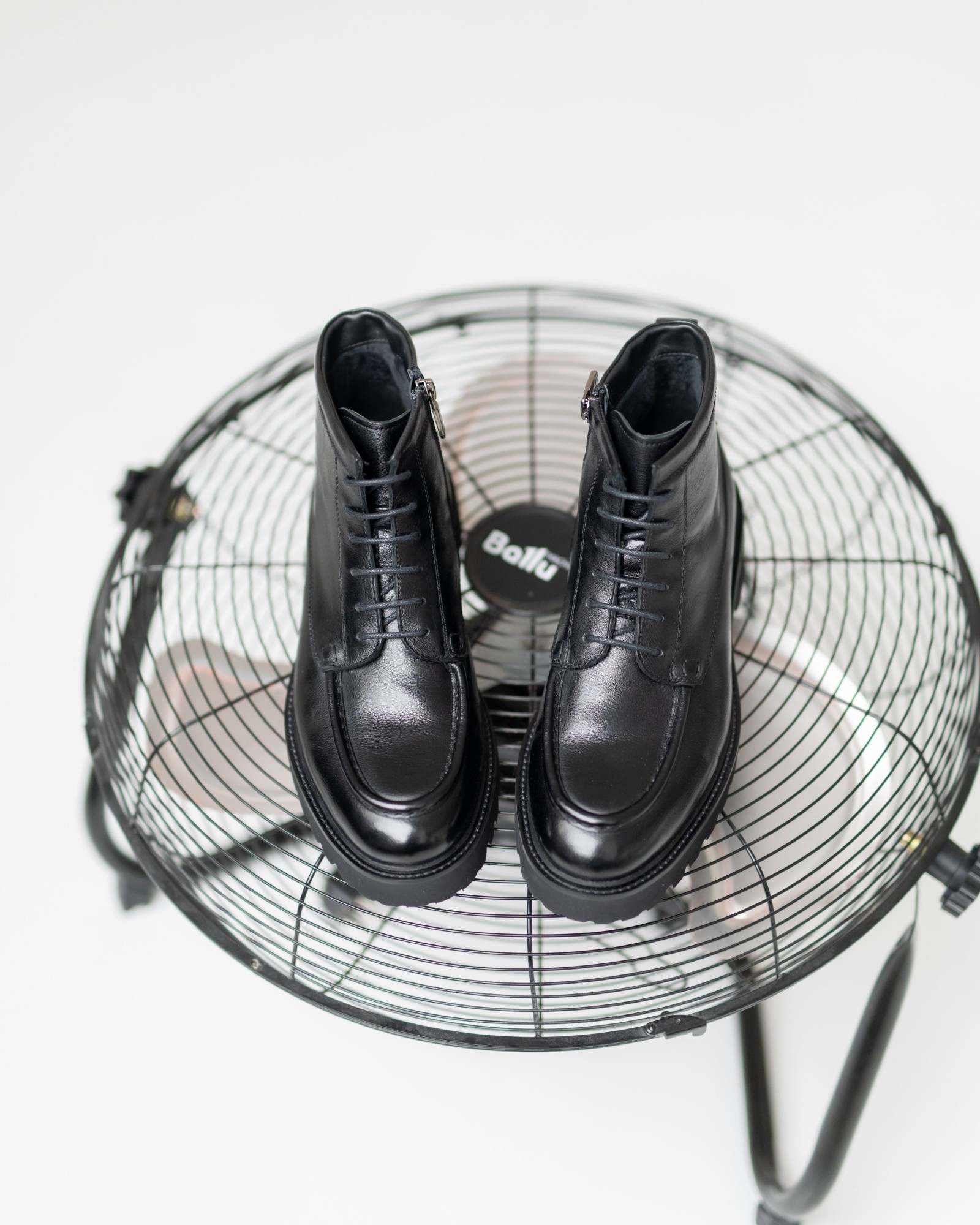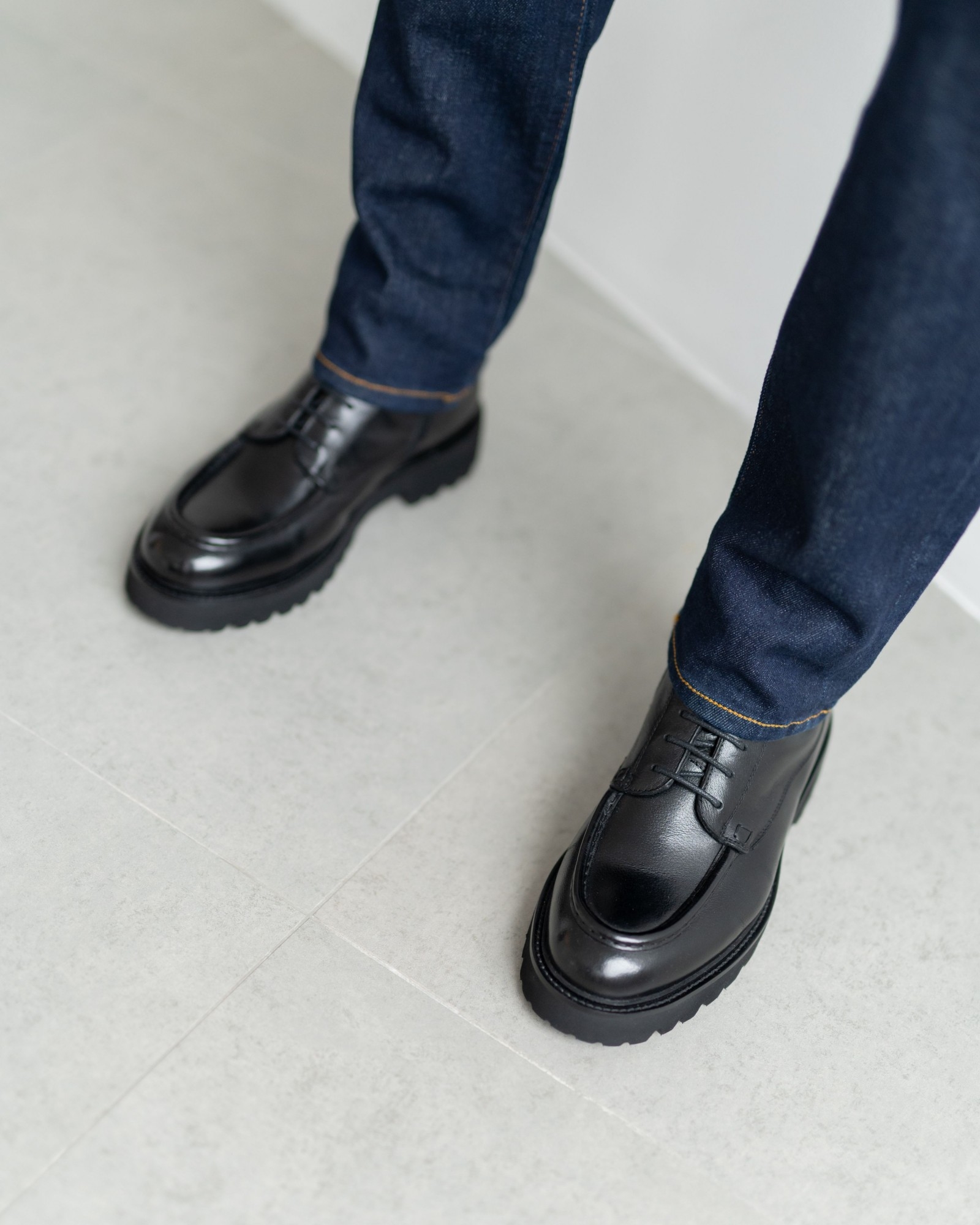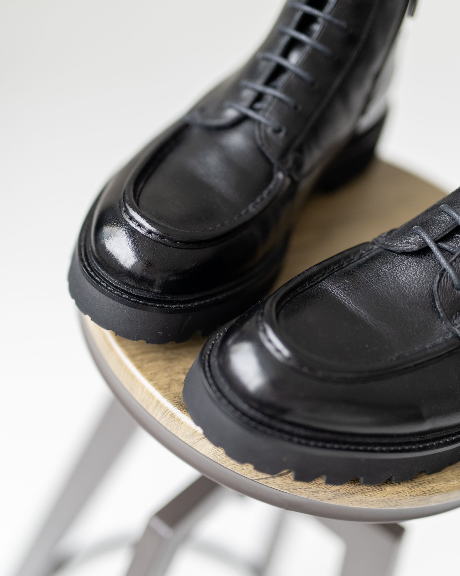 Ботинки из угольно-чёрной кожи на облегчённой подошве с протектором — тот случай, когда функциональность и элегантность работают в унисон. Декоративный шов на носке подчёркивает аккуратный силуэт и добавляет модели индивидуальности. Лёгкая, но уверенная подошва обеспечивает комфорт в движении, сохраняя при этом выразительный внешний вид. Замок на внутренней стороне делает посадку быстрой и удобной без потери строгости в форме. Приходите на примерку — на ноге эти ботинки выглядят ещё изящнее и ощущаются удивительно лёгкими.