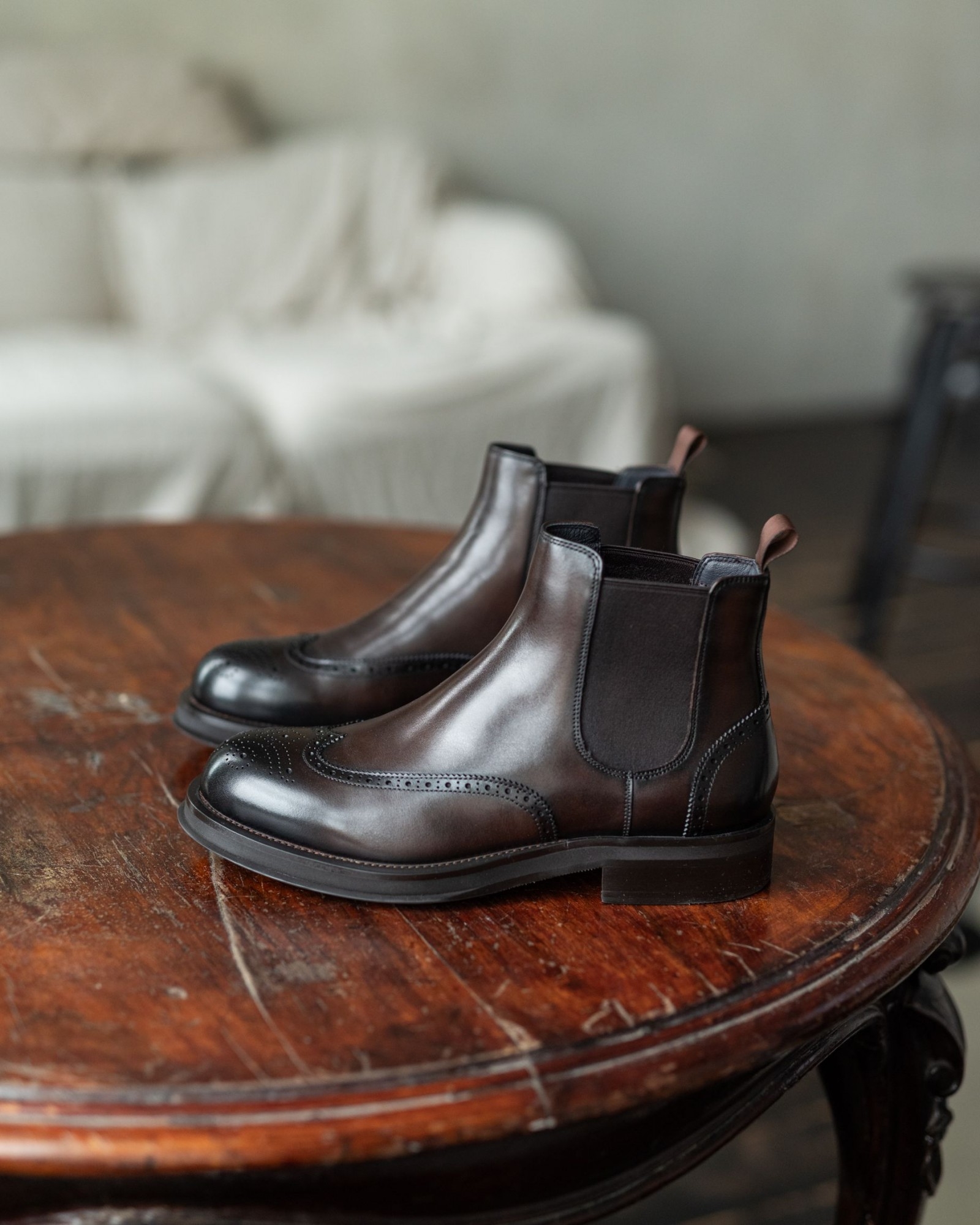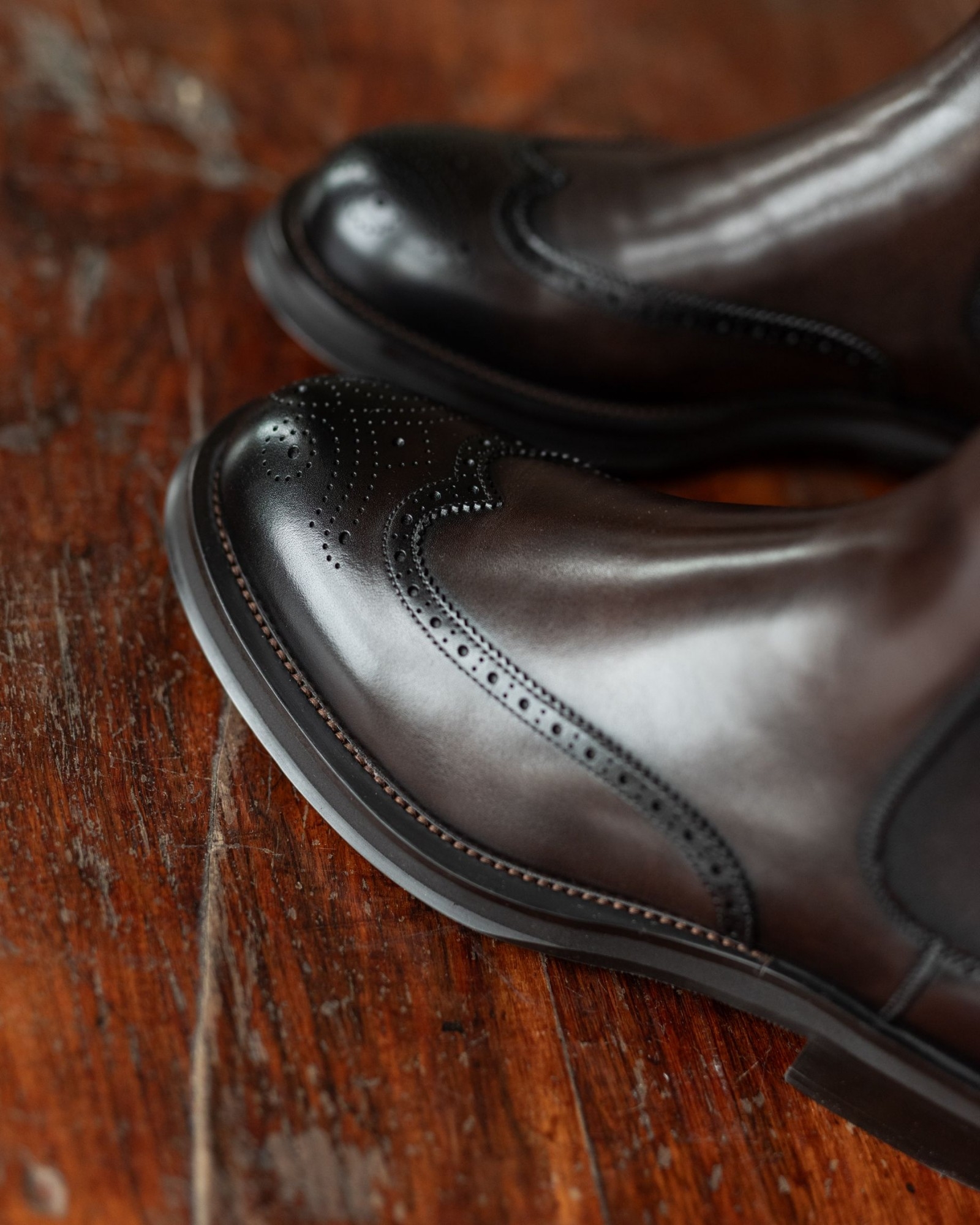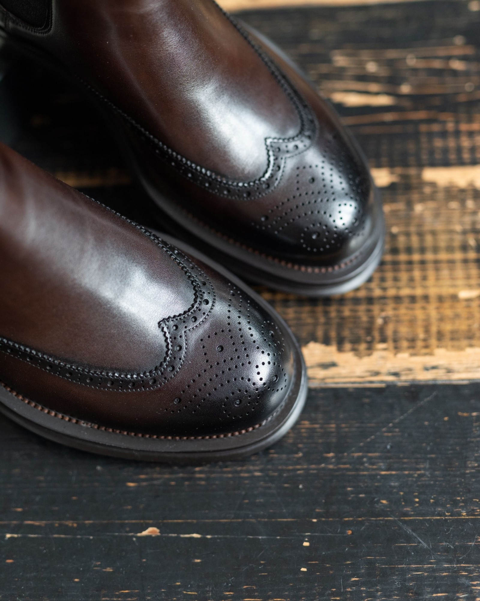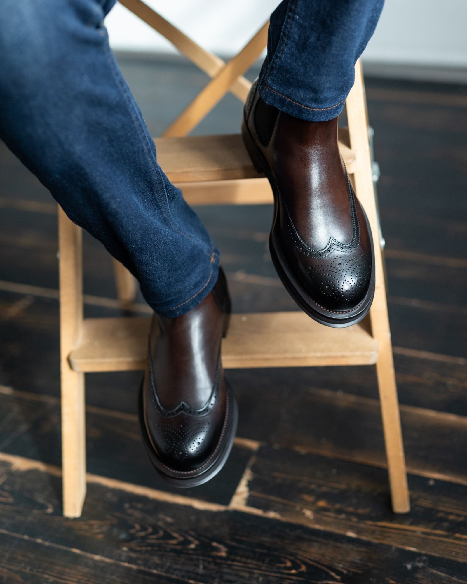 Эта модель сочетает элегантность Челси и аккуратную декоративную перфорацию на носке в стиле брогов. Минималистичный силуэт остаётся сдержанным, а брогирование добавляет утончённый акцент и индивидуальность.