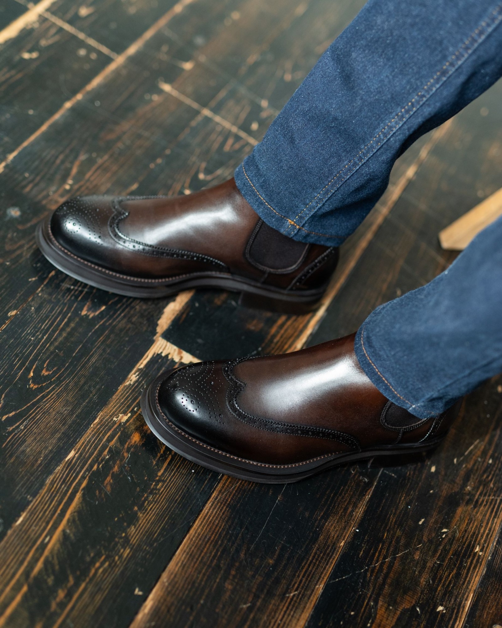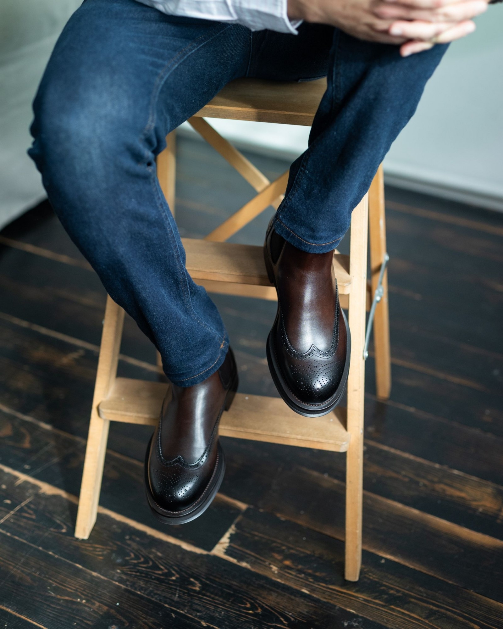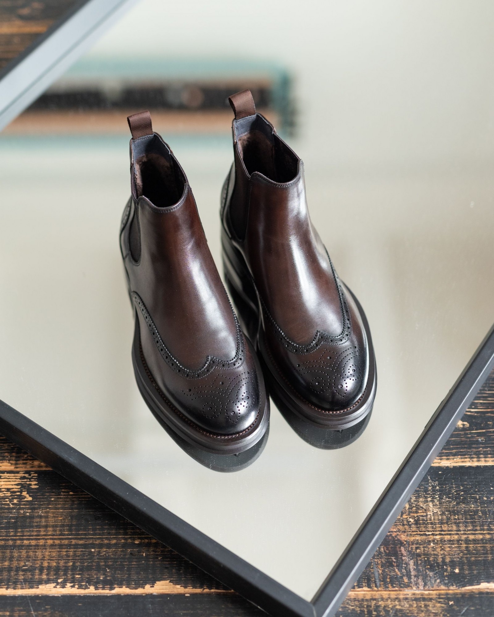 Эта модель сочетает элегантность Челси и аккуратную декоративную перфорацию на носке в стиле брогов. Минималистичный силуэт остаётся сдержанным, а брогирование добавляет утончённый акцент и индивидуальность.