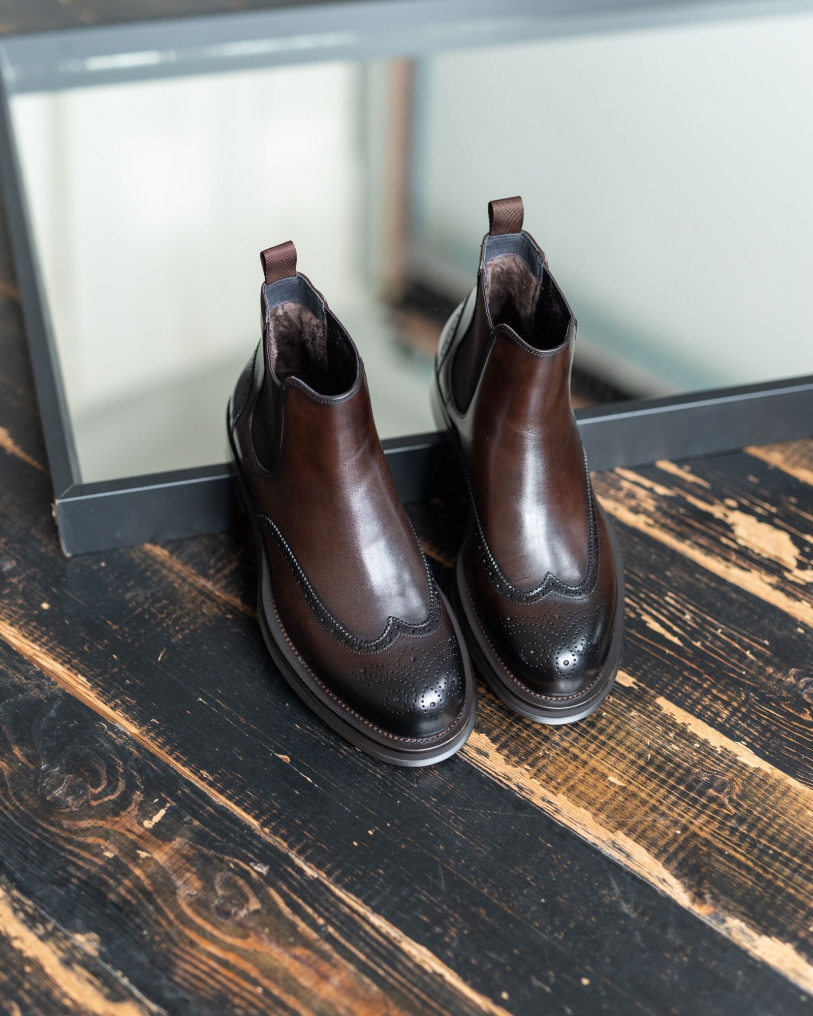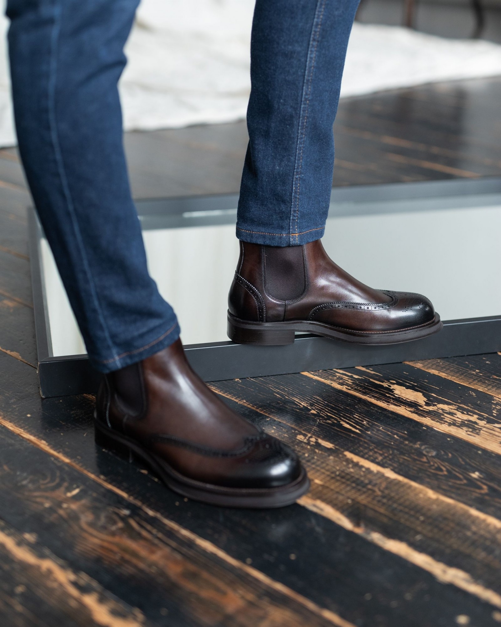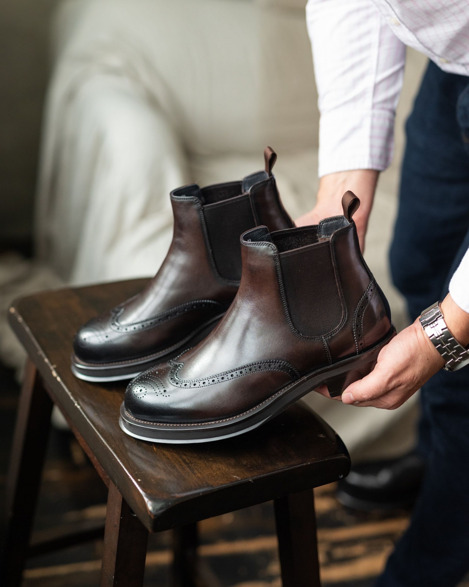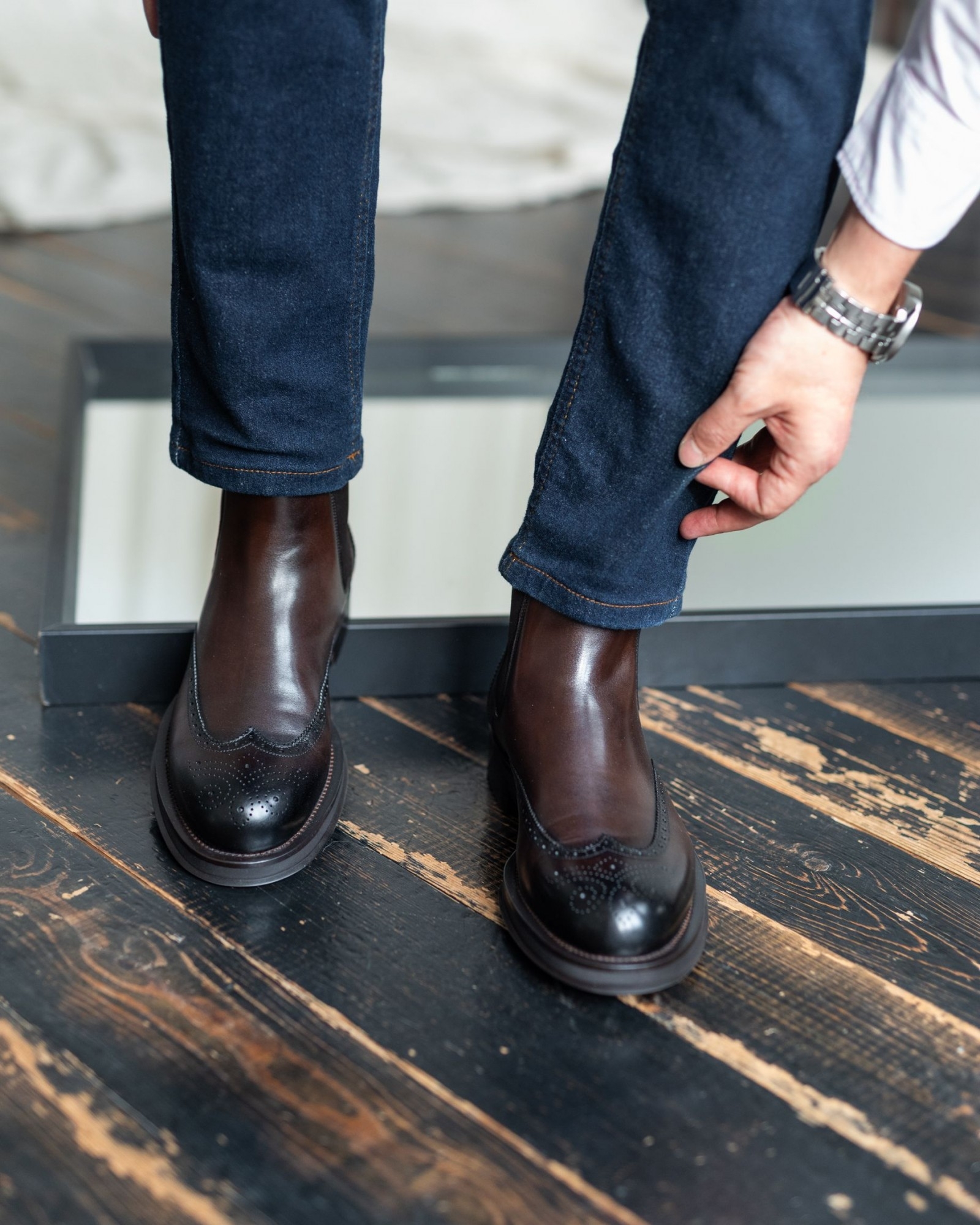 Эта модель сочетает элегантность Челси и аккуратную декоративную перфорацию на носке в стиле брогов. Минималистичный силуэт остаётся сдержанным, а брогирование добавляет утончённый акцент и индивидуальность.