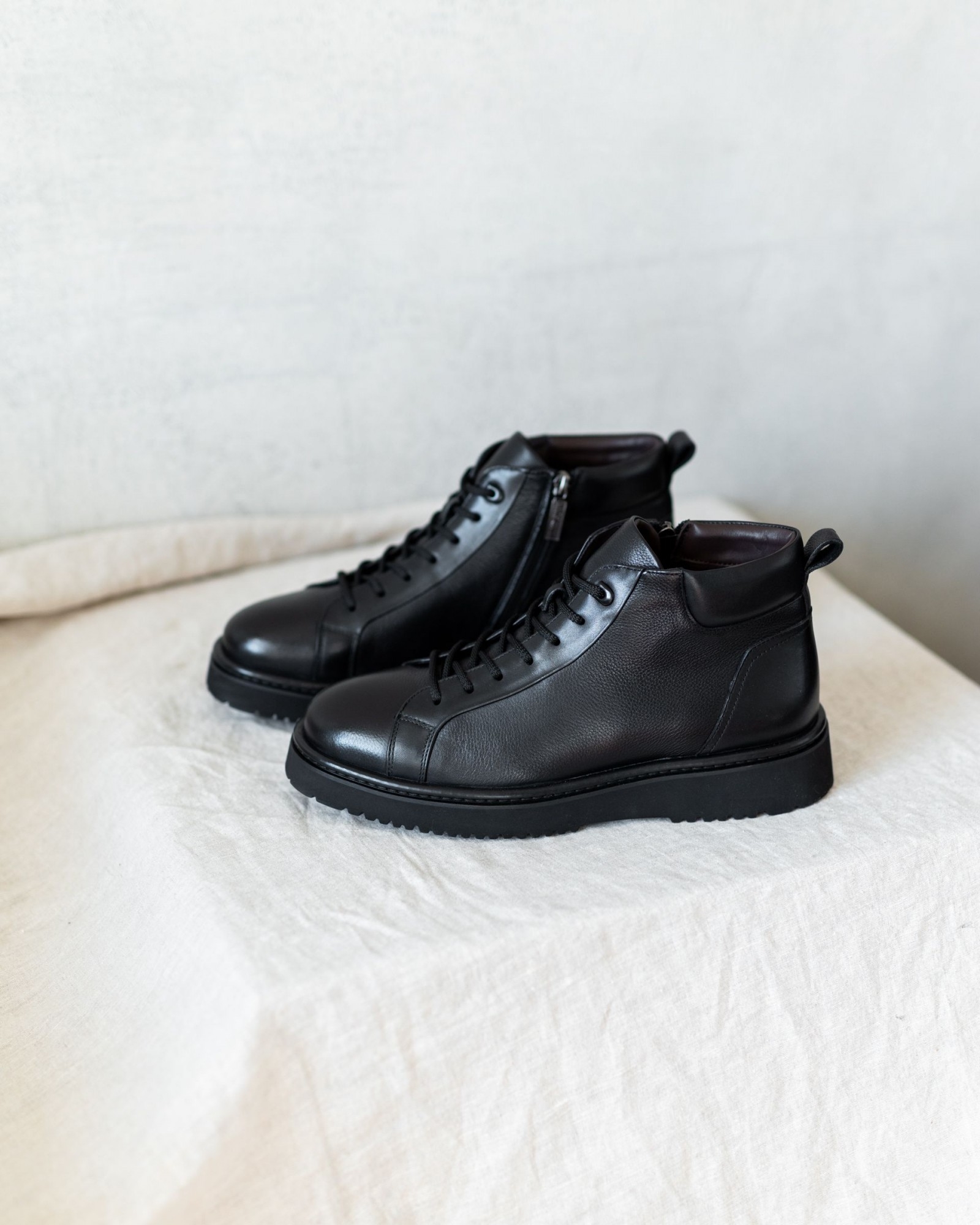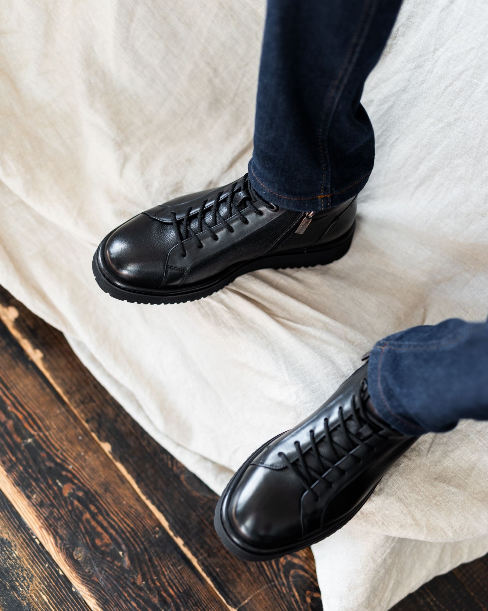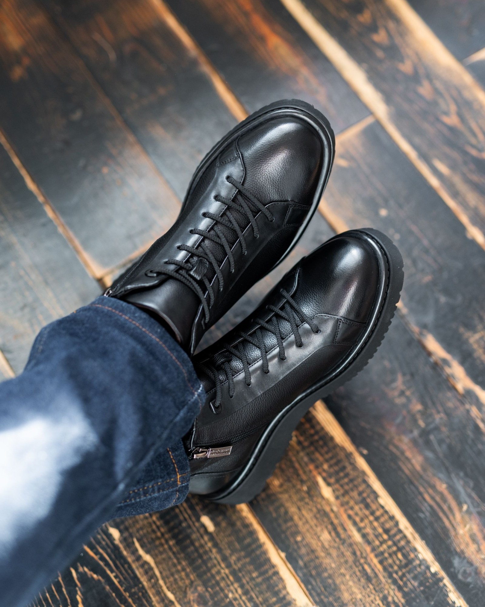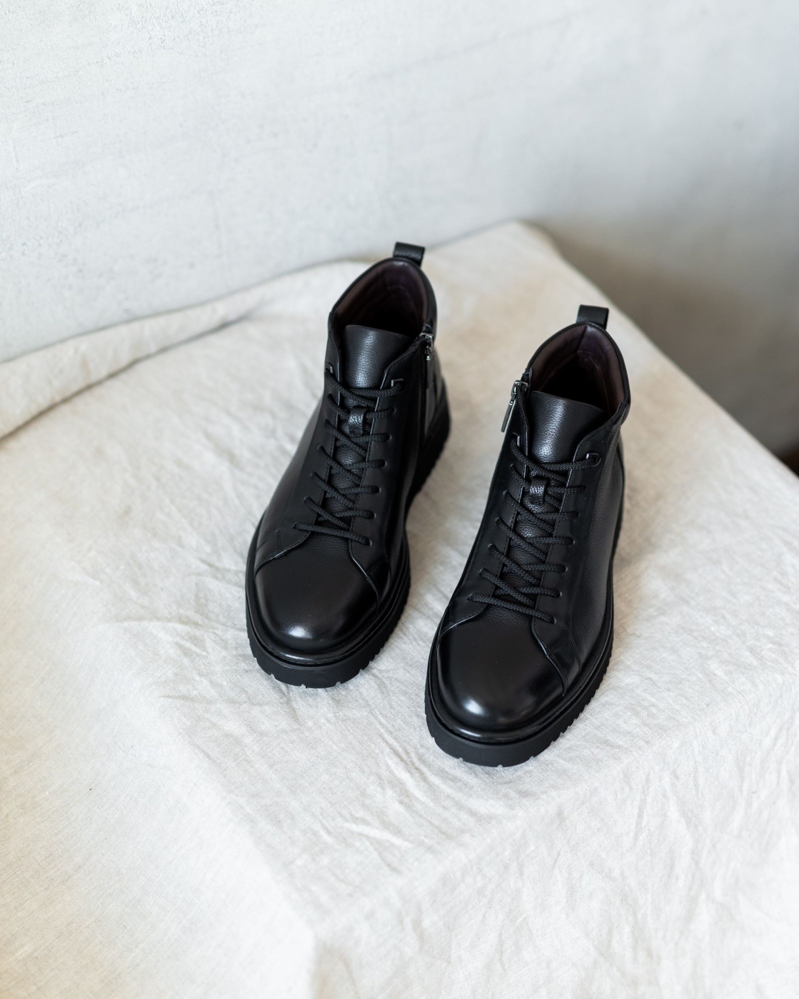 Эта модель представляет собой универсальные демисезонные ботинки на плоской толстой подошве. Верх выполнен из приятной чёрной кожи, что придаёт обуви элегантный и современный вид. Толстая, но лёгкая подошва обеспечивает надёжную амортизацию и комфорт при длительной носке.