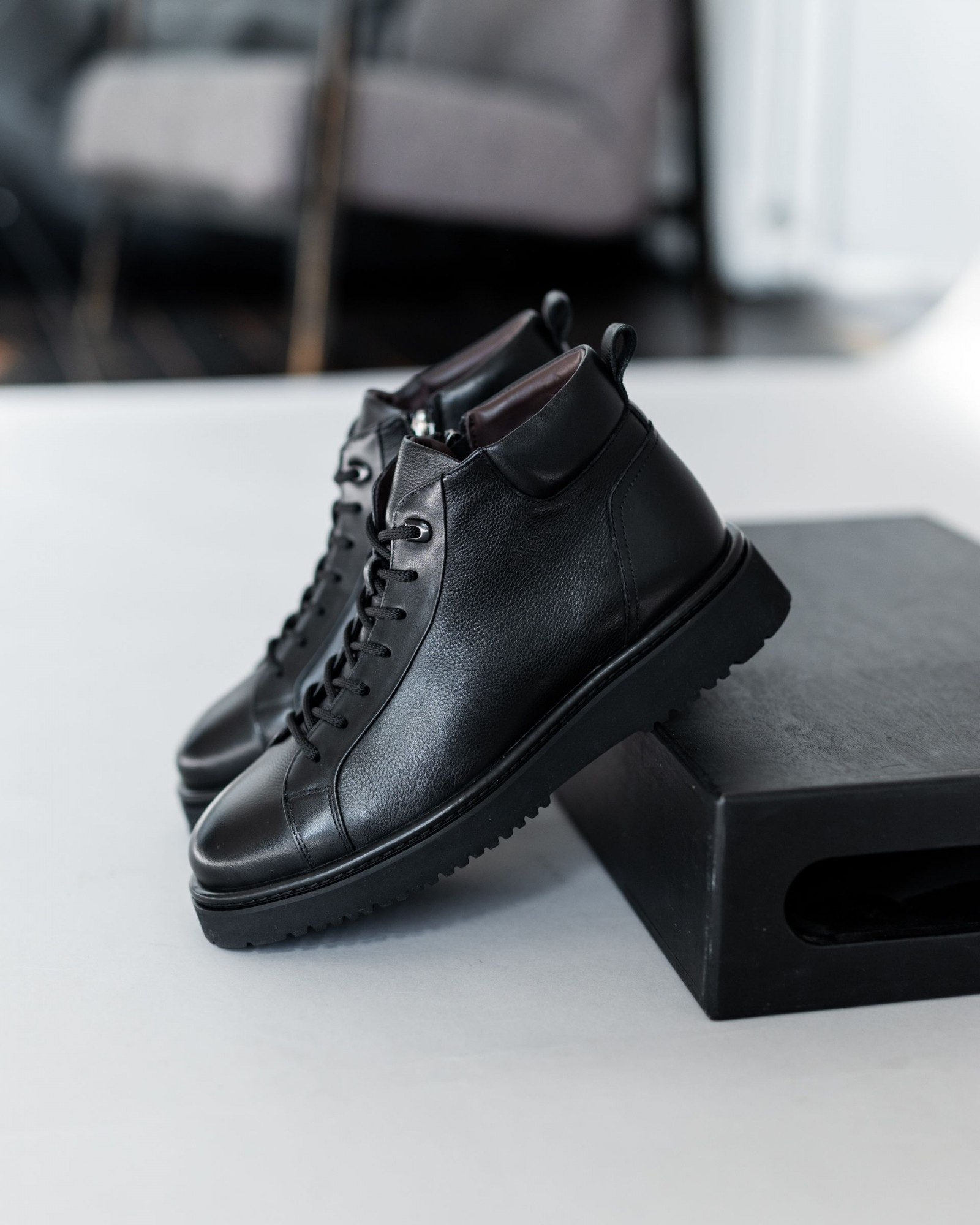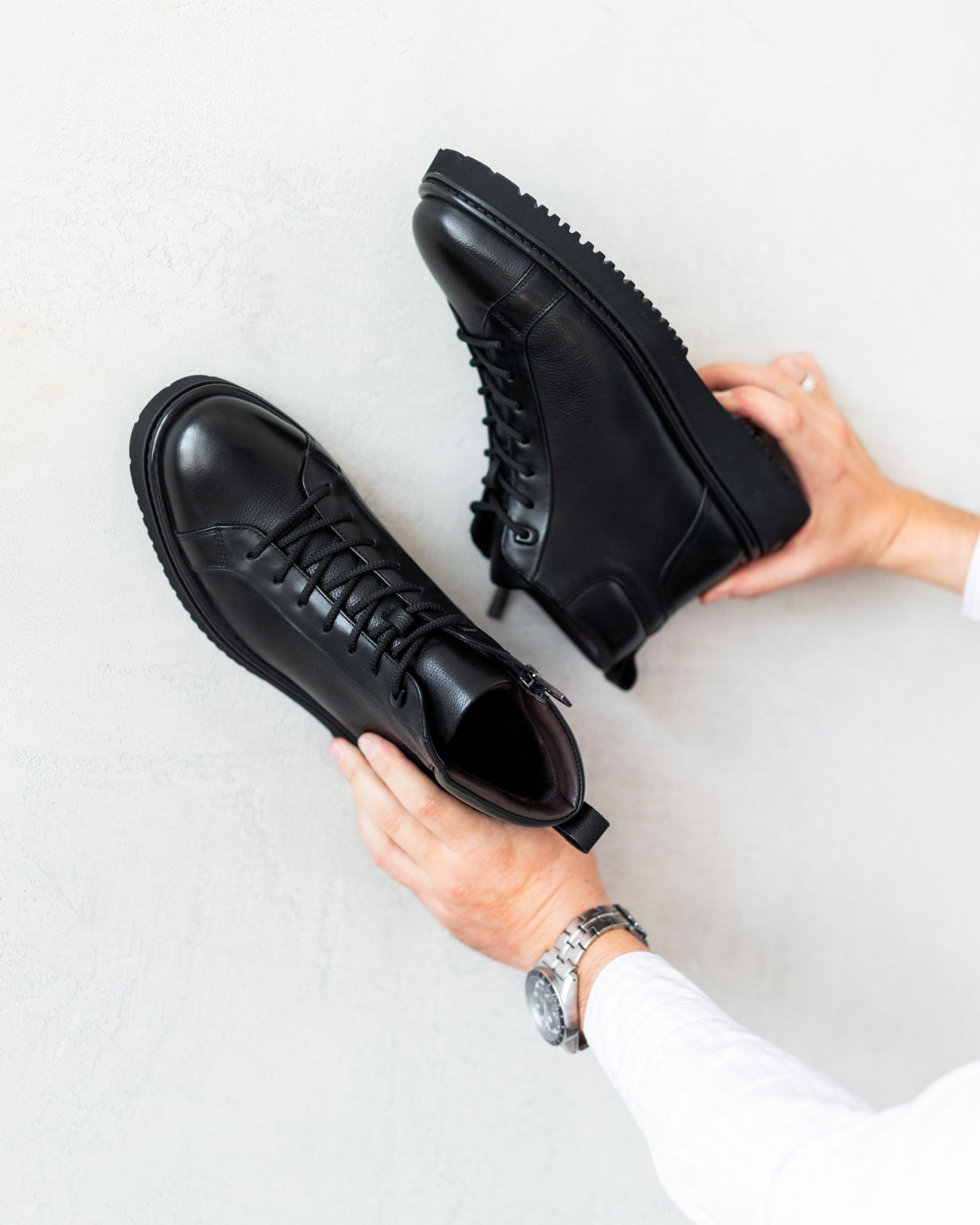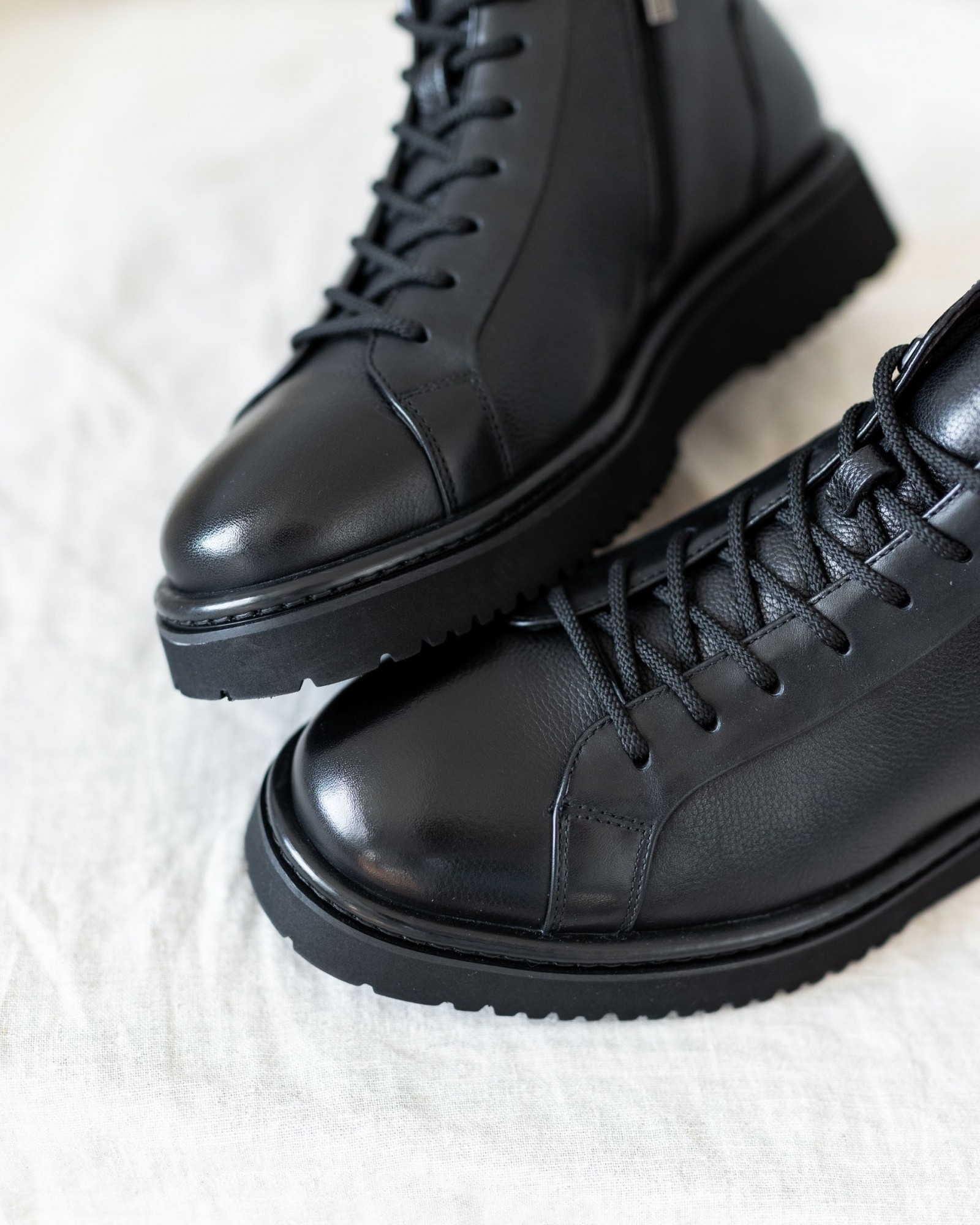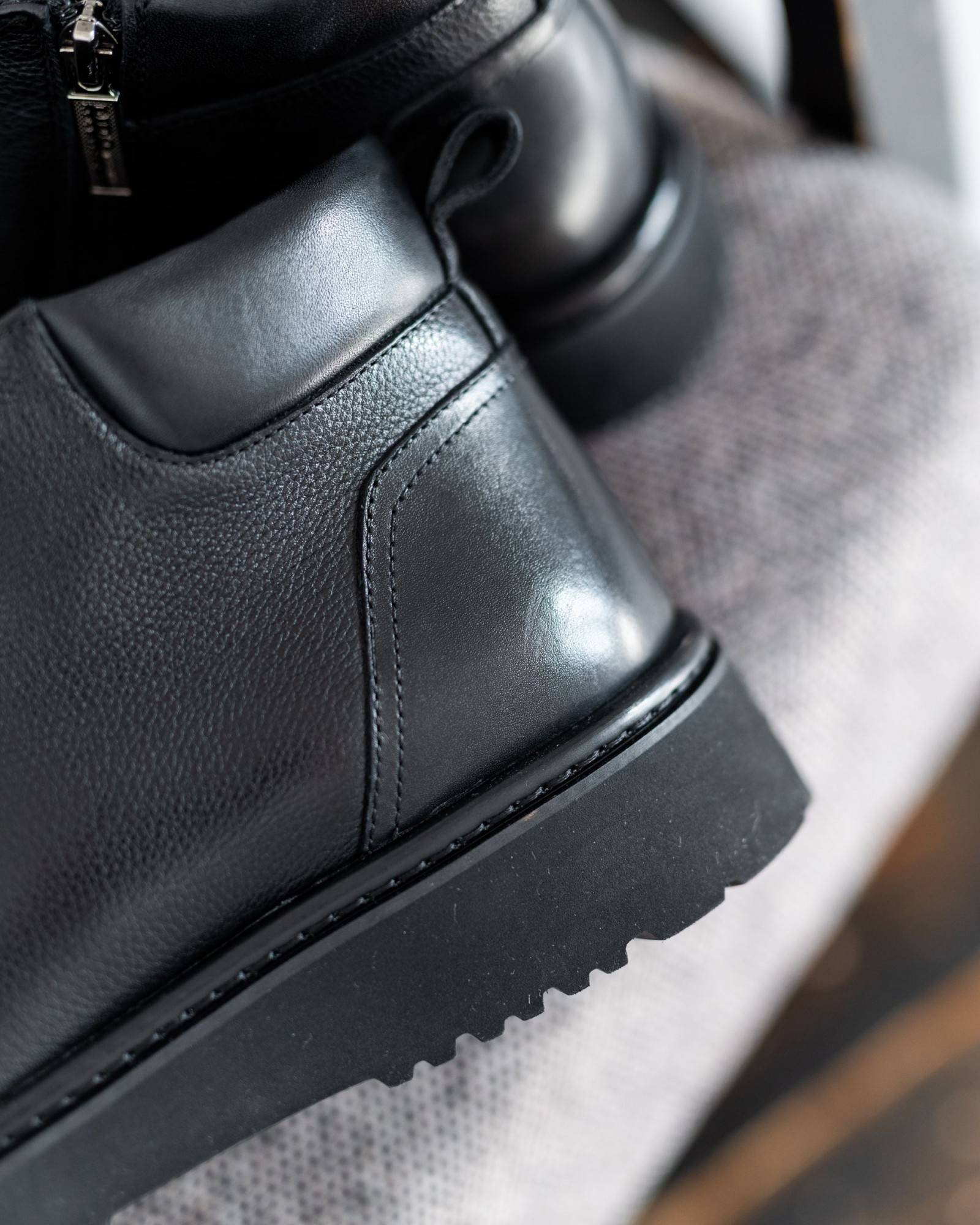 Эта модель представляет собой универсальные демисезонные ботинки на плоской толстой подошве. Верх выполнен из приятной чёрной кожи, что придаёт обуви элегантный и современный вид. Толстая, но лёгкая подошва обеспечивает надёжную амортизацию и комфорт при длительной носке.