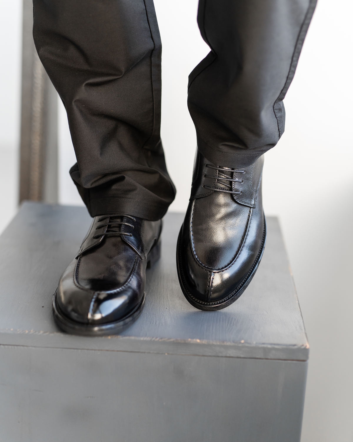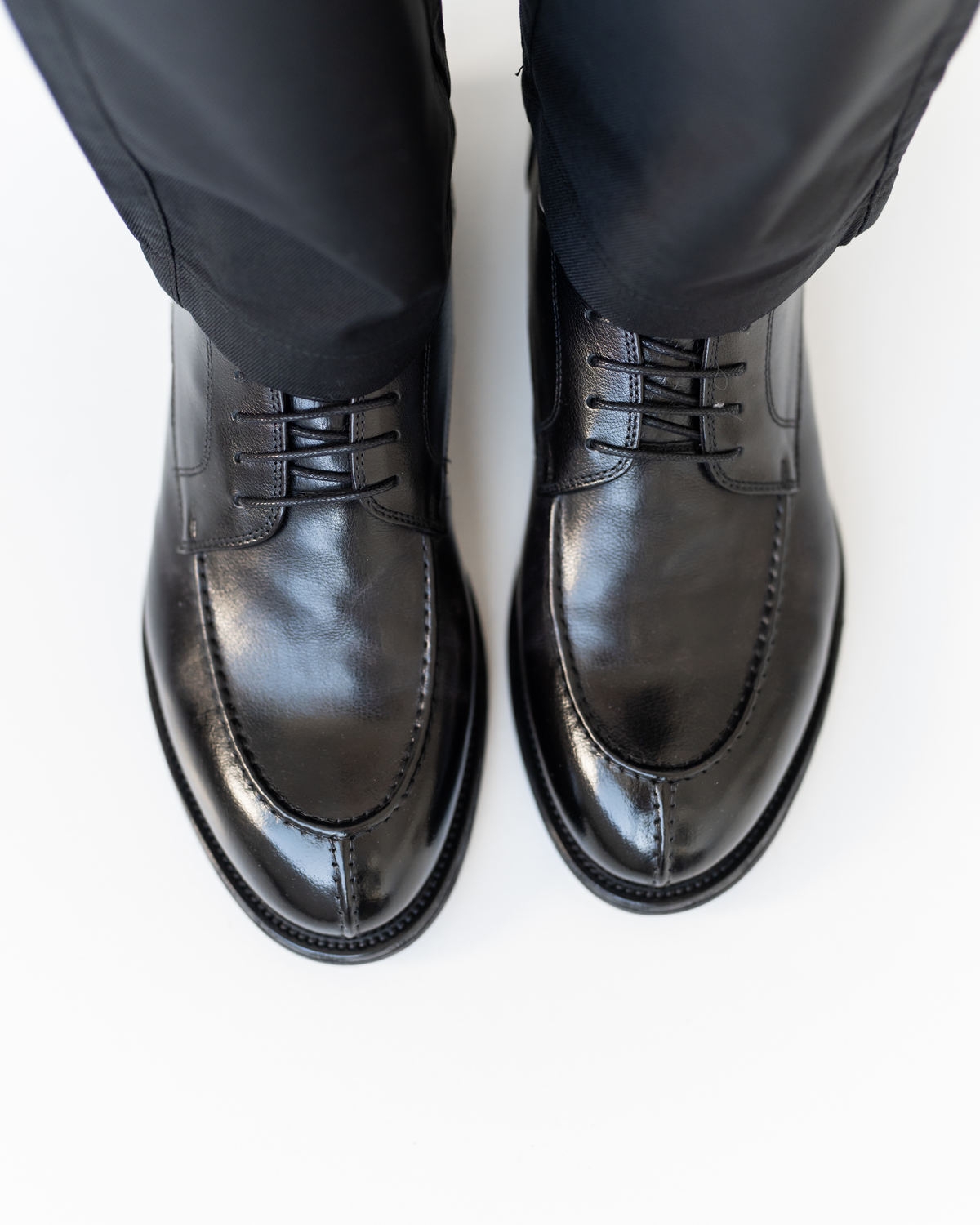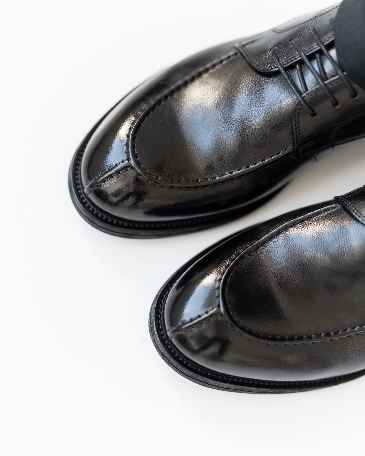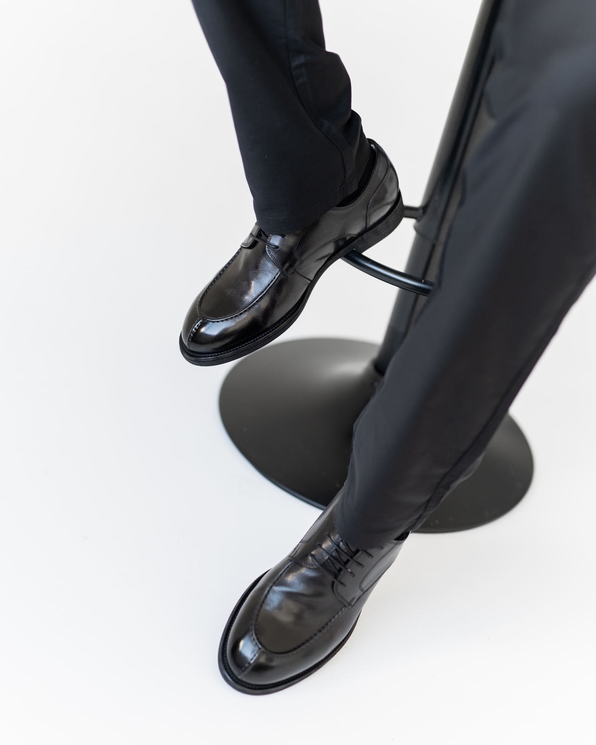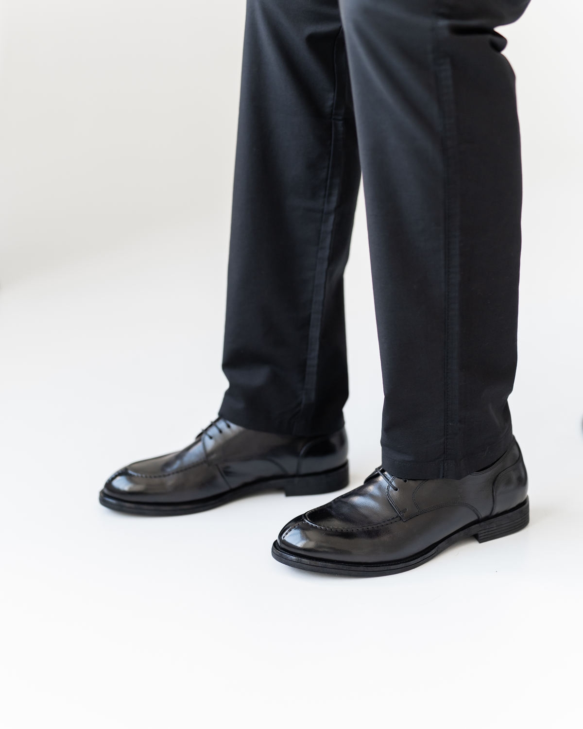 Эта модель построена на продуманной колодке с классическим силуэтом Derby, но с выразительными дизайнерскими акцентами: шов «от лоферов» на носке и дополнительный декоративный шов на передней части создают объём и характер. Верх выполнен из глянцевой чёрной кожи премиального качества, которая красиво отражает свет и подчёркивает силуэт.