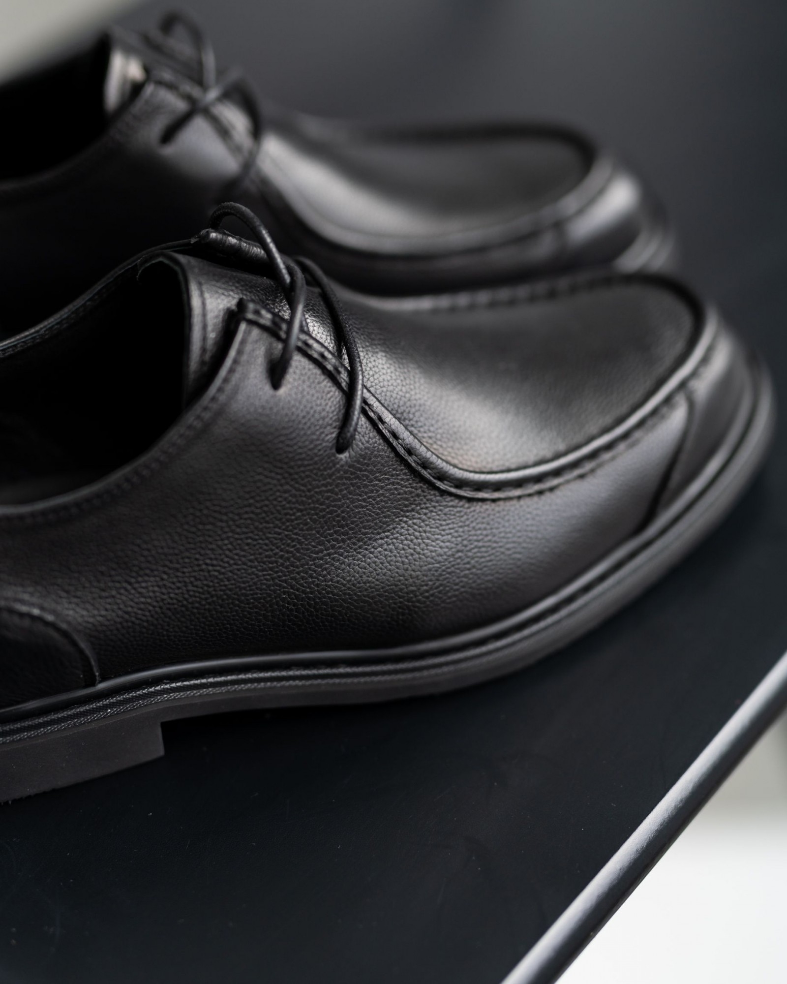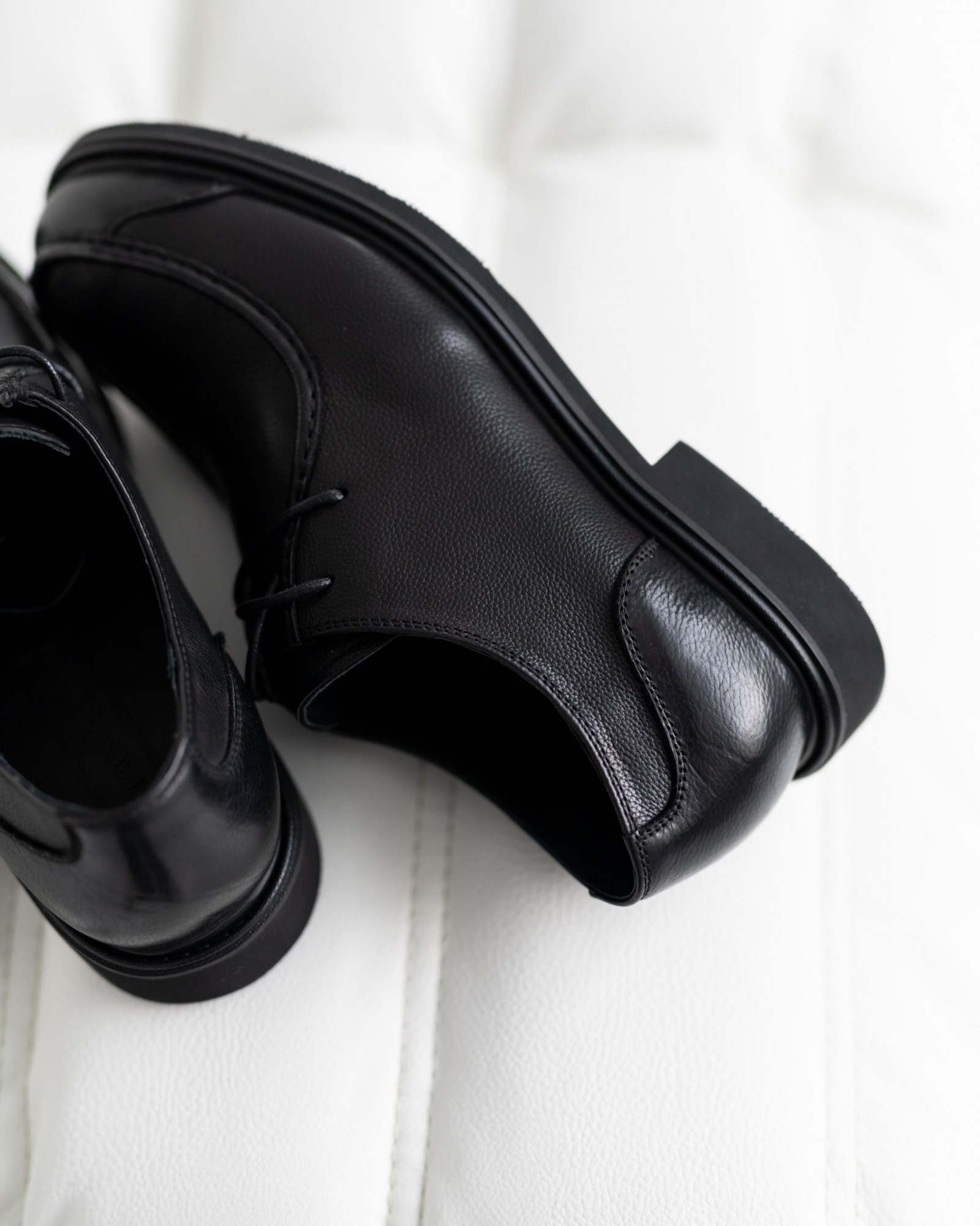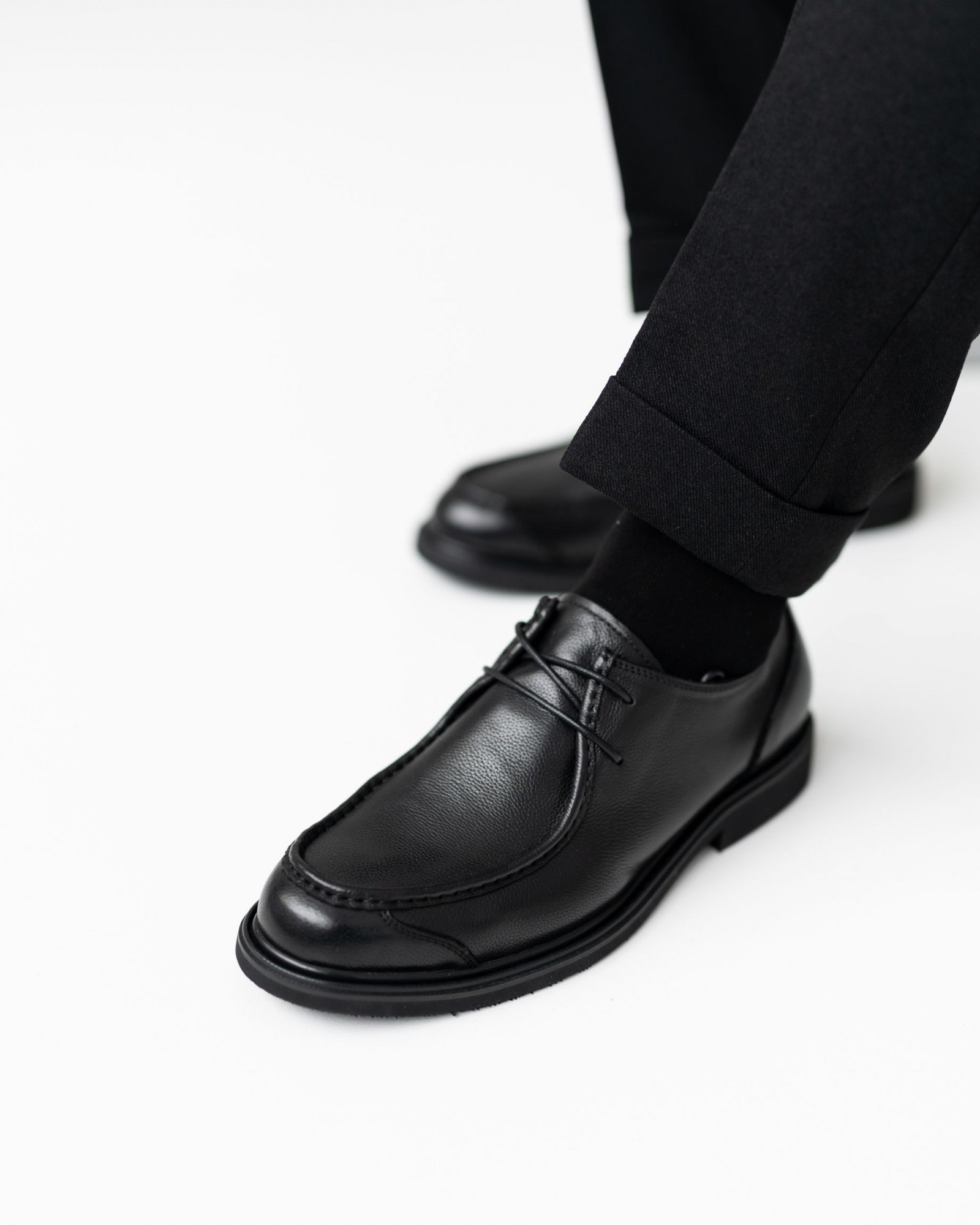 Элегантные классические туфли с элементами лоферов, сочетающие в себе сдержанность и стиль. Модель выполнена из мягкой чёрной кожи с гладкой, слегка матовой текстурой, которая подчёркивает её премиальность. Аккуратная тонкая шнуровка обеспечивает идеальную посадку по ноге, а нестандартная форма носка придаёт обуви изысканный, современный вид.