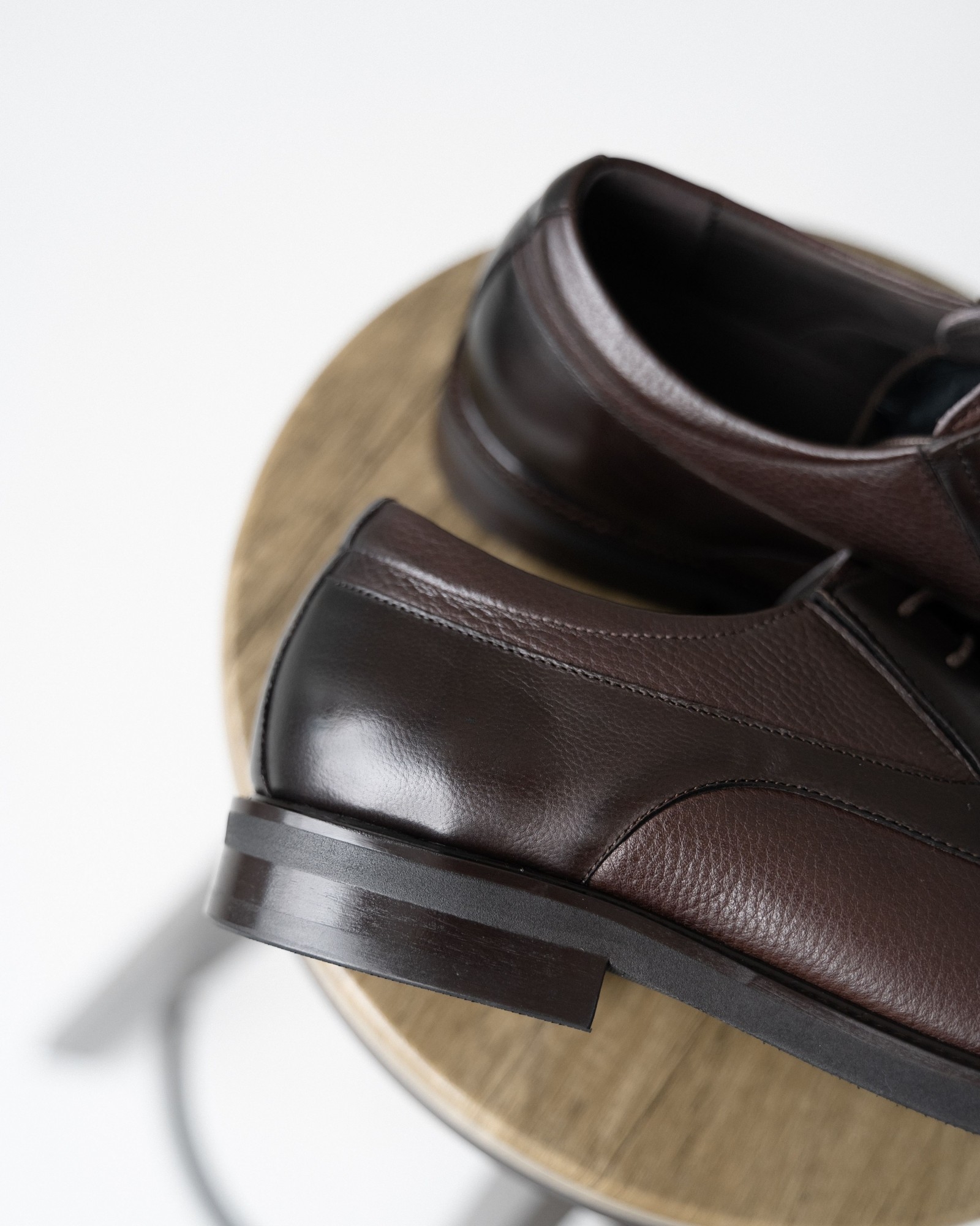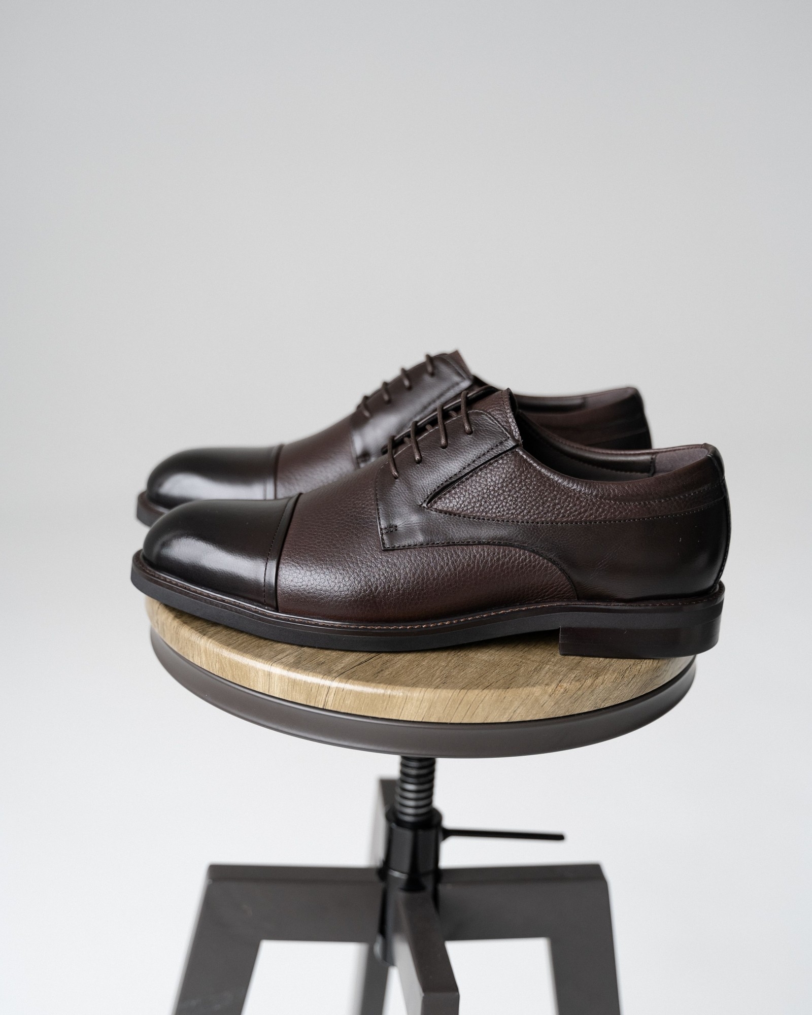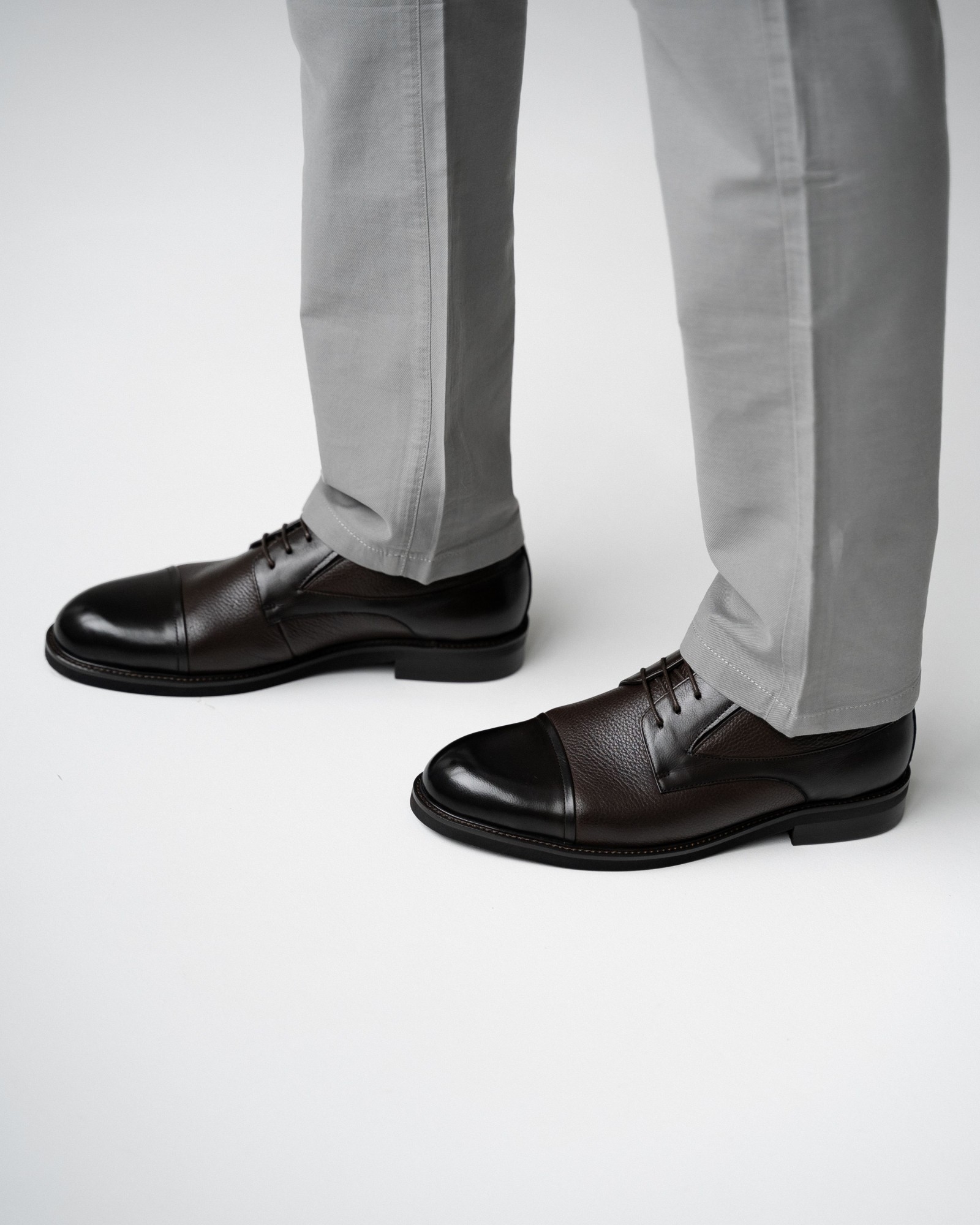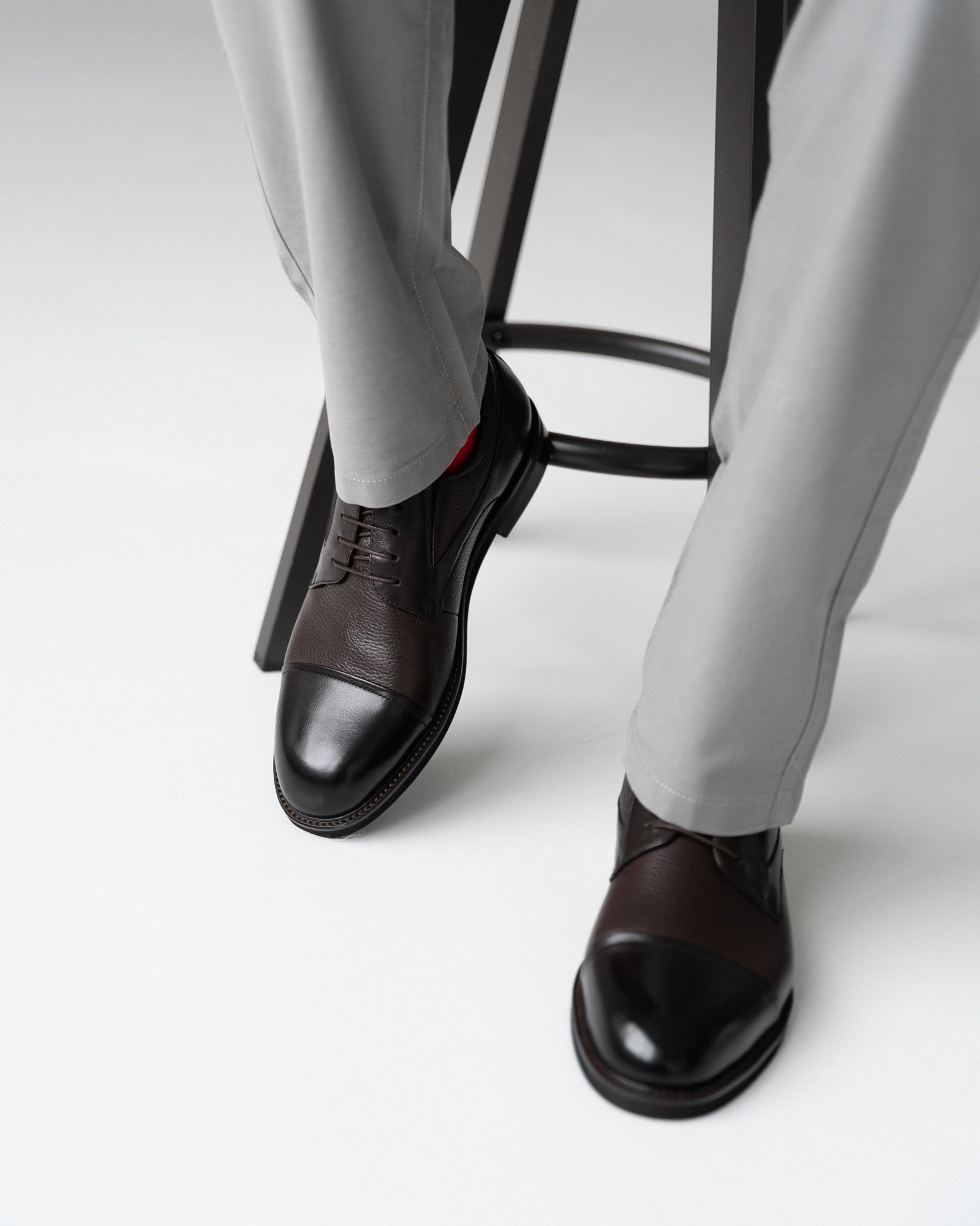 Модель выполнена из двух видов кожи: шлифованная — на носке для выразительного блеска, и мягкая структурная — в зоне изгиба для максимального комфорта. Элегантная шнуровка дополнена незаметной резинкой на подъёме, чтобы обувь легко адаптировалась к движению стопы. Универсальная пара, сочетающая строгость и удобство.