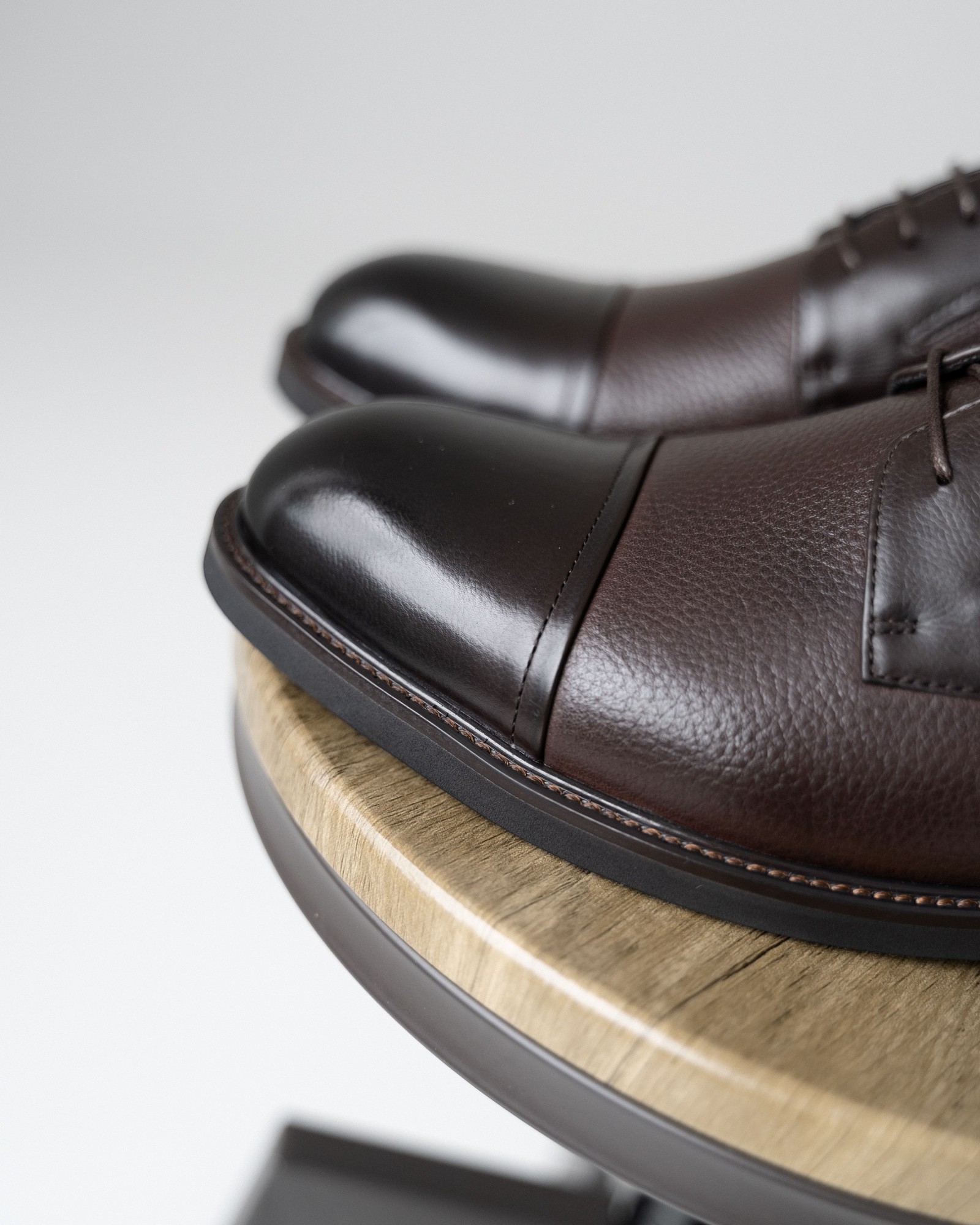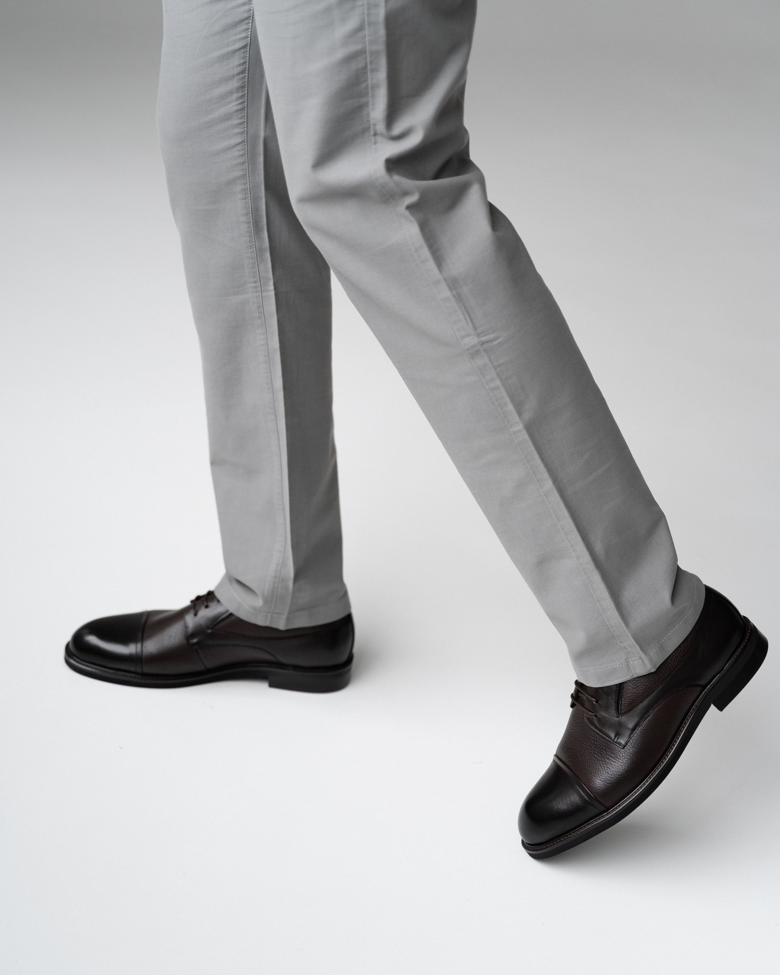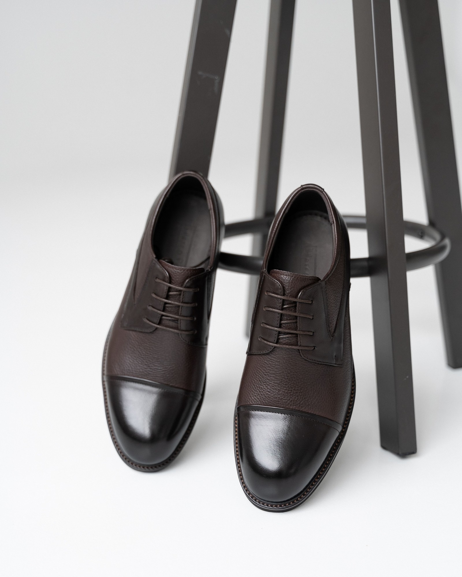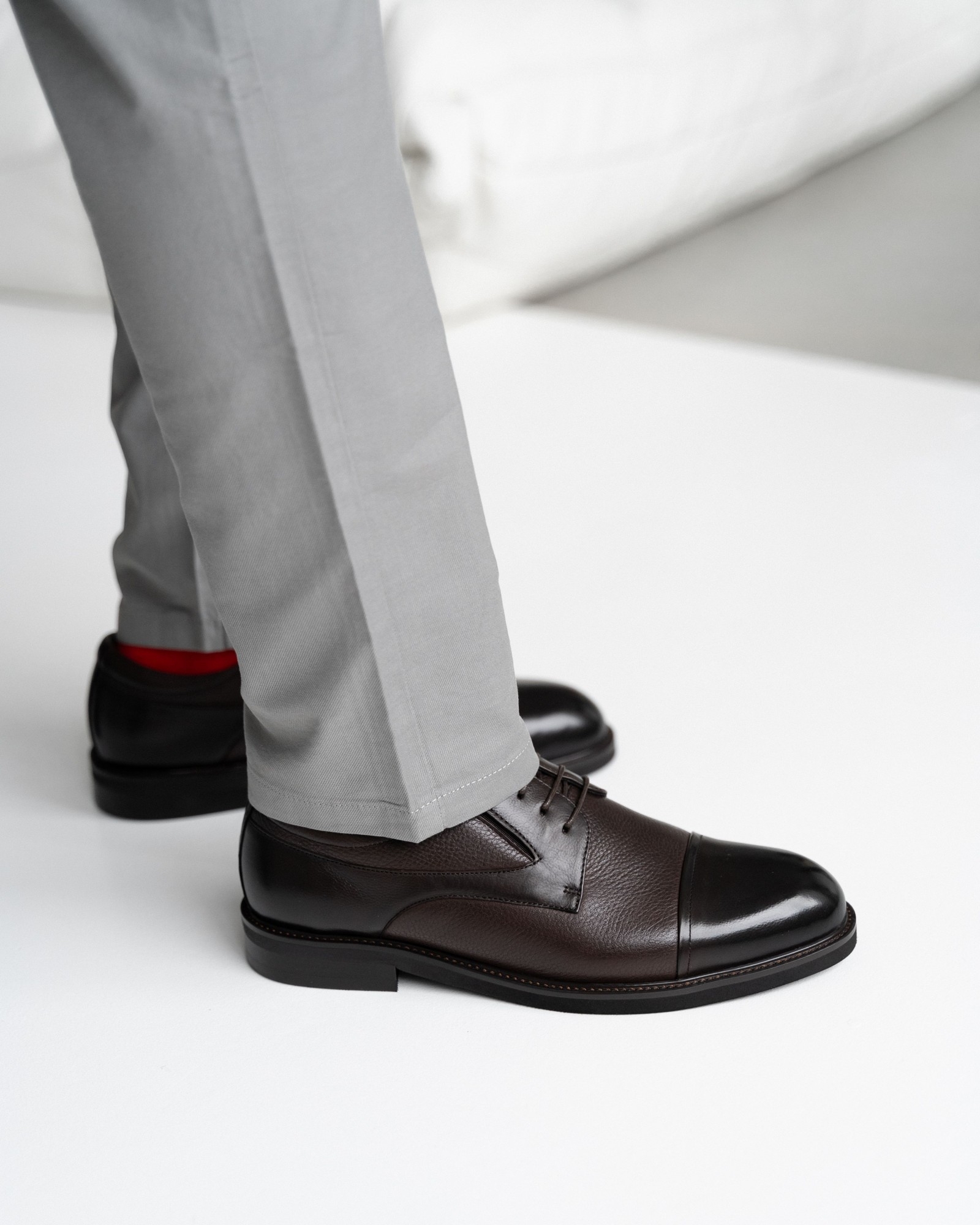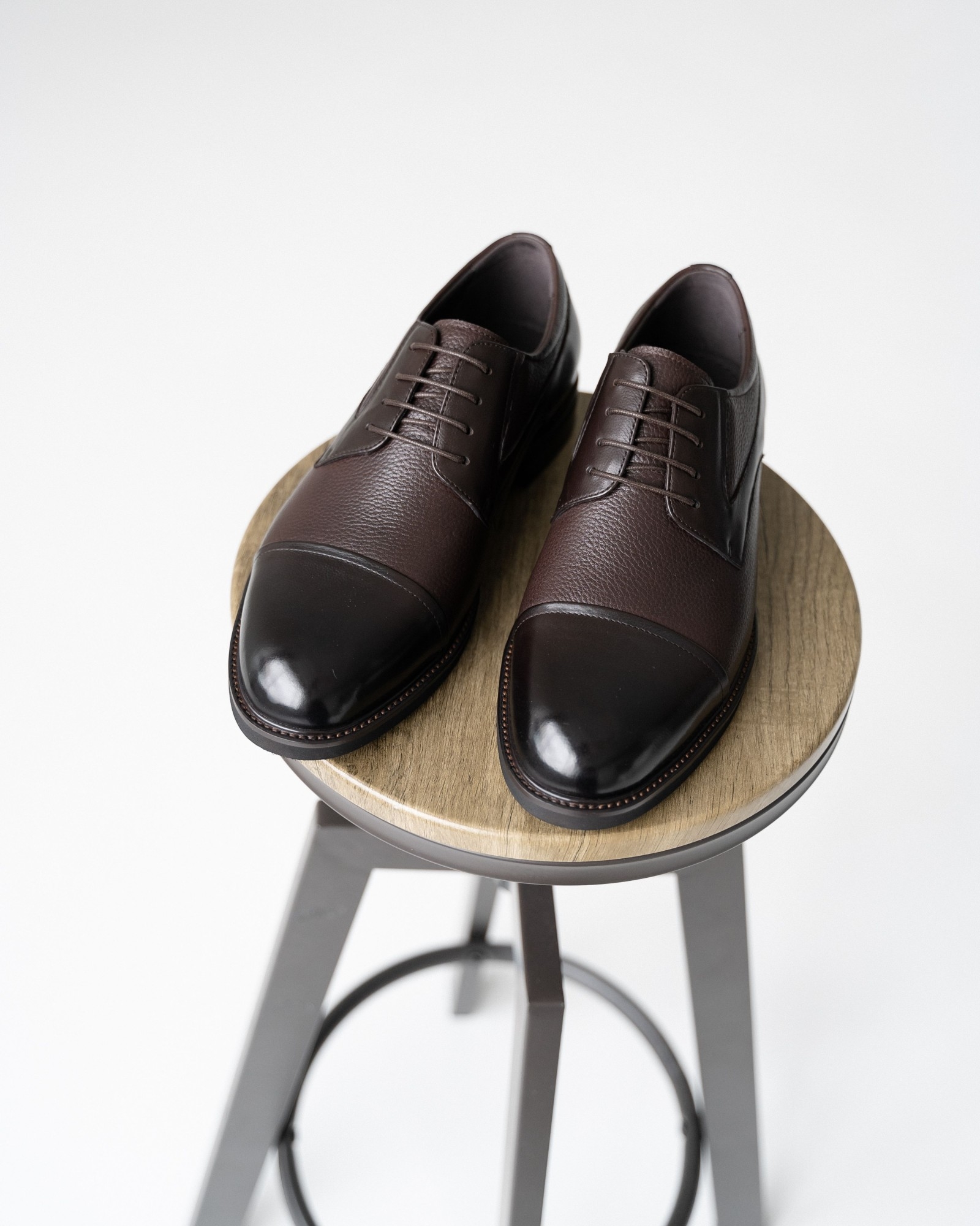 Модель выполнена из двух видов кожи: шлифованная — на носке для выразительного блеска, и мягкая структурная — в зоне изгиба для максимального комфорта. Элегантная шнуровка дополнена незаметной резинкой на подъёме, чтобы обувь легко адаптировалась к движению стопы. Универсальная пара, сочетающая строгость и удобство.