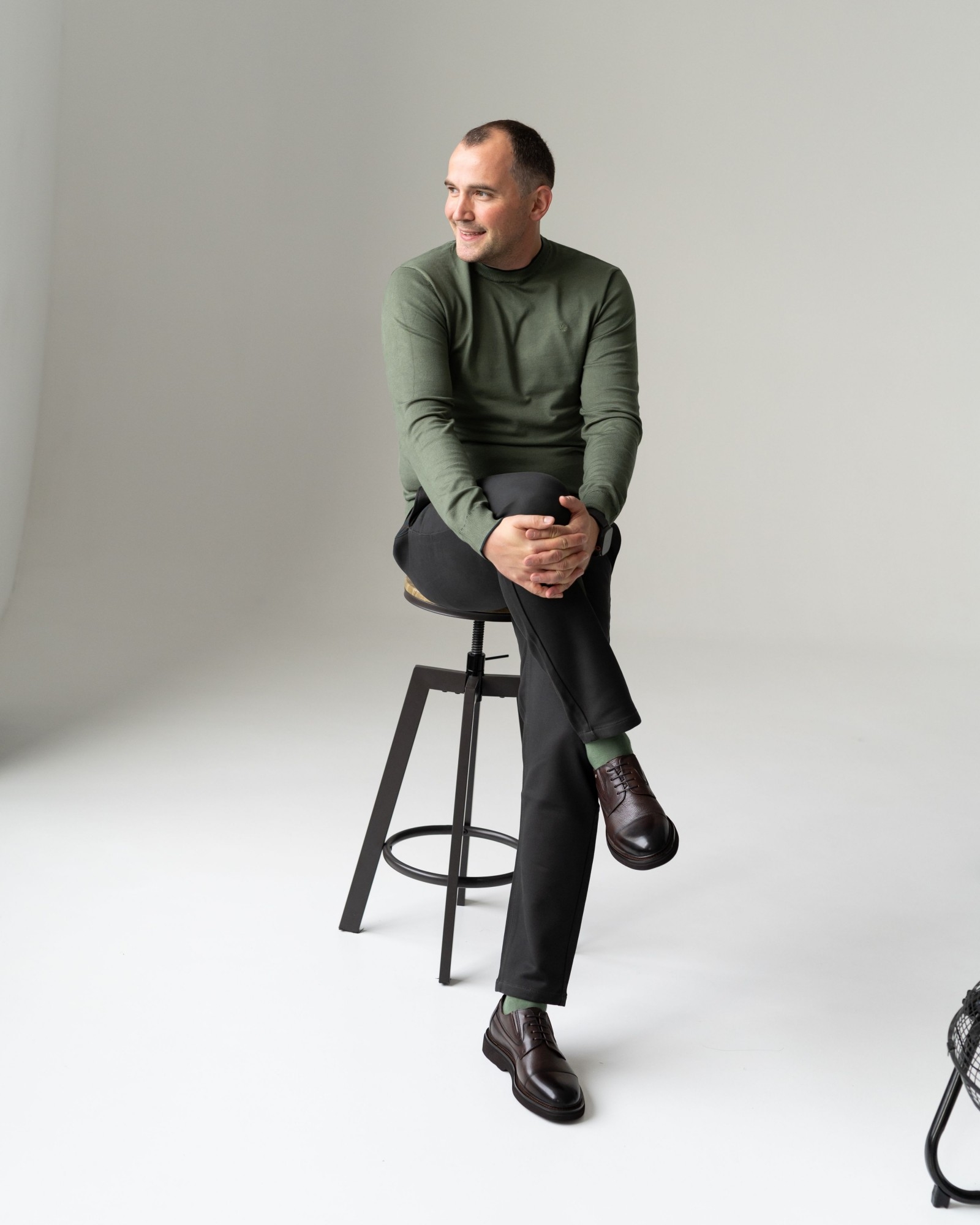 3. Тёмно-зелёные чиносы, белая рубашка и коричневый жилет из шерсти — образ с академическим шармом.