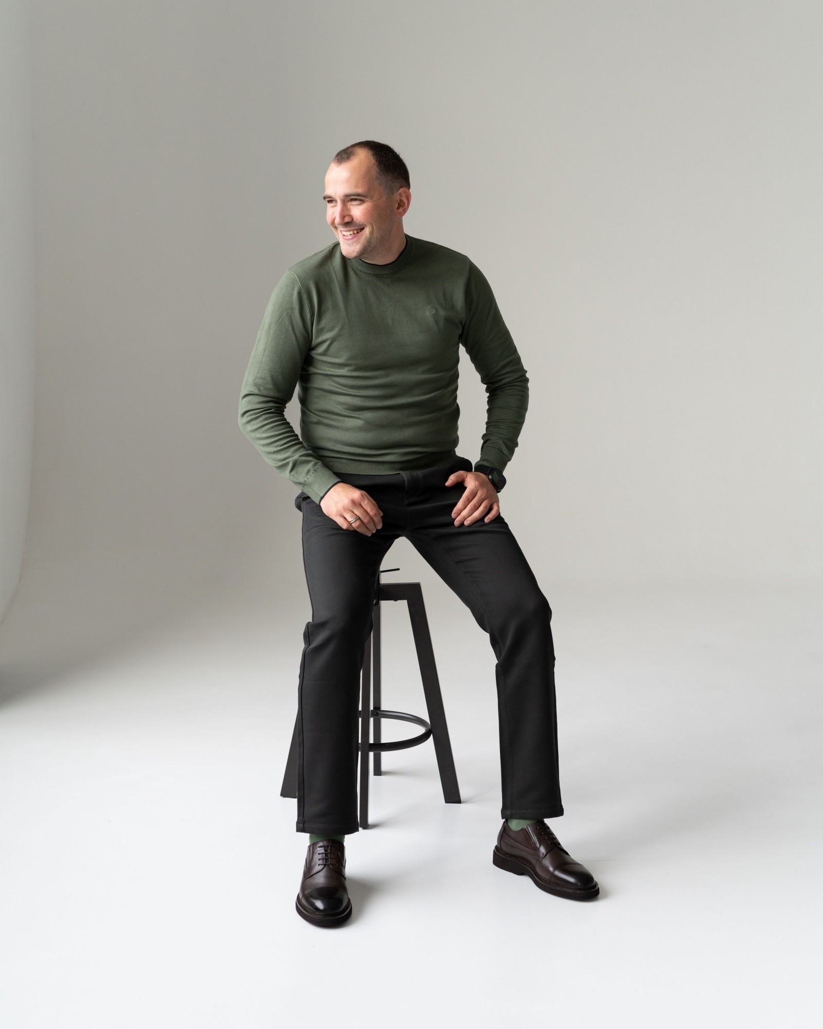 1. Светло-серые брюки, тёмно-синий шерстяной пиджак и рубашка без галстука — спокойный, продуманный образ для дискуссий и встреч.