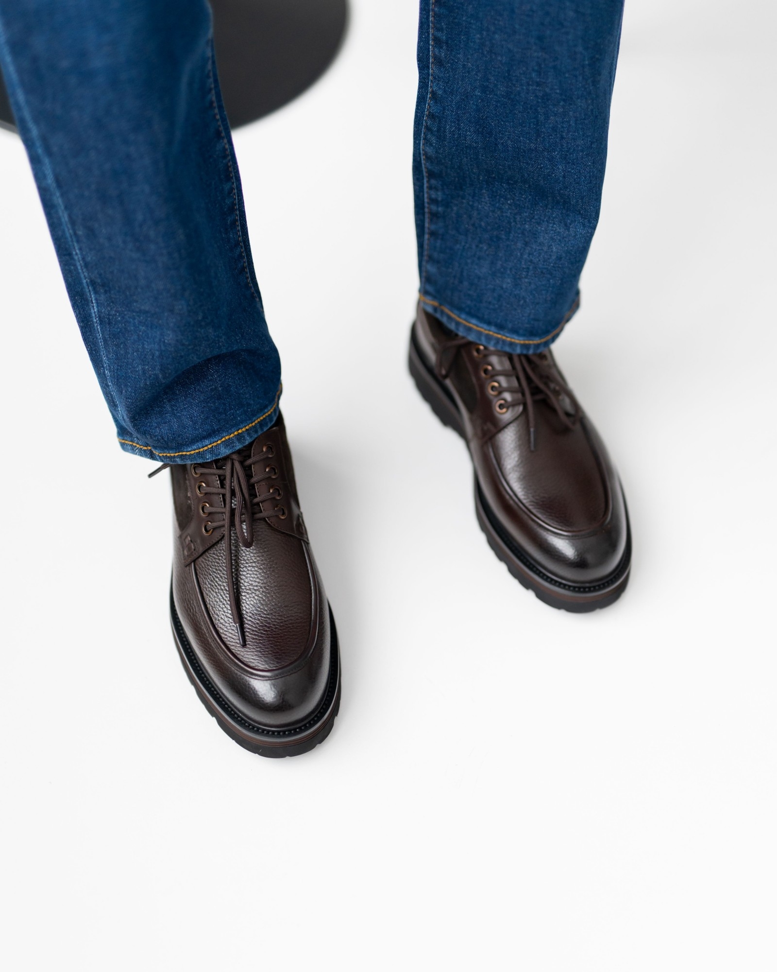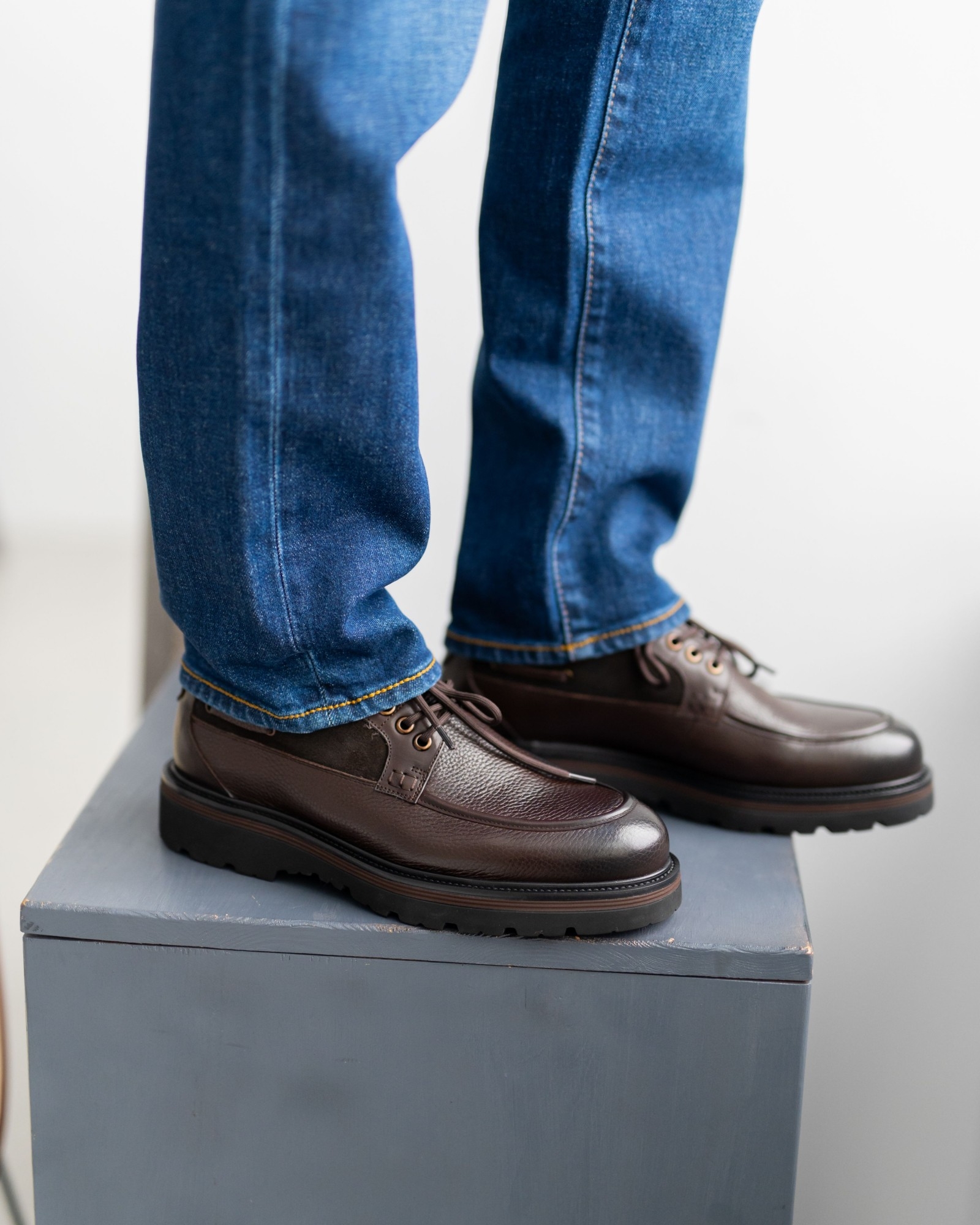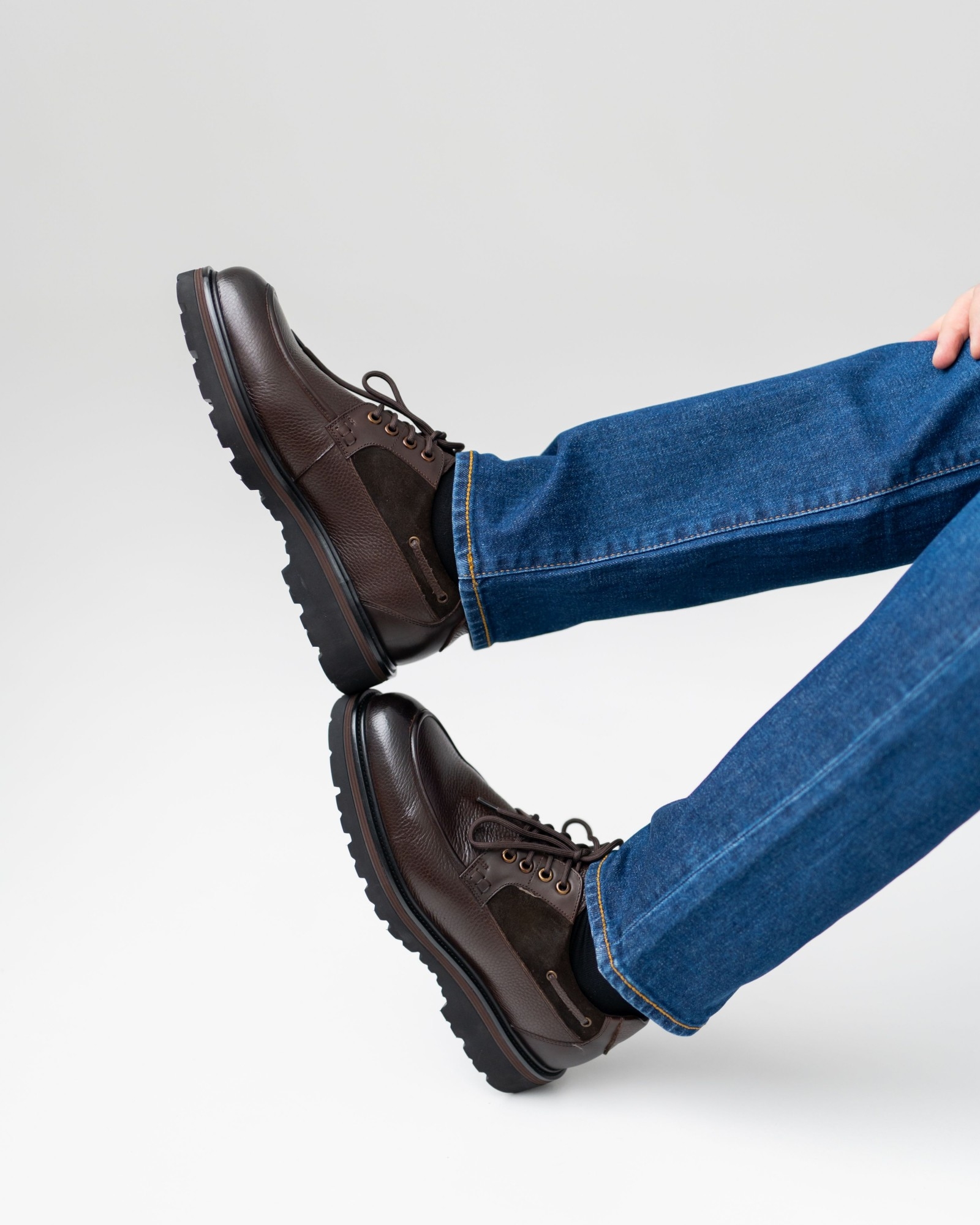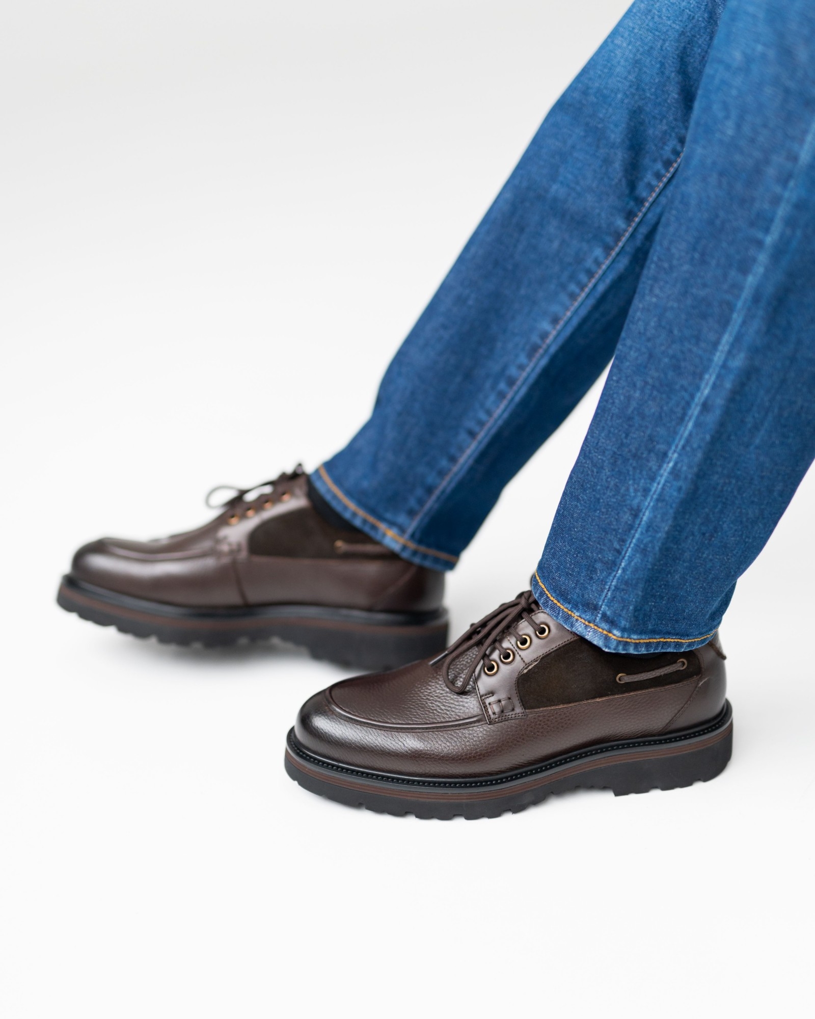 Современная классика, в которой коричневая кожа сочетается с аккуратными вставками замши, создавая выразительный, но сдержанный силуэт. Форма модели напоминает топсайдеры, однако общий характер уверенно тяготеет к классике — строгой, универсальной и актуальной в любой сезон. Мягкая посадка, устойчивое основание и сбалансированное сочетание фактур делают пару идеальным выбором для повседневного гардероба с акцентом на стиль и комфорт. Это обувь, которая легко вписывается в жизнь и работает на образ владельца, а не наоборот.