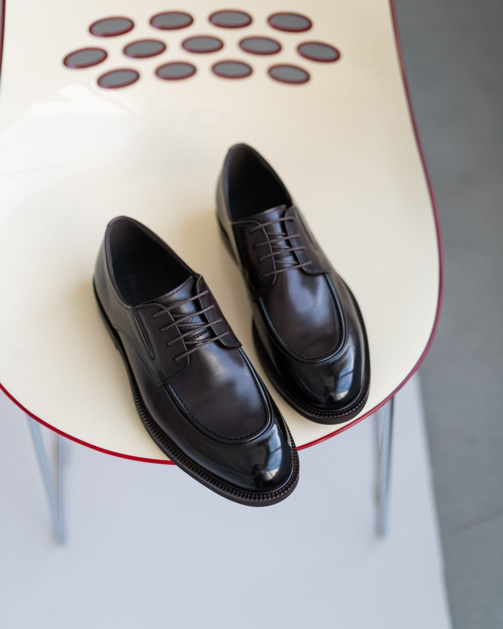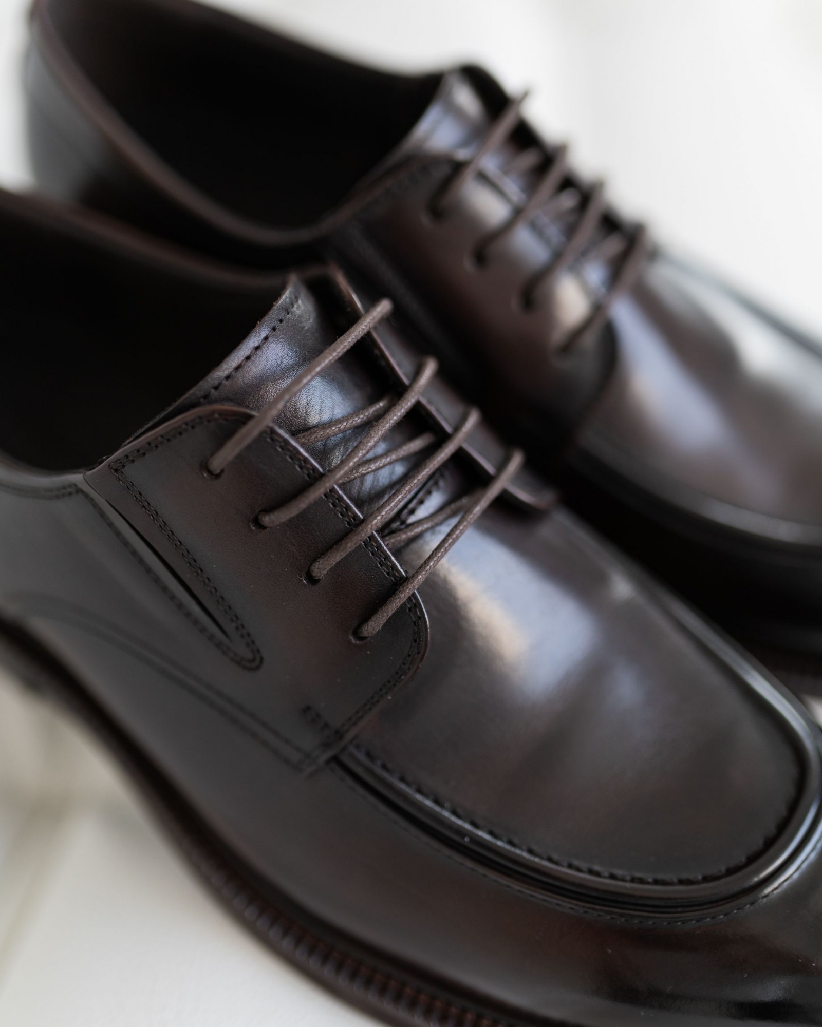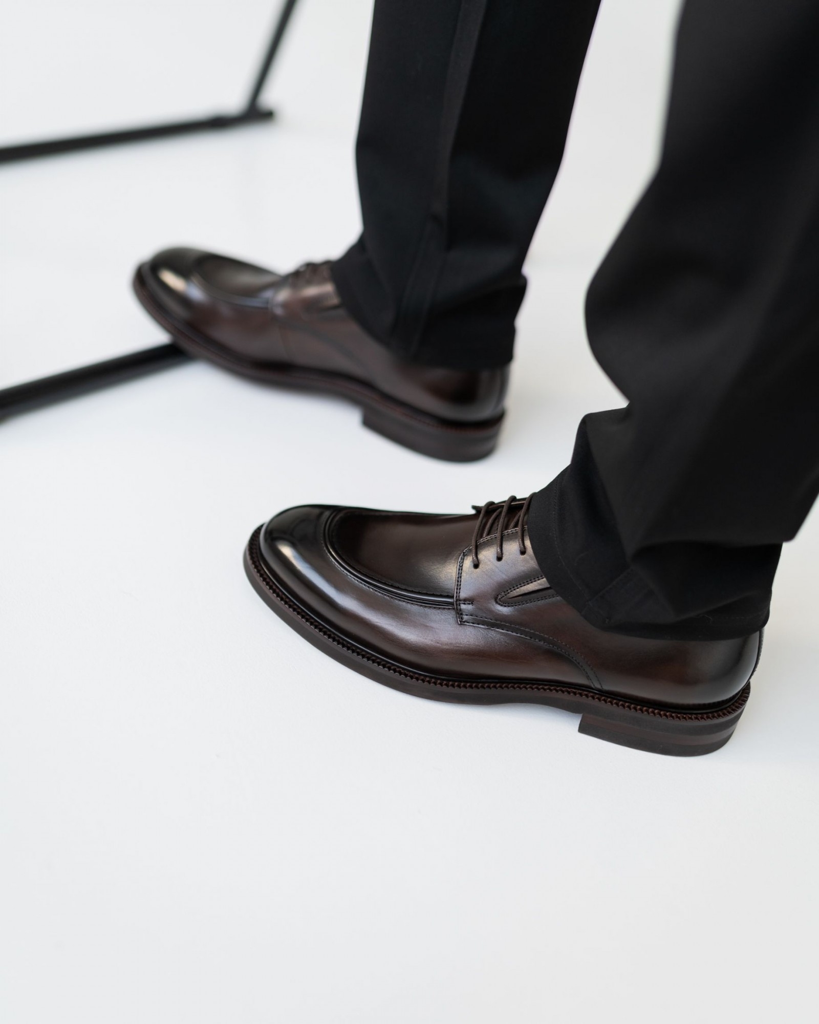 Дерби из коричневой шлифованной кожи с элегантным наполированным блеском. Чёткая линия шва на носке подчёркивает классический стиль, а утончённая шнуровка обеспечивает комфортную фиксацию. Гибкая подошва с дополнительным уплотнением гарантирует удобство при длительной носке. Отличный выбор для тех, кто ценит классику с современным характером.