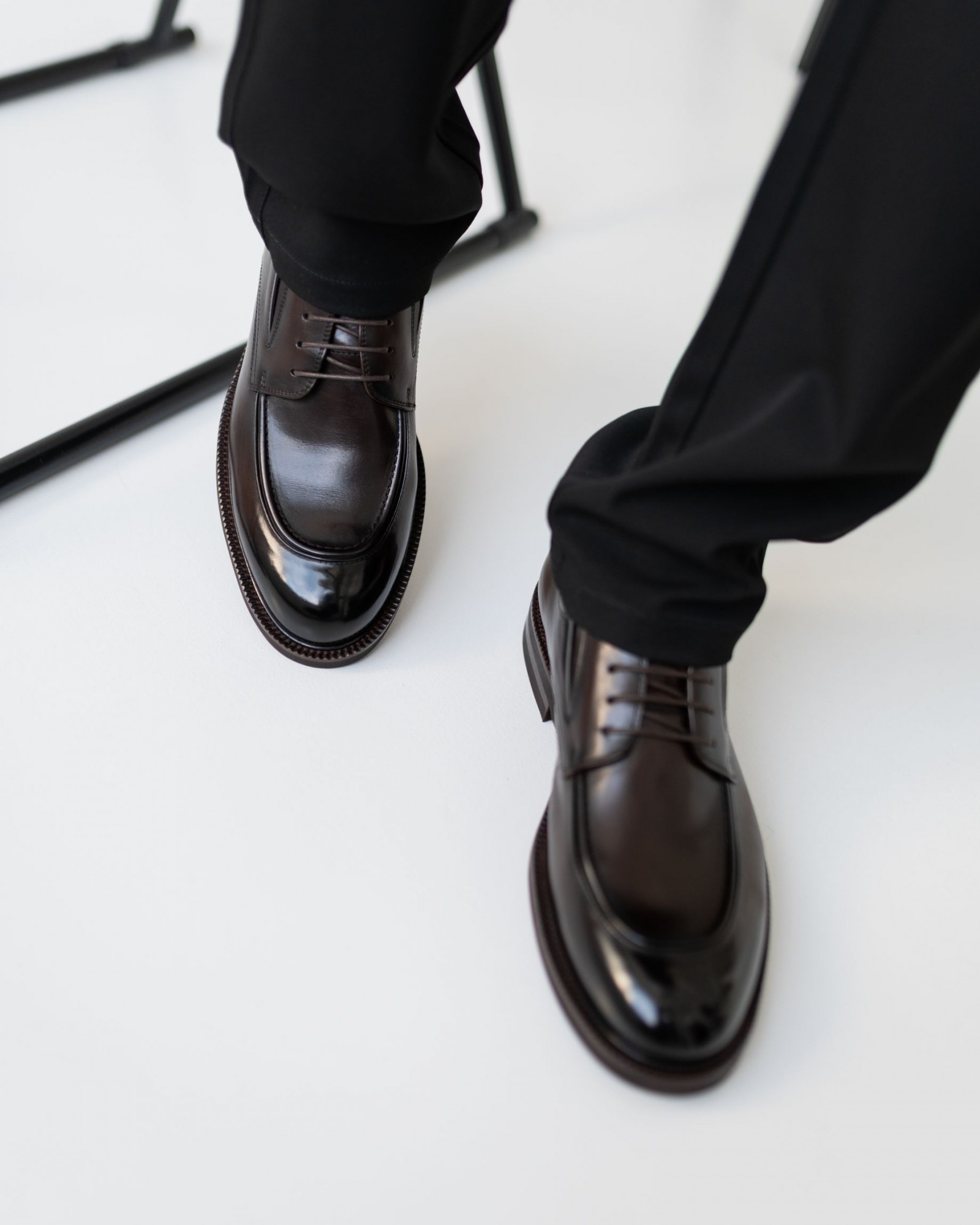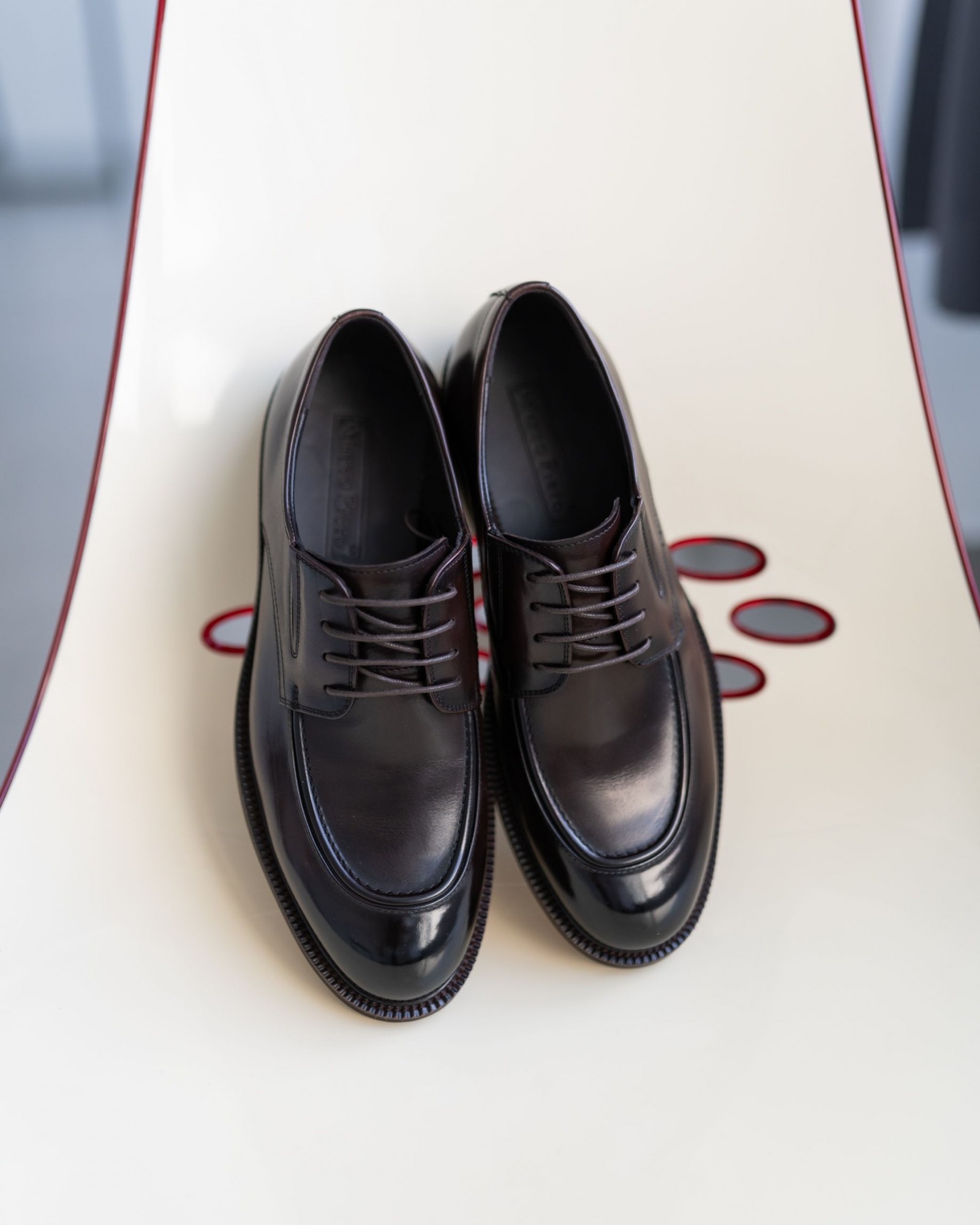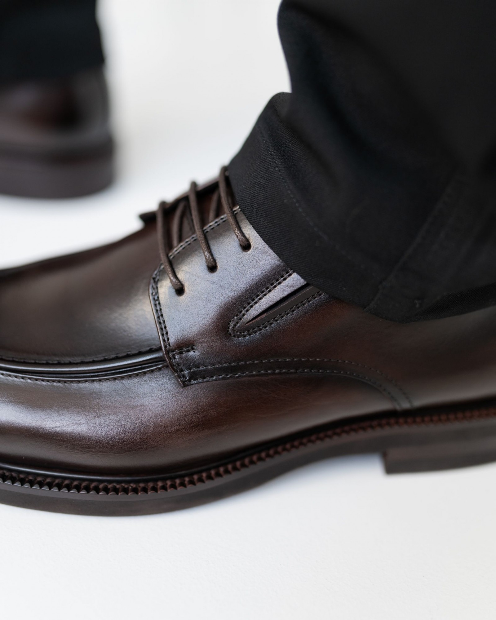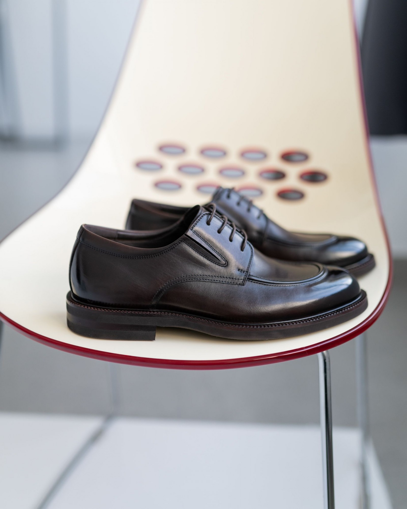 Дерби из коричневой шлифованной кожи с элегантным наполированным блеском. Чёткая линия шва на носке подчёркивает классический стиль, а утончённая шнуровка обеспечивает комфортную фиксацию. Гибкая подошва с дополнительным уплотнением гарантирует удобство при длительной носке. Отличный выбор для тех, кто ценит классику с современным характером.