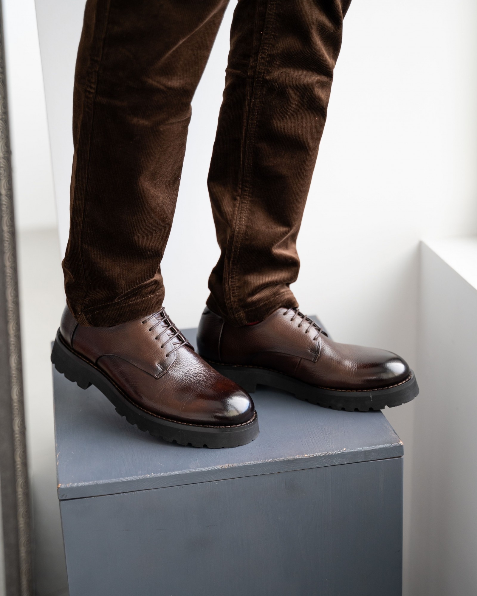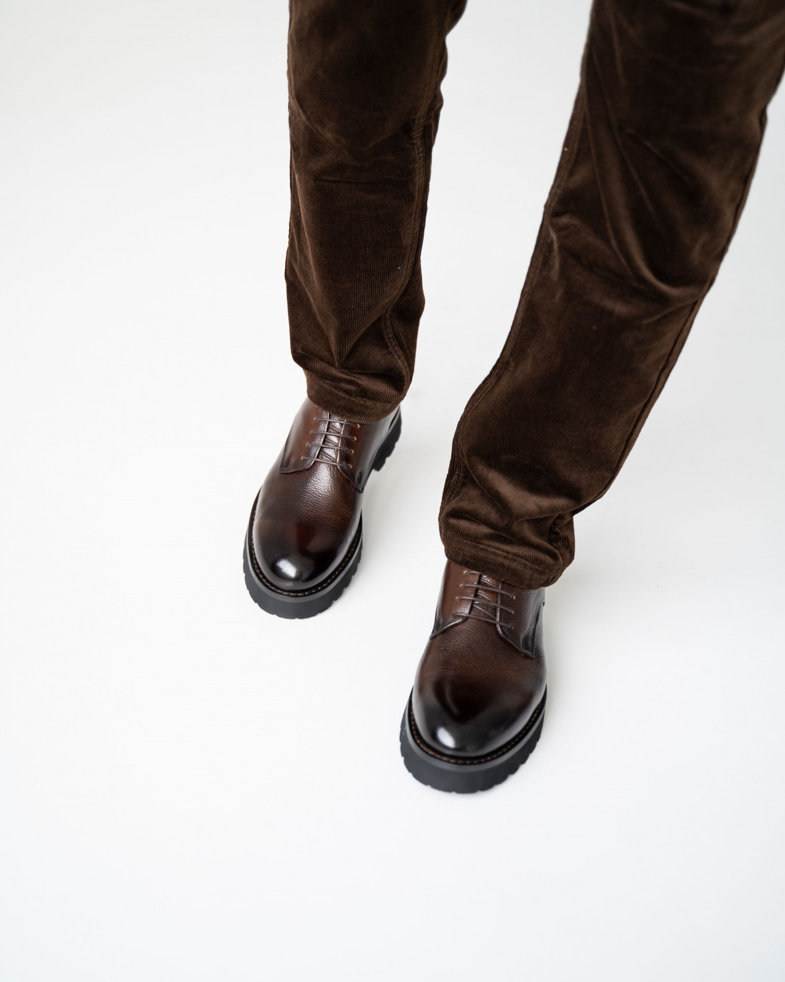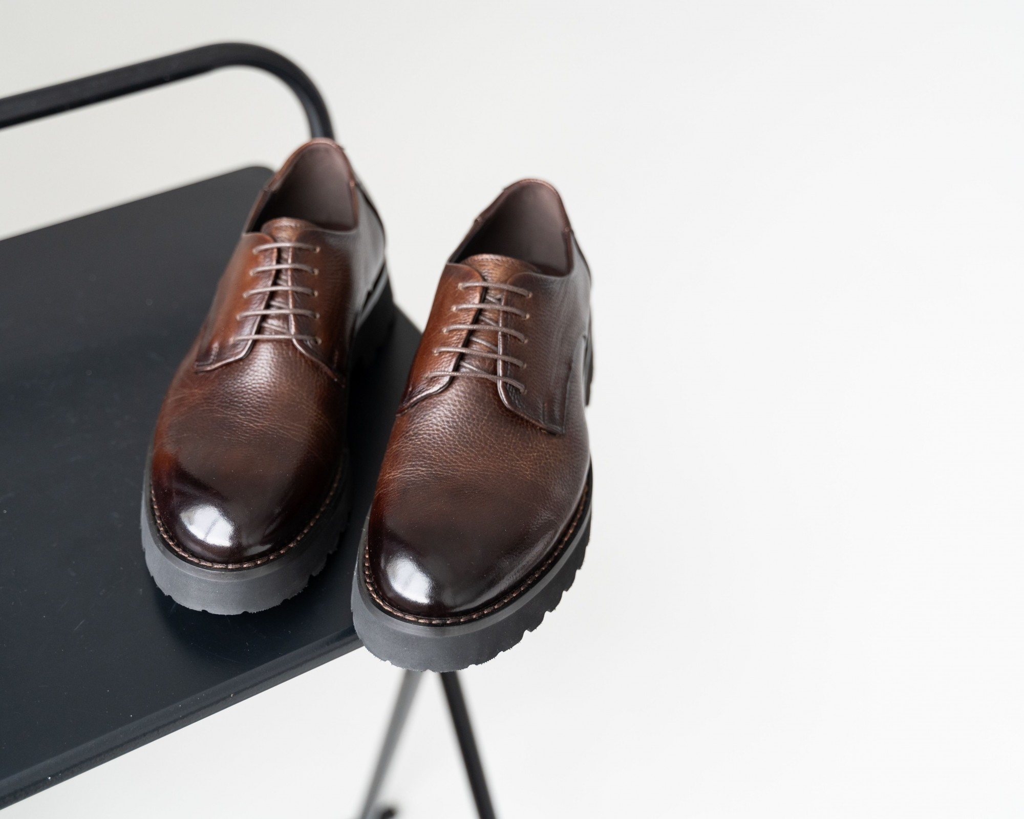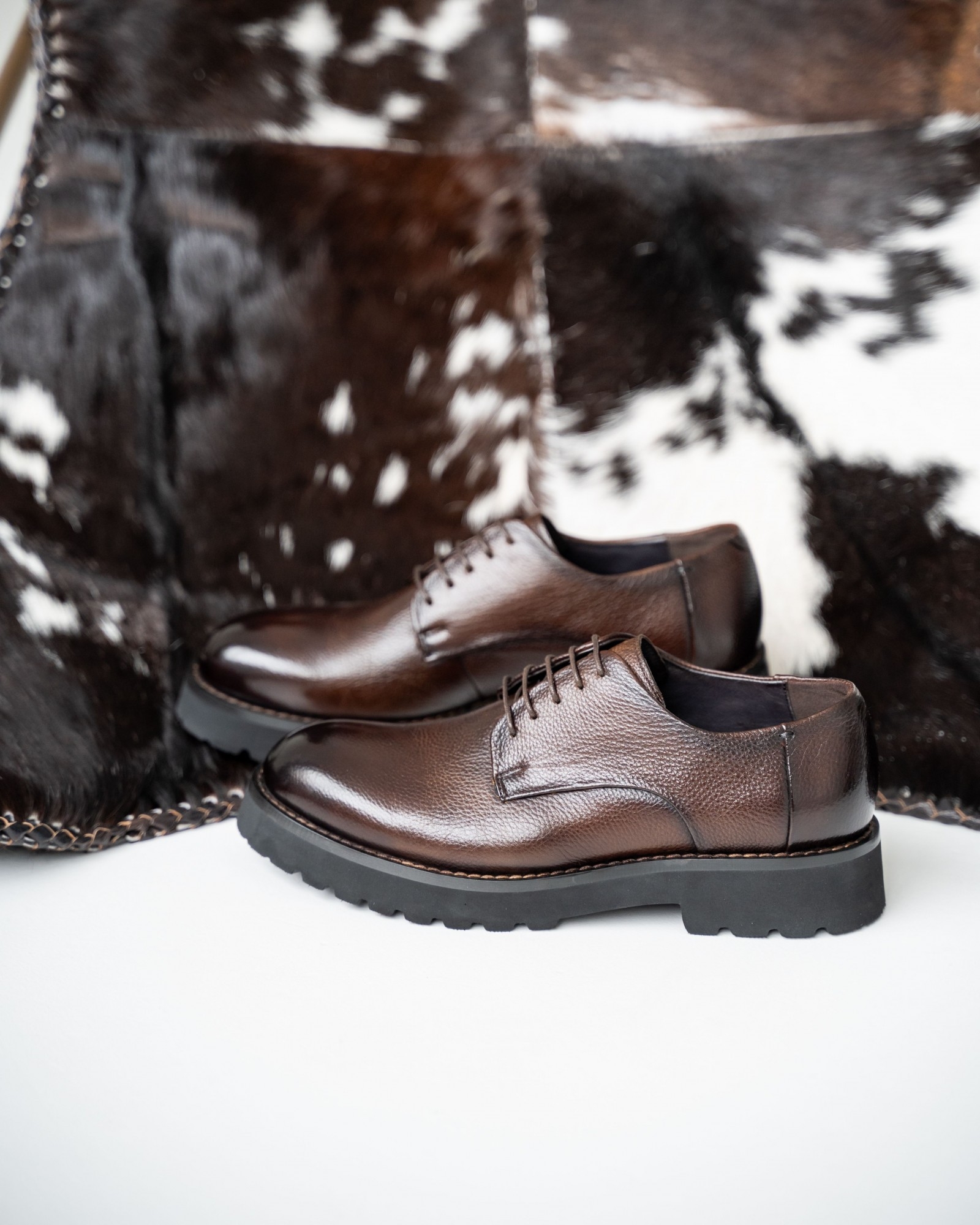 1. **Выразительный характер:** коричневая кожа с лёгким блеском и фактурной поверхностью подчёркивает силу формы и придаёт обуви уверенный, мужской акцент.